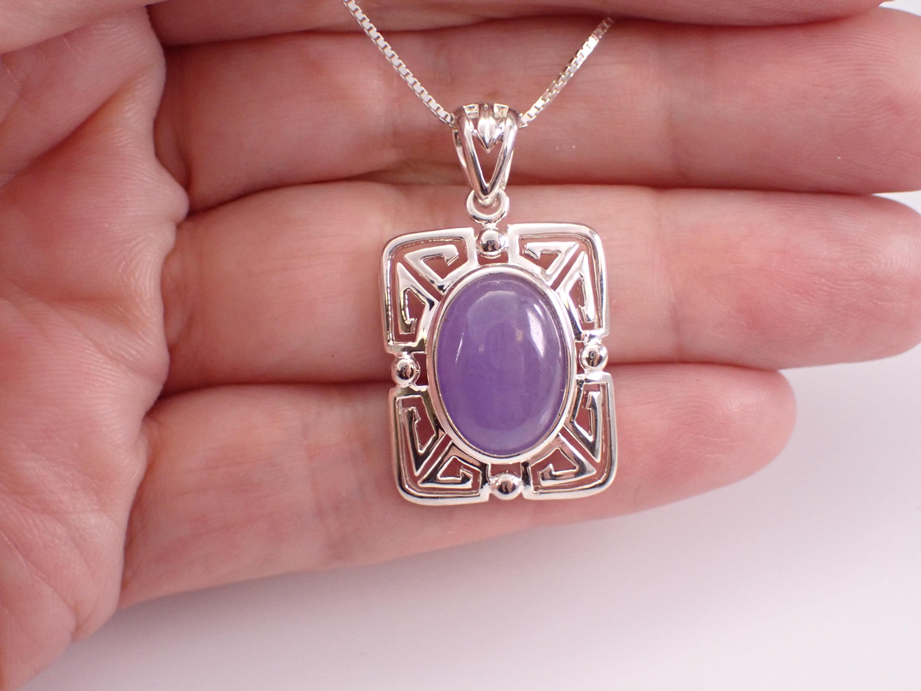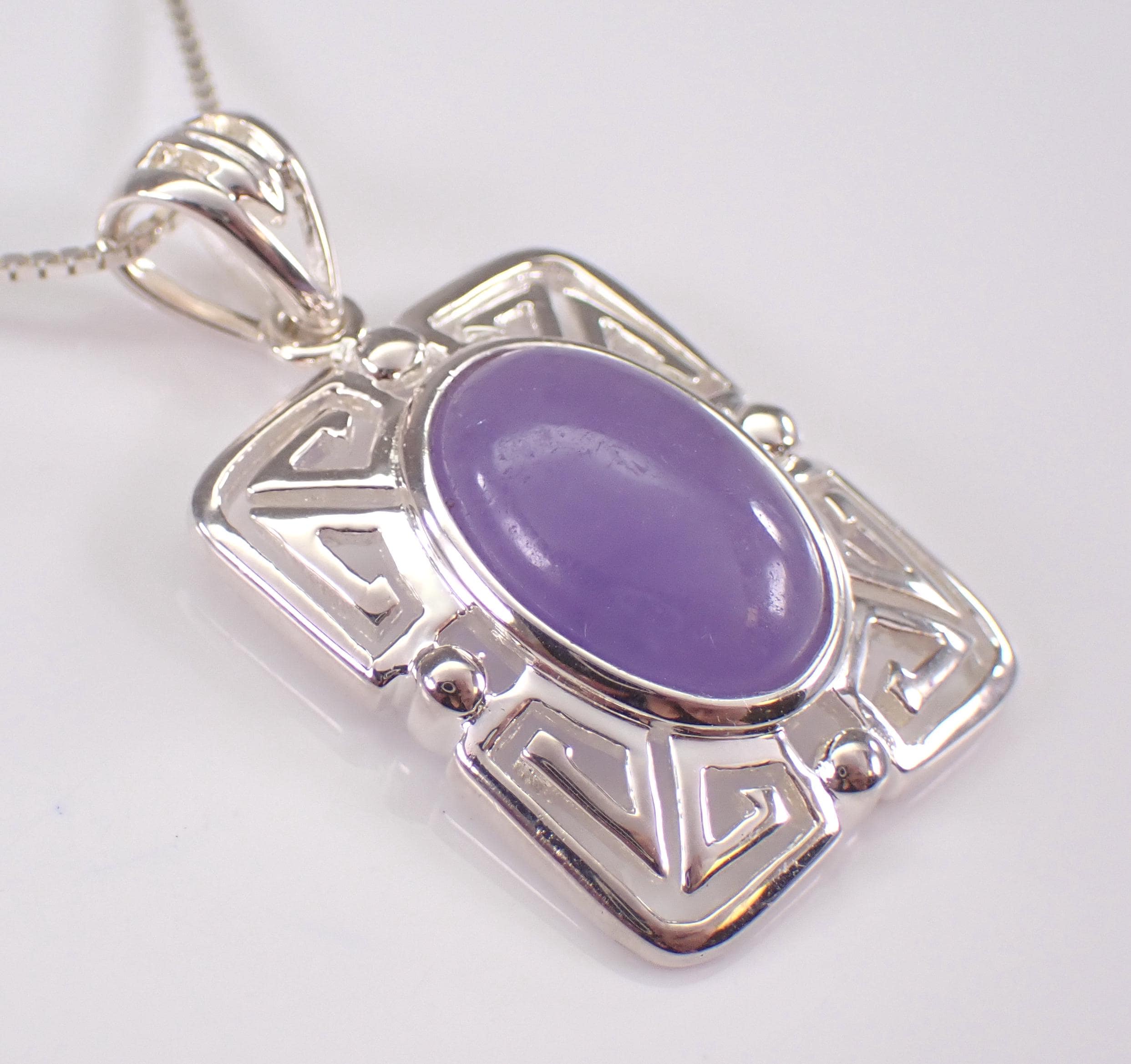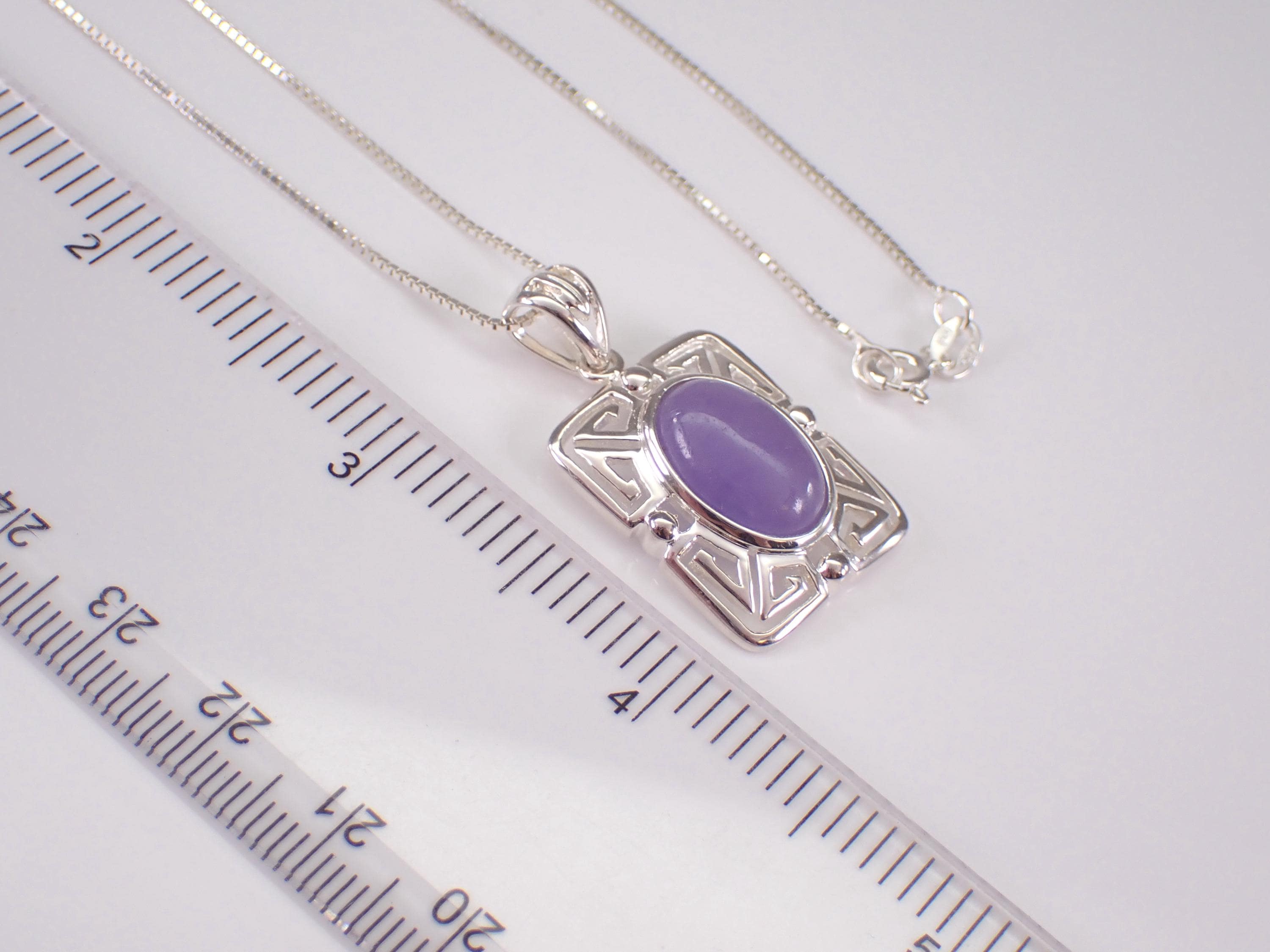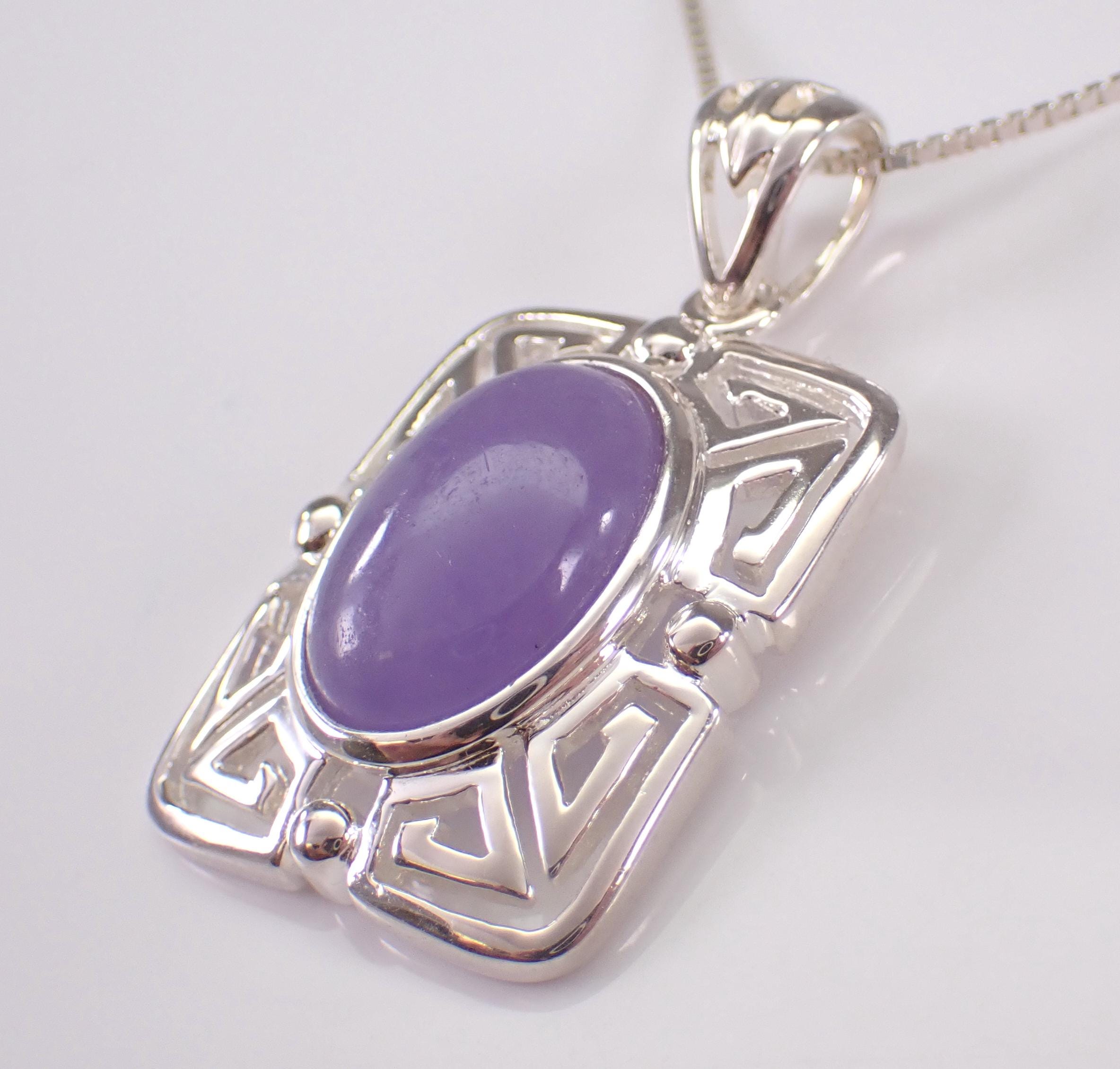 This pendant and chain are both Sterling Silver and the chain measures 18" in length. The pendant is a unique rectangular charm that is set with an Oval Lavender Jade in the center. This Jade measures 14 X 9 mm. The pendant measures 22 X 17.5 mm without the bail. This necklace weighs 7.5 grams. This necklace is perfect for everyday wear, great gift for any occasion! Will be shipped promptly in a gift pouch.