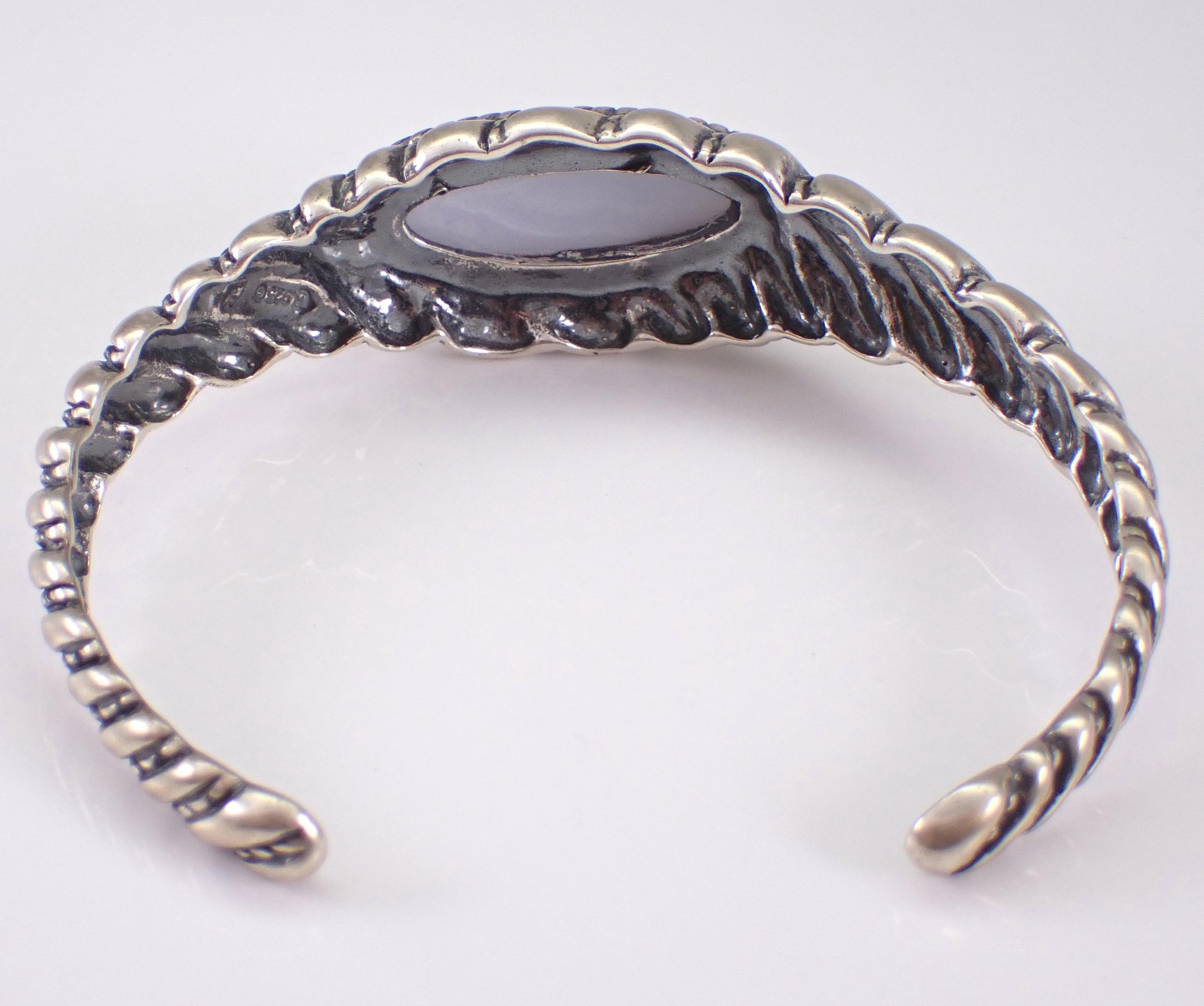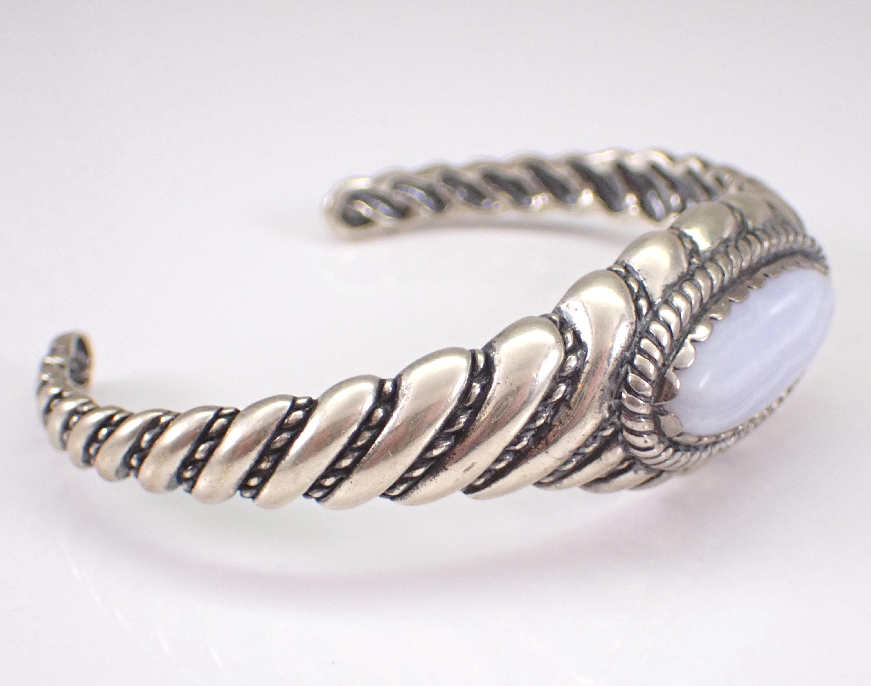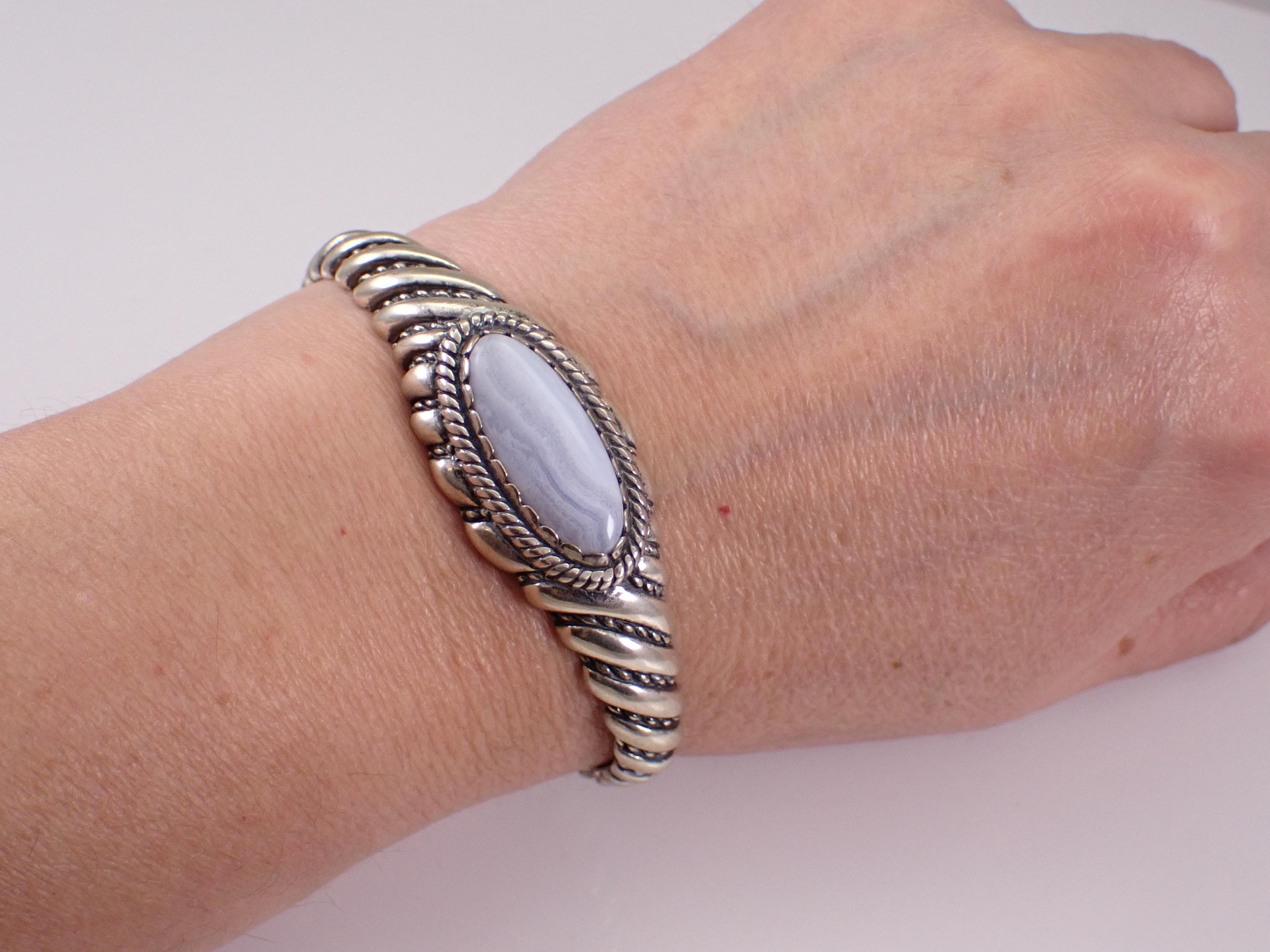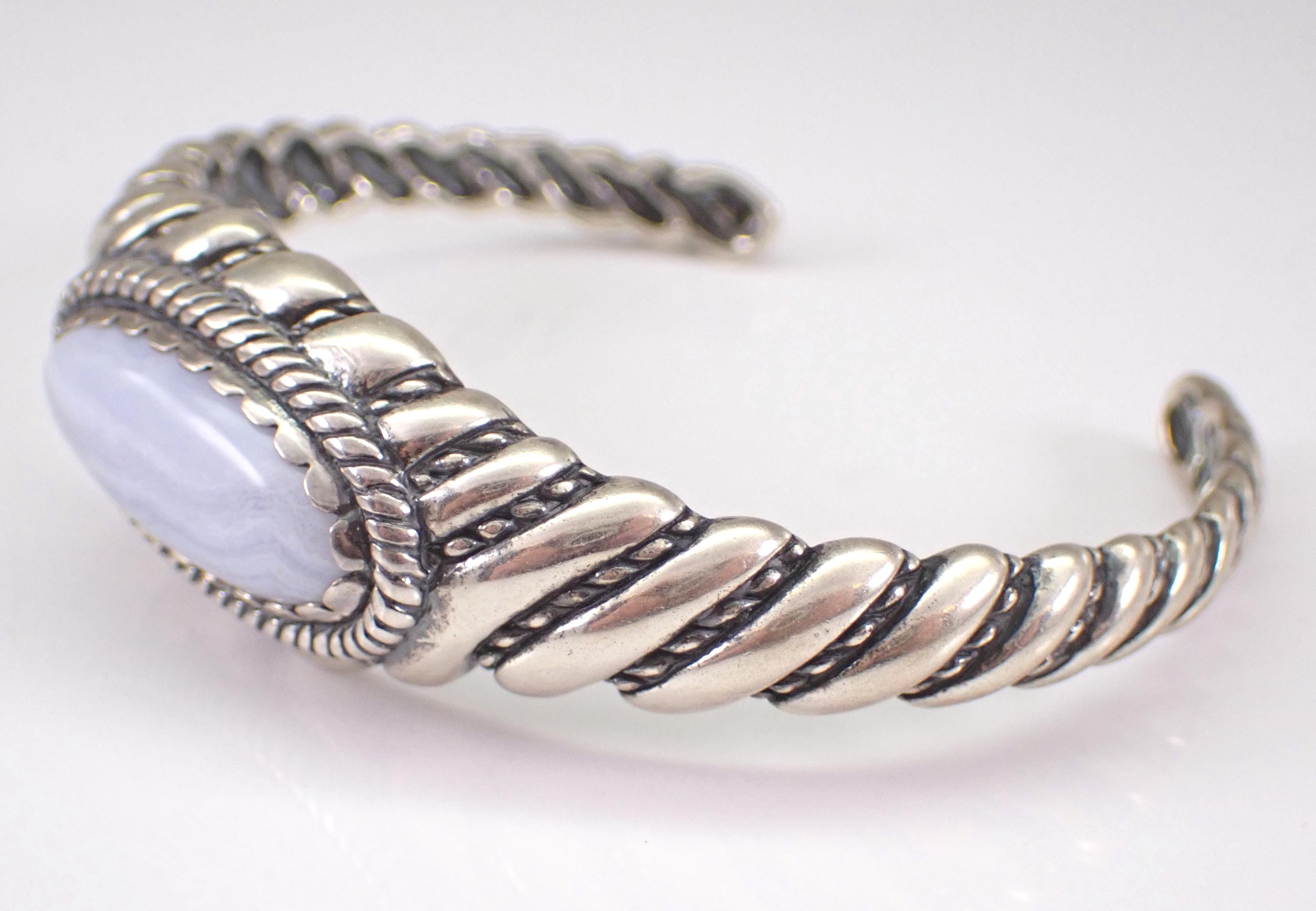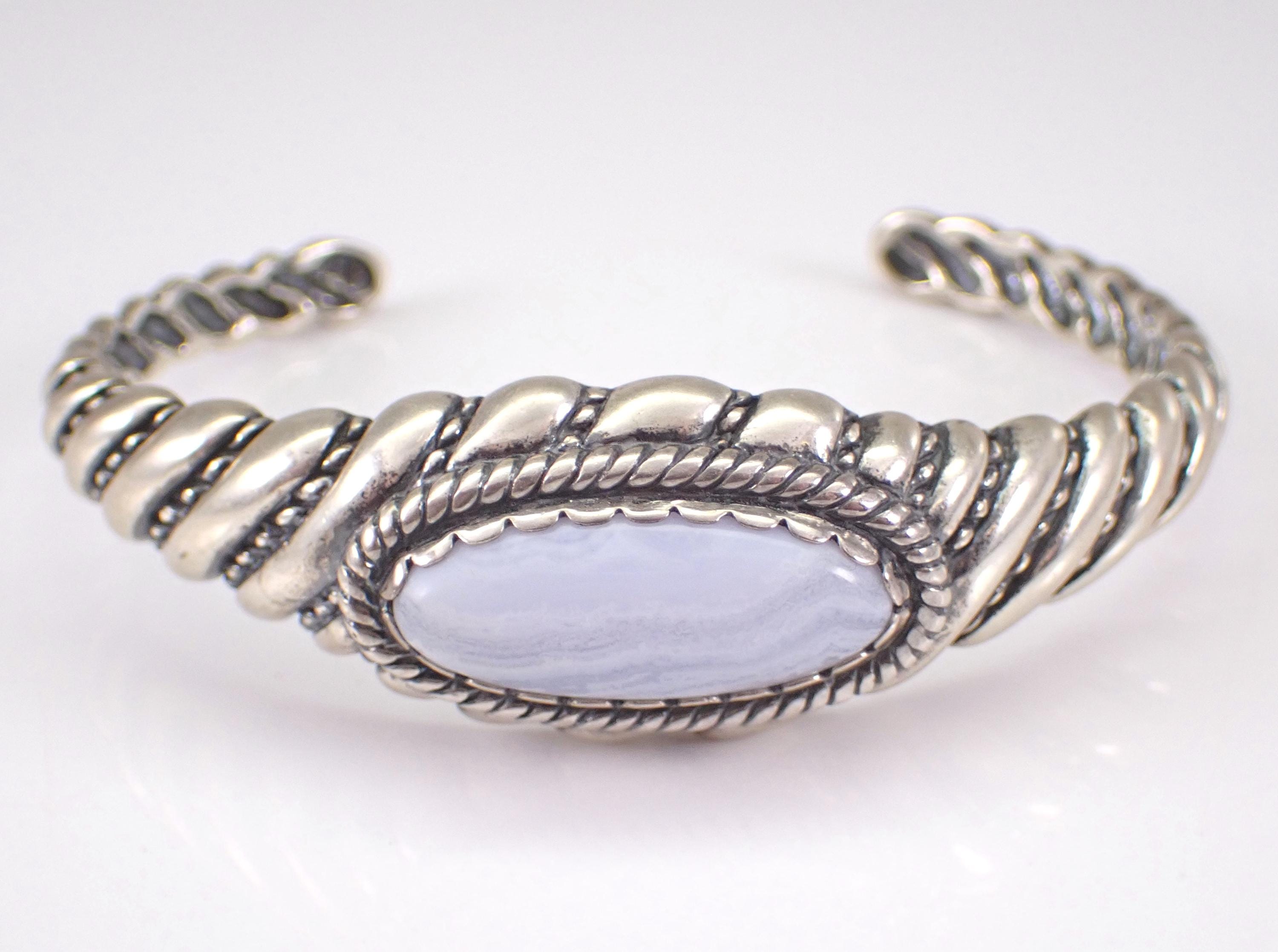 Sterling Silver Bangle Bracelet by Carolyn Pollack. This bracelet is set with a large Blue Lace Agate in the center. This gemstone measures 24 X 9.5 mm. This bracelet weighs 29.1 grams, measures 20 mm in width at its widest point and will fits a standard ladies 7" wrist. This bracelet will be shipped promptly in a beautiful gift pouch.