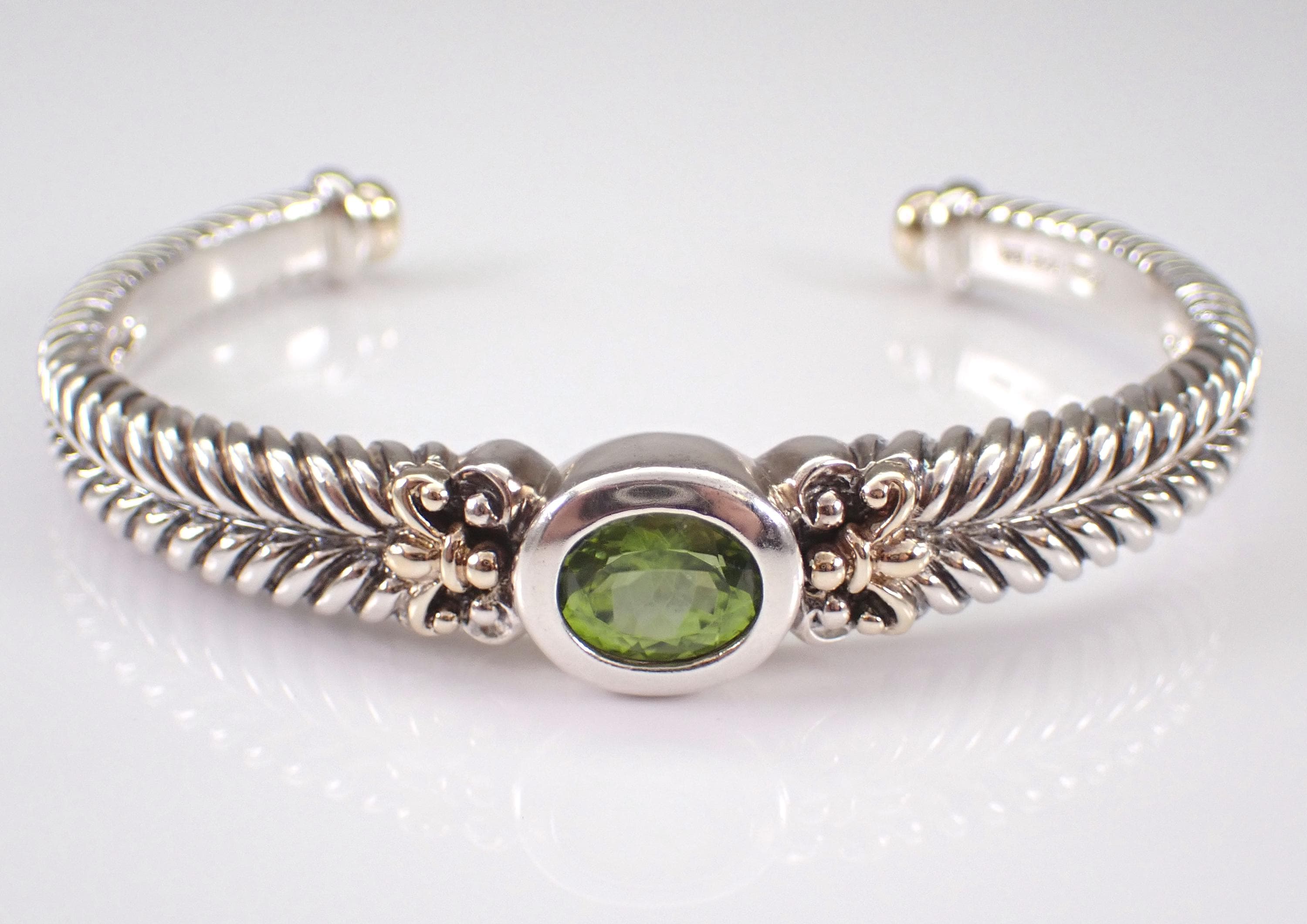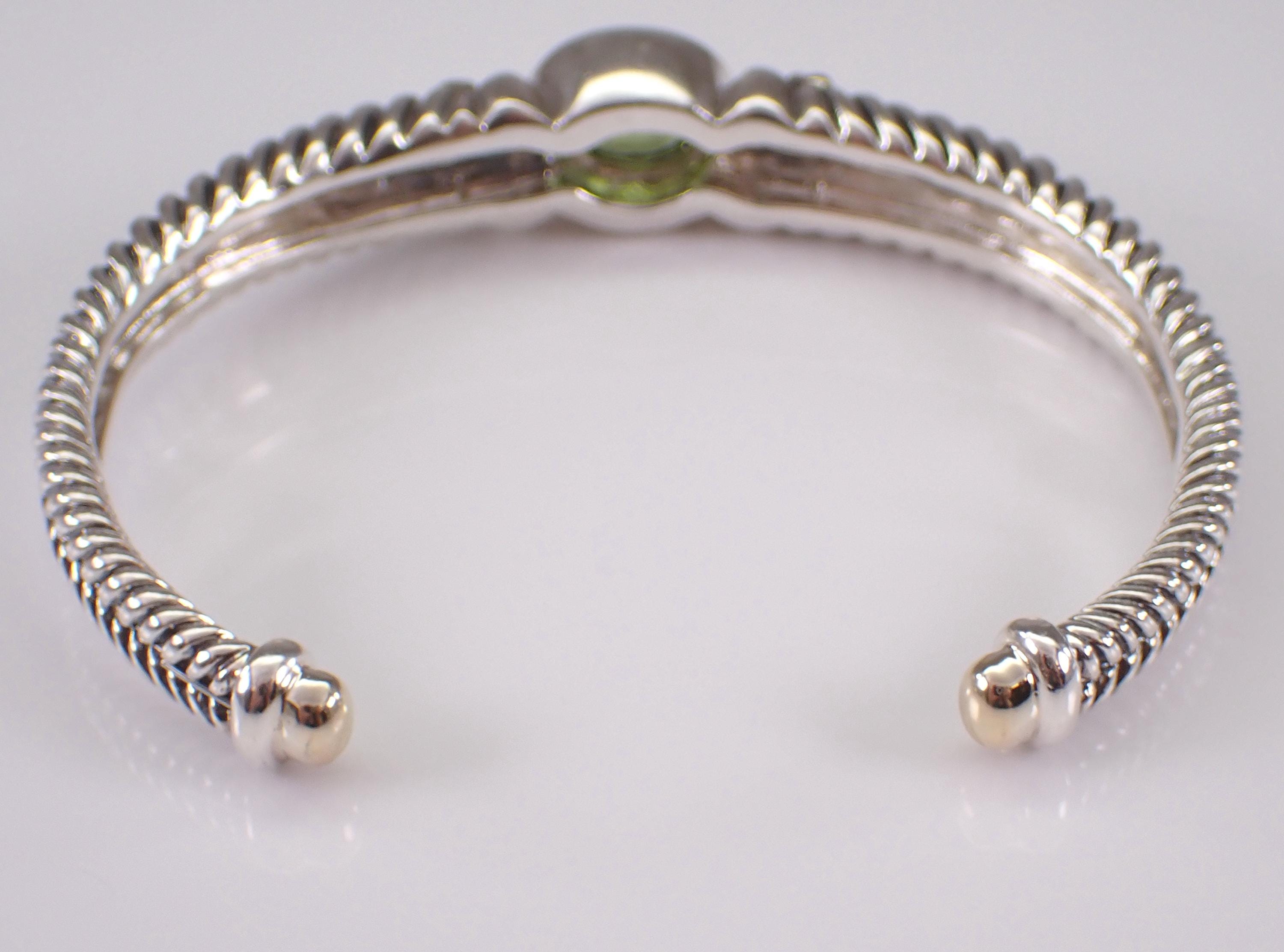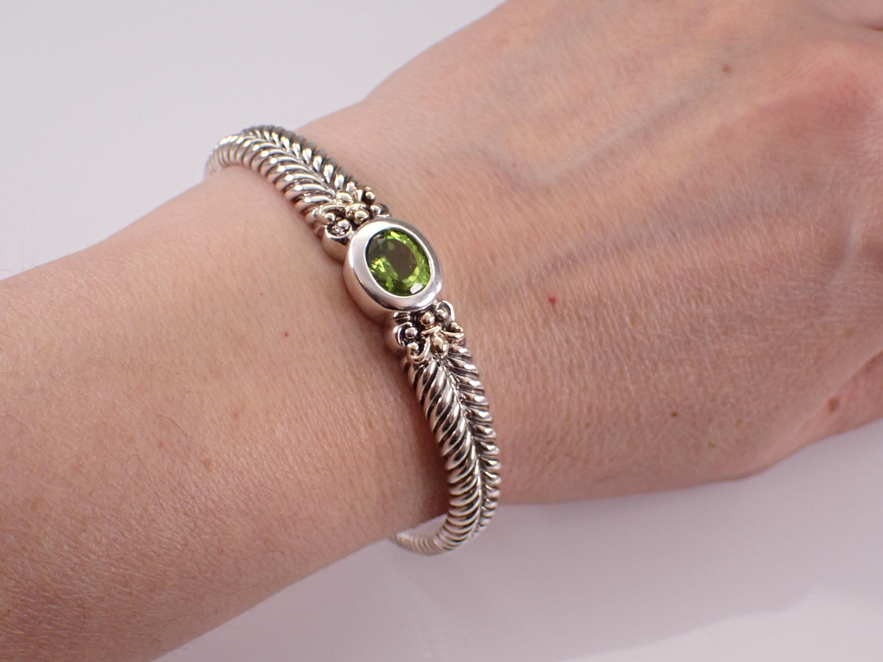 Sterling Silver and 18K Yellow Gold Peridot Bangle Bracelet by Lorenzo. There is one Oval Peridot set in a bezel in the center of this bracelet. This Peridot measures 10 X 8 mm. This bracelet weighs 34.8 grams and will fits a standard ladies wrist. This bracelet dates back to 1980s and is by a vintage designer Lorenzo. This bracelet will be shipped promptly in a beautiful gift pouch, not the original.