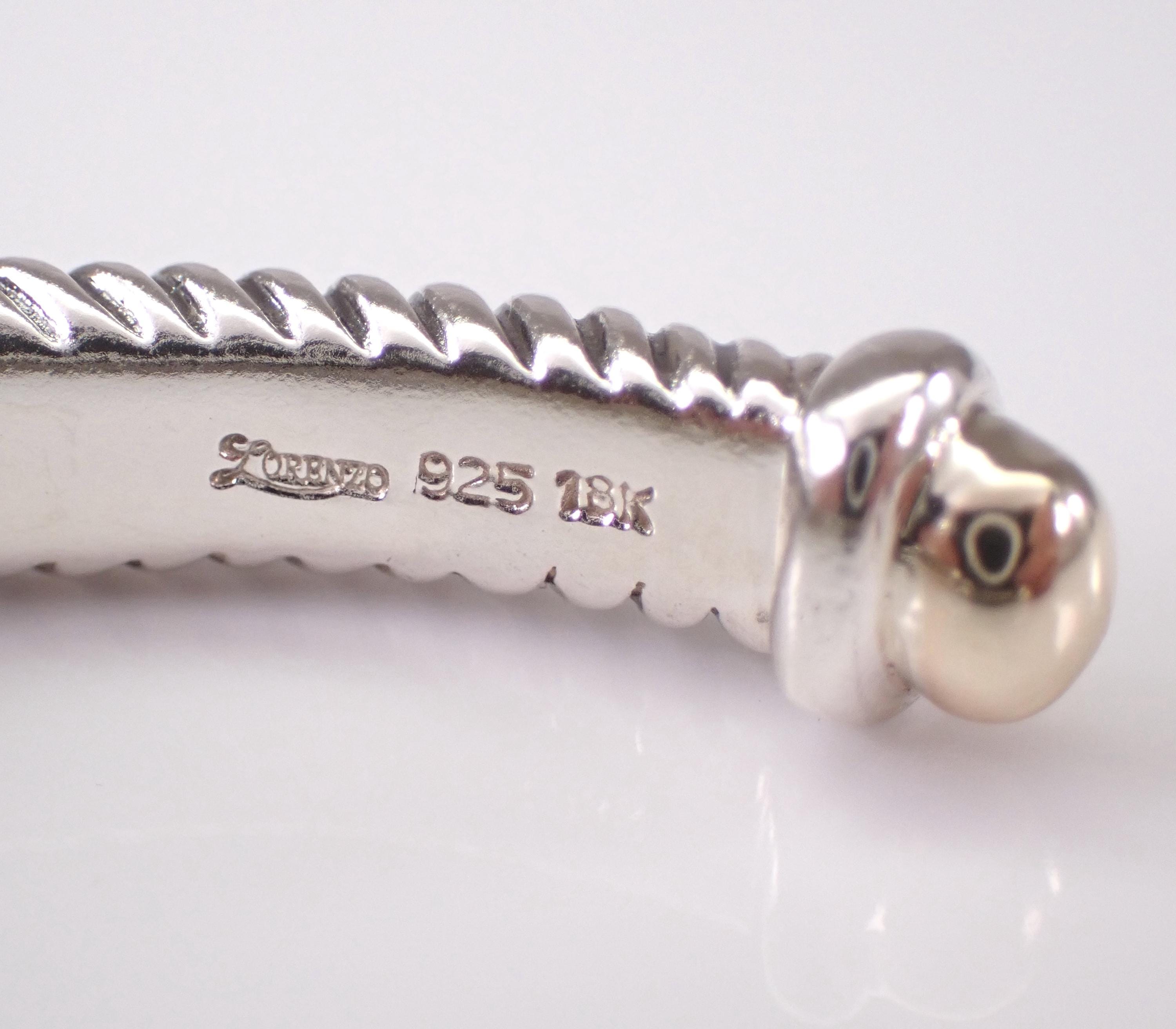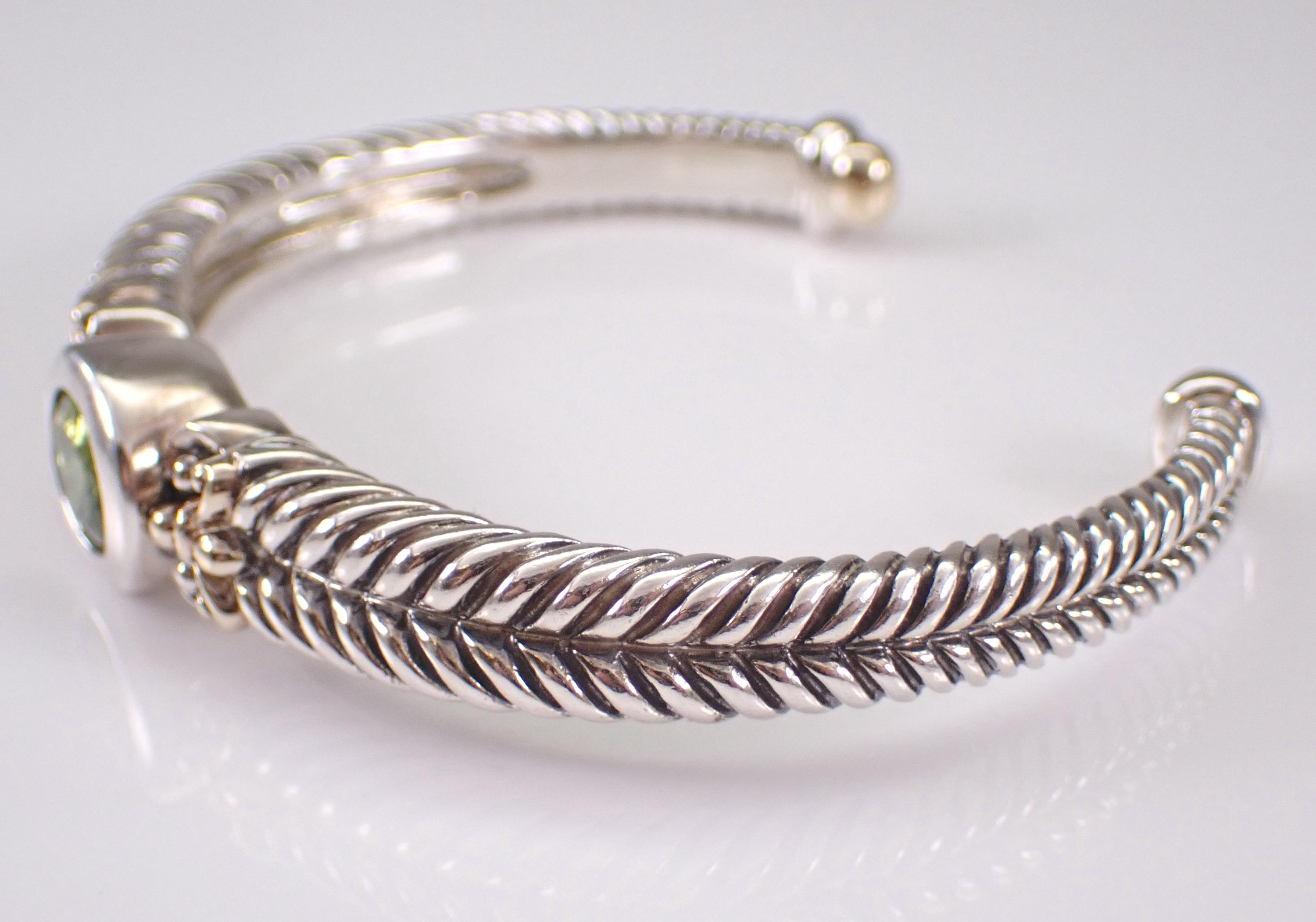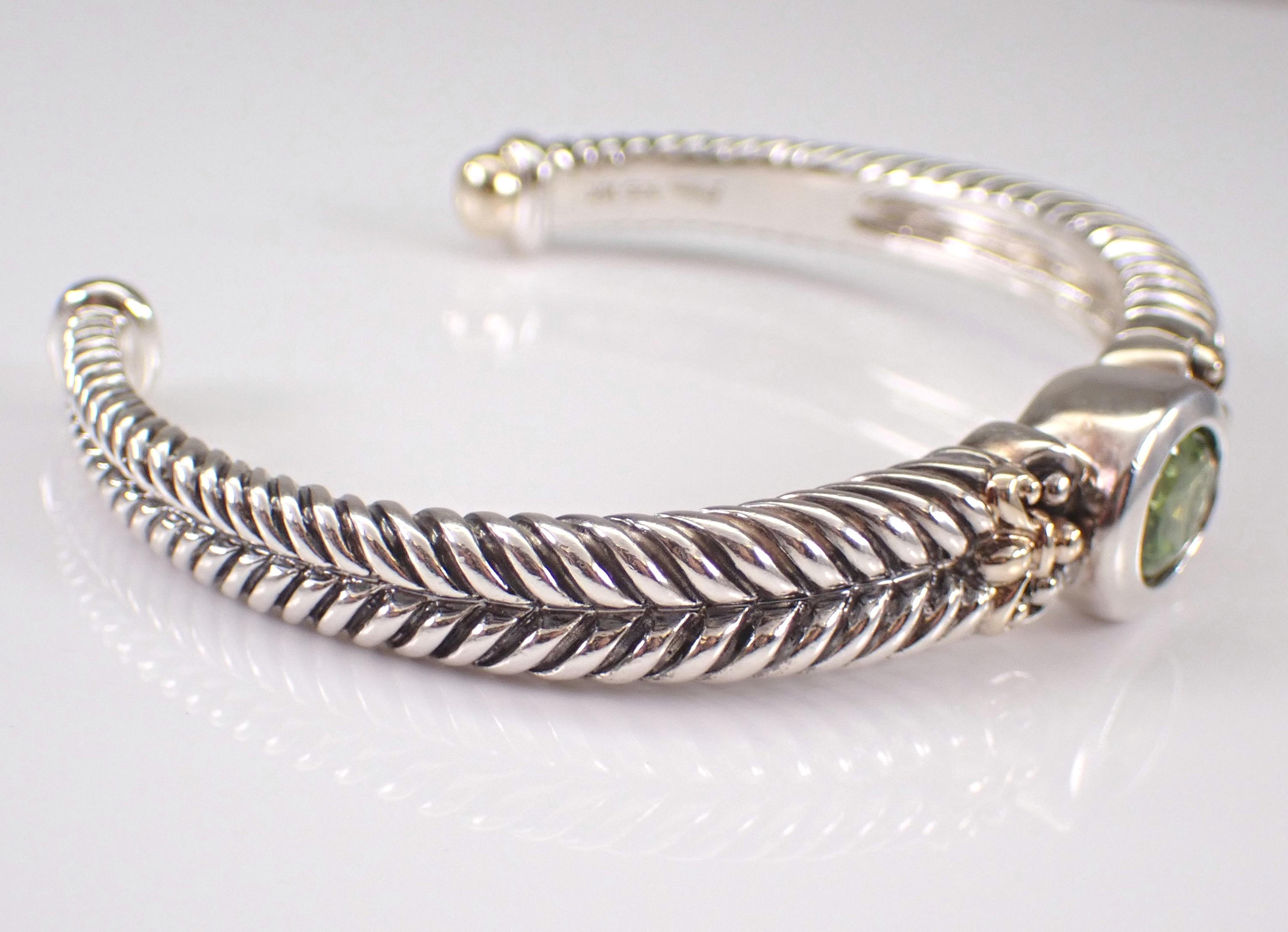 Sterling Silver and 18K Yellow Gold Peridot Bangle Bracelet by Lorenzo. There is one Oval Peridot set in a bezel in the center of this bracelet. This Peridot measures 10 X 8 mm. This bracelet weighs 34.8 grams and will fits a standard ladies wrist. This bracelet dates back to 1980s and is by a vintage designer Lorenzo. This bracelet will be shipped promptly in a beautiful gift pouch, not the original.