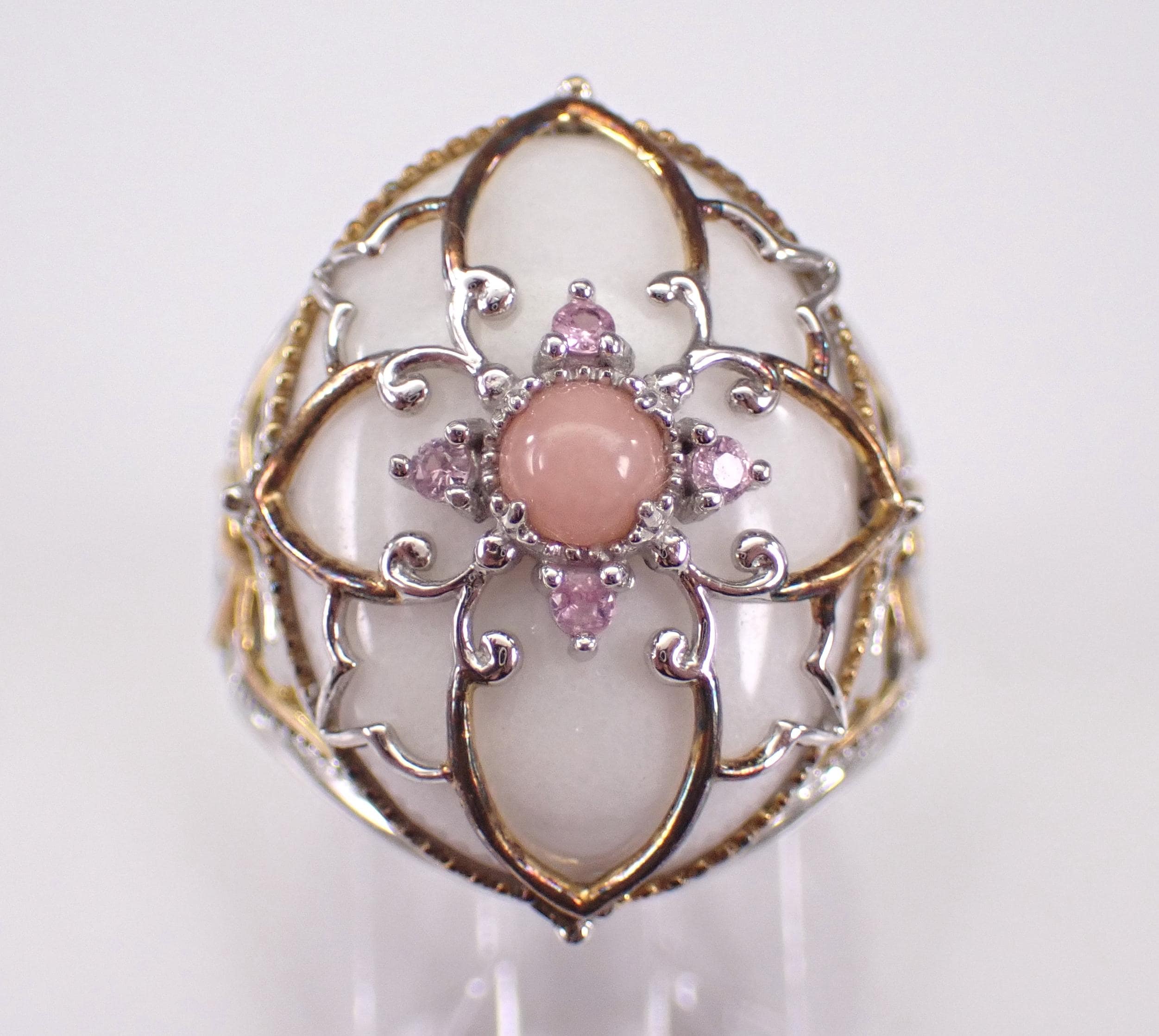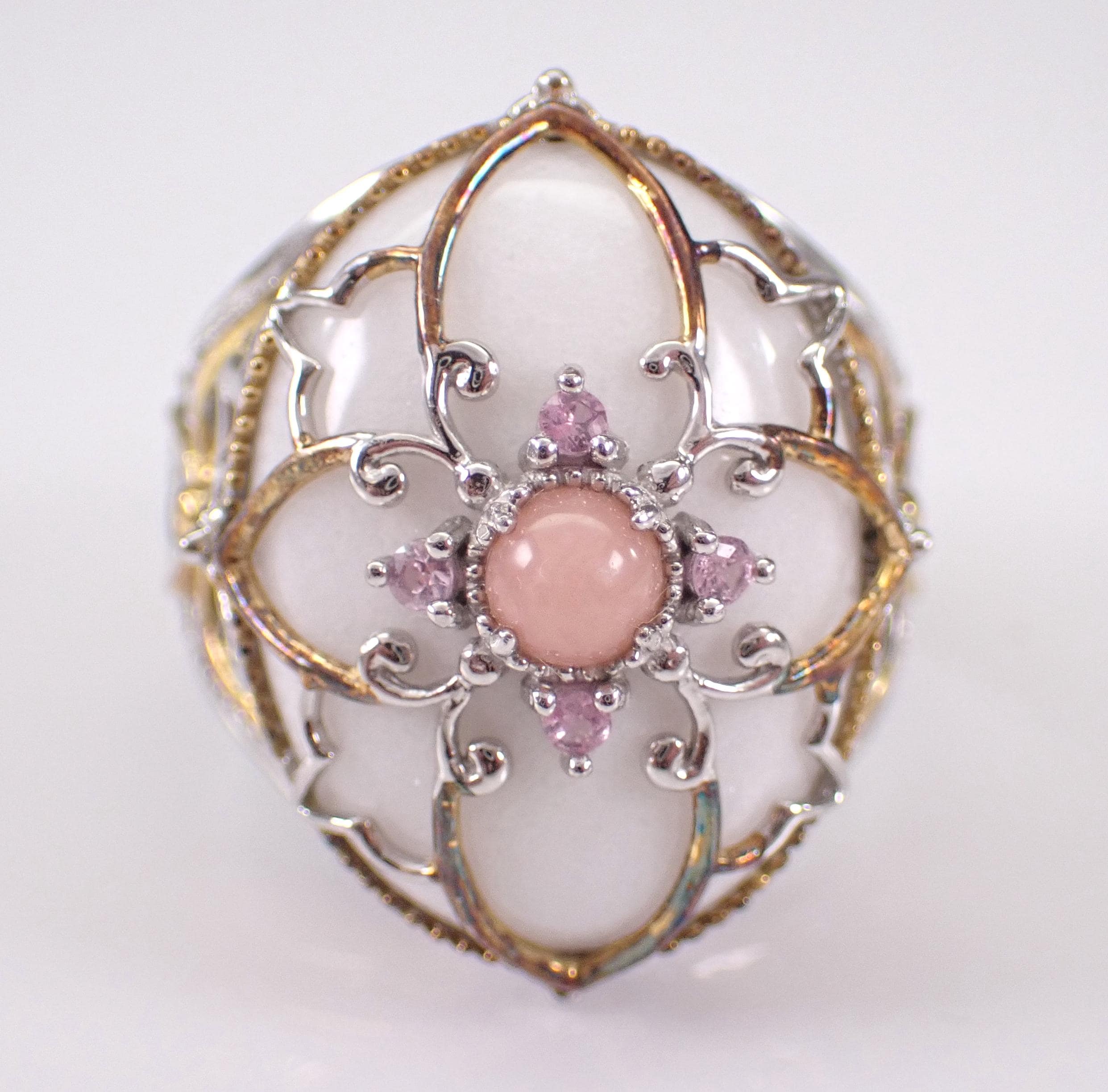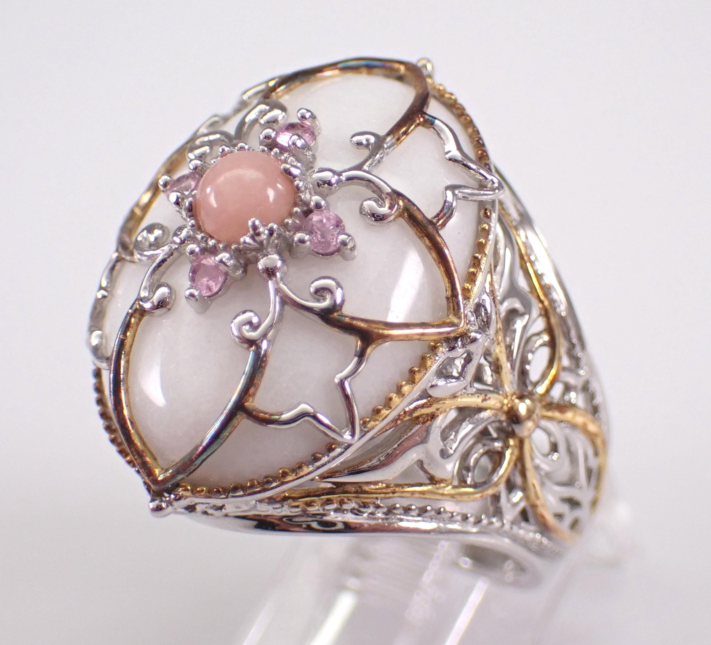Vintage Sterling Silver MICHAEL VALITUTTI Cage ring. This ring is set with a White Agate underneath the "cage" in the center, a rose quartz and four genuine pink Tourmaline. This ring is in excellent condition, is finger size 7 and weighs 8.8 grams. This ring measures 23 mm along the finger (almost 1"). This ring will be shipped promptly in a gift box.