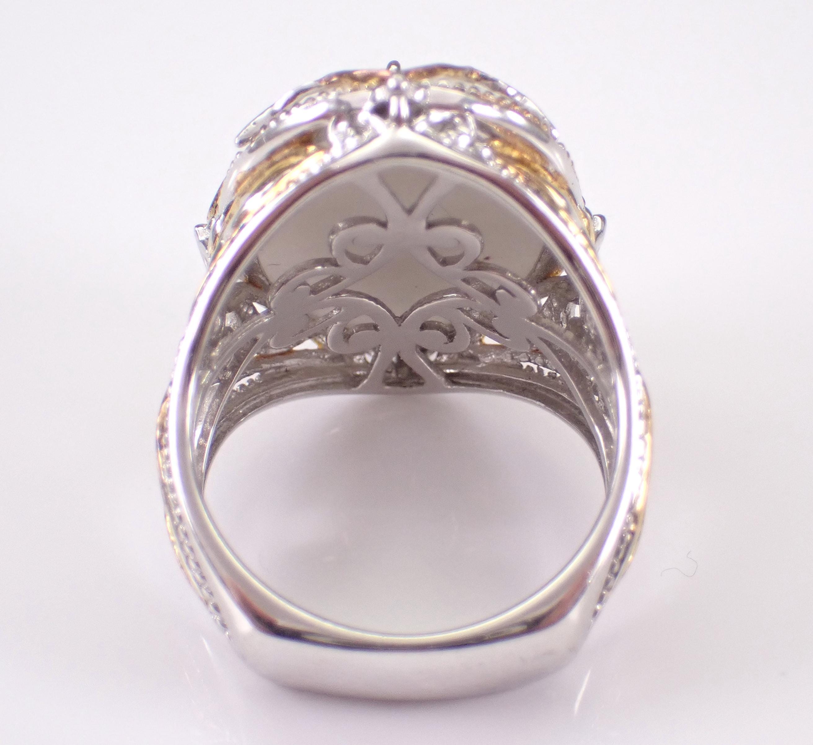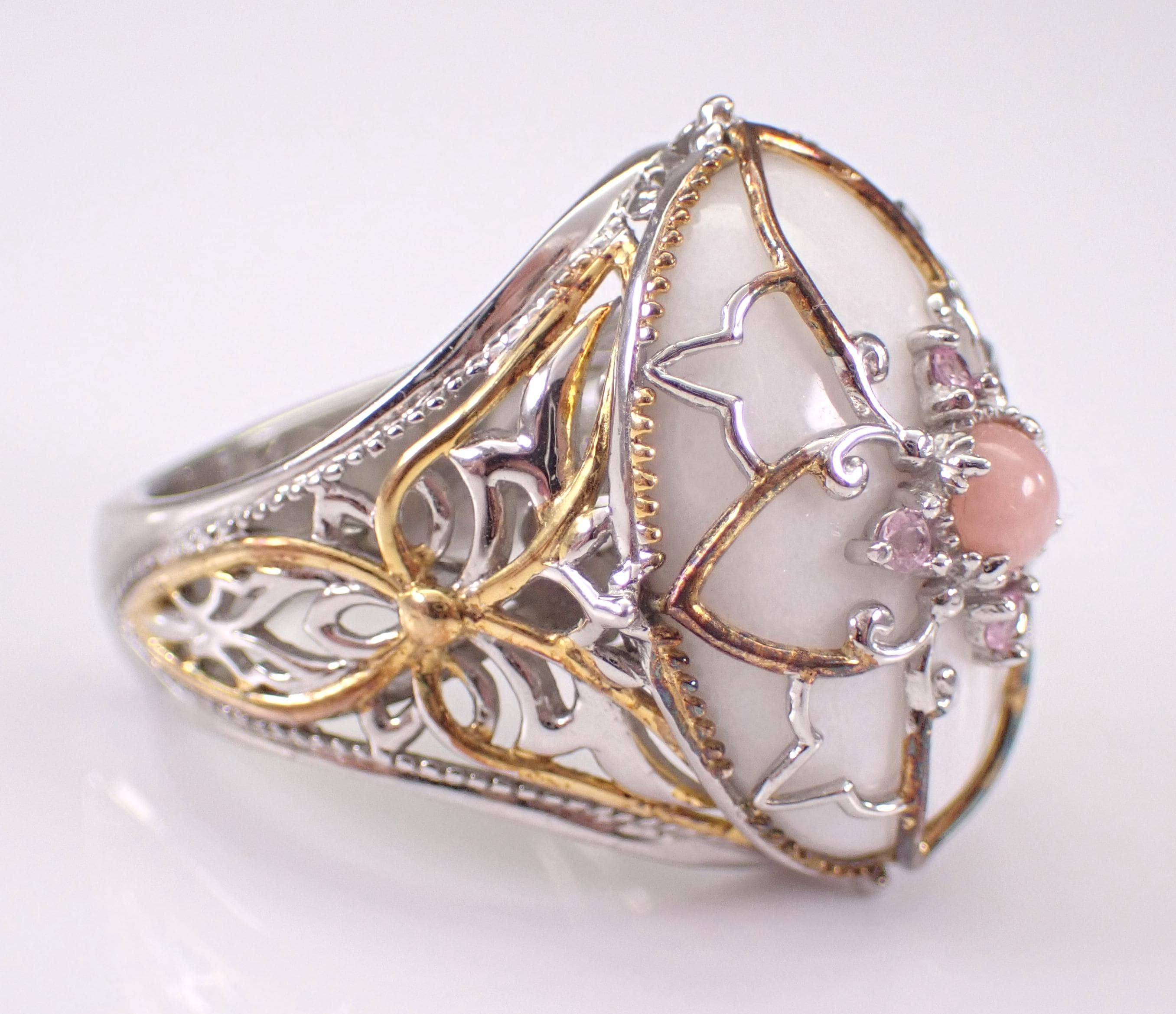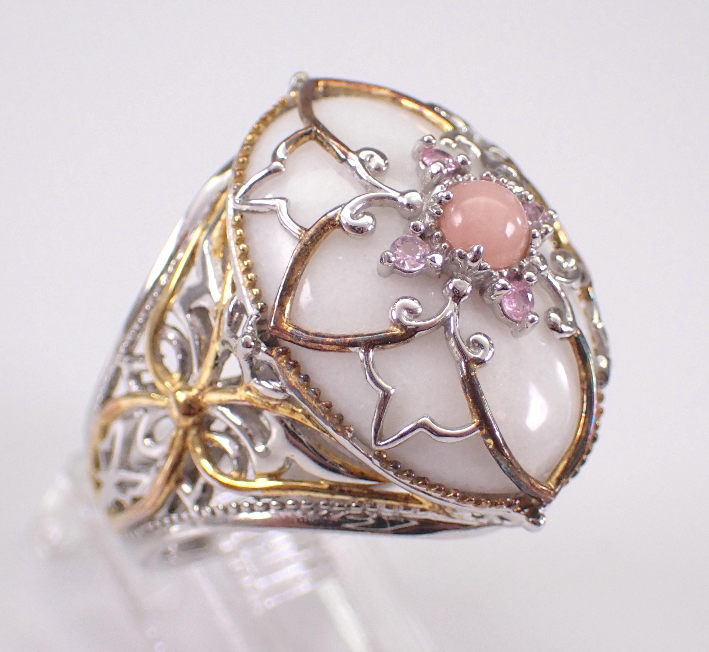 Vintage Sterling Silver MICHAEL VALITUTTI Cage ring. This ring is set with a White Agate underneath the "cage" in the center, a rose quartz and four genuine pink Tourmaline. This ring is in excellent condition, is finger size 7 and weighs 8.8 grams. This ring measures 23 mm along the finger (almost 1"). This ring will be shipped promptly in a gift box.