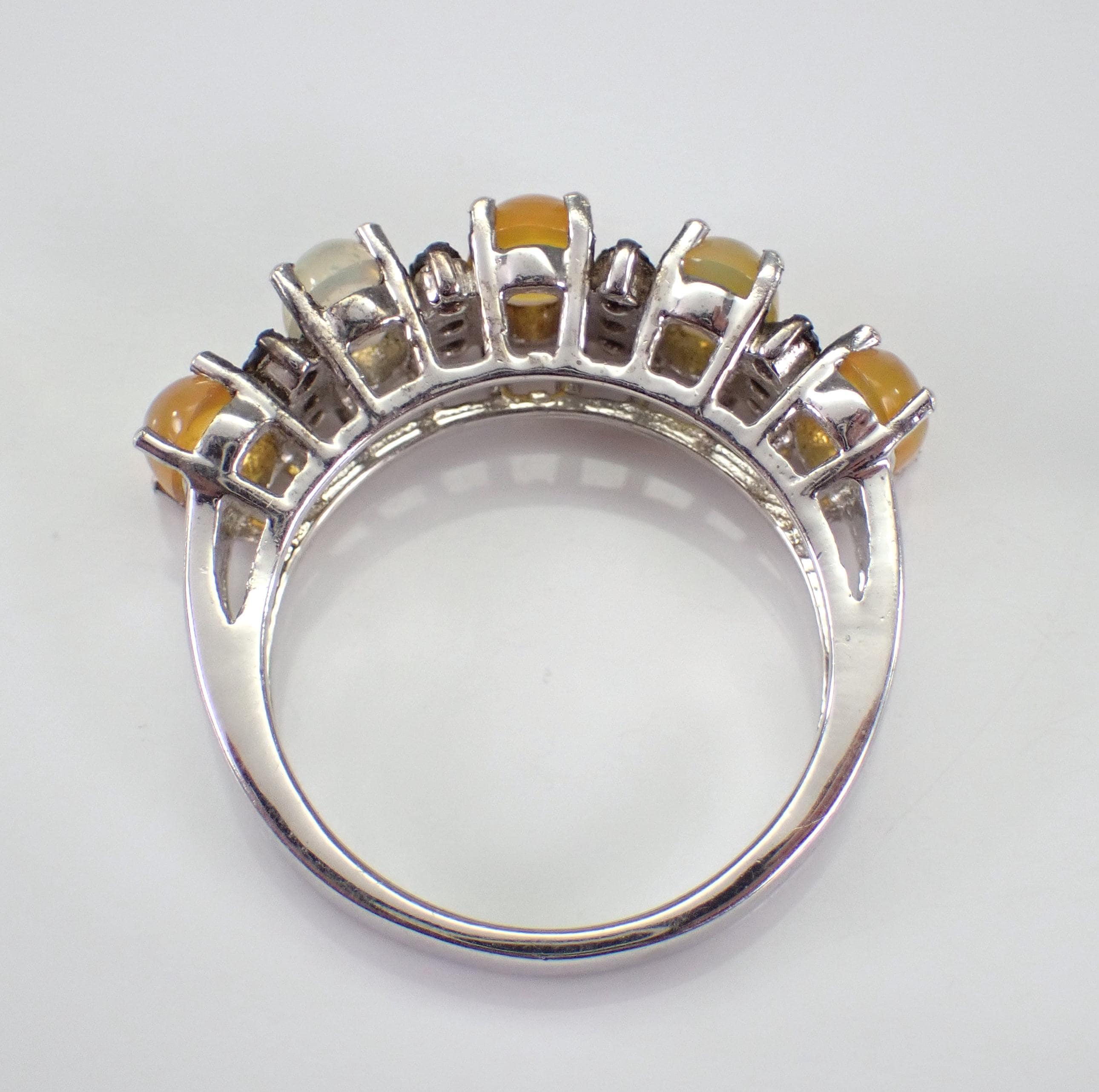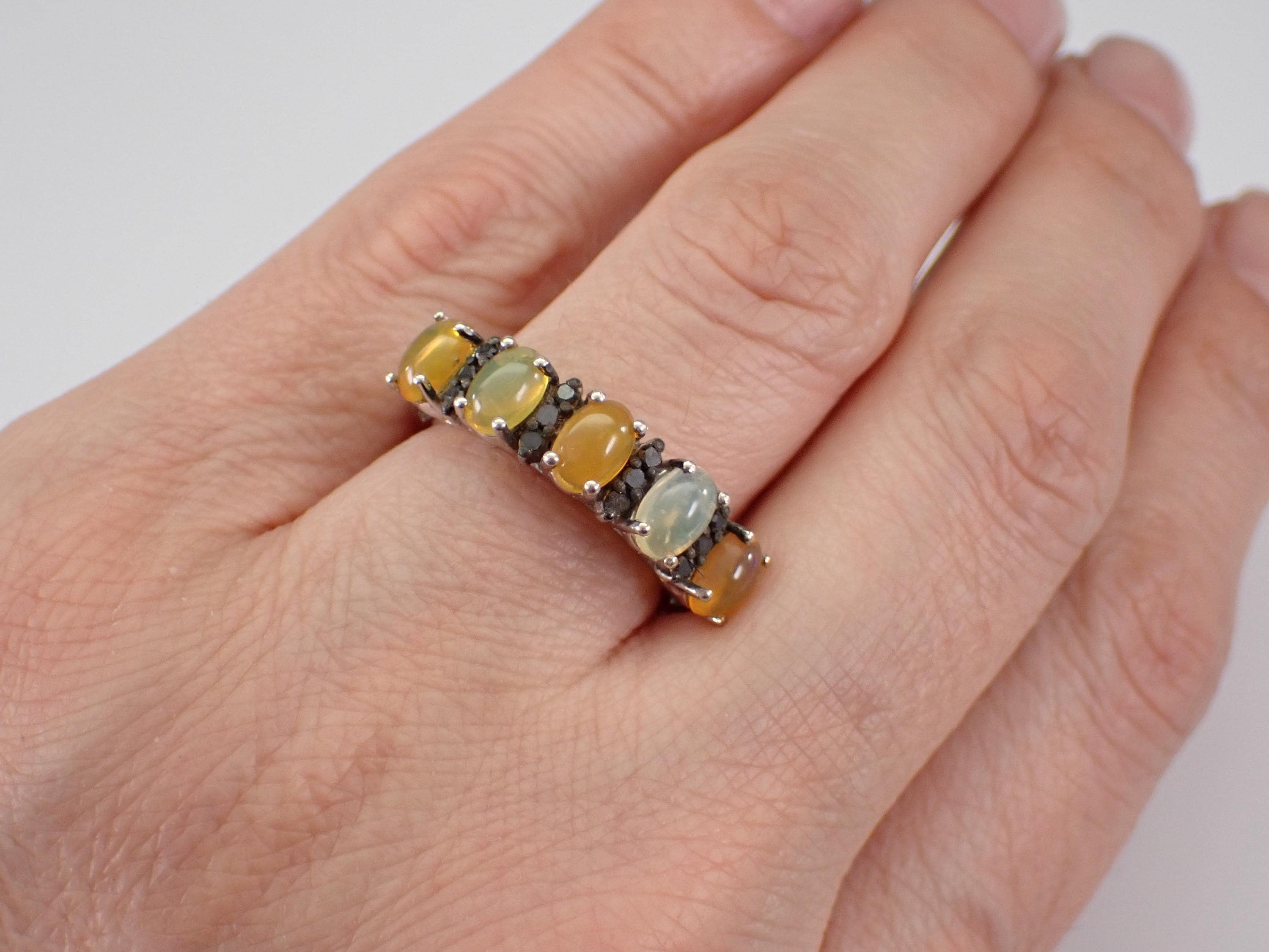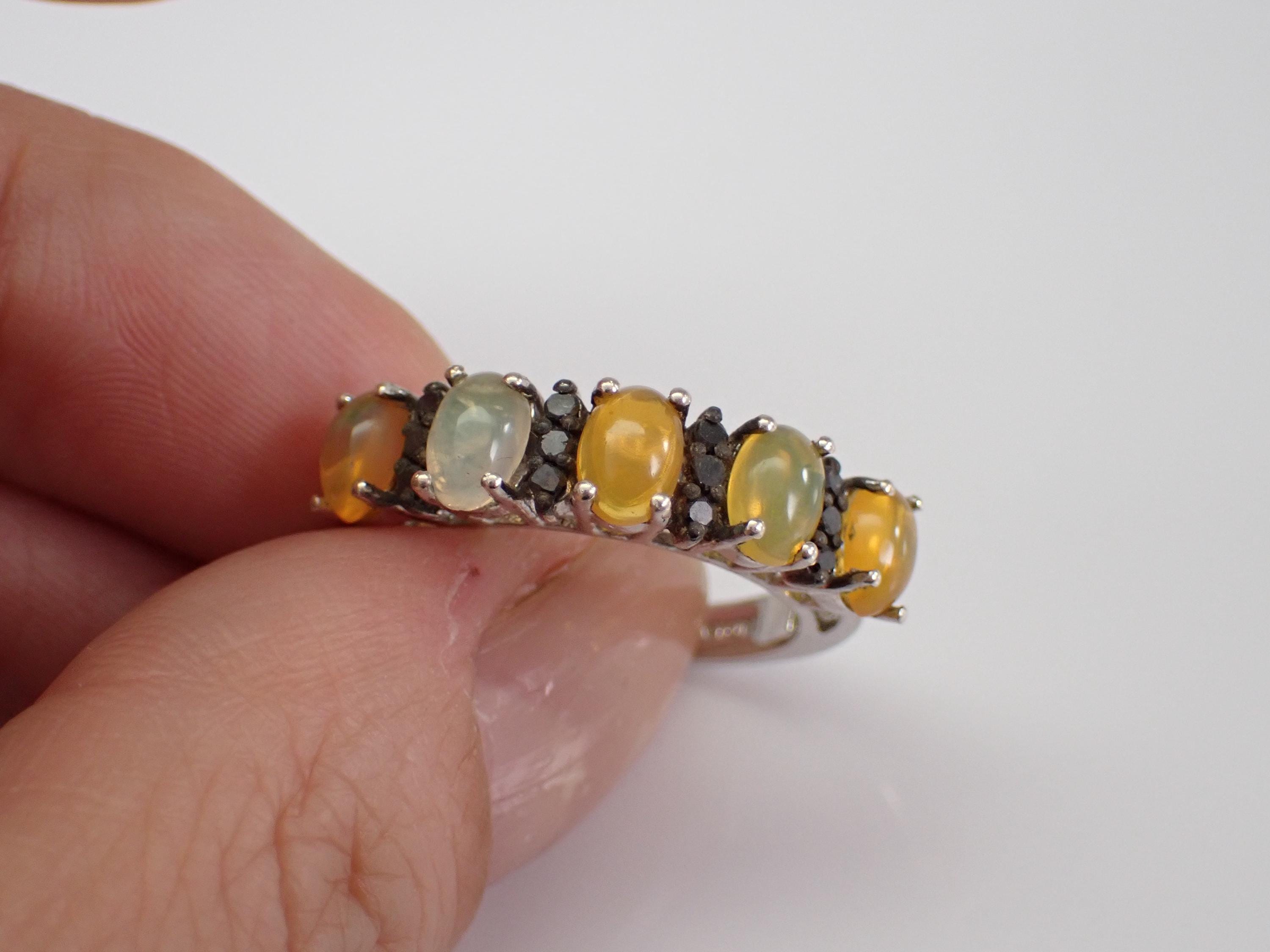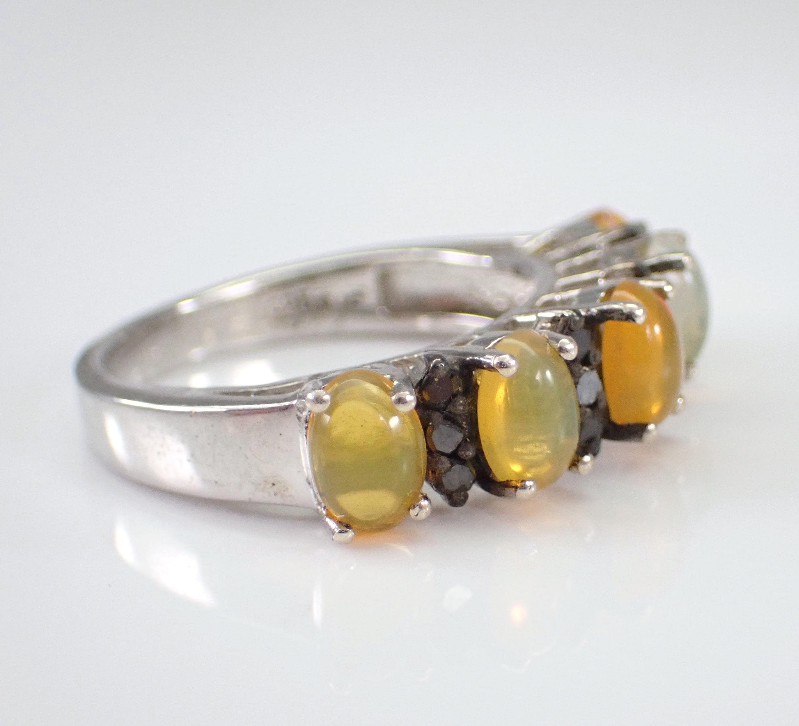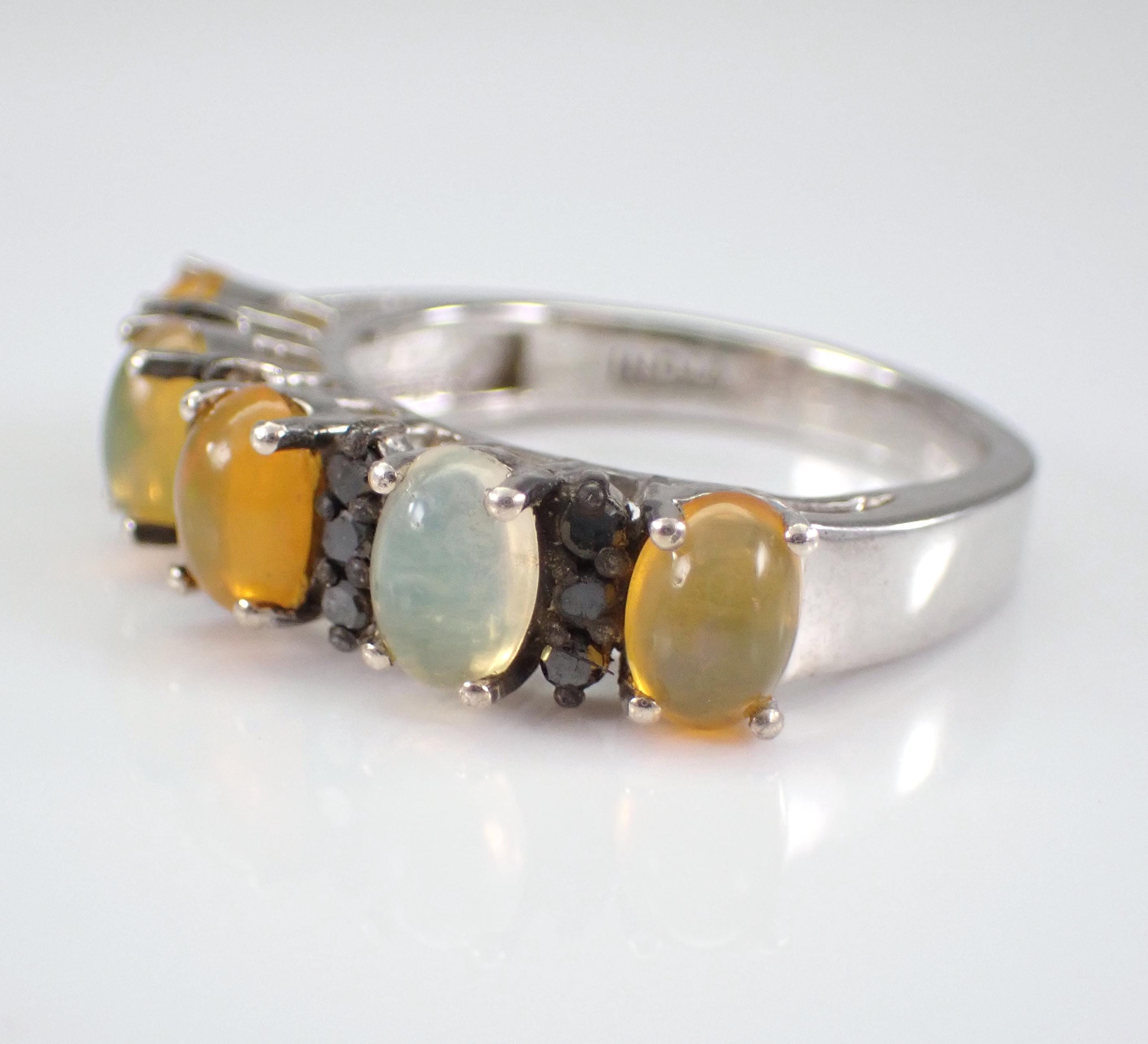 Sterling Silver Estate Band set with genuine Opal and Black Diamonds. The Opal in this ring measure 6 X 4 mm each and amount to a total weight of 2 1/2 carats. There are also twelve genuine Black Diamonds set in this ring. These diamonds amount to a total weight of .20 carat. This ring is Sterling Silver, weighs 4.2 grams, measures 6 mm in width and is a finger size 7. I will ship this ring promptly in a gift pouch.
