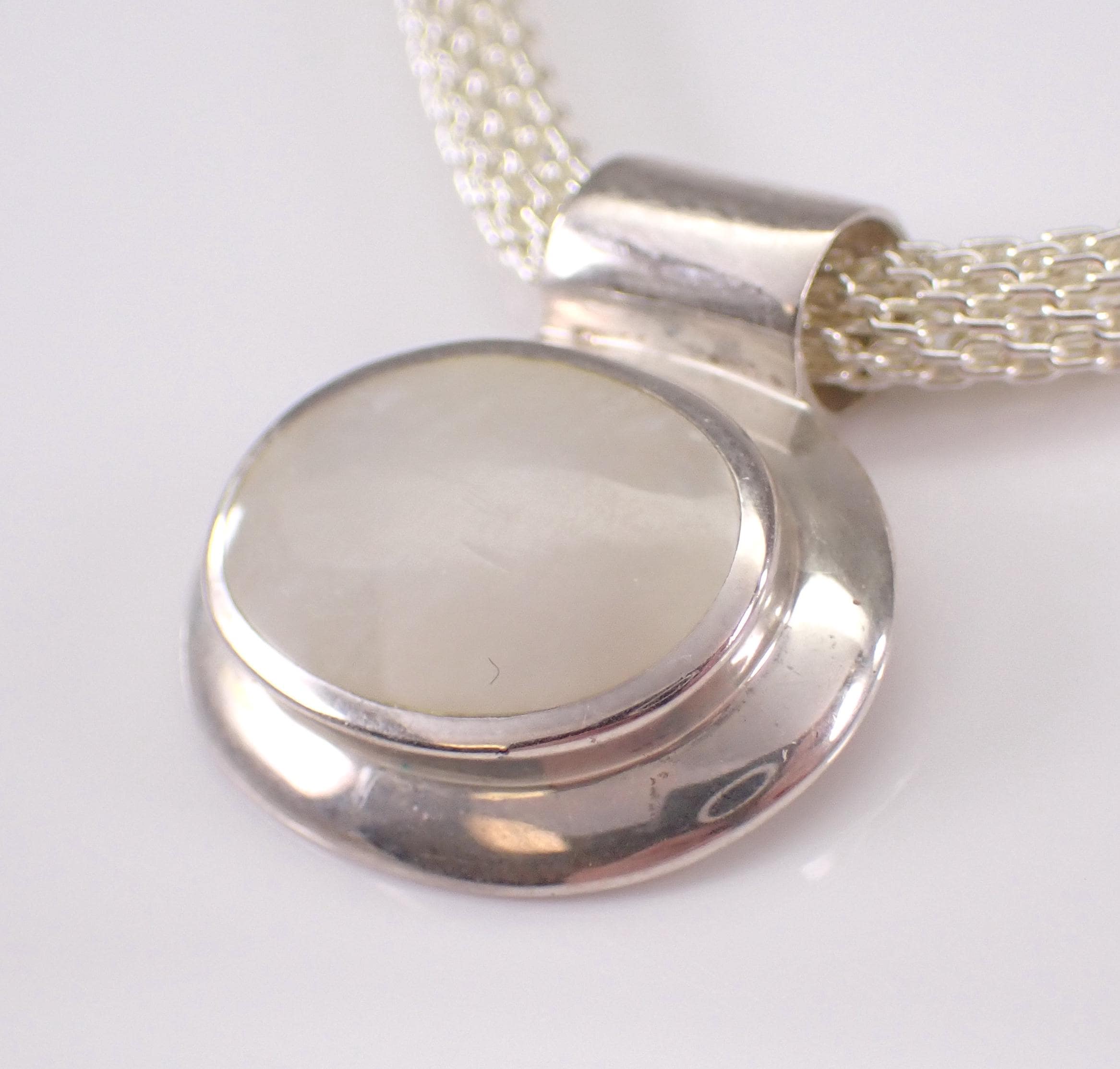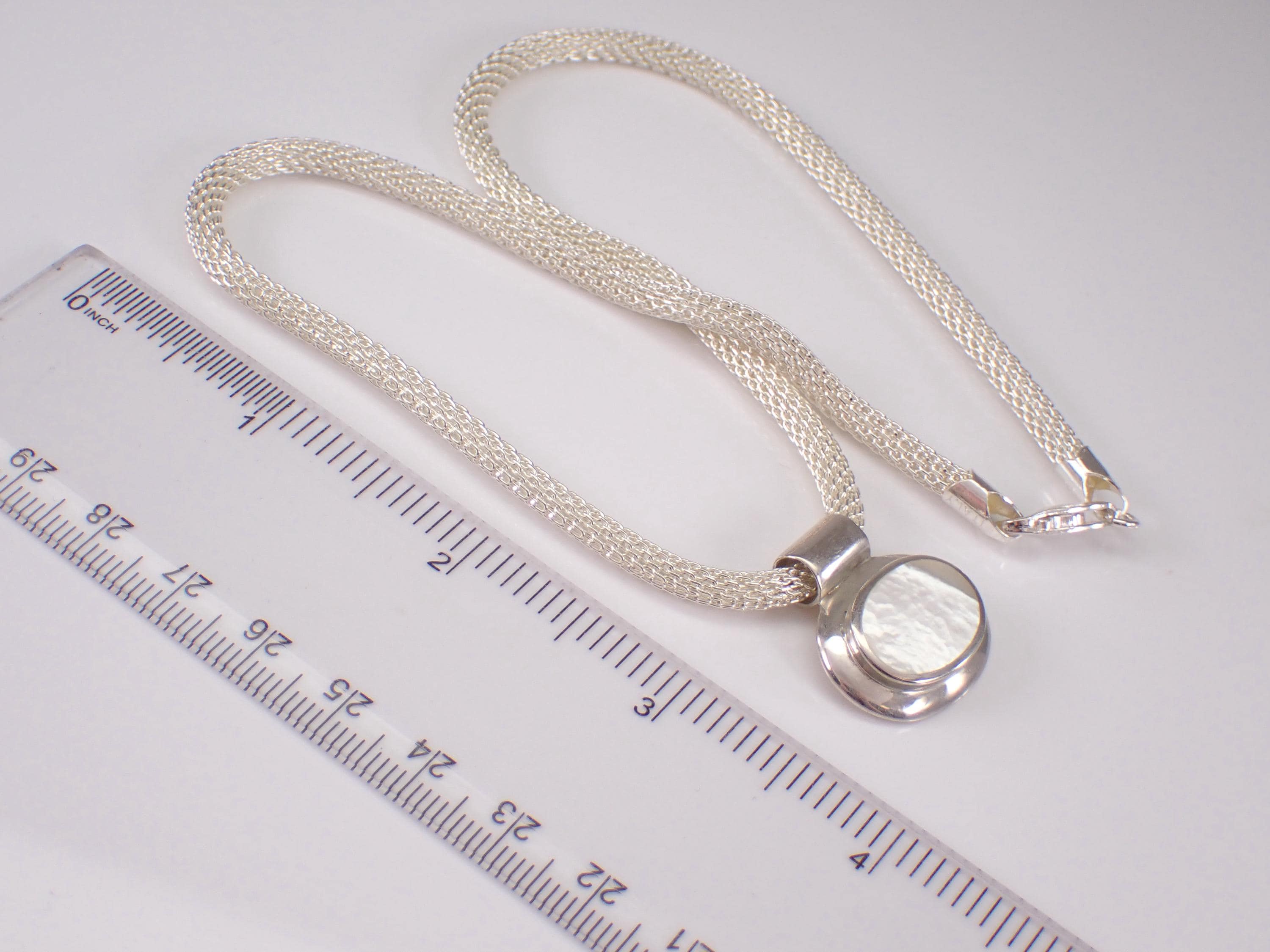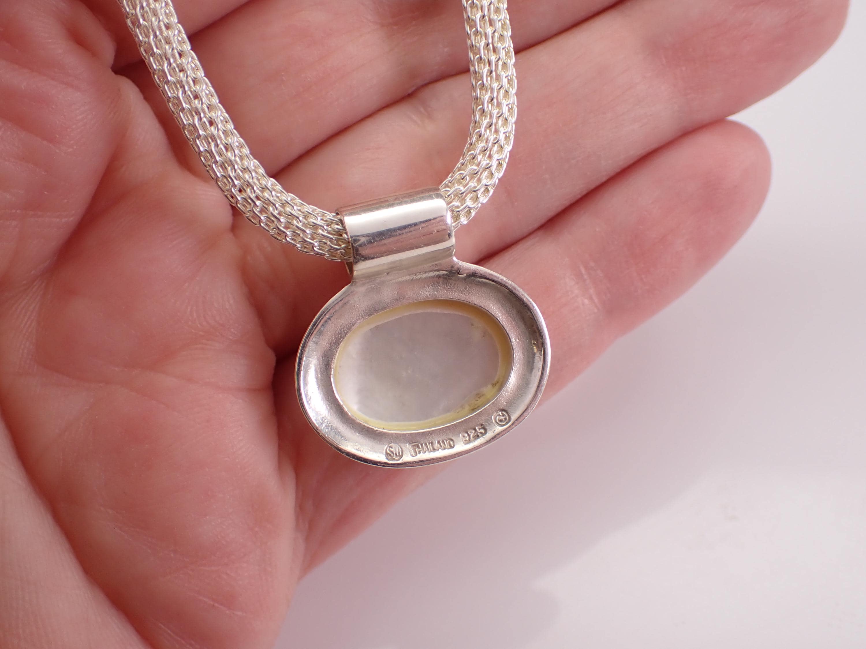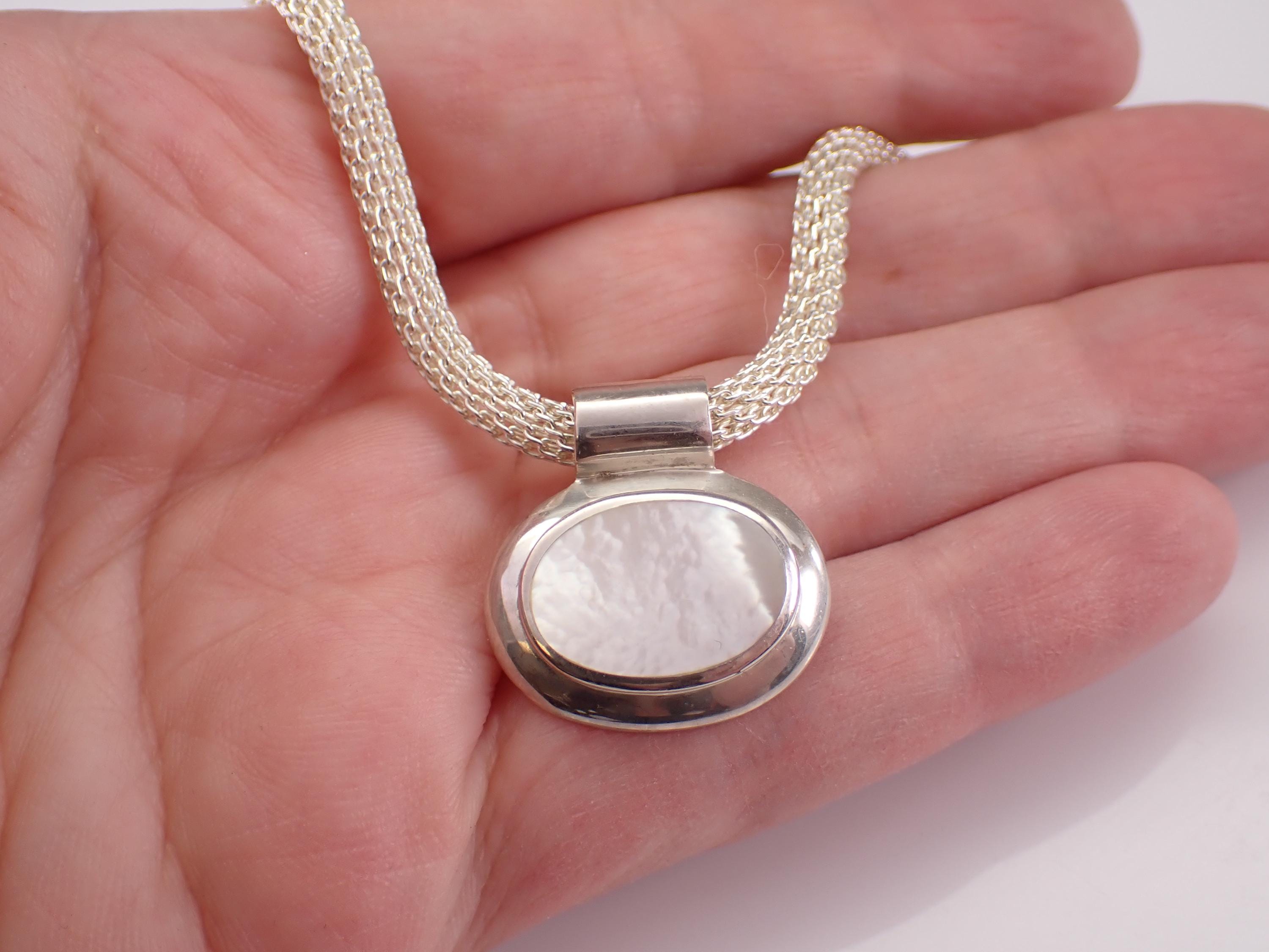 This pendant and chain are both Sterling Silver and the chain measures 17" in length. The slide is set with an Oval Mother of Pearl which measures 16 X 10 mm. This necklace weighs 18.2 grams and the chain measures 4mm in diameter. This necklace is perfect for everyday wear, great gift for any occasion! Will be shipped promptly in a gift pouch.