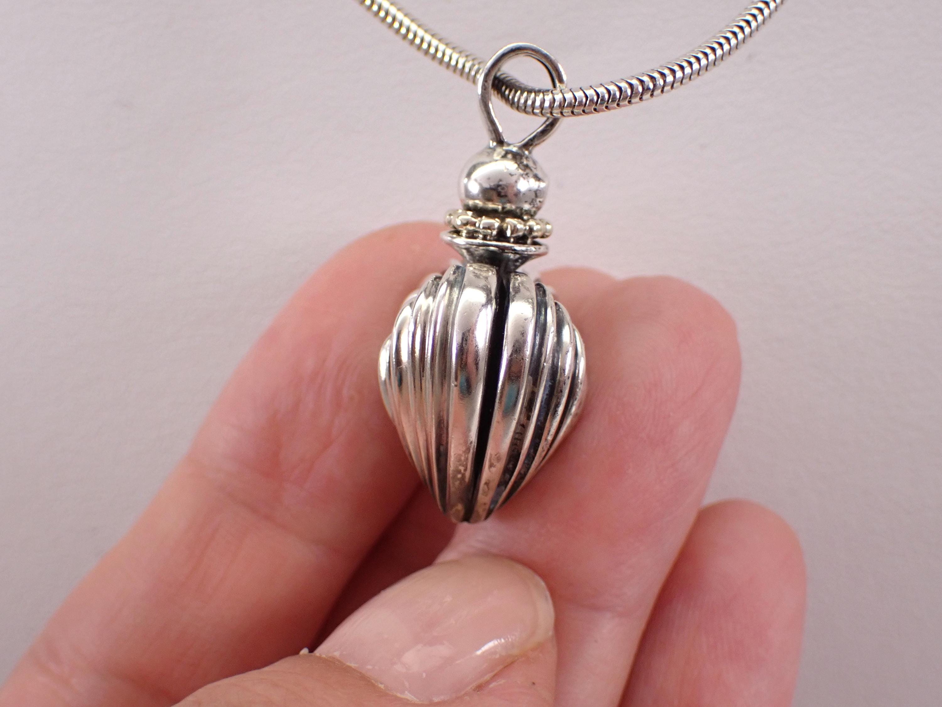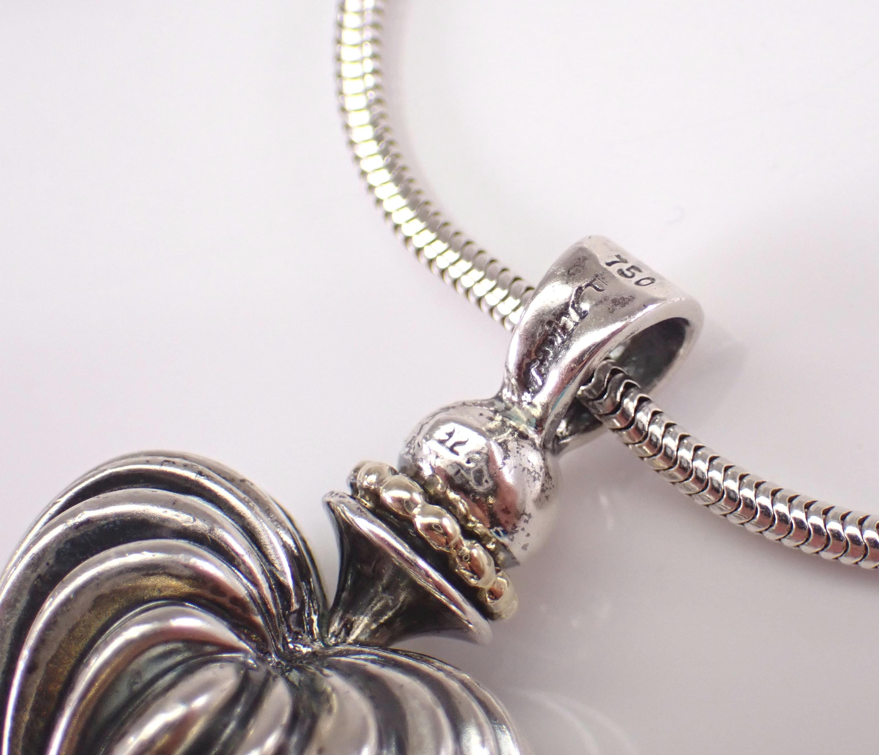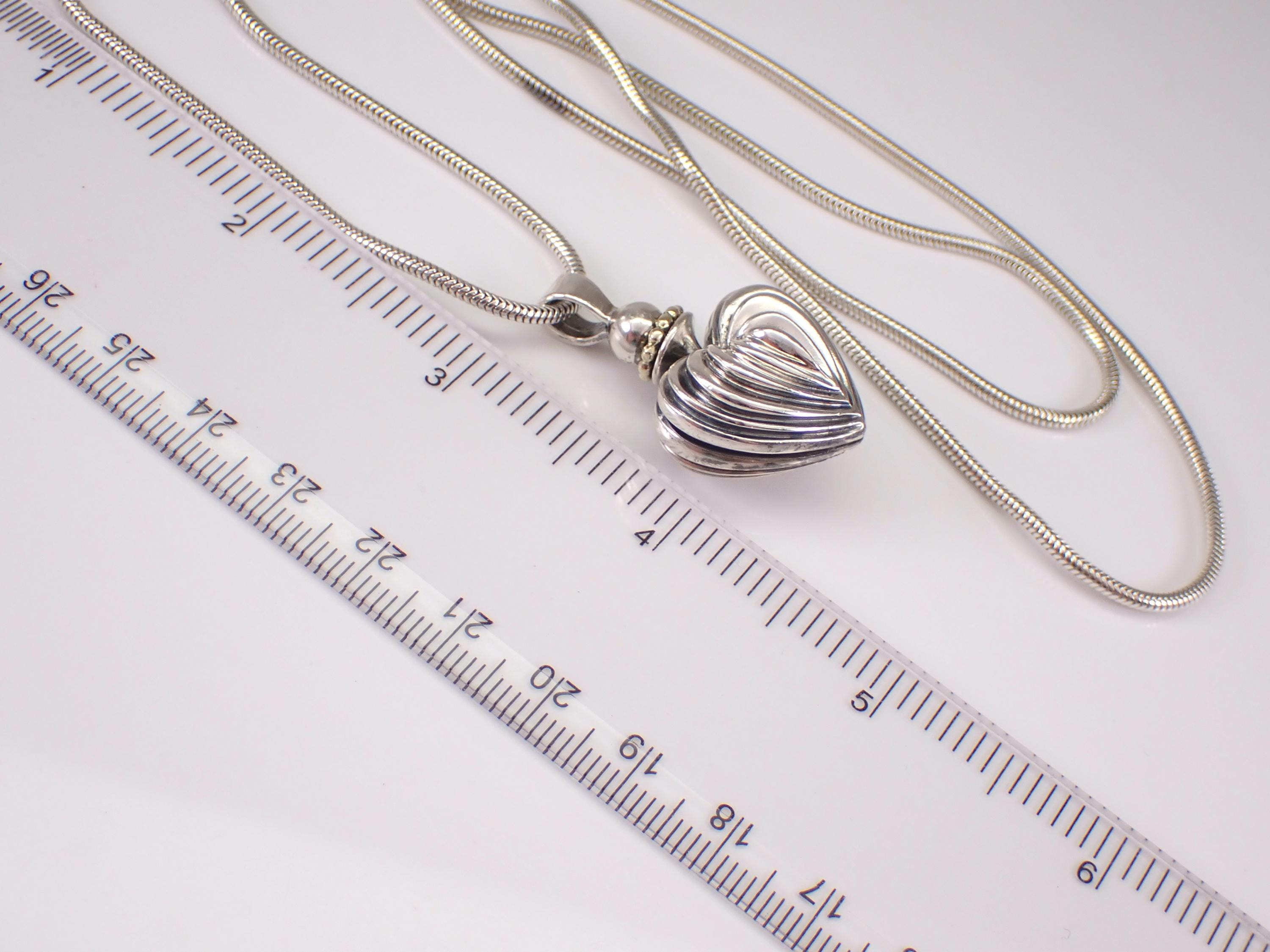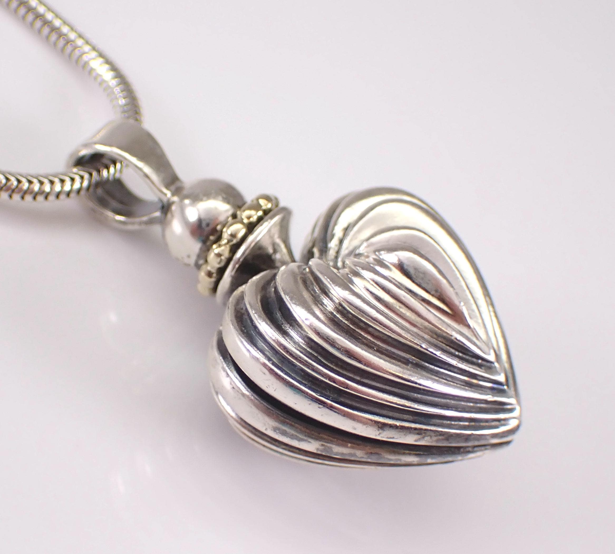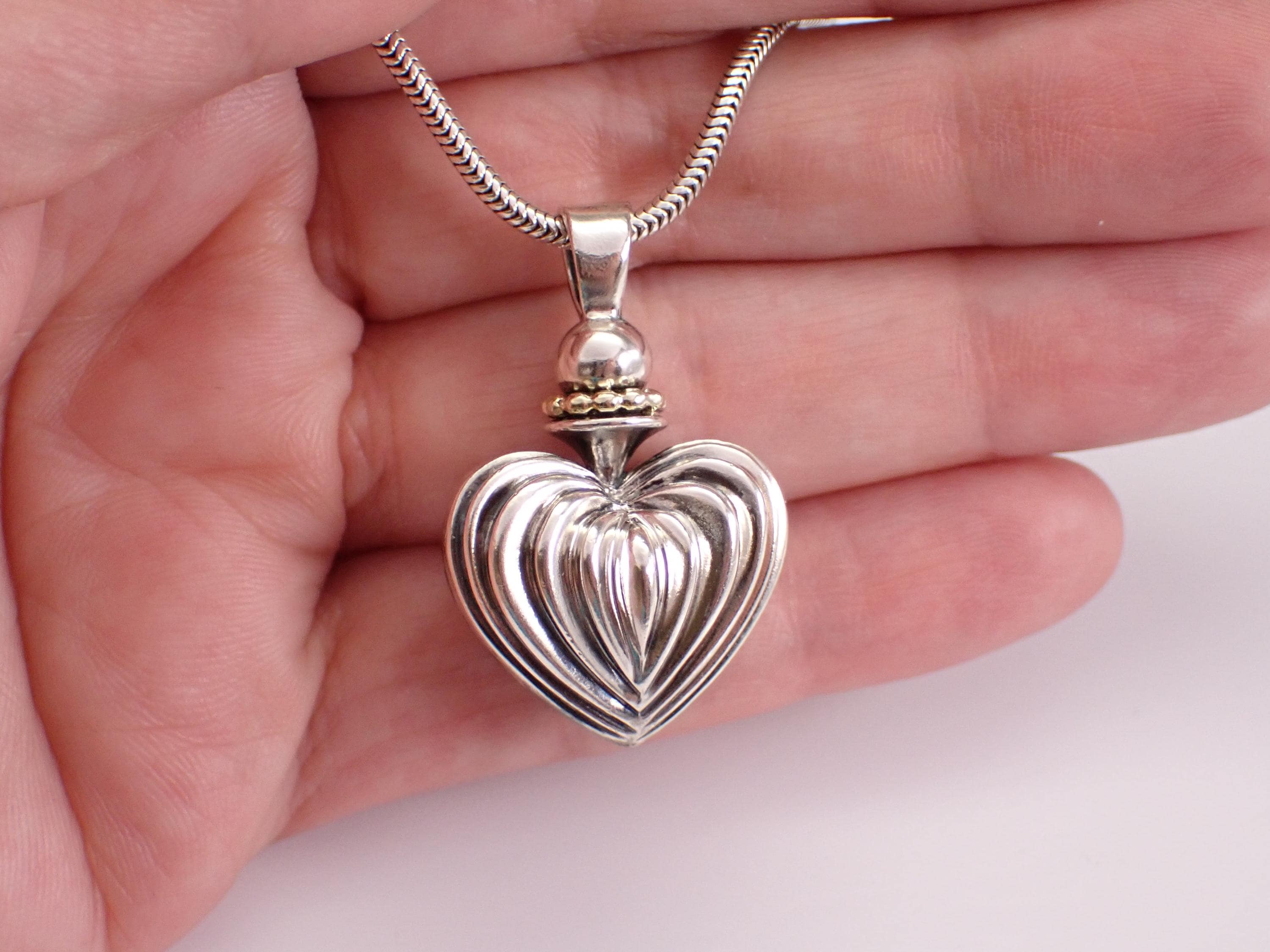 This pendant and chain are both Sterling Silver (the charm has 18K Yellow Gold beading at the top) and the chain measures 30" in length. The heart measures 35 X 21.5 mm with the bail. This necklace weighs 31.7 grams. This necklace is perfect for everyday wear, great gift for any occasion! Will be shipped promptly in a gift pouch, NOT the original Lagos pouch.