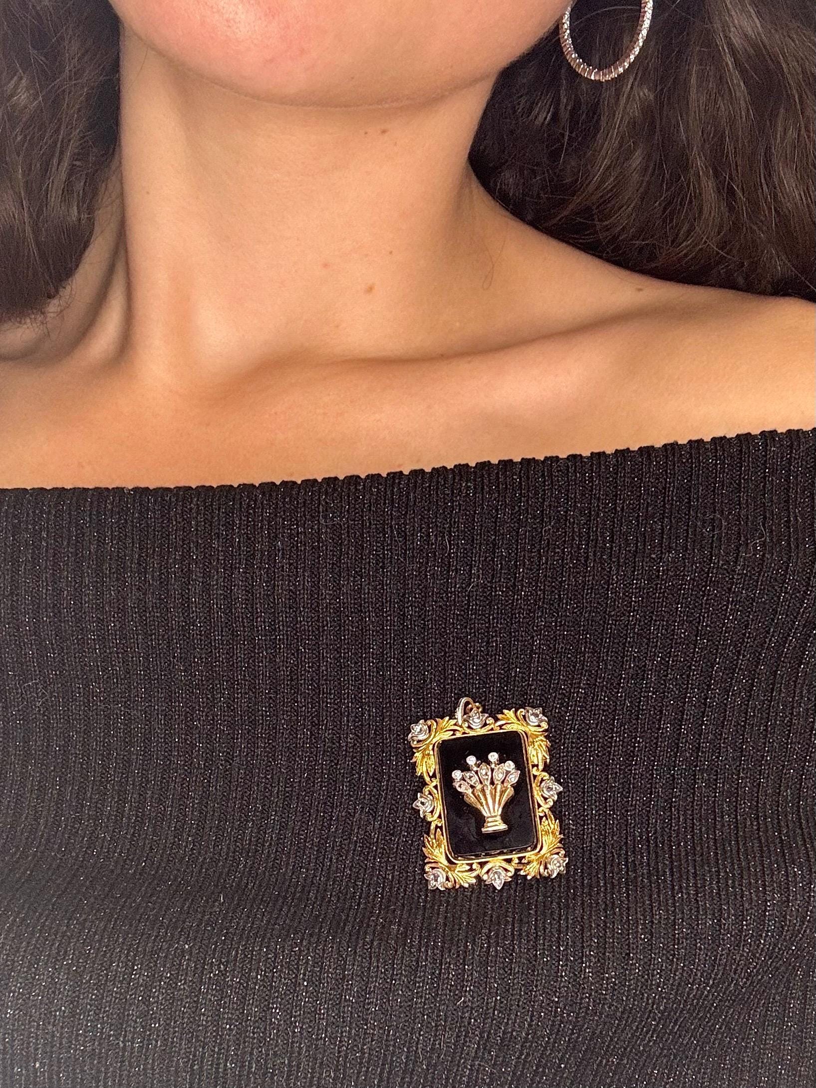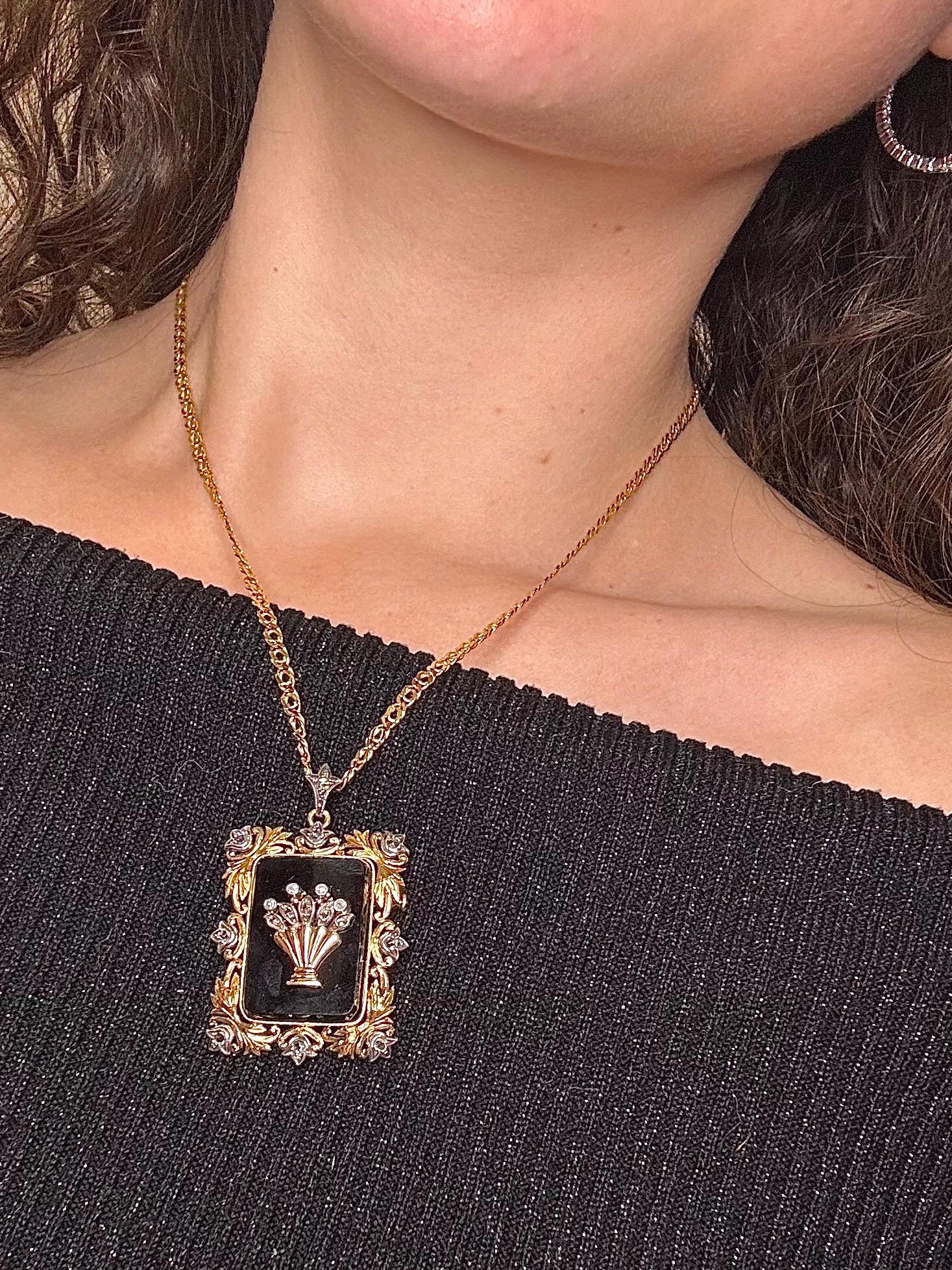 Antique 14K Yellow Gold Onyx and Diamond Pin Brooch Pendant. This gorgeous pin is can be worn as a pendant. There is a rectangular genuine Black Onyx set in the center of this brooch. This Onyx measures 27 X 19 mm. There are also seventeen Rose Cut Diamonds set throughout this pin. These diamonds are H color, I1 clarity and weigh a total of .30 carat. This pin weighs 16.0 grams and measures 38 X 32 mm without the bail. This pendant will be accompanied by an appraisal by a GIA Certified Diamond Grader with the replacement value of $7,395.00. I will ship this pin promptly in a beautiful gift box.