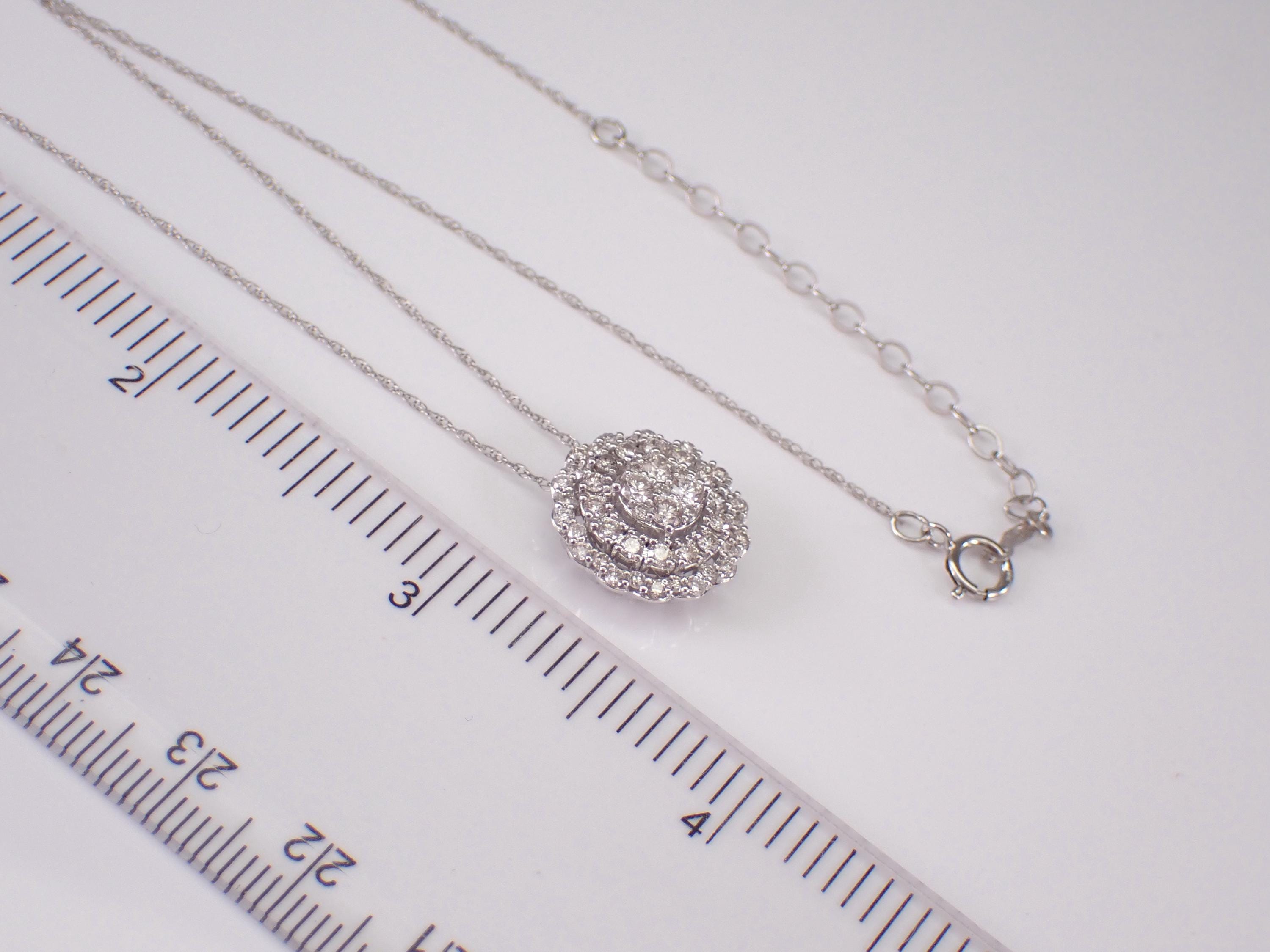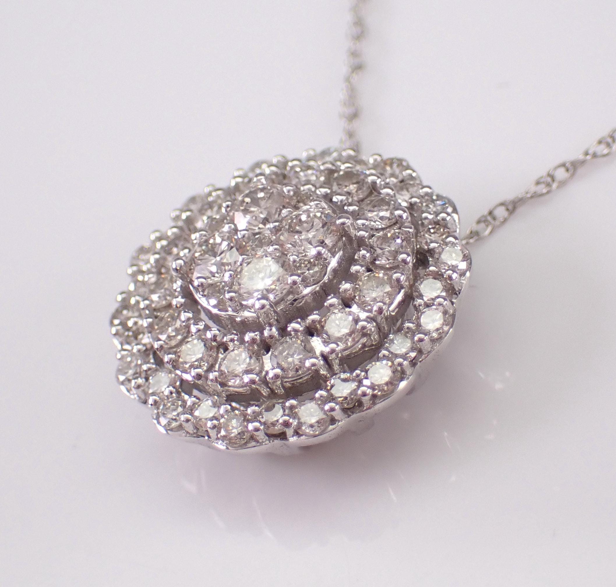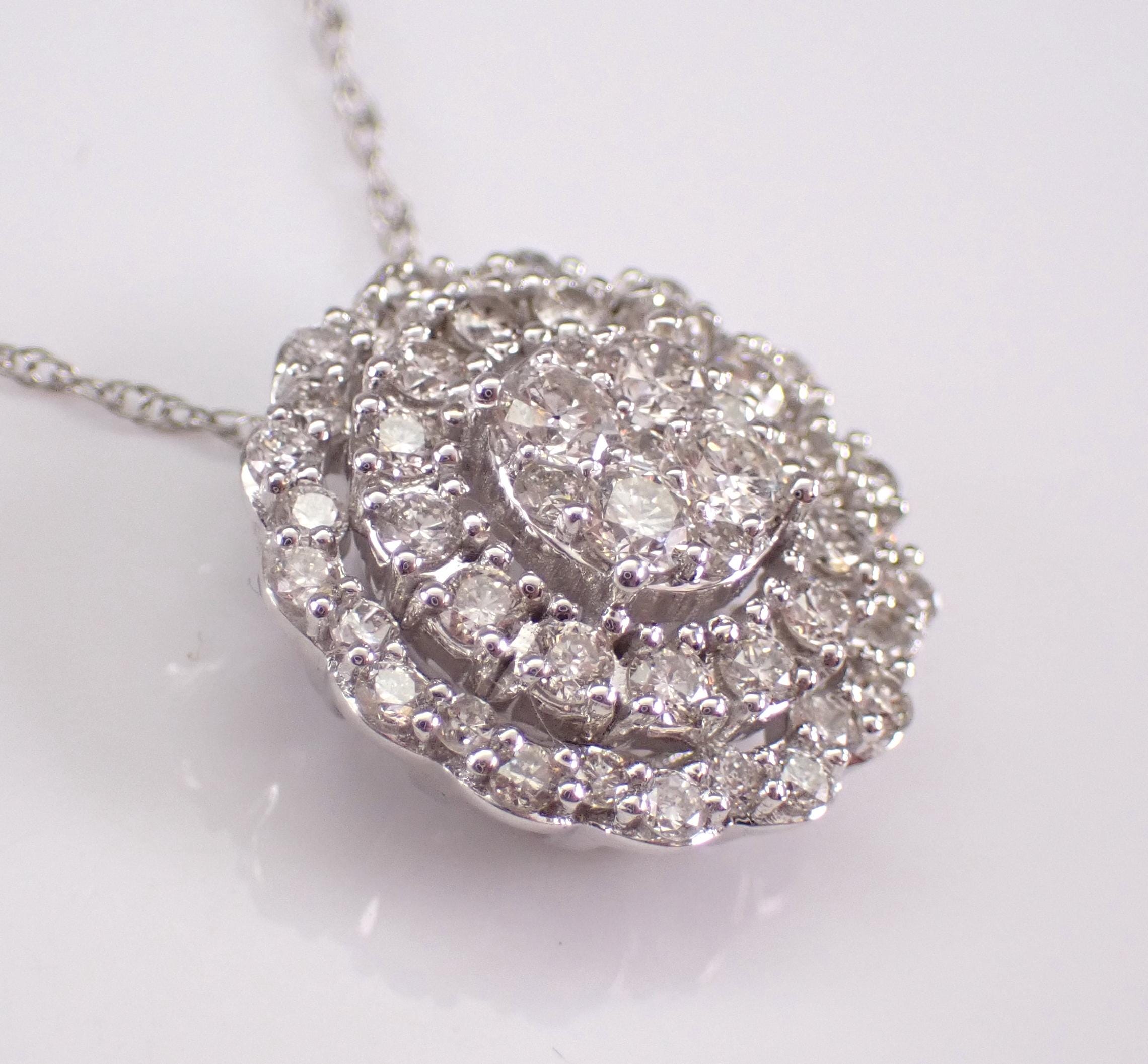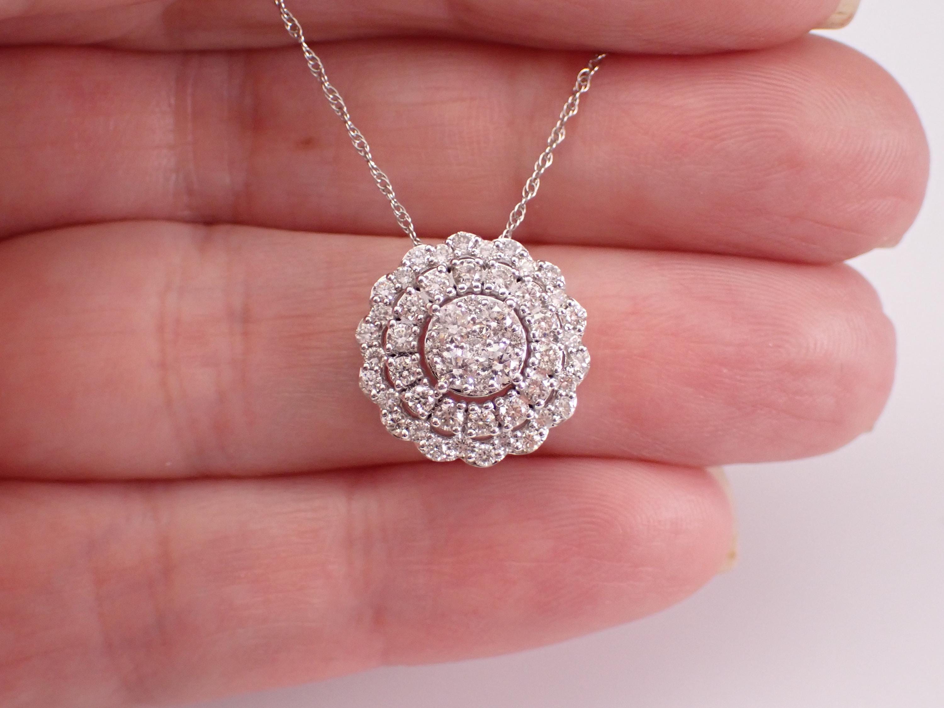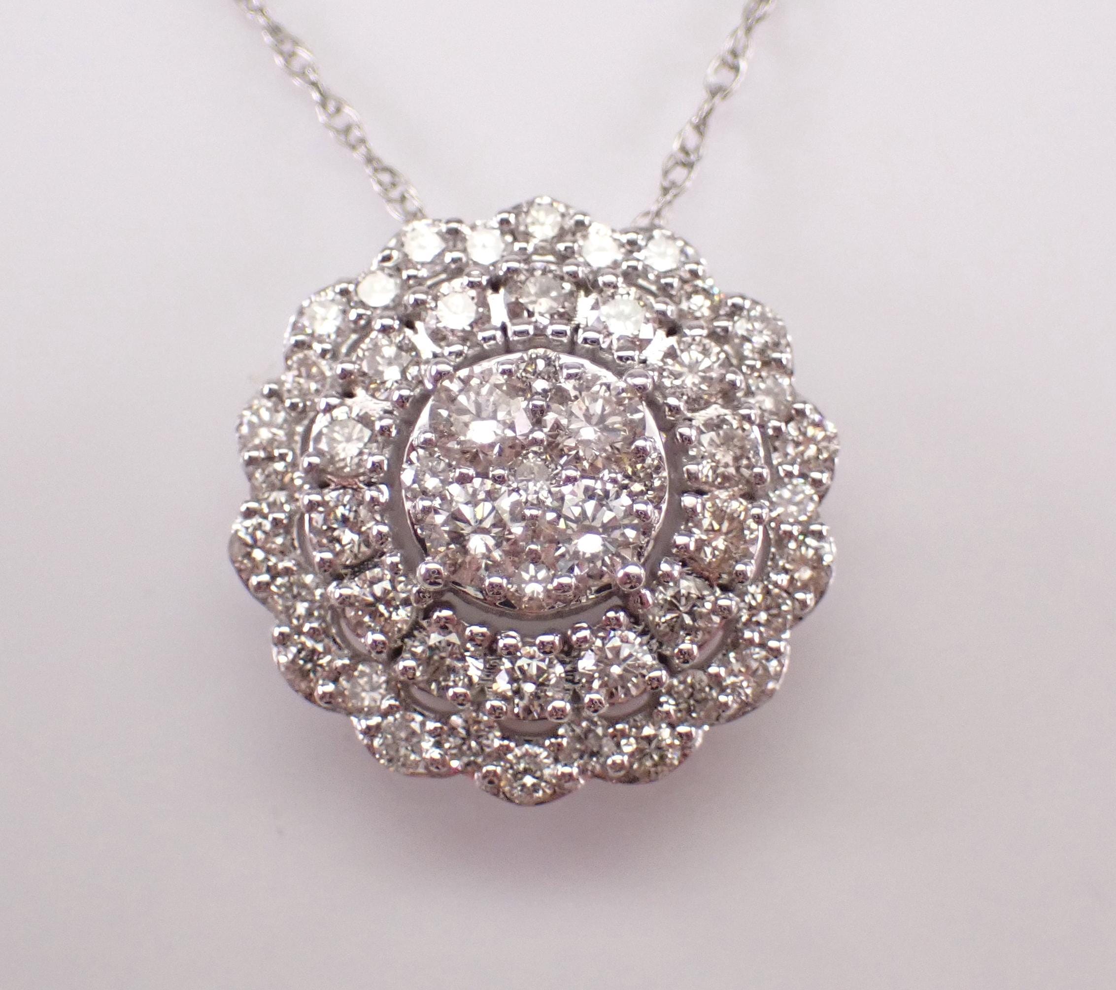 White Gold Diamond Cluster Charm Pendant with Chain. This pendant is set with fifty-one Round Brilliant Diamonds. These diamonds are G color, SI/I1 clarity and weigh a total of 1.02 carat. This pendant is 10KT White Gold and comes with an 18" 10KT White Gold chain. This necklace weighs 2.7 grams and the pendant measures 15 mm in diameter. This necklace will be accompanied by an appraisal written by a GIA Certified Diamond Grader with the retail replacement value of $2,389.00. I will ship this necklace promptly in a beautiful gift box.