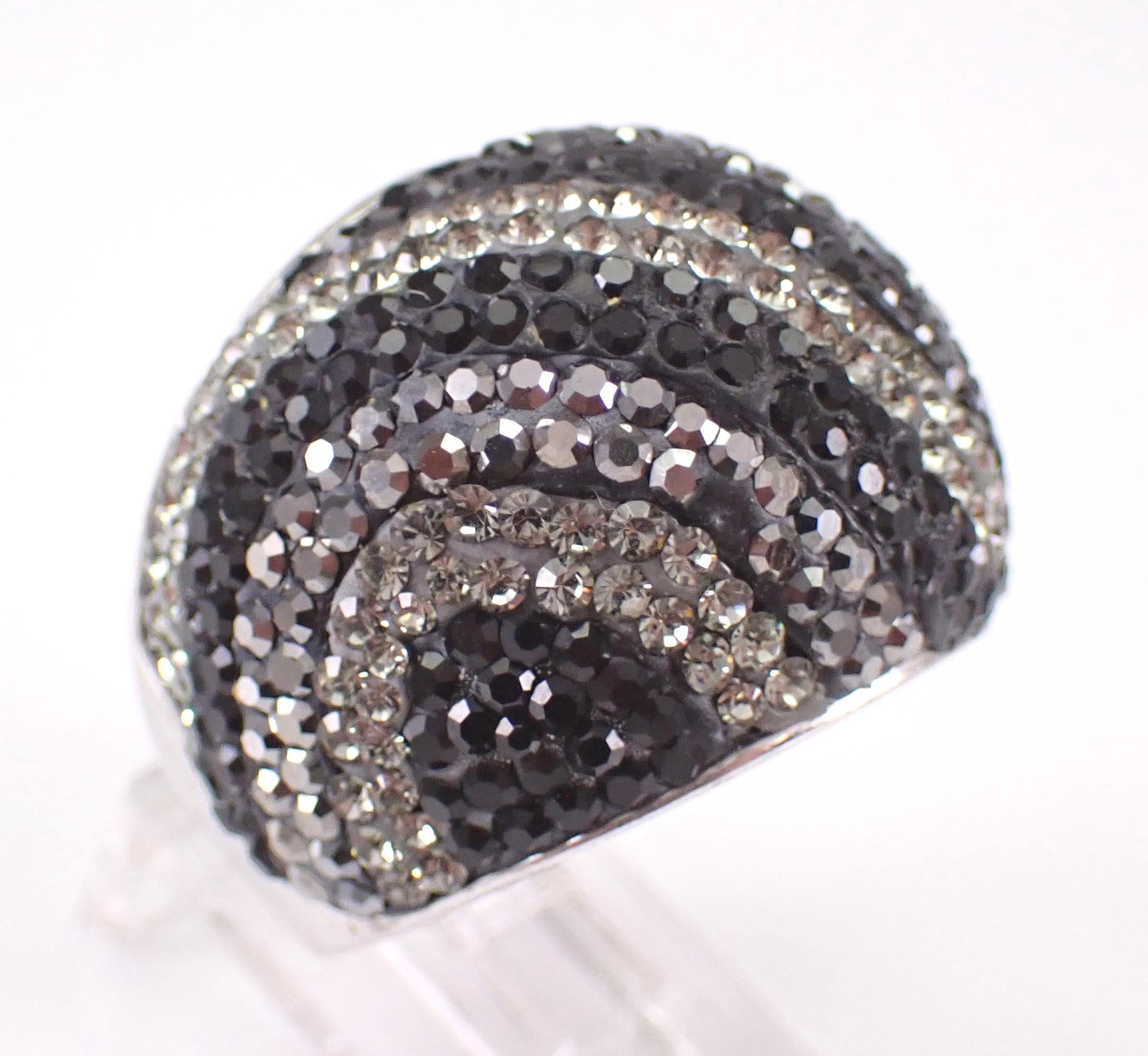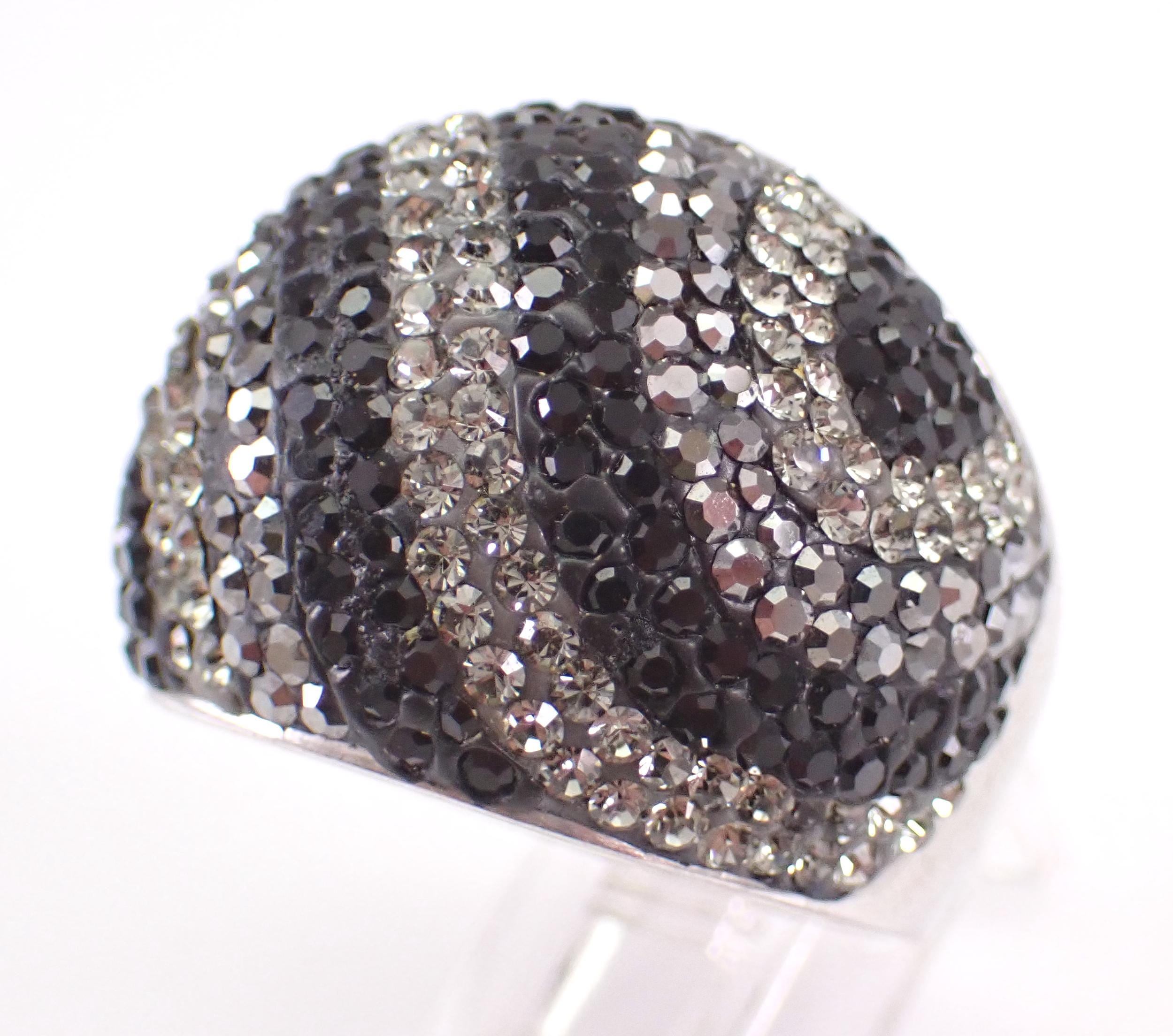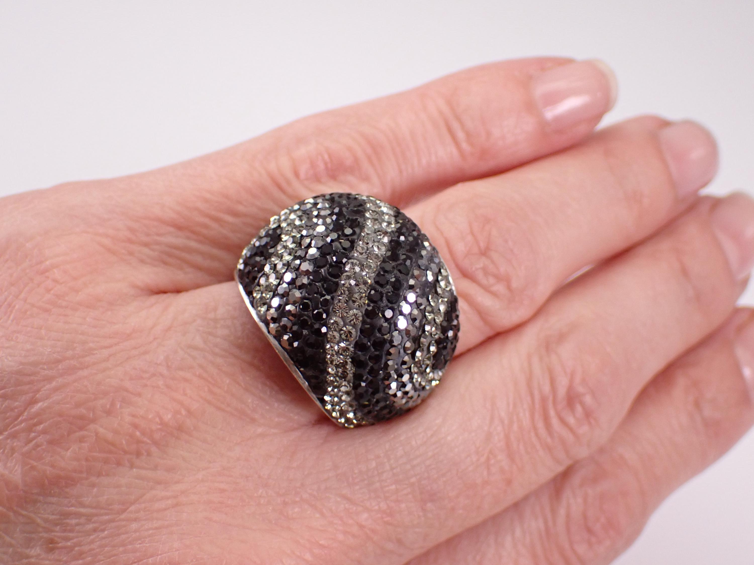 Beautiful Vintage Sterling Silver Marcasite and Swarovski Dome Band. This ring is Sterling Silver and weighs 14.4 grams, measures 21 mm in width and is a finger size 9. I will ship this ring promptly in a gift pouch.