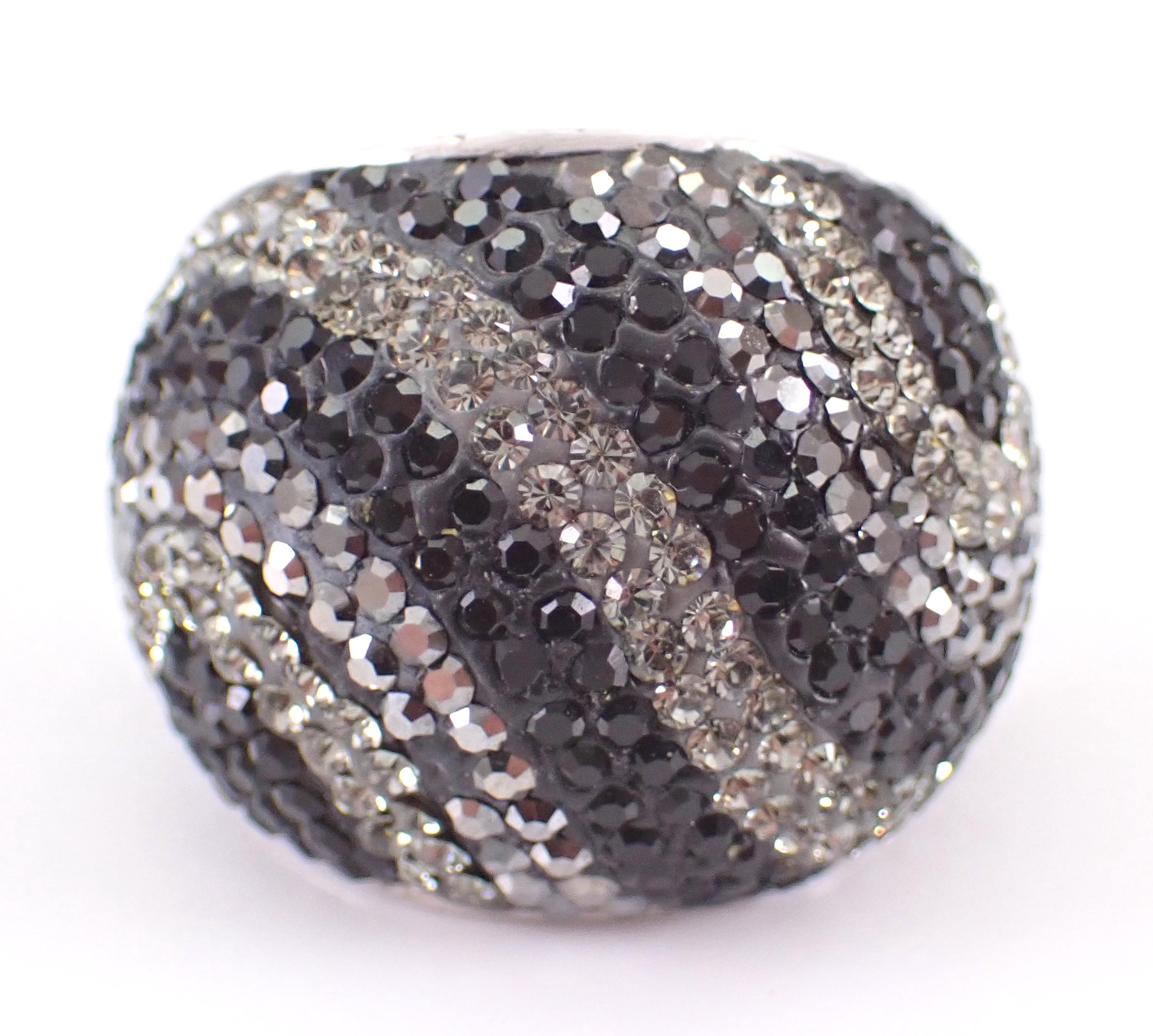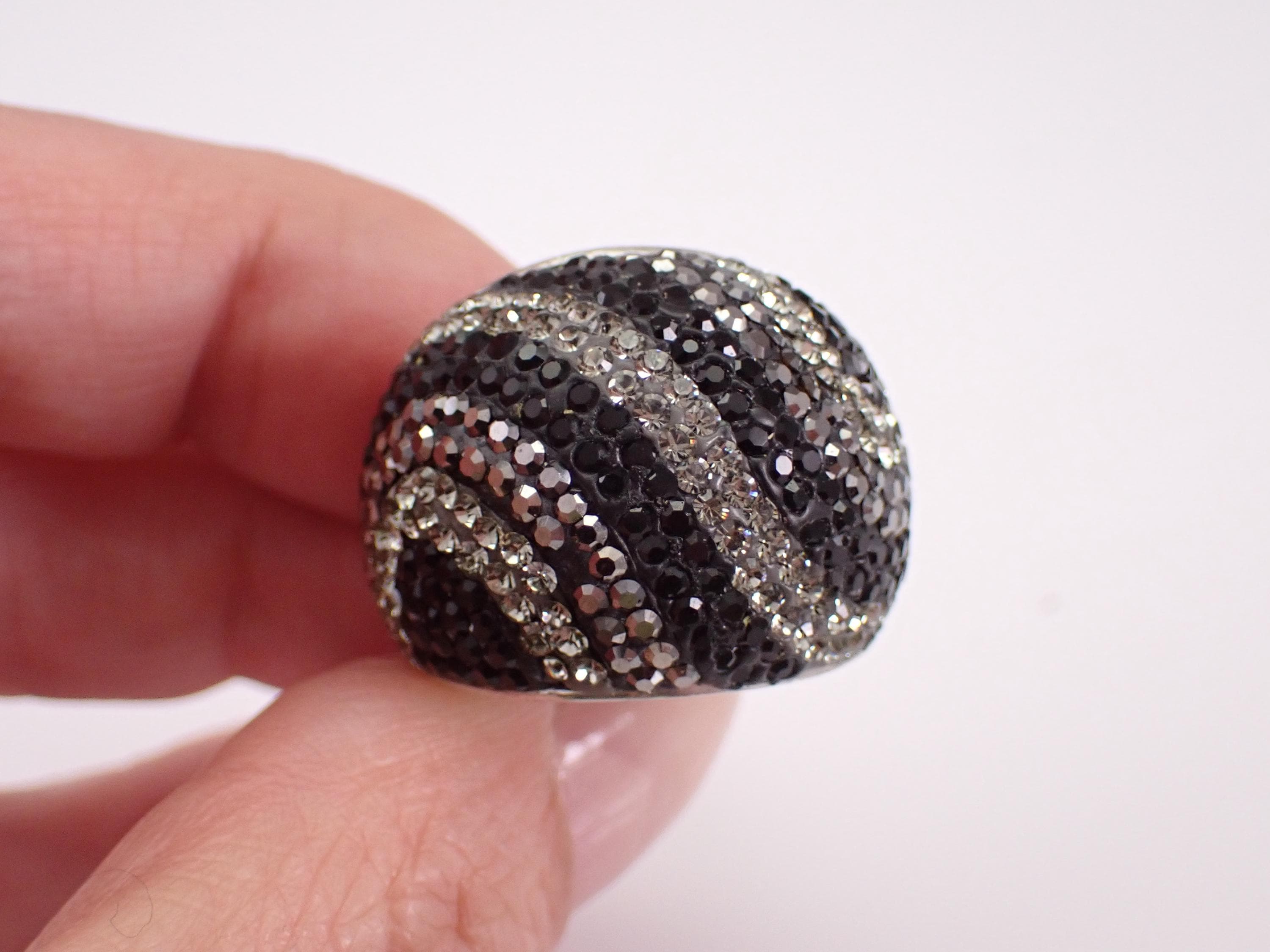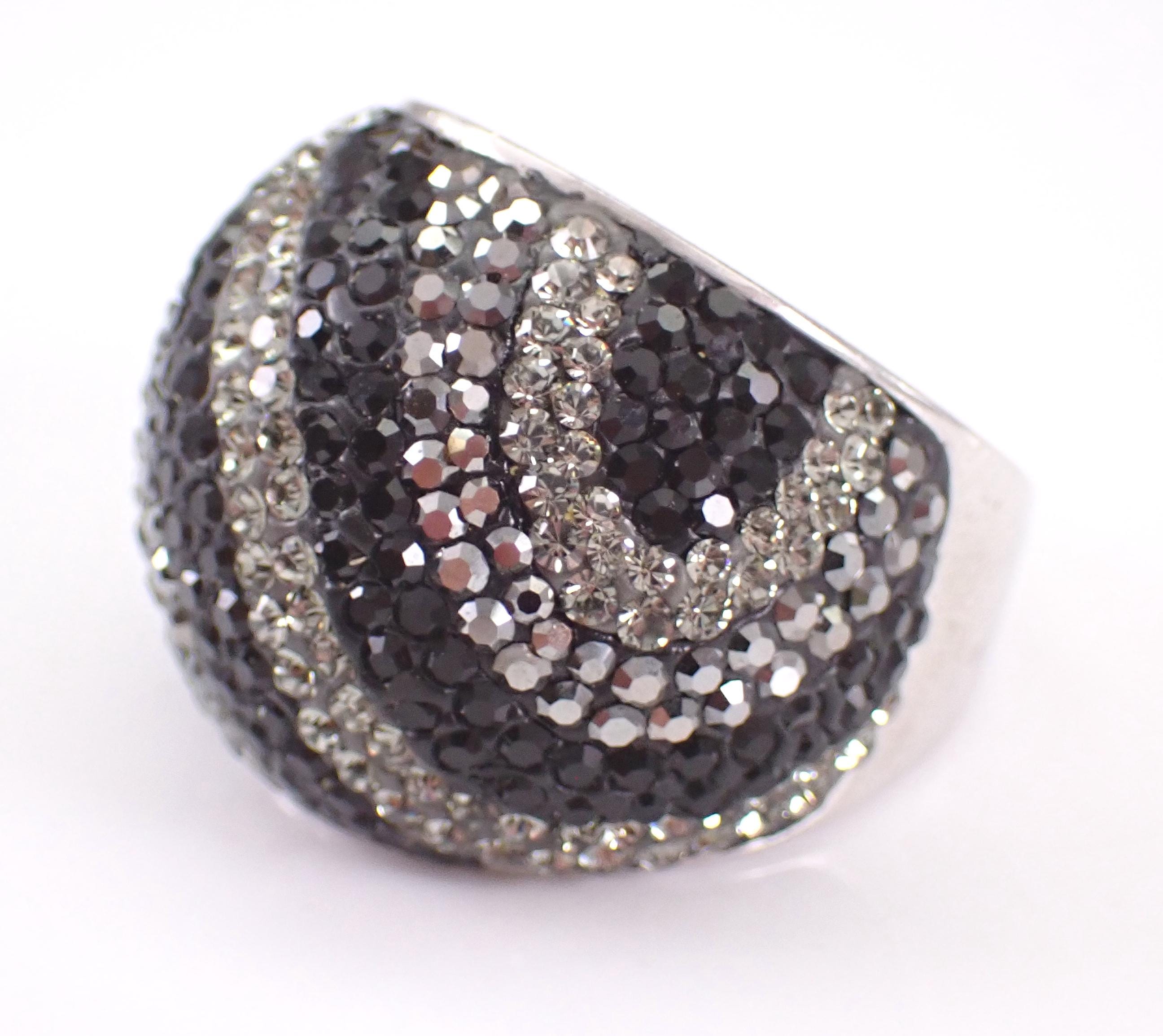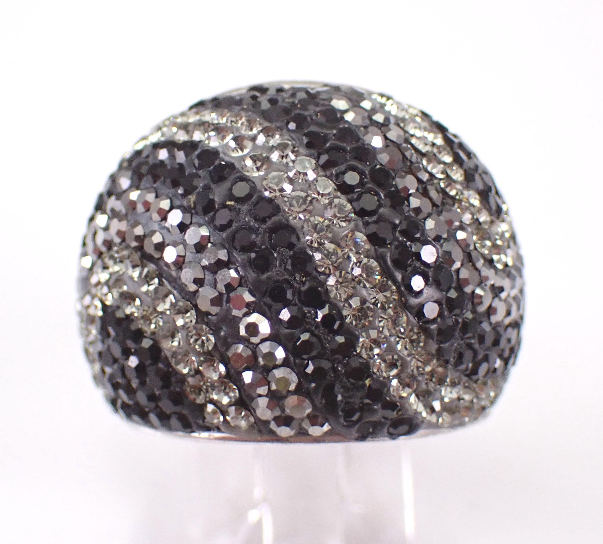 Beautiful Vintage Sterling Silver Marcasite and Swarovski Dome Band. This ring is Sterling Silver and weighs 14.4 grams, measures 21 mm in width and is a finger size 9. I will ship this ring promptly in a gift pouch.