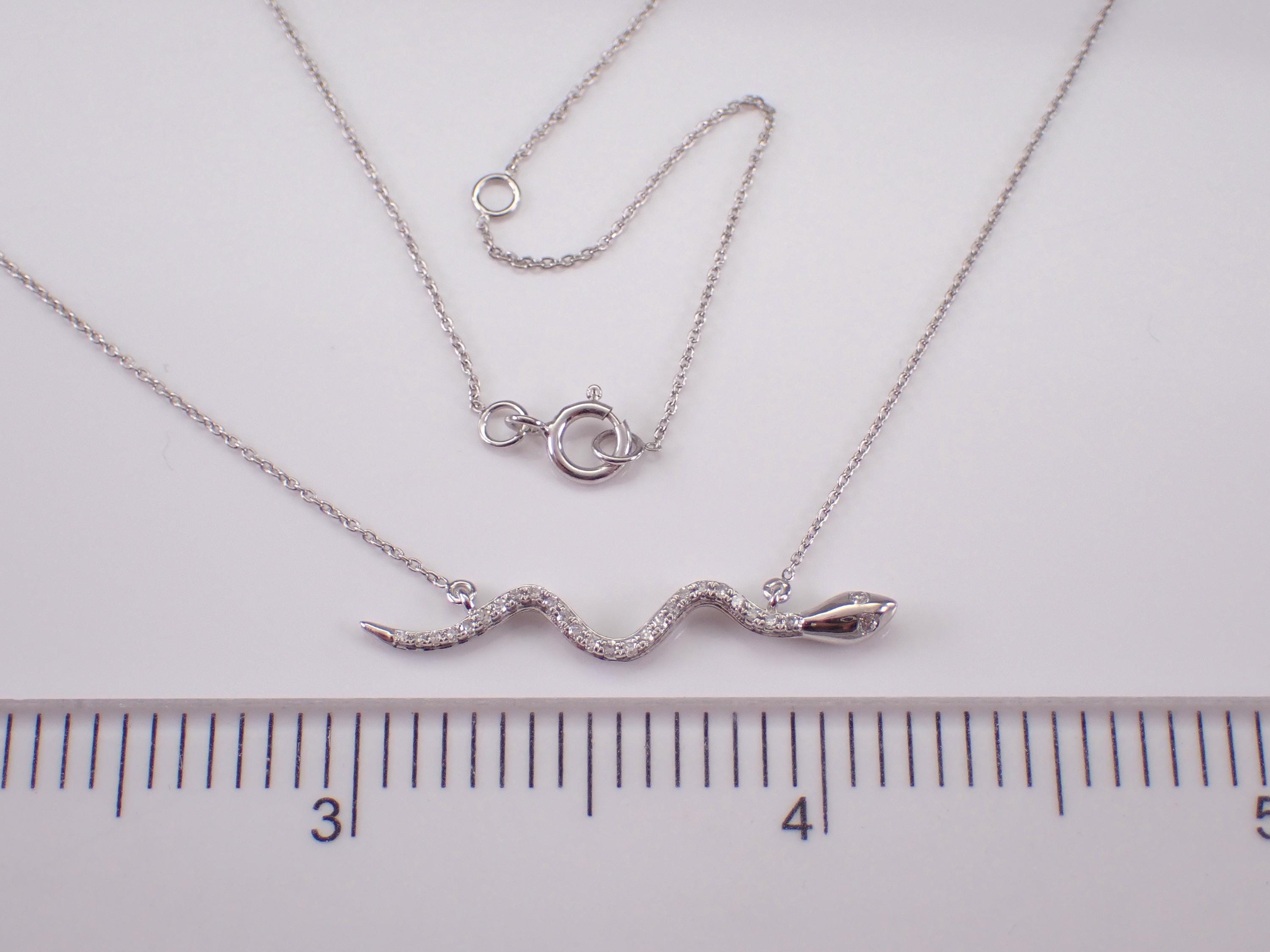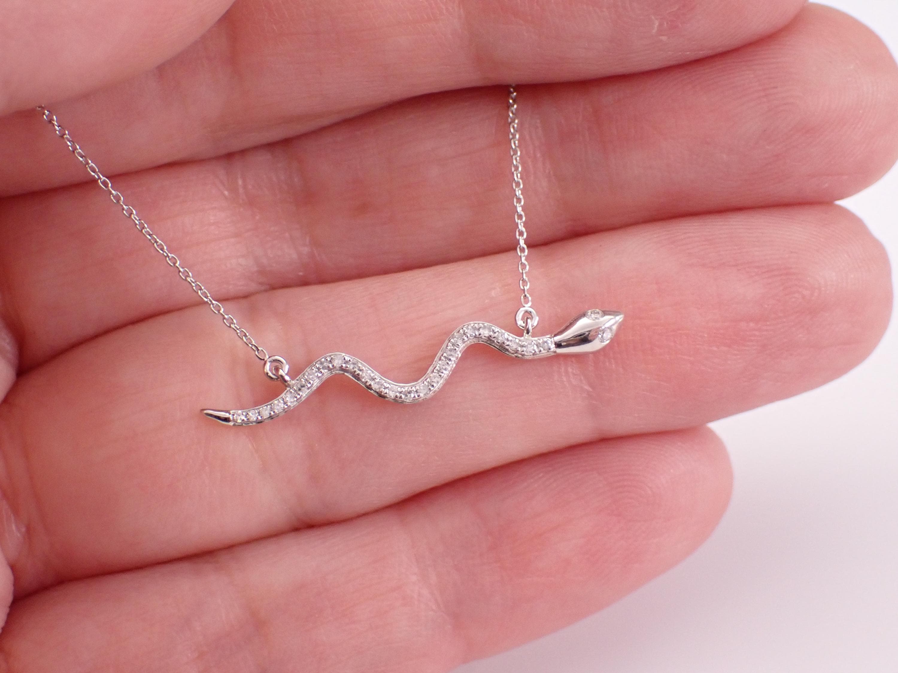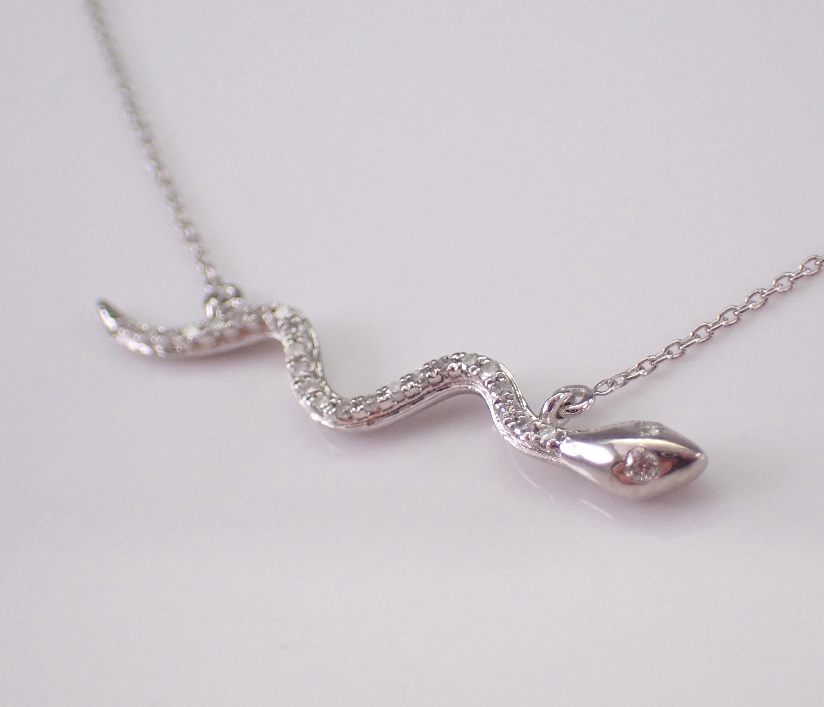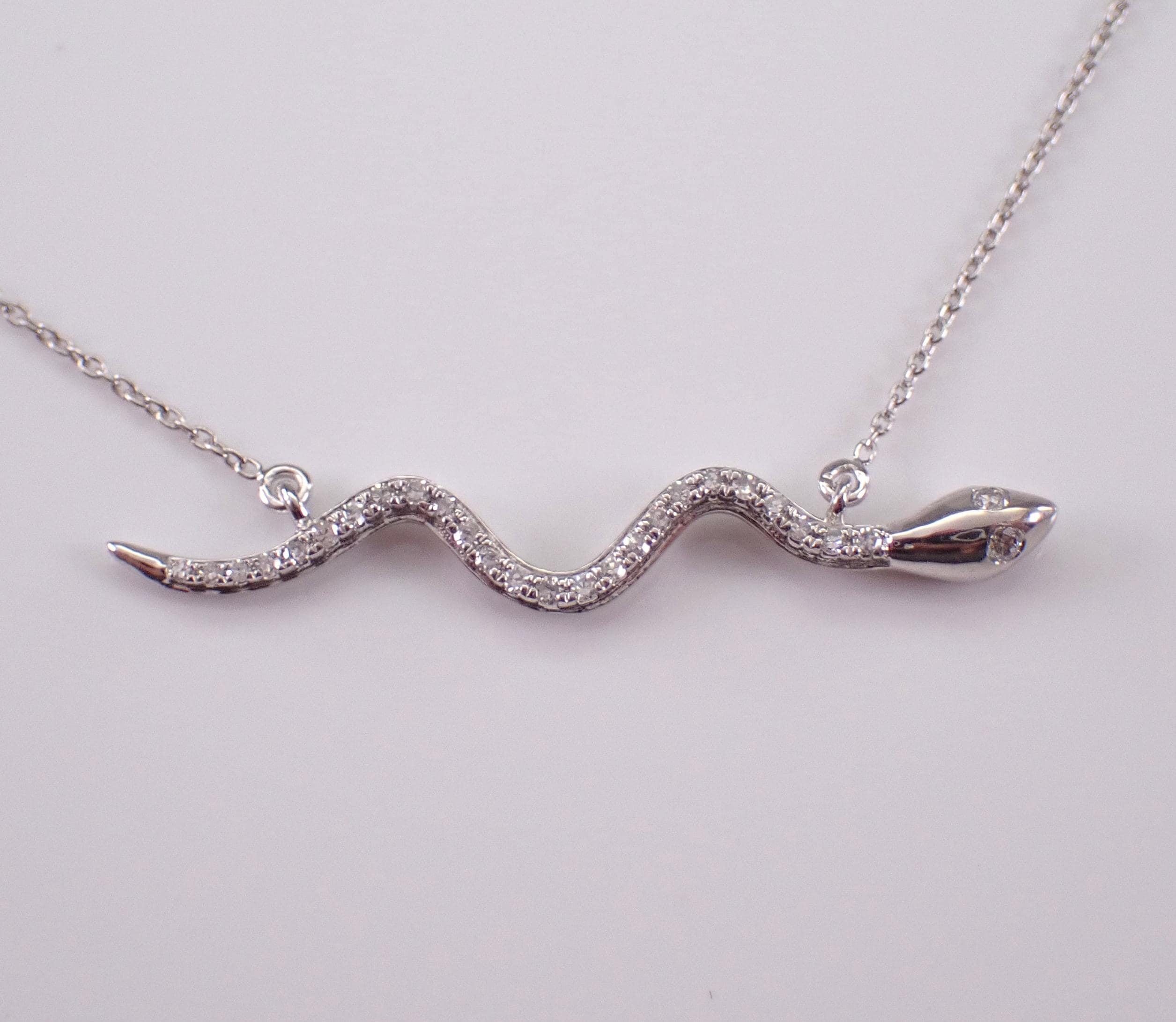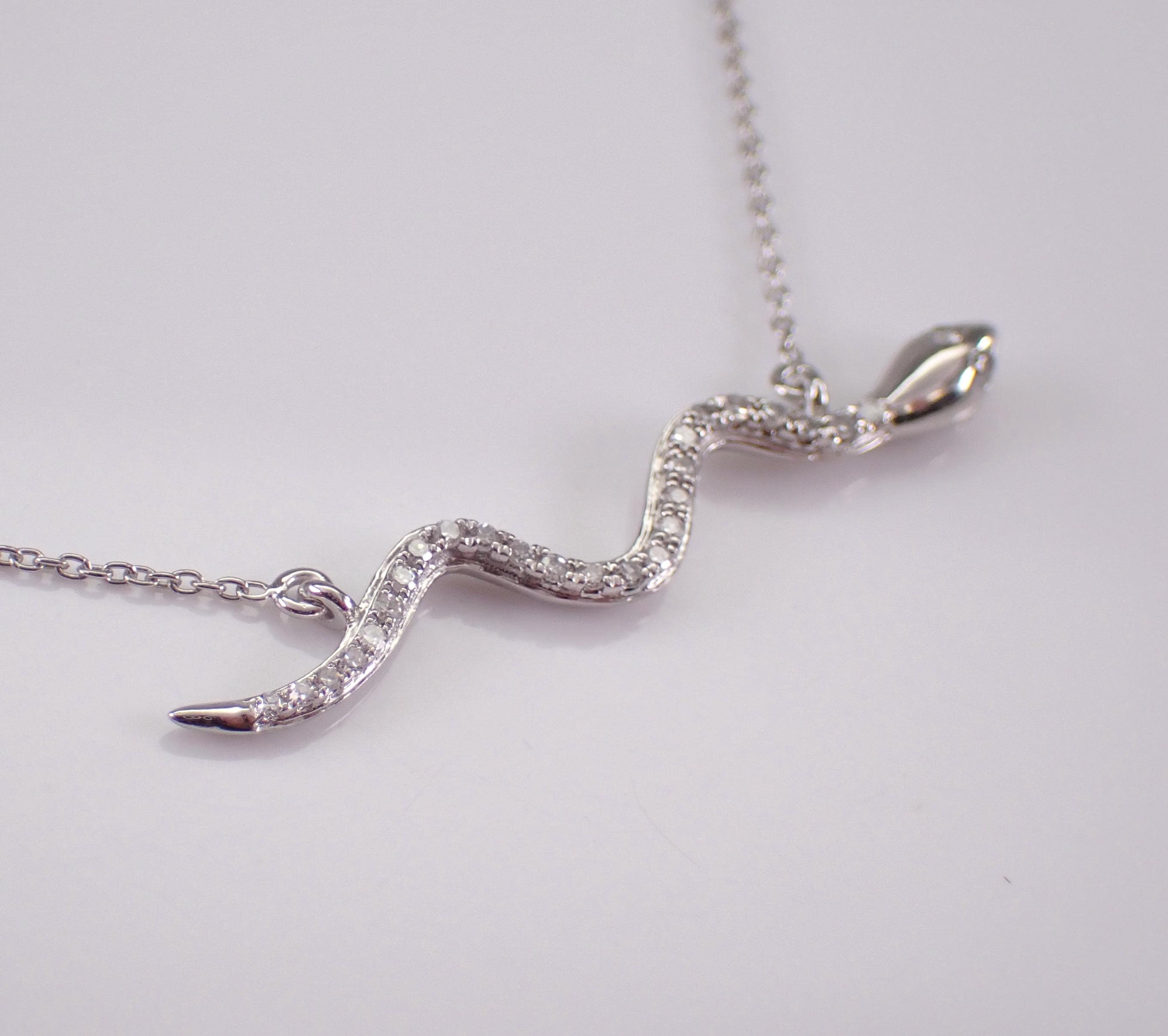 White Gold Diamond Snake Necklace Pendant with Chain. This necklace is set with twenty-eight Round Brilliant Diamonds. These Diamonds are H color, SI clarity and weigh a total of .10 carat. This snake is attached to an 18" 10K White Gold Chain. The pendant and the chain weigh a total of 1.4 grams and the snake measures 29.5 mm across. This necklace will be accompanied by an appraisal by a GIA Certified Diamond Grader with the retail replacement value of $1,289.00. I will ship this pendant promptly in a beautiful gift box.