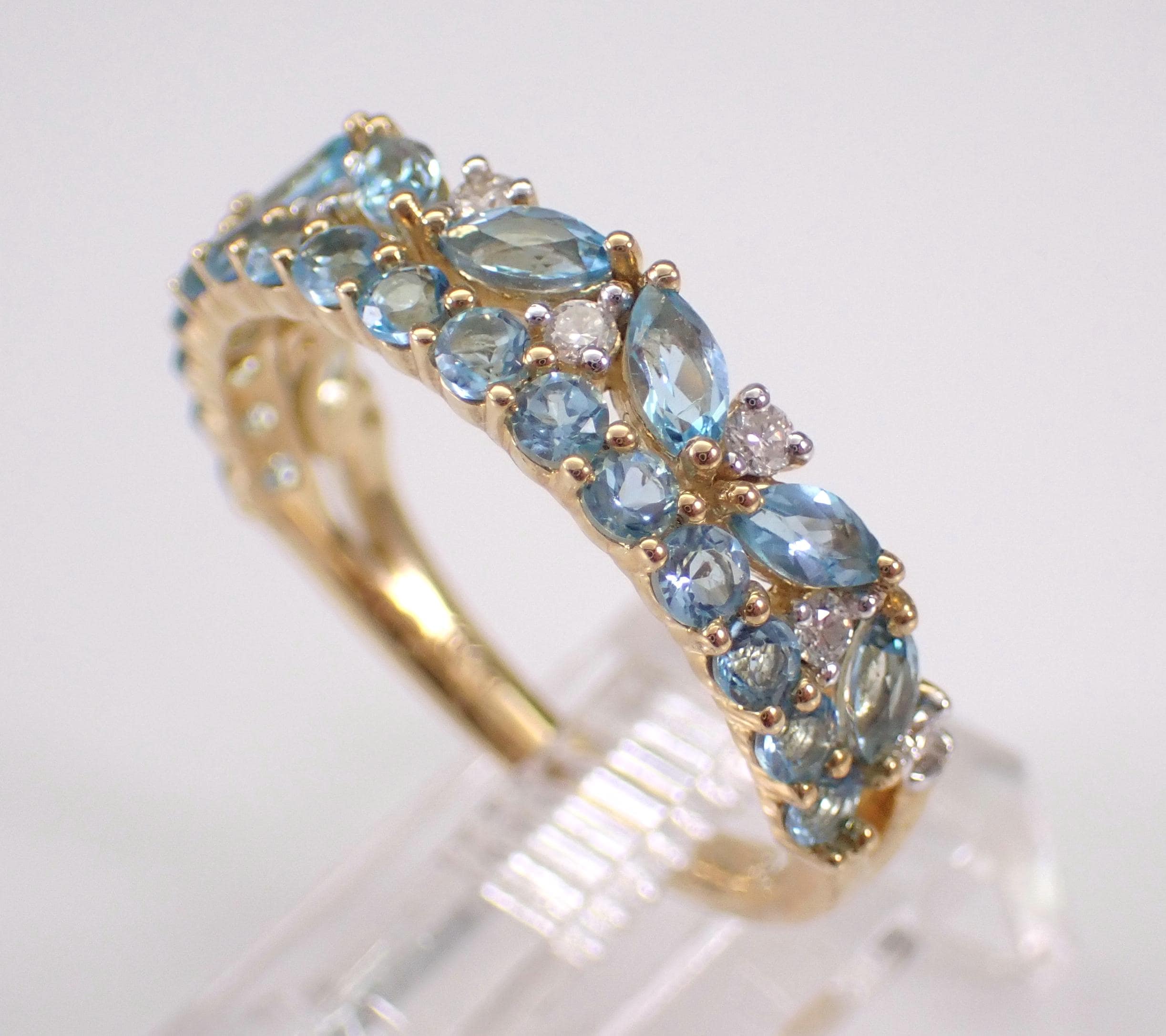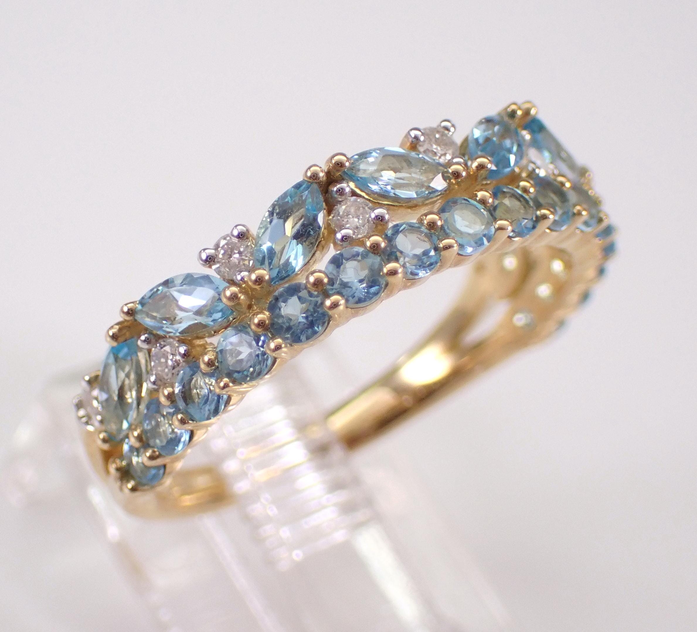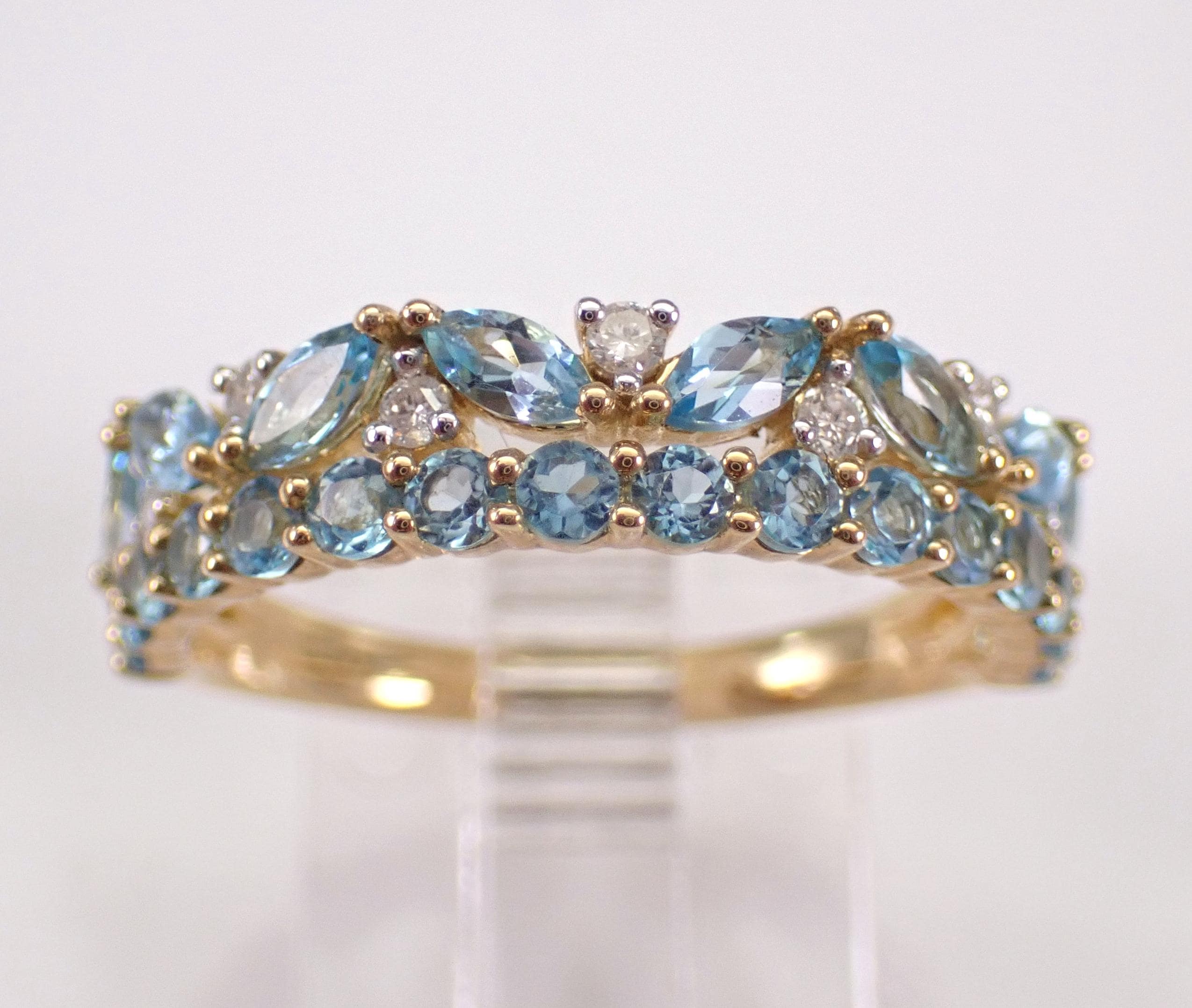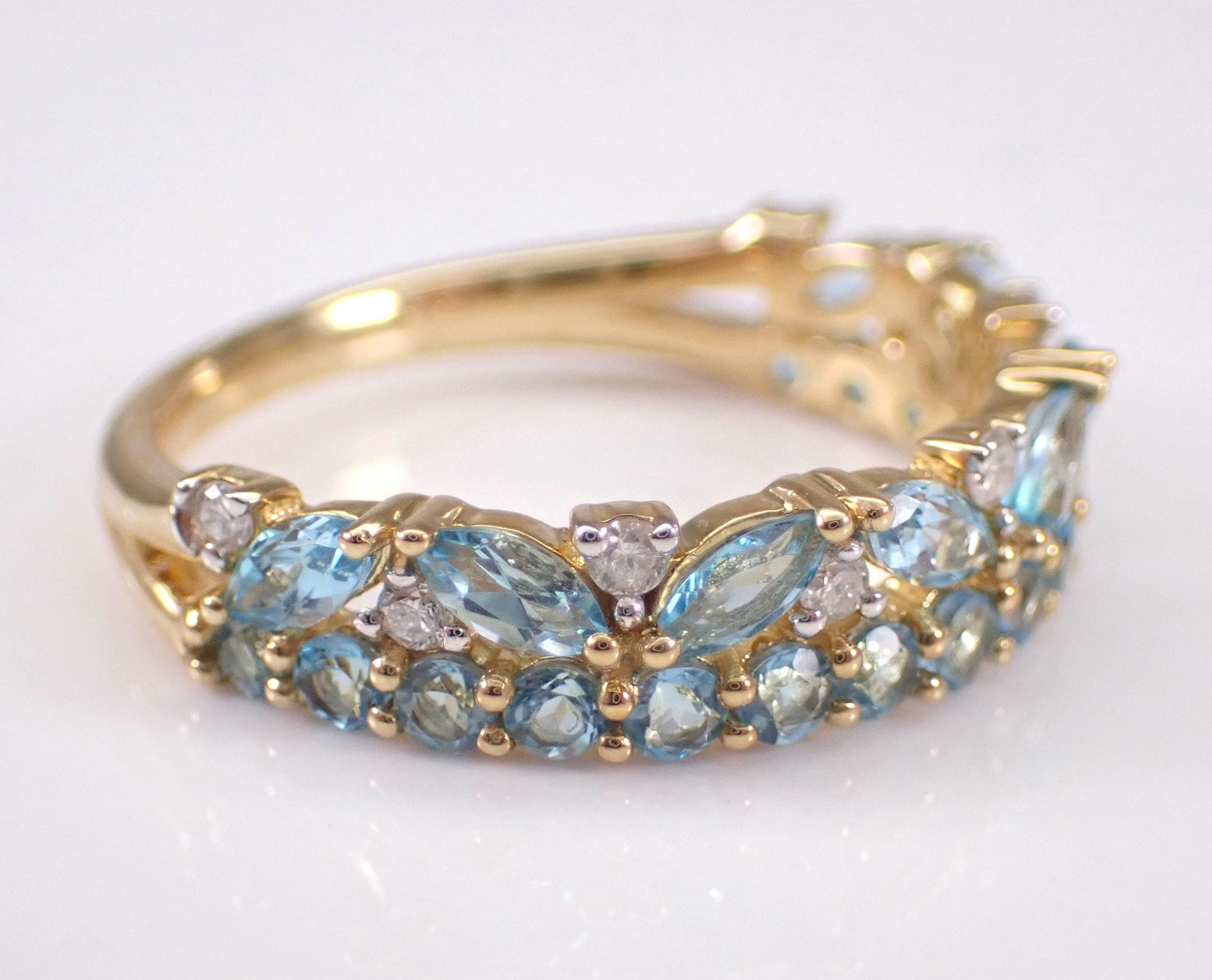 Yellow Gold Diamond and Blue Topaz Wedding Ring Anniversary Band. This ring is set sixteen Round Blue Topaz, eight Marquise Blue Topaz and nine Round Brilliant Diamonds. The Blue Topaz in this ring are a sky blue color, and amount to a total weight of 3/4 carat. The diamonds in this ring are H color, I1 clarity and weigh a total of .15 carat. This ring is 10KT Yellow Gold, weighs 2.8 grams, measures 5 mm in width and is a finger size 7, which can be resized (please inquire about sizing with the finger size you need). This ring will be accompanied by an appraisal by a GIA Certified Diamond Grader with the retail replacement value of $1,345.00. I will ship this ring promptly in a gift box.