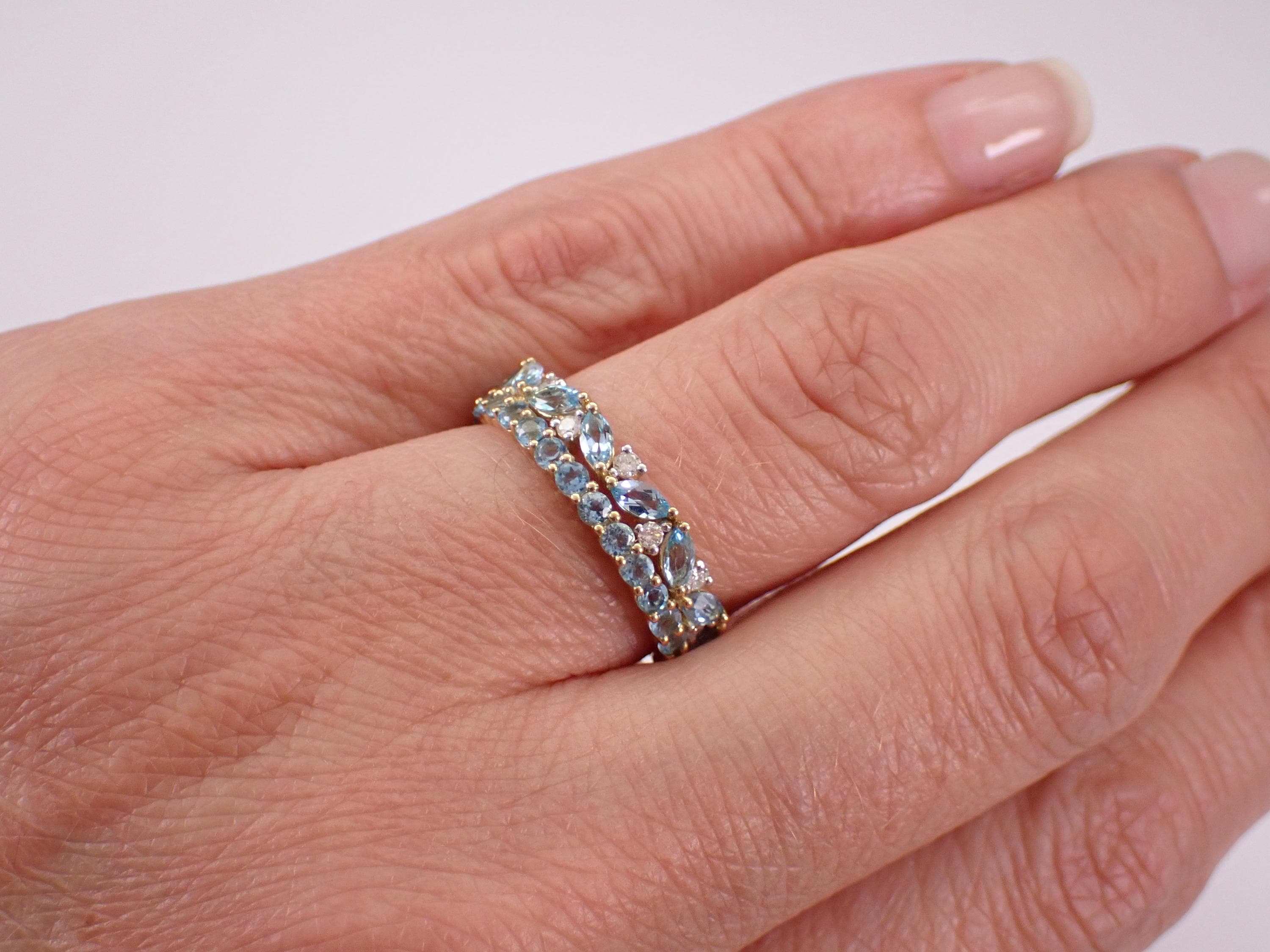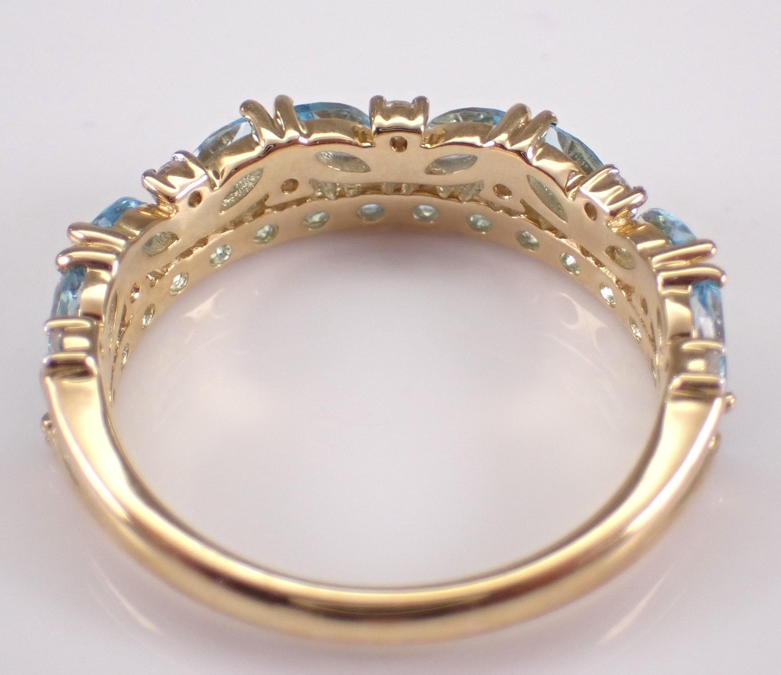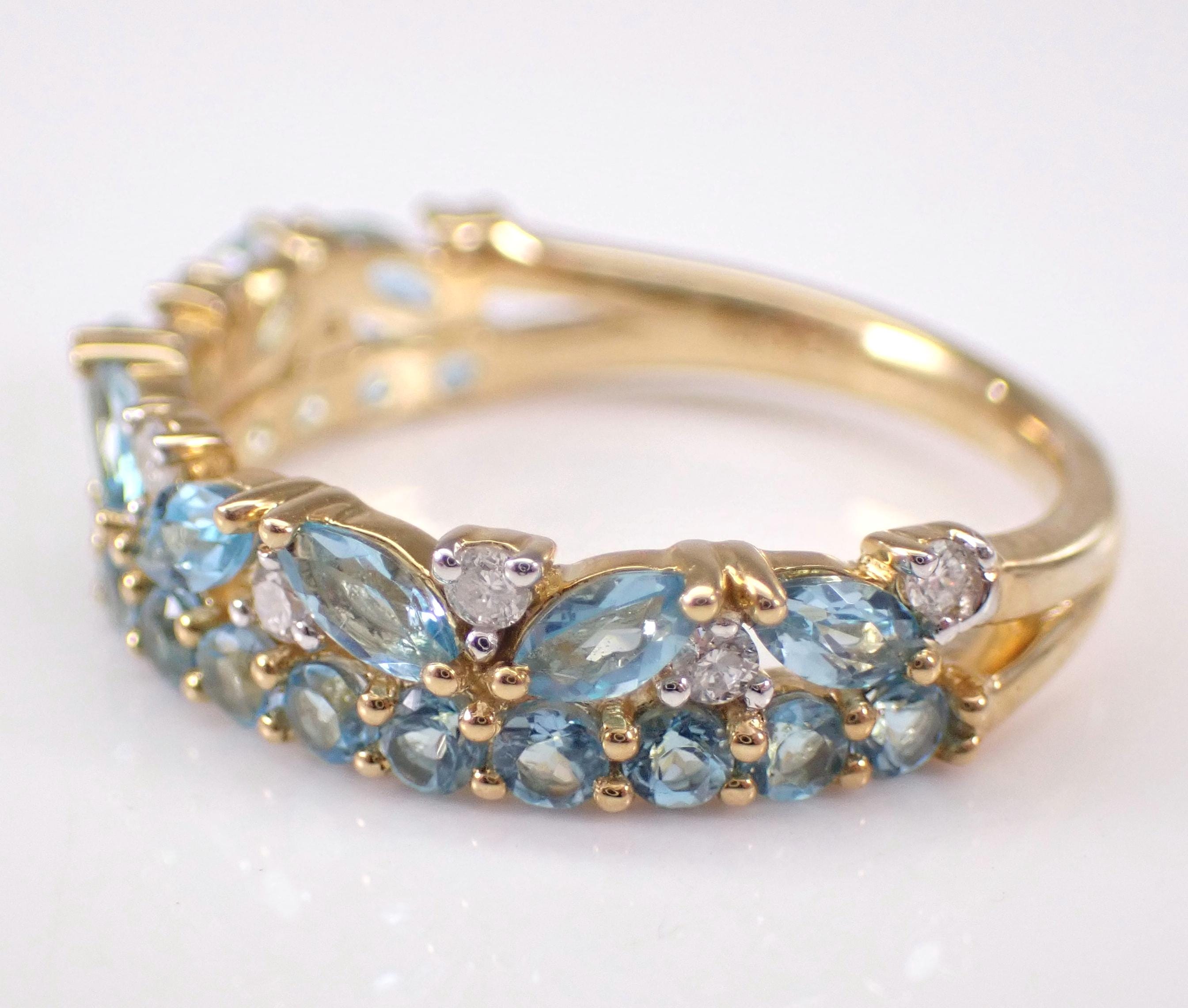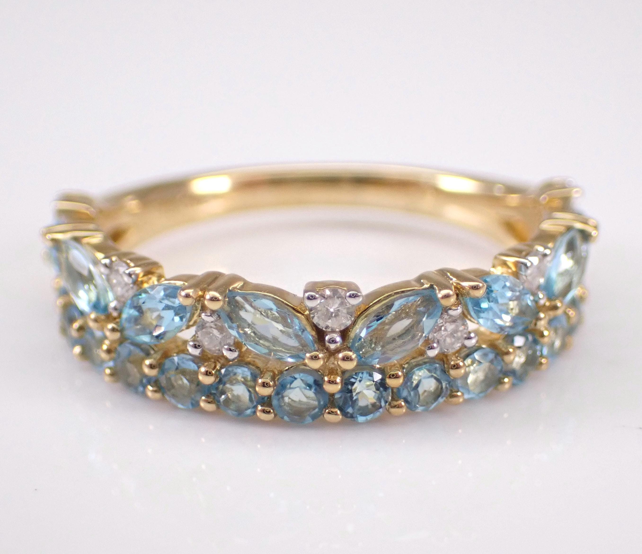 Yellow Gold Diamond and Blue Topaz Wedding Ring Anniversary Band. This ring is set sixteen Round Blue Topaz, eight Marquise Blue Topaz and nine Round Brilliant Diamonds. The Blue Topaz in this ring are a sky blue color, and amount to a total weight of 3/4 carat. The diamonds in this ring are H color, I1 clarity and weigh a total of .15 carat. This ring is 10KT Yellow Gold, weighs 2.8 grams, measures 5 mm in width and is a finger size 7, which can be resized (please inquire about sizing with the finger size you need). This ring will be accompanied by an appraisal by a GIA Certified Diamond Grader with the retail replacement value of $1,345.00. I will ship this ring promptly in a gift box.