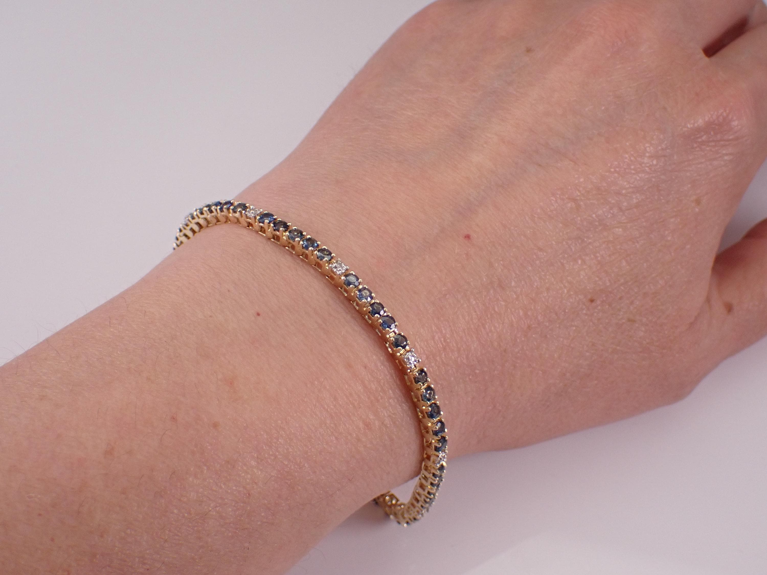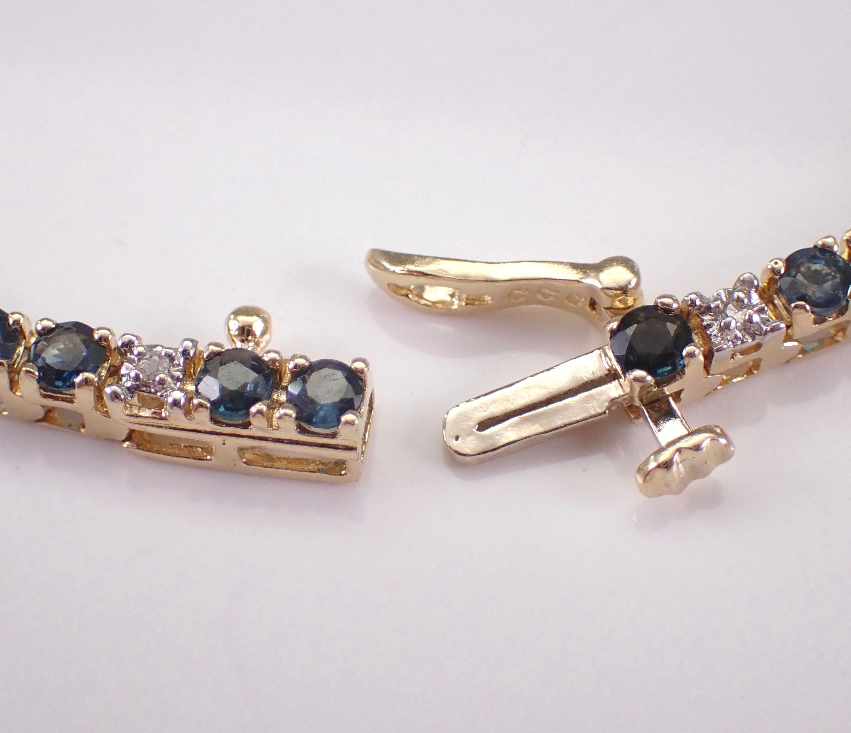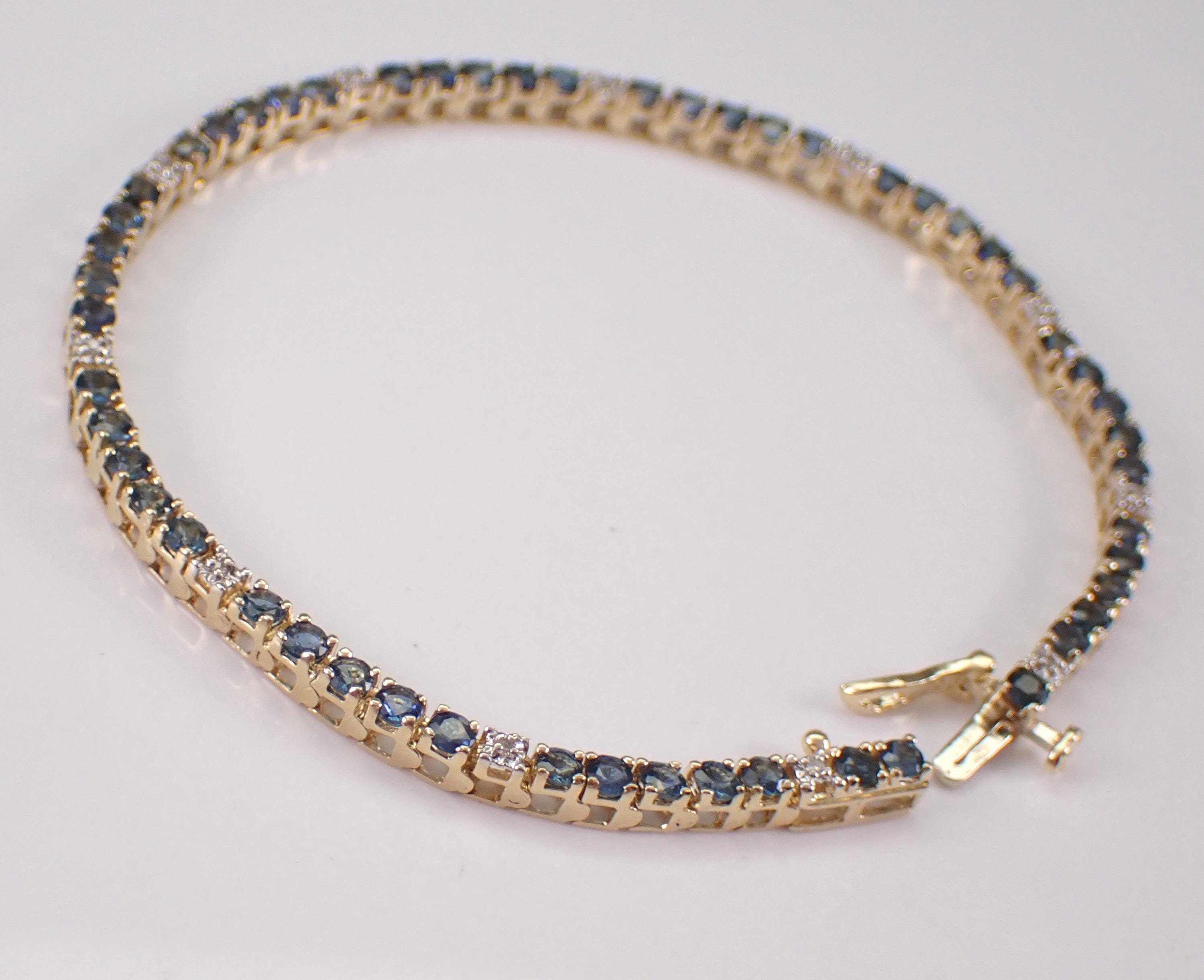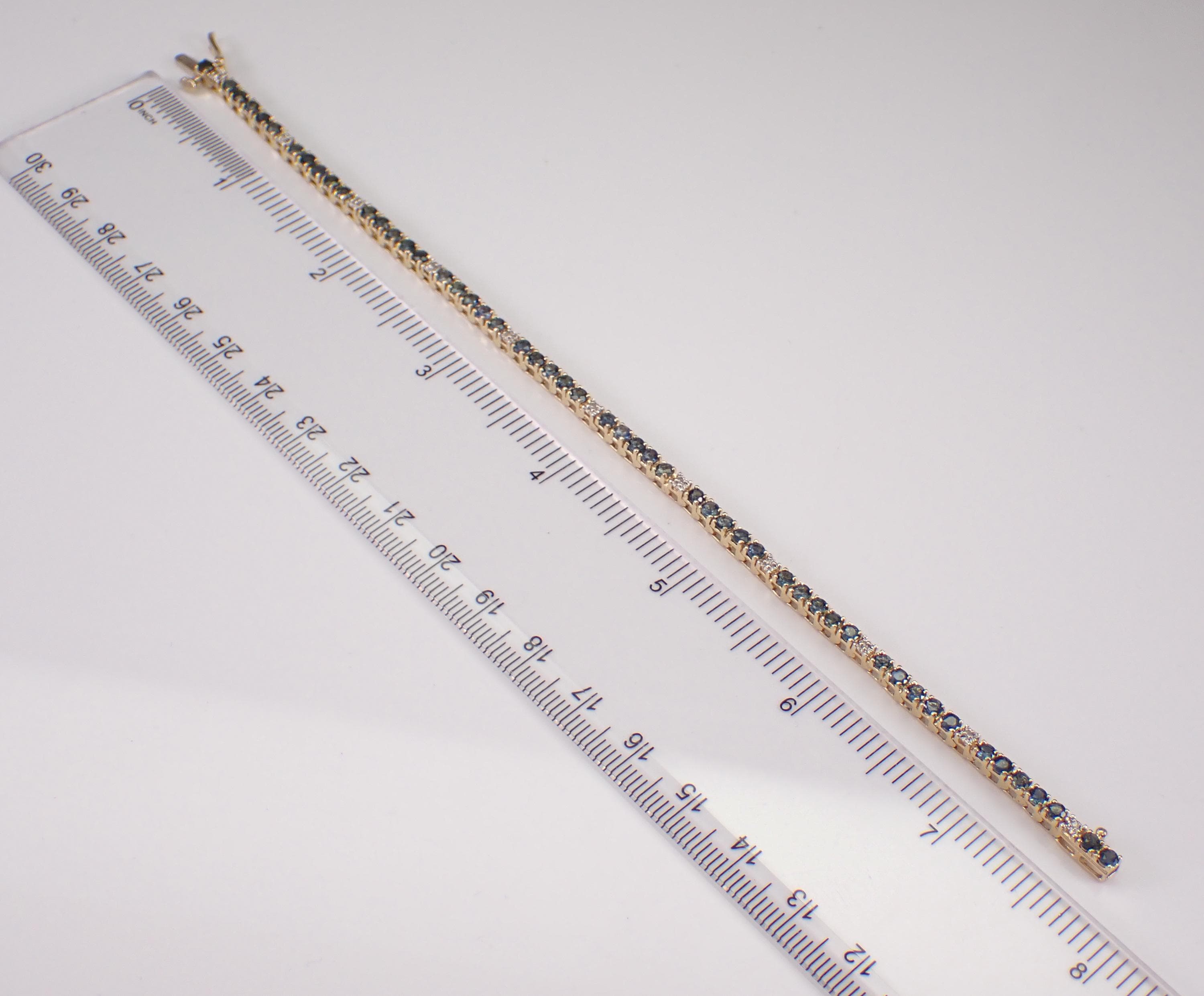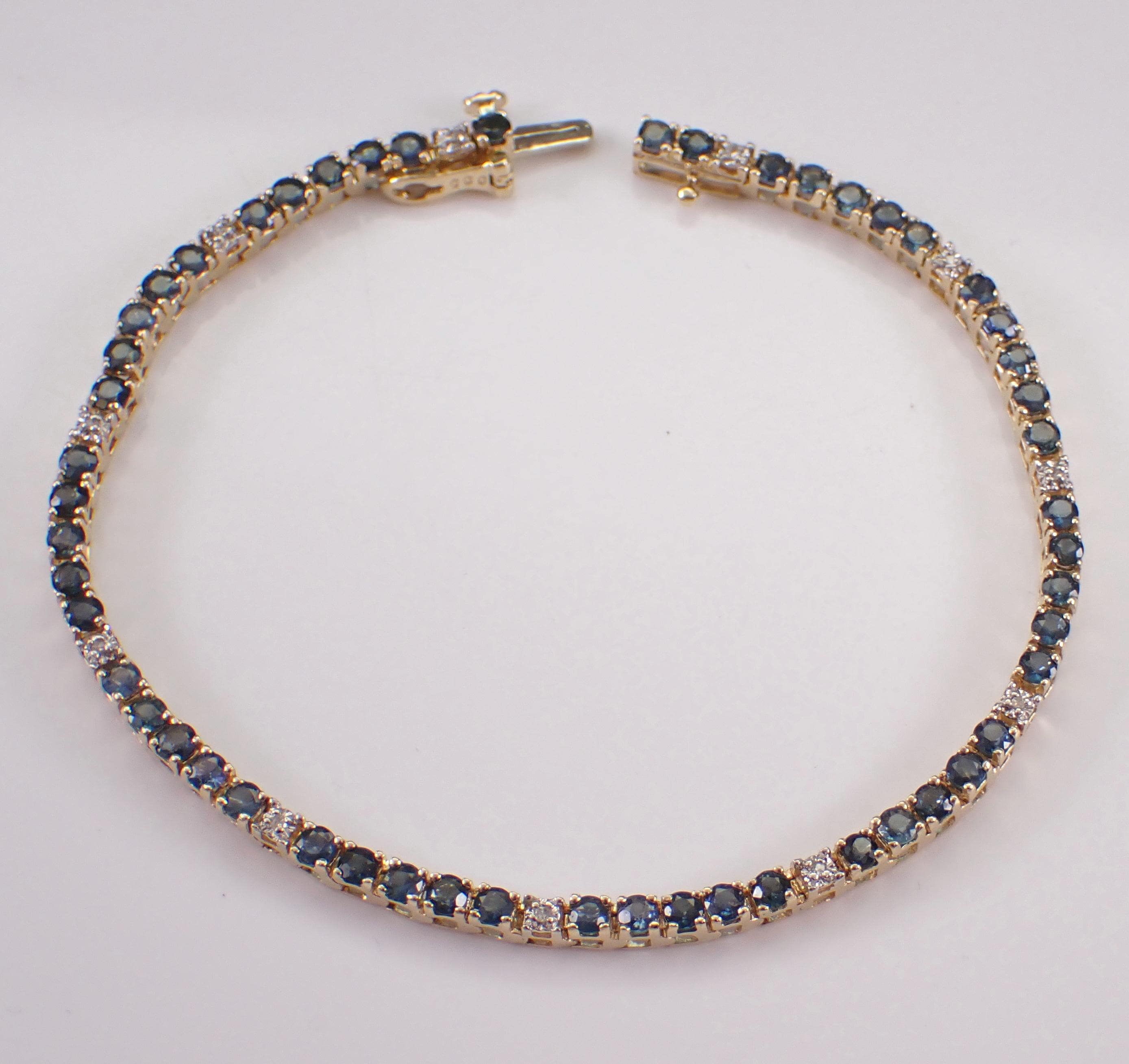 14K Yellow Gold Sapphire and Diamond Tennis Bracelet. This bracelet is set with fifty-three natural Round Sapphires and eleven genuine Round Brilliant Diamonds. These sapphires are a beautiful blue color and amount to a total weight of 3 1/2 carats. The diamonds in this bracelet are H color, I1 clarity and weigh a total of .05 carats. The bracelet is 14K Yellow Gold, weighs 9.4 grams and measures 2.6mm in width and 7 1/2" in length. This bracelet will be accompanied by an appraisal by a GIA Certified Diamond Grader with the retail replacement value of $3,375.00. I will ship this bracelet promptly in a gift box.