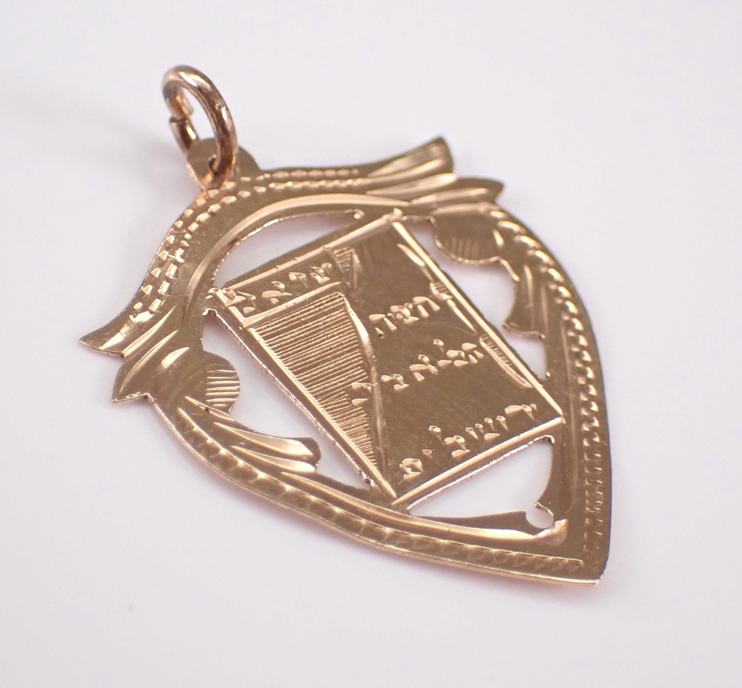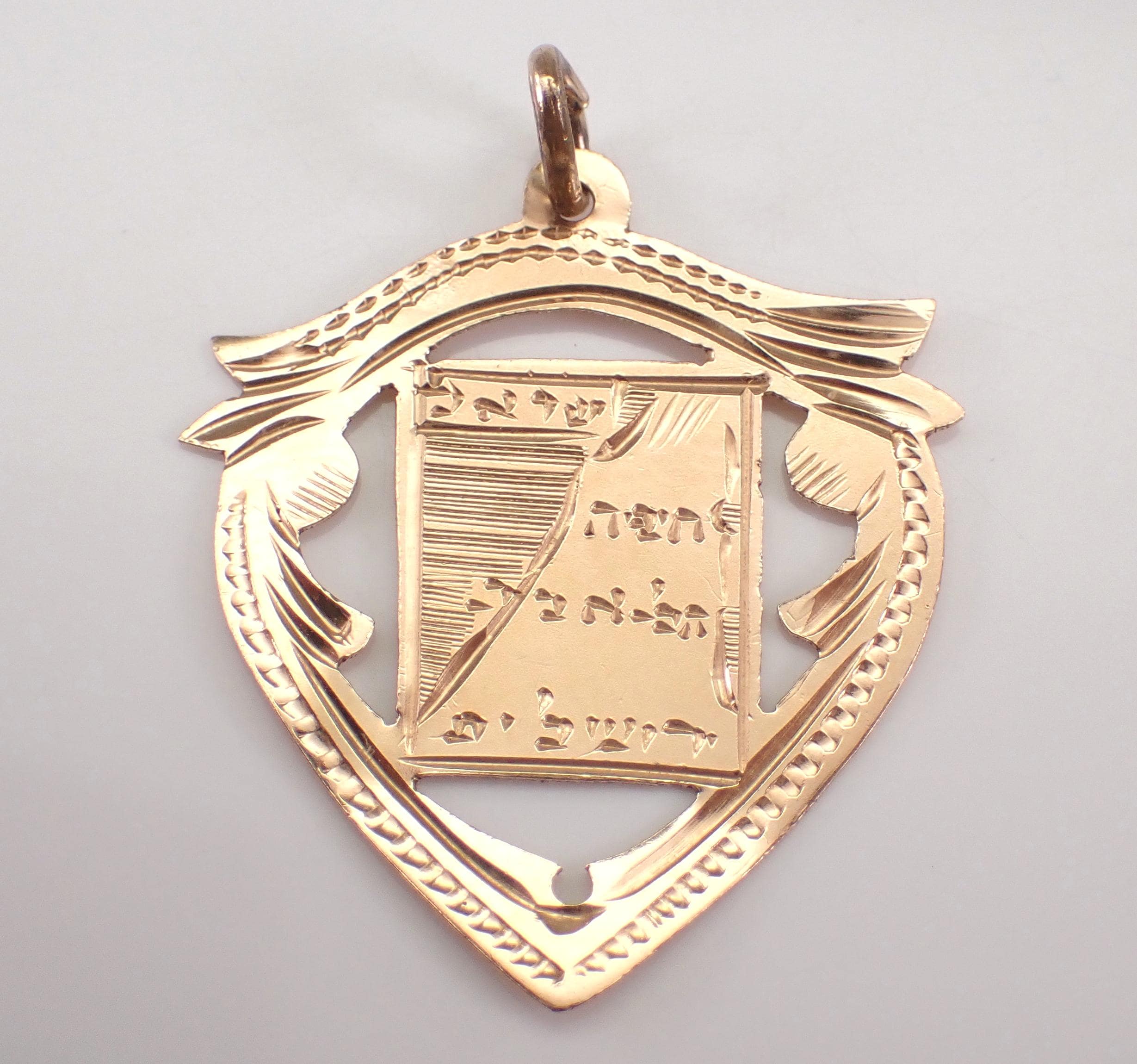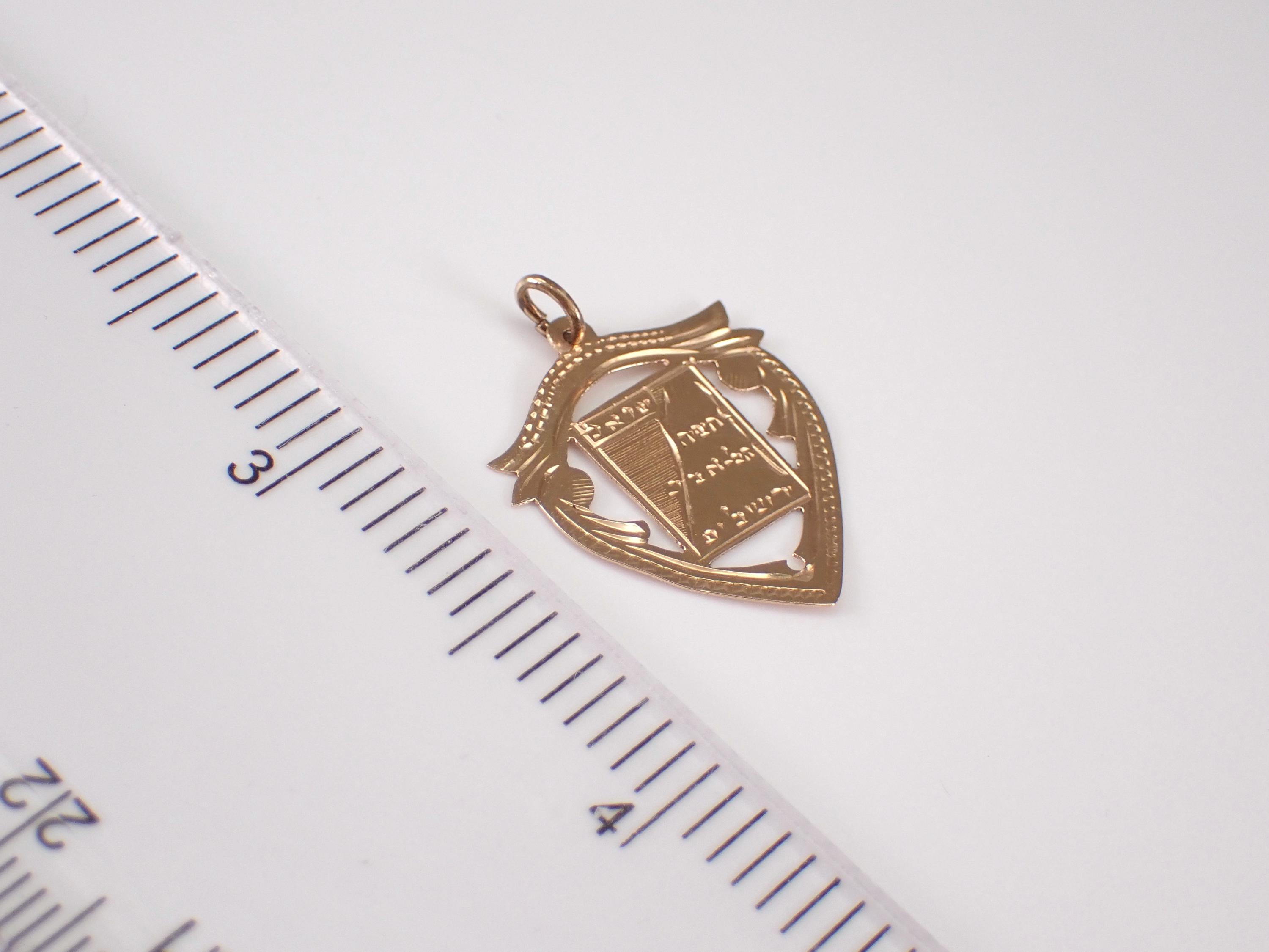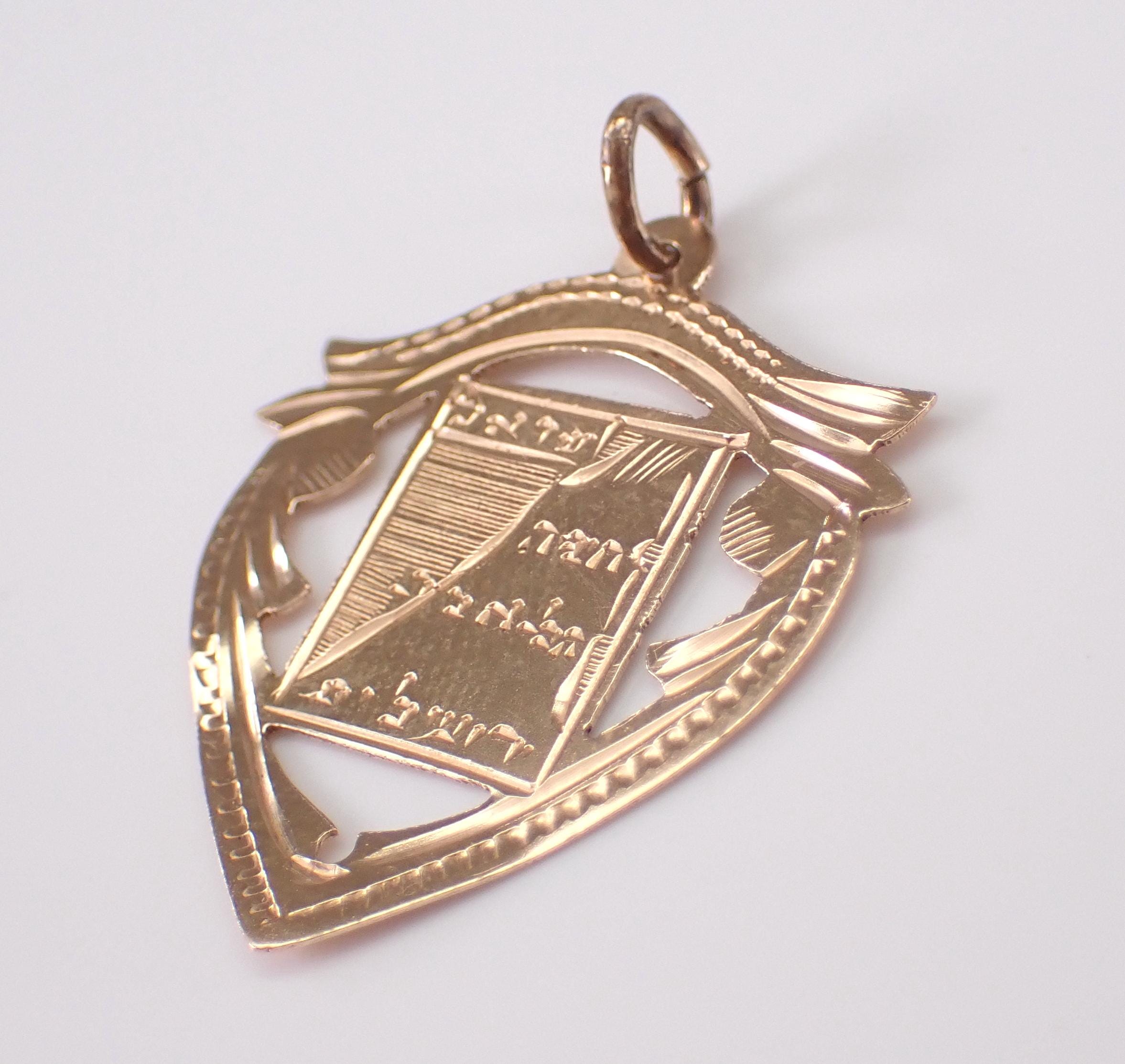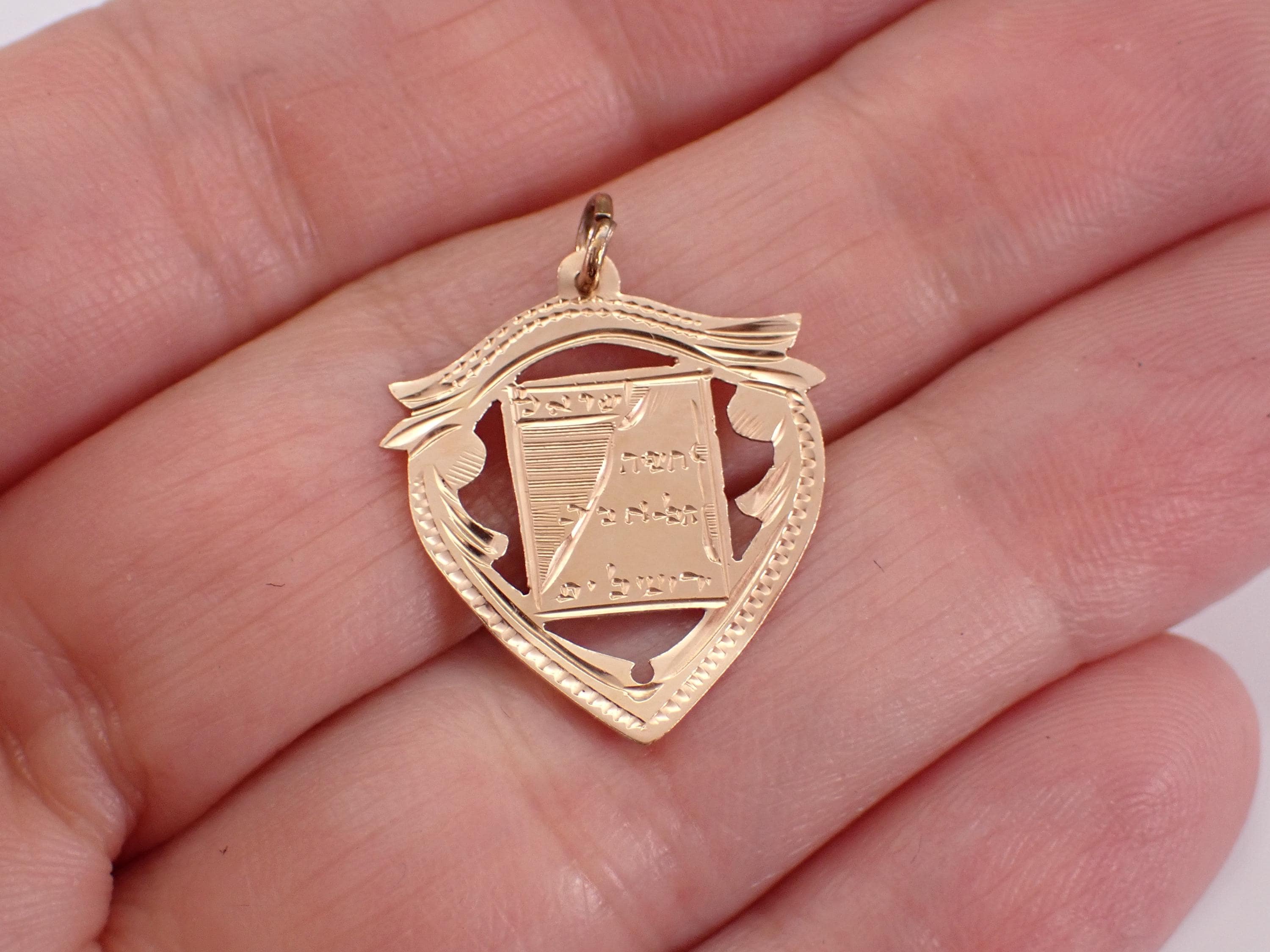 Antique 14K Rose Gold Jewish Ten Commandments Charm Pendant. This charm is 14K Gold and weighs .7 grams. There is engraving in Hebrew on this charm. From what I am able to see, the engraving says LOVE, This Too shall Pass, and Hear O Israel.