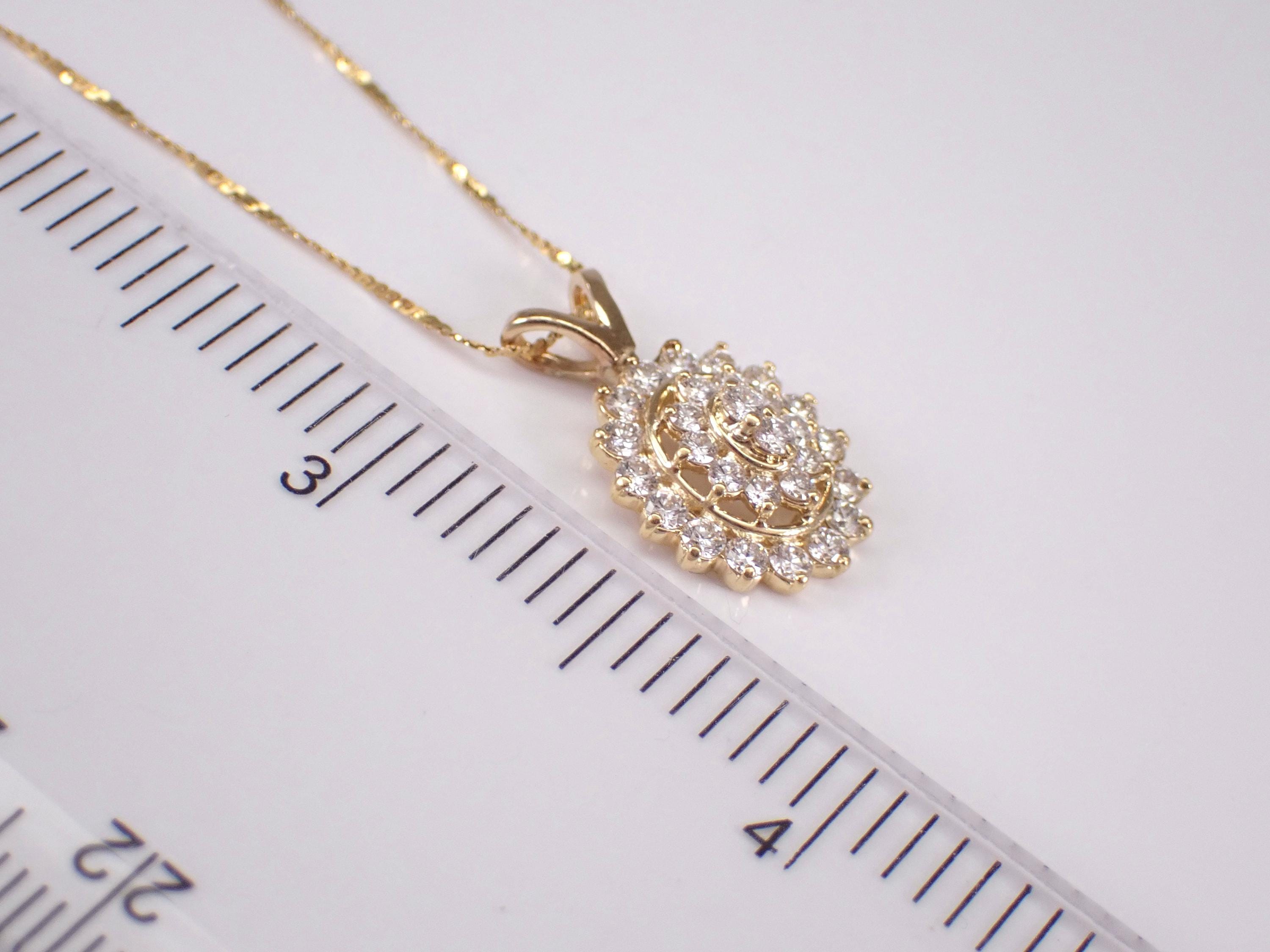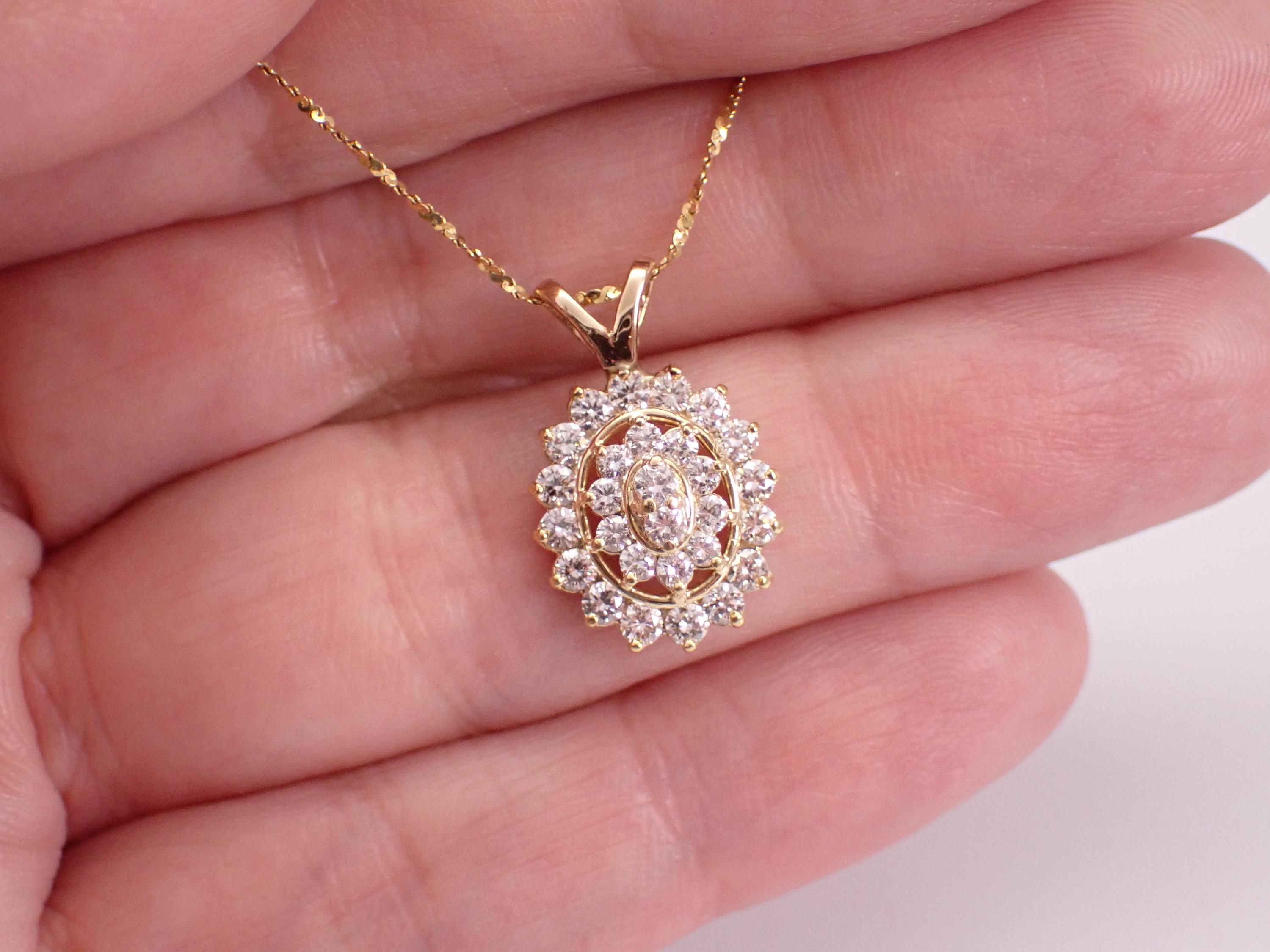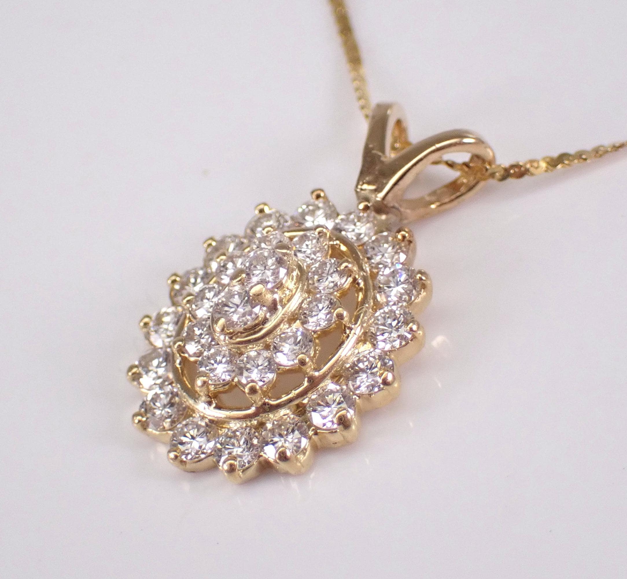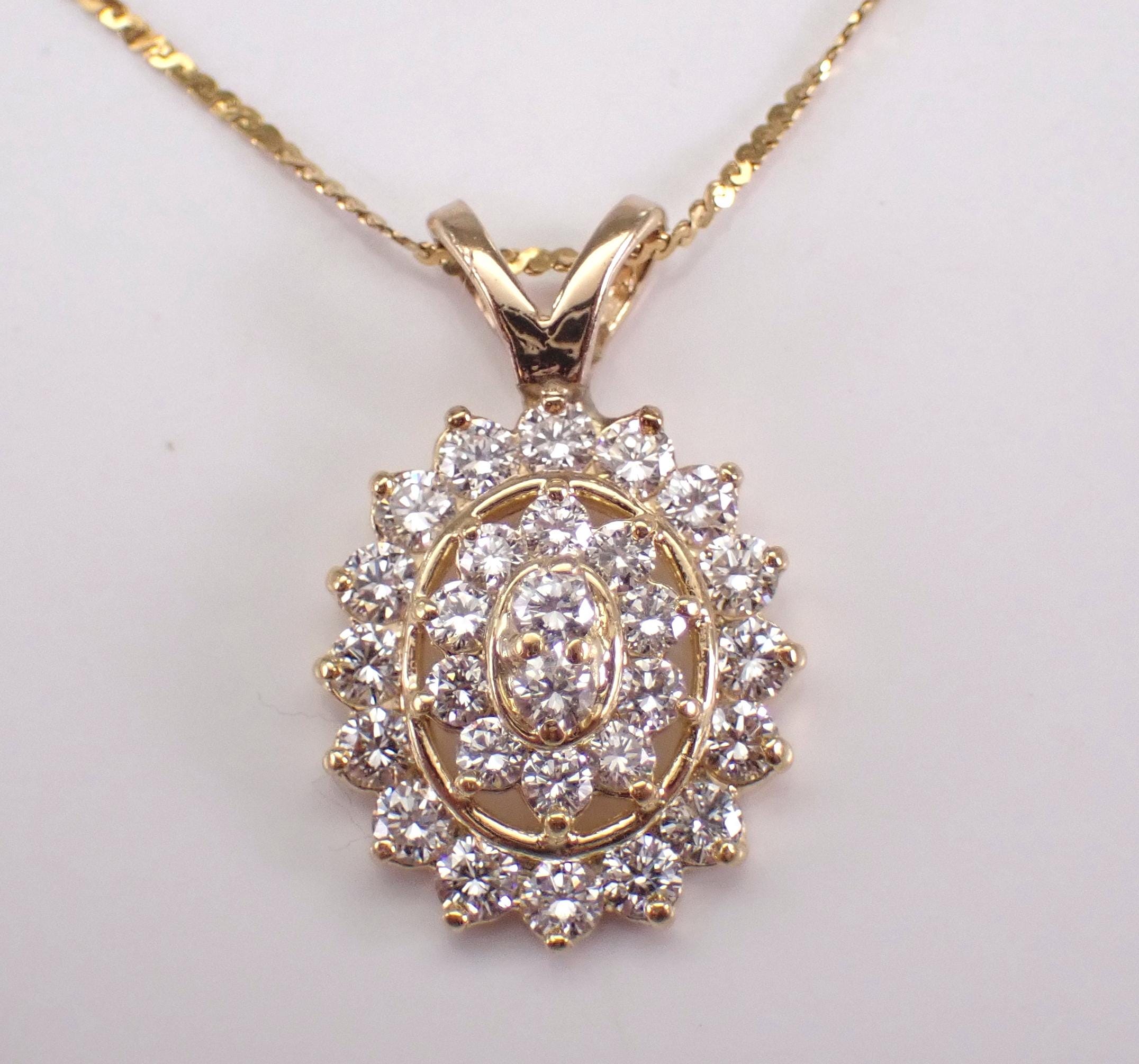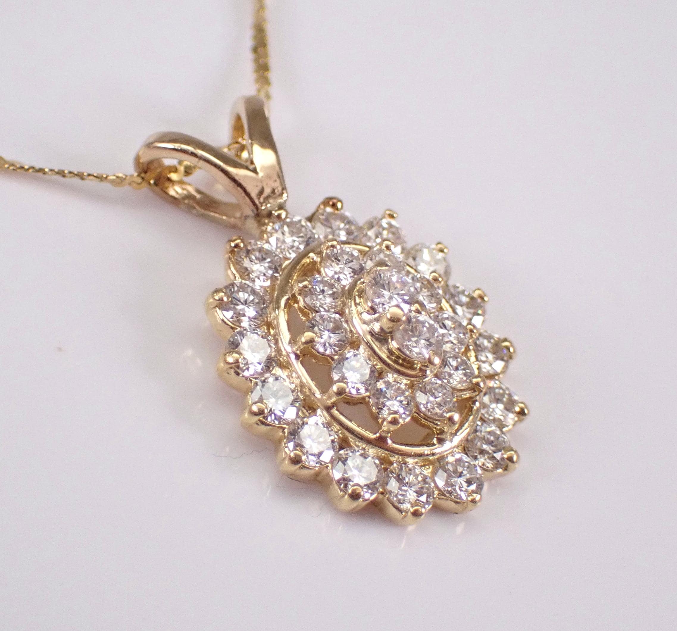 Antique 14K Yellow Gold Diamond Pendant with Chain. This pendant is set with twenty-seven natural Round Brilliant Diamonds. These diamonds are F/G color, SI1/VS clarity and weigh a total of .65 carat. This pendant is 14KT Yellow Gold and comes with a 16" 14KT Yellow Gold chain. Both the pendant and chain weigh a total of 2.5 grams and the pendant measures 14 X 12 mm without the bail. I will ship this necklace promptly in a beautiful gift box accompanied by an appraisal for insurance and authentication purposes.