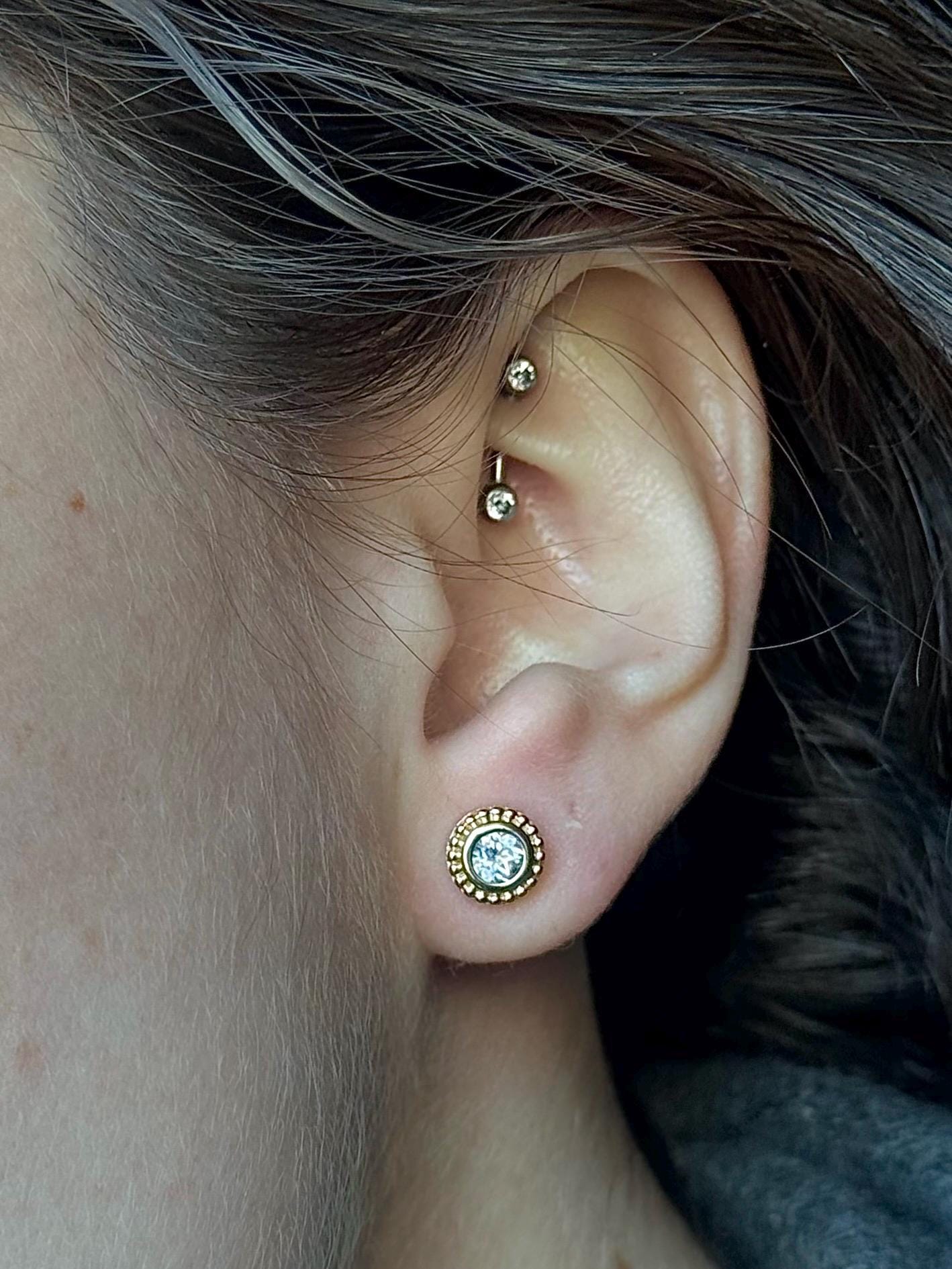 Yellow Gold Aquamarine Stud Earrings. There are two genuine Round Aquamarine set in these earrings. These Aquamarine are a pale aqua color, measure 4 mm in diameter each and weigh a total of 1/2 carat. These earrings are 10KT Yellow Gold, measure 7 mm in diameter each and weigh a total of 1.8 grams. These earrings are for pierced ears and have a friction back posts. I will ship these earrings promptly in a gift box.