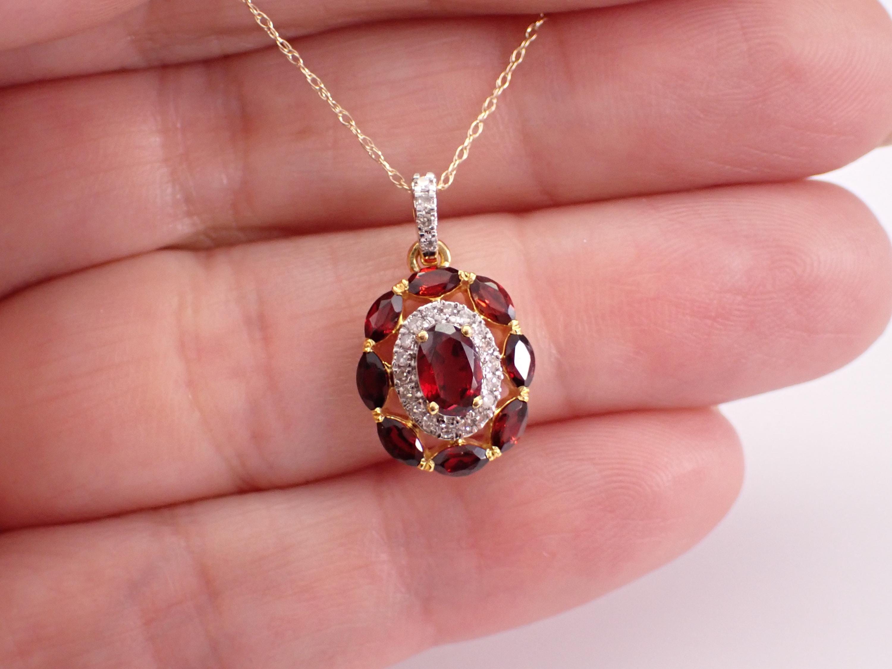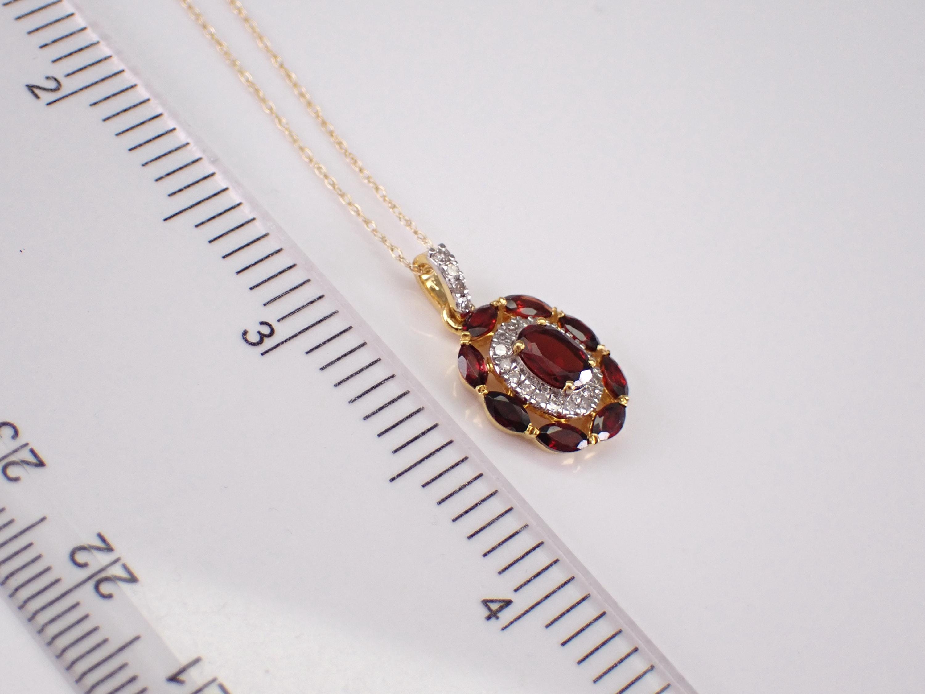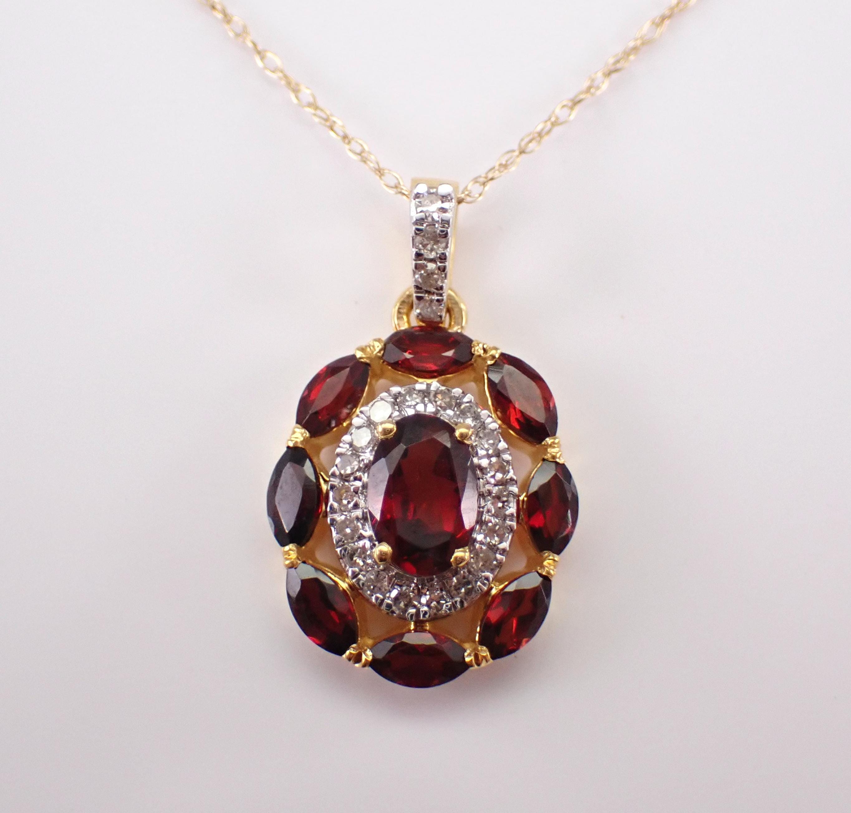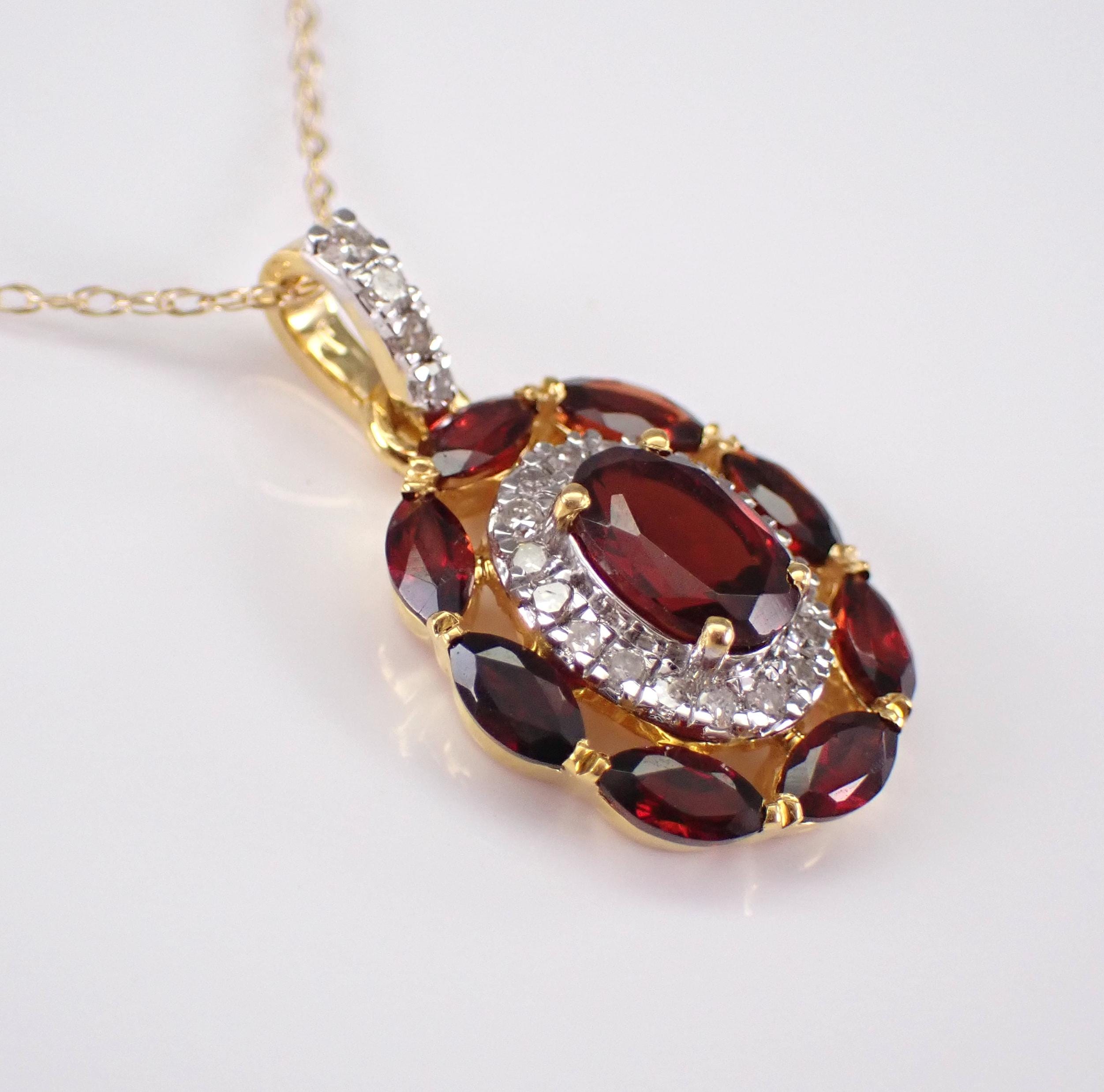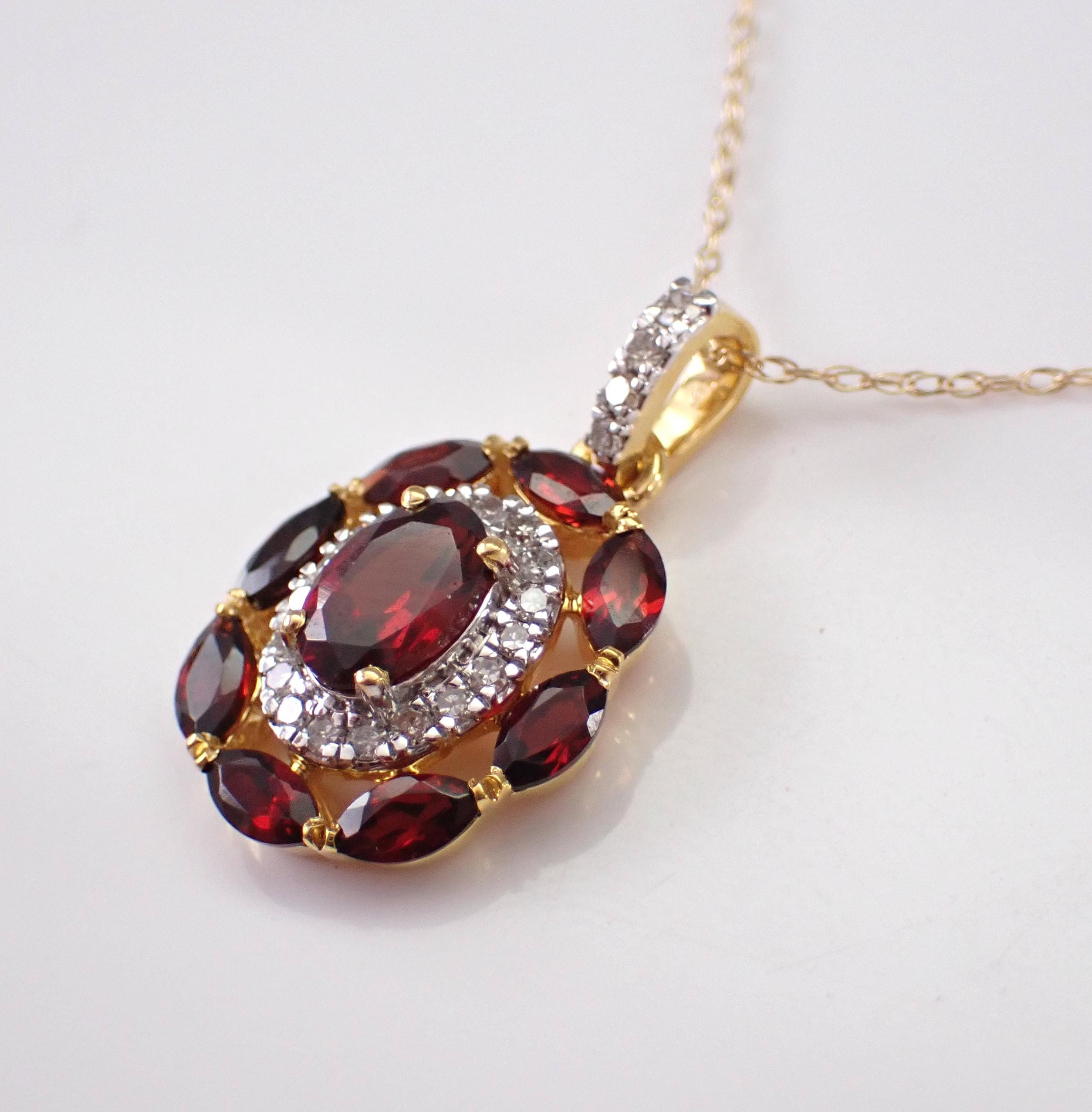 Yellow Gold Diamond and Garnet Pendant Necklace with Chain. This necklace is set with nine genuine Oval Garnets and eighteen natural Round Diamonds. The center Garnet measures 6 X 4 mm, the side Garnets measure 4 X 2 mm each and all the gemstones weigh a total of 1 1/4 carat. The diamonds are H color, I1 clarity and weigh a total of .10 carat. The pendant is 10K Yellow gold and comes with an 18" 10K Yellow Gold chain and together weigh 1.7 grams. The pendant measures 20 X 11.5 mm with bail. This necklace will be accompanied by an appraisal written by a GIA Certified Diamond Grader with the retail replacement value of $1,495.00. I will ship this necklace promptly in a beautiful gift box.