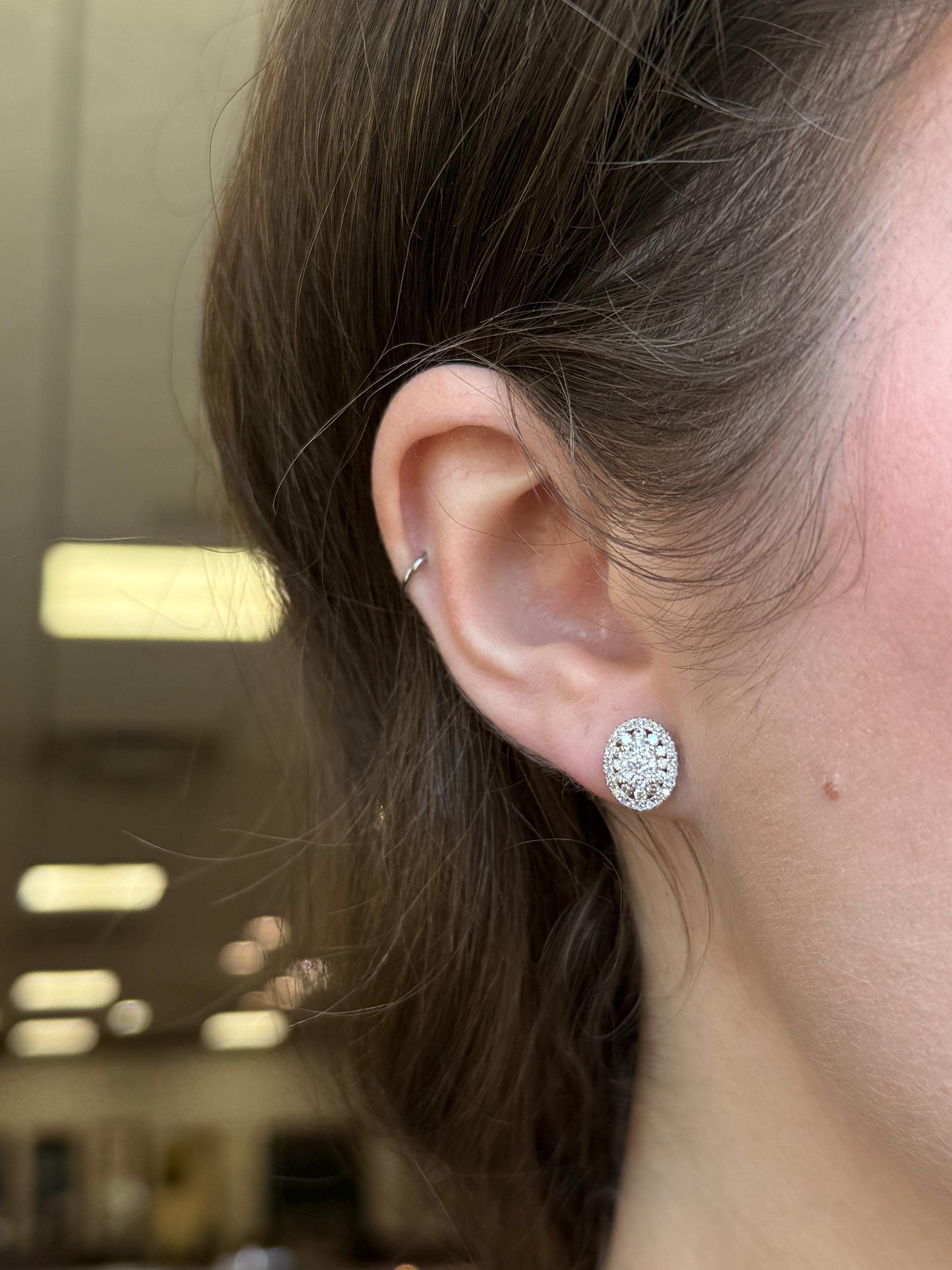 White Gold Diamond Stud Earrings. These earrings are set with forty-three Round Brilliant Diamonds in EACH Earring. These Diamonds are H color, SI/I1 clarity and amount to a total weight of 3/4 carat. These earrings are 10K White Gold, weigh 2.2 grams and measure 10.5 X 8.5 mm each. These earrings are for pierced ears and the earrings have friction back posts. These earrings will be accompanied by an appraisal written by a GIA Certified Diamond Grader with the retail replacement value of $1,985.00. I will ship these earrings promptly in a gift box.