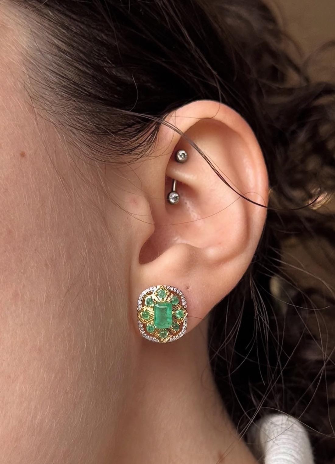 14K Yellow Gold Diamond and Emerald Stud Earrings. These earrings are set with a genuine Emerald Cut Emerald, eight Round Emeralds and thirty-six Round Brilliant Diamonds in EACH earring. The center Emeralds measure 6 X 4 mm each and all the Emeralds weigh a total of 1 1/2 carats. The Diamonds are H color, I1 clarity and amount to a total weight of .20 carat. These earrings are 14K Yellow Gold, weigh 3.2 grams and measure 13 X 11 mm each. These earrings are for pierced ears and have friction post backings. These earrings will be accompanied by an appraisal written by a GIA Certified Diamond Grader with the retail replacement value of $2,275.00. I will ship these earrings promptly in a gift box.