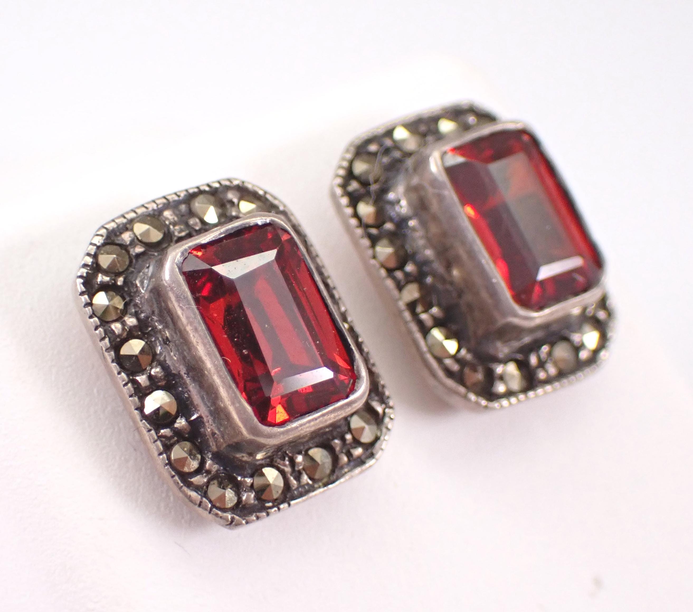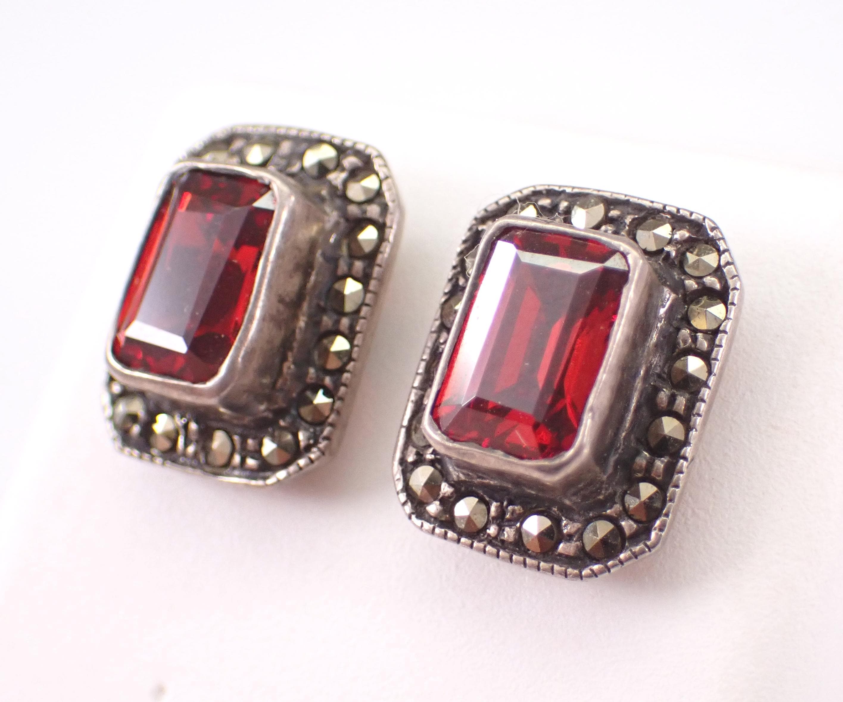 Beautiful and unique earrings are crafted of 925 Sterling Silver. These earrings are set with one genuine Emerald Cut Garnet in EACH earring. These Garnets measure 8 X 6 mm each and weigh a total of 1 1/2 carat. There are Marcasite set around each gemstone. Each earring measures 13.5 X 11 mm and have friction post backings for pierced ears. These earrings weigh a total of 4.4 grams. These earrings will be shipped promptly in a gift pouch.