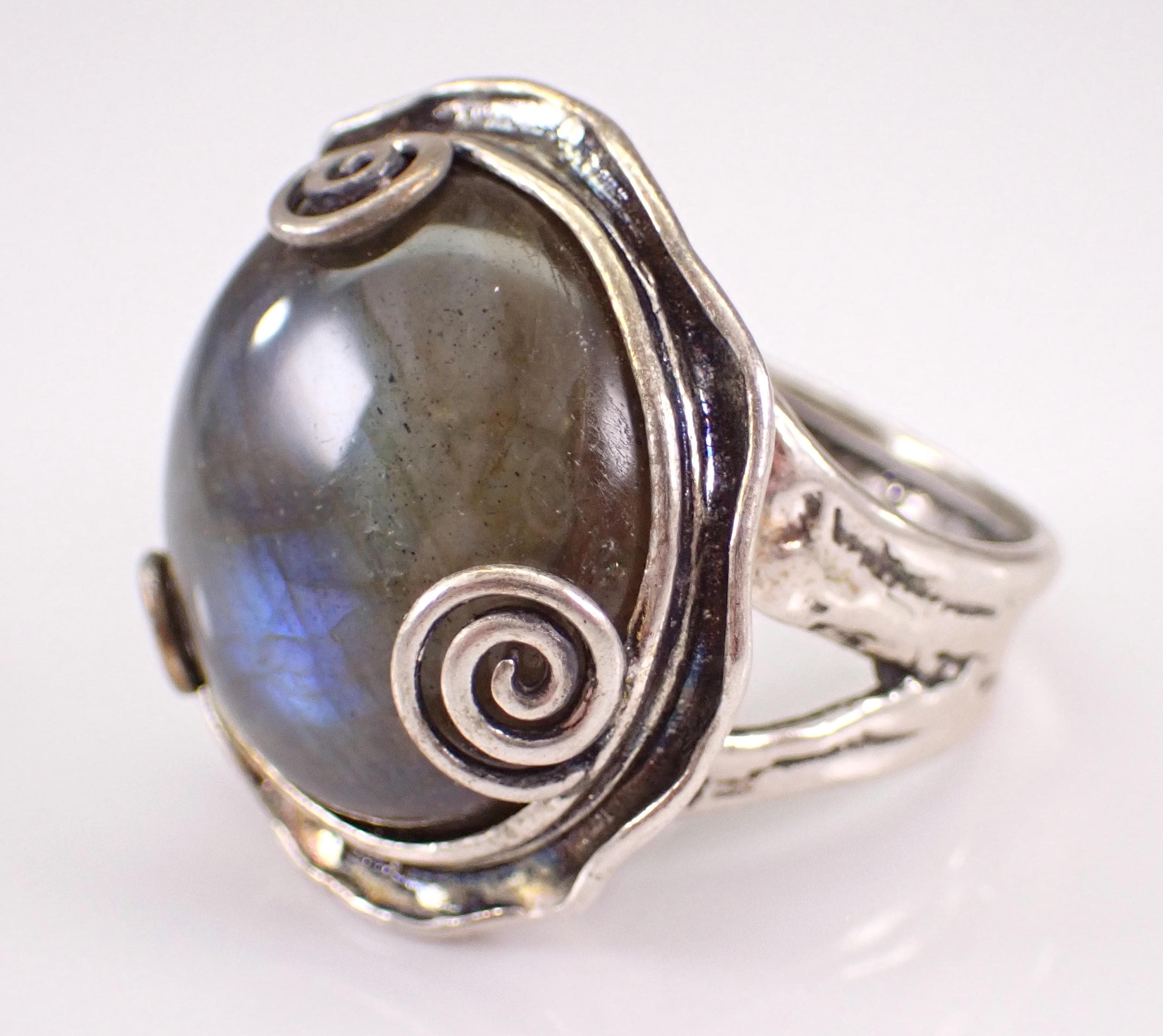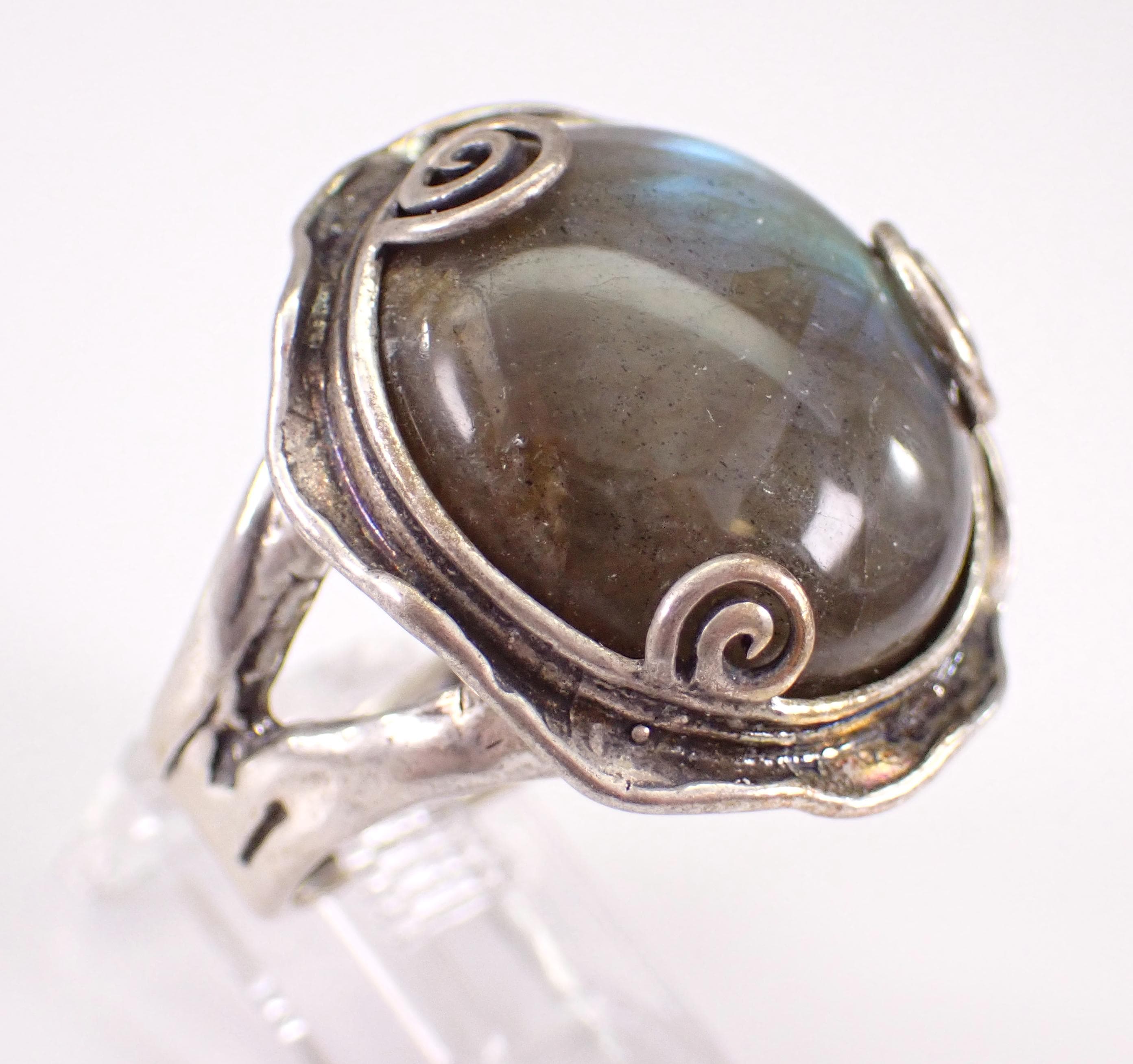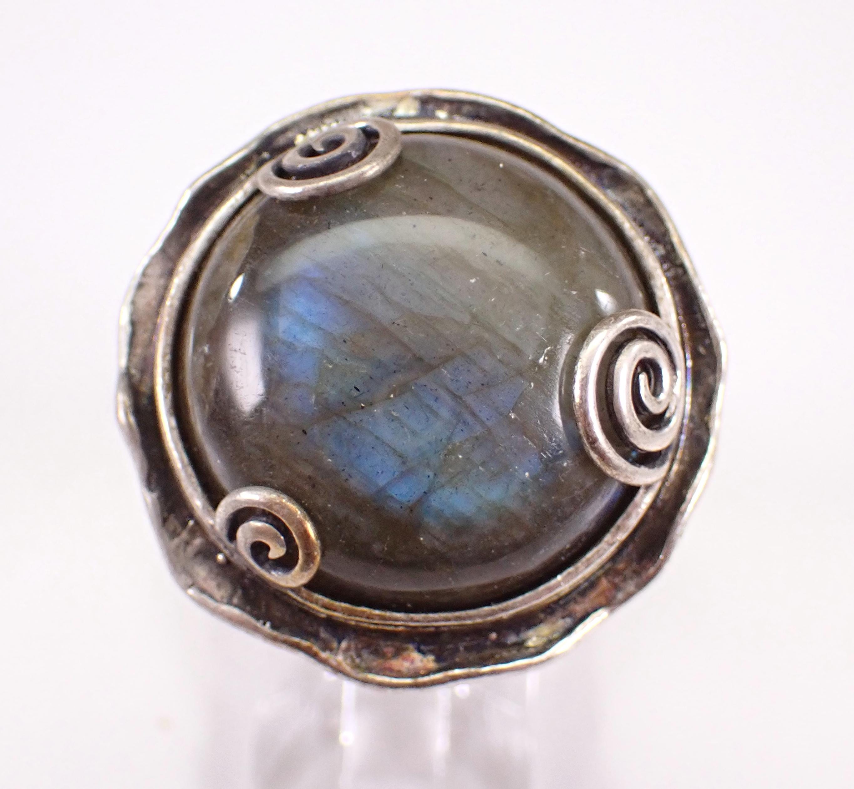 Vintage Sterling Silver Labradorite ring. The ring is made of Sterling Silver and marked Made in Israel. There is a 20mm Round Cabochon Labradorite set in this ring. This ring is in very good condition, is finger size 9 1/4 and weighs 14.7 grams. This ring will be shipped promptly in a gift pouch.