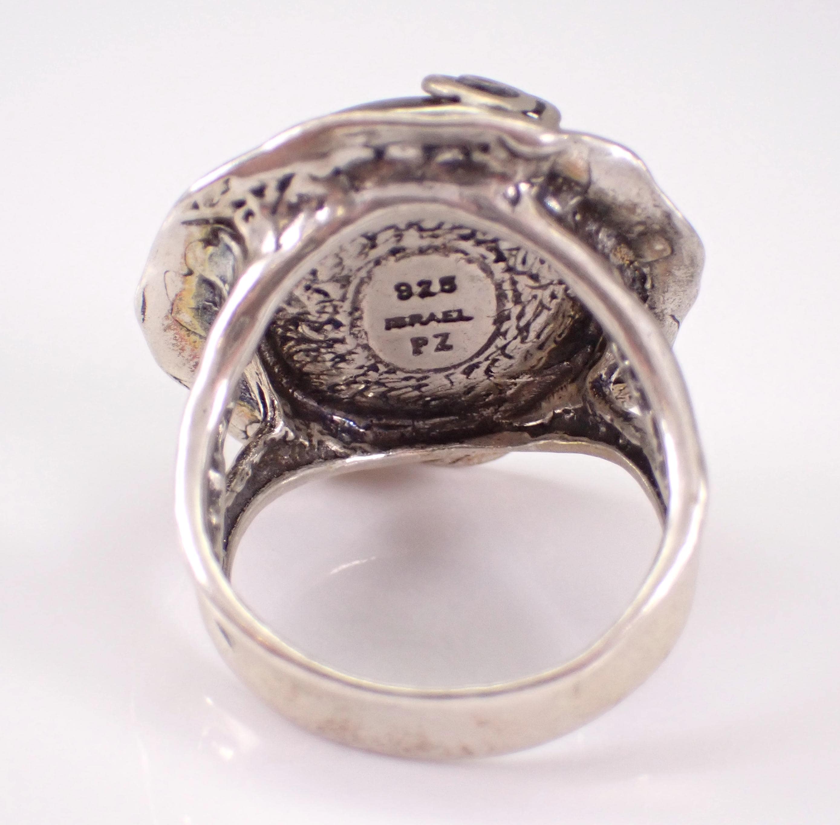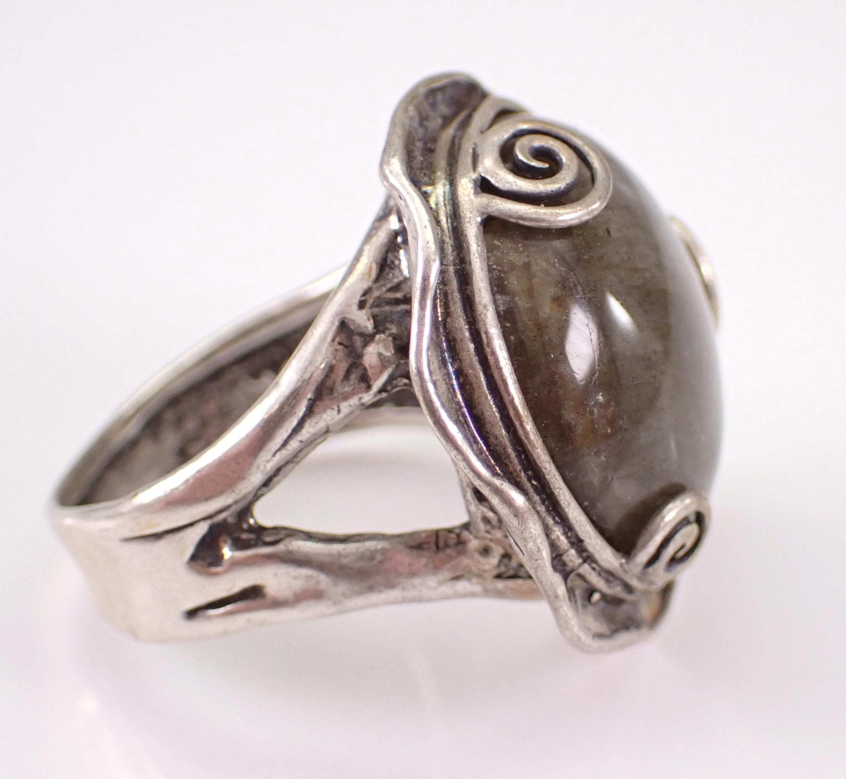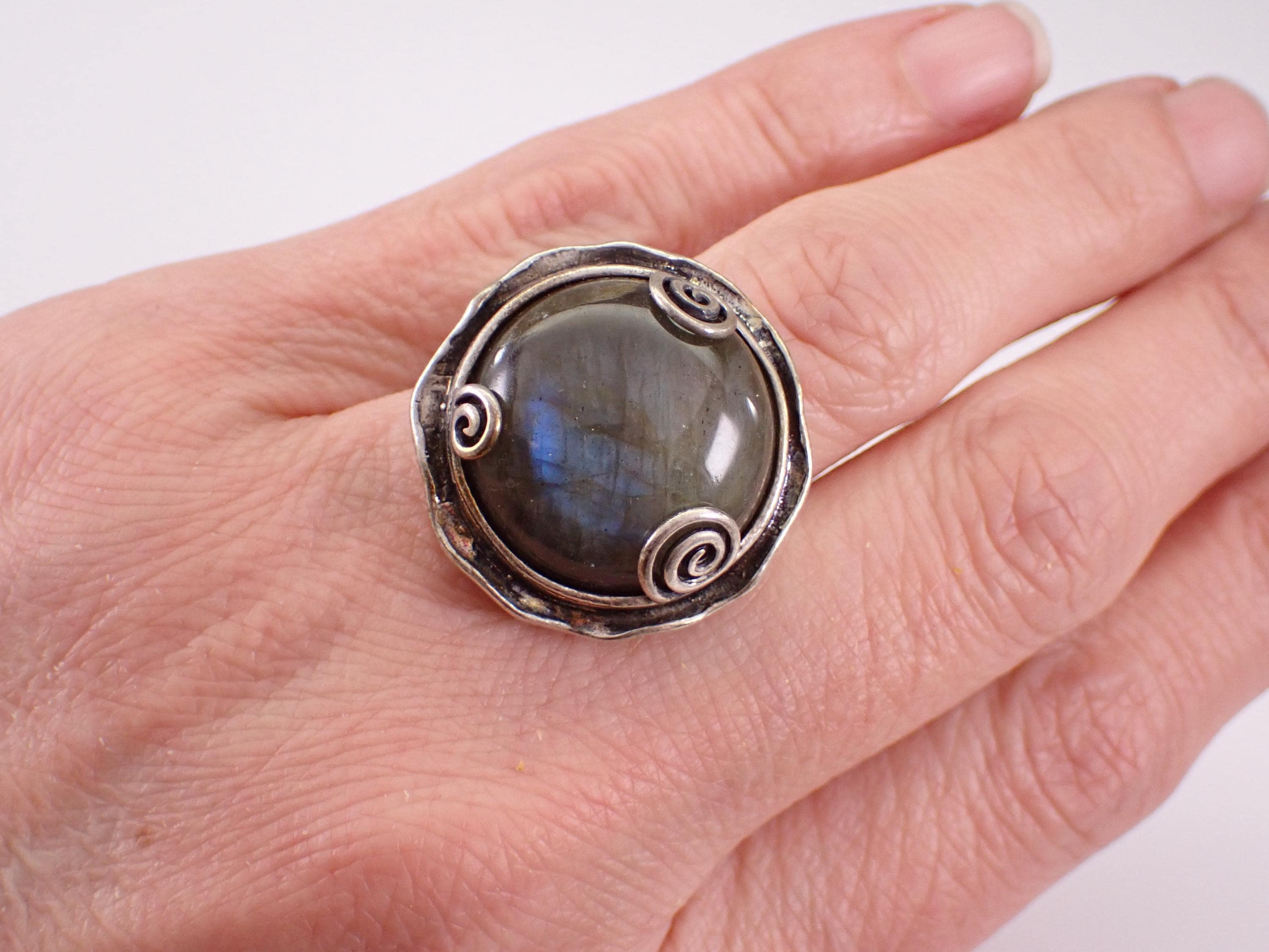 Vintage Sterling Silver Labradorite ring. The ring is made of Sterling Silver and marked Made in Israel. There is a 20mm Round Cabochon Labradorite set in this ring. This ring is in very good condition, is finger size 9 1/4 and weighs 14.7 grams. This ring will be shipped promptly in a gift pouch.