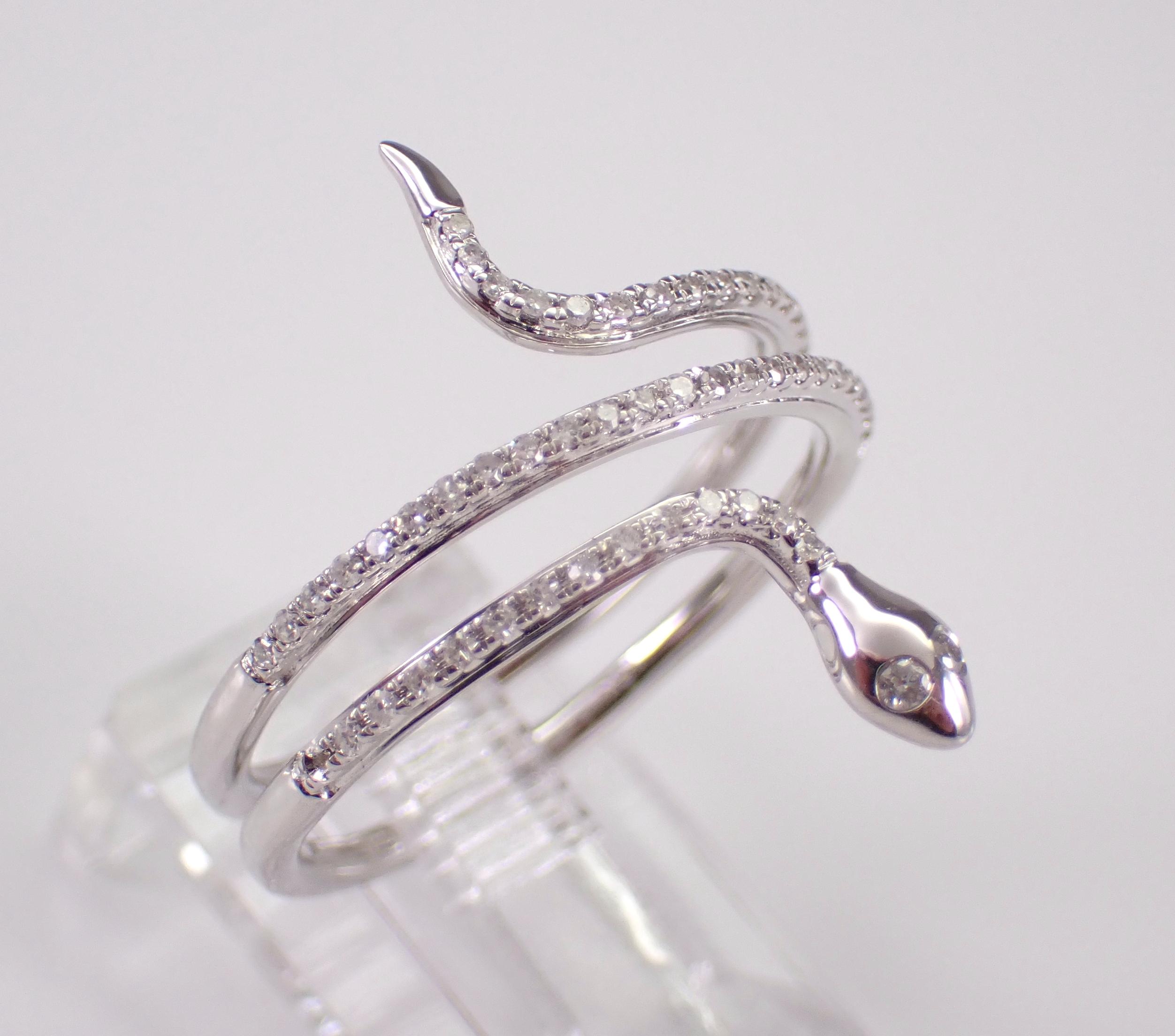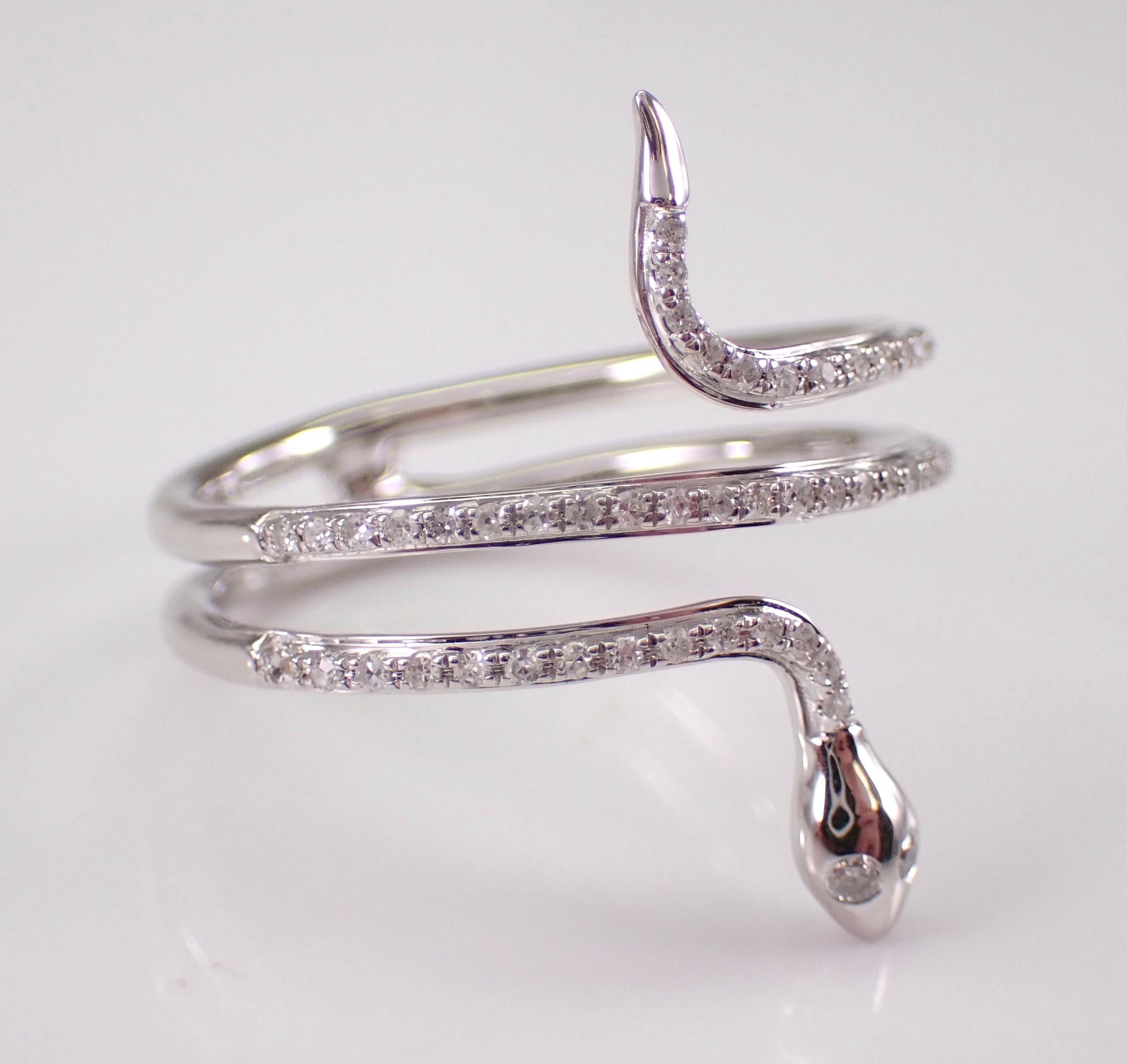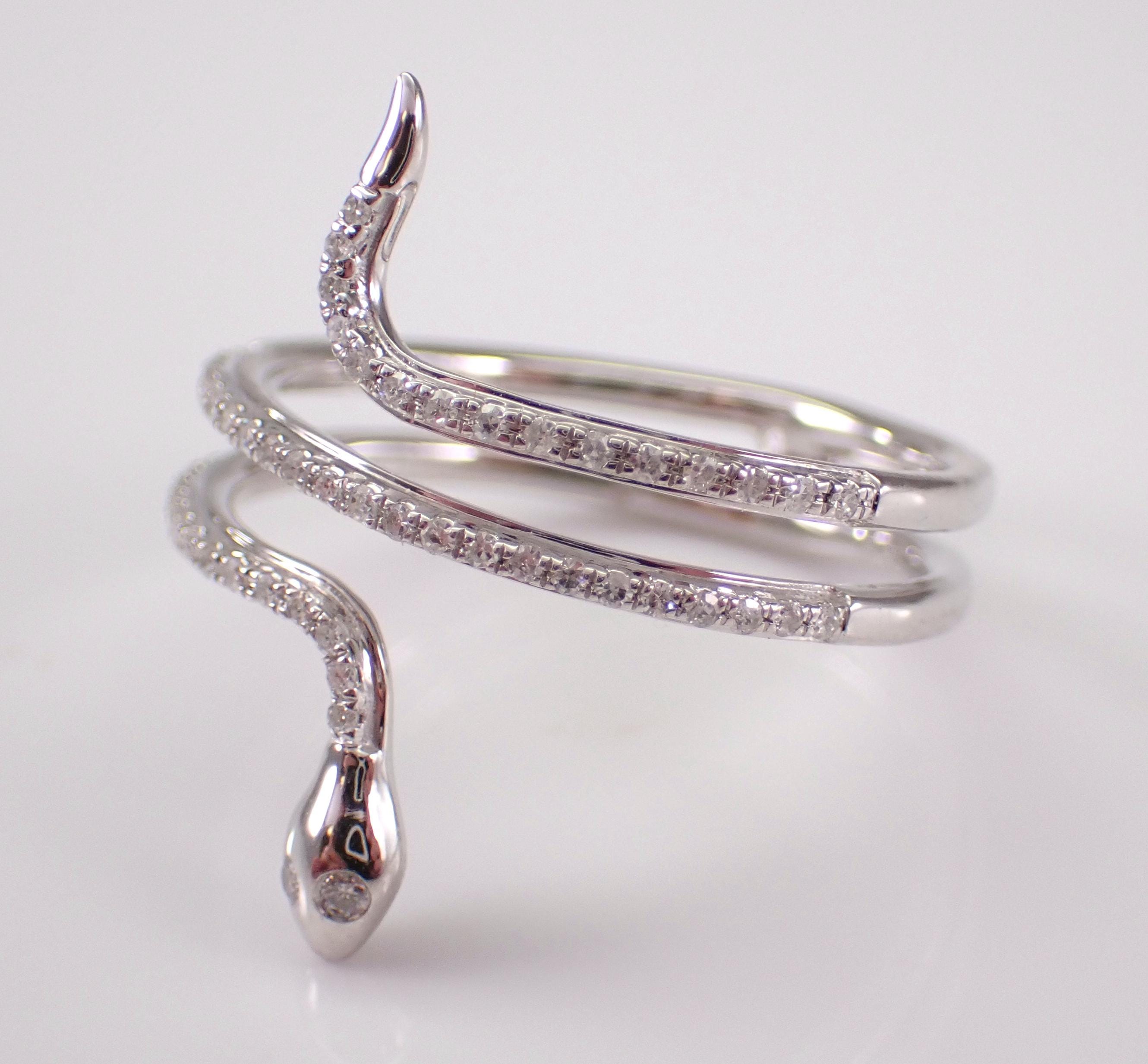 White Gold Diamond Snake Ring. This ring is set with fifty-six genuine Round Brilliant Diamonds. These Diamonds are H color, SI clarity and weigh a total of .30 carats. This ring is 10KT White Gold, weighs 2.9 grams and is a finger size 7 1/4, which can be slightly resized (please inquire about sizing with the finger size you need). The ring will be accompanied by an appraisal by a GIA Certified Diamond Grader with the retail replacement value of $1,495.00. I will ship this ring promptly in a gift box.