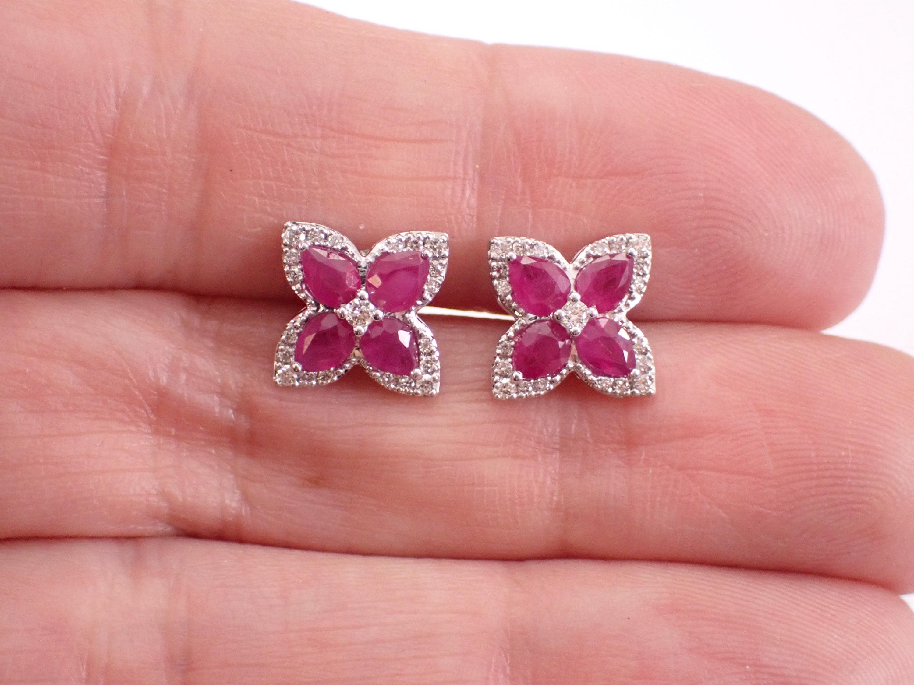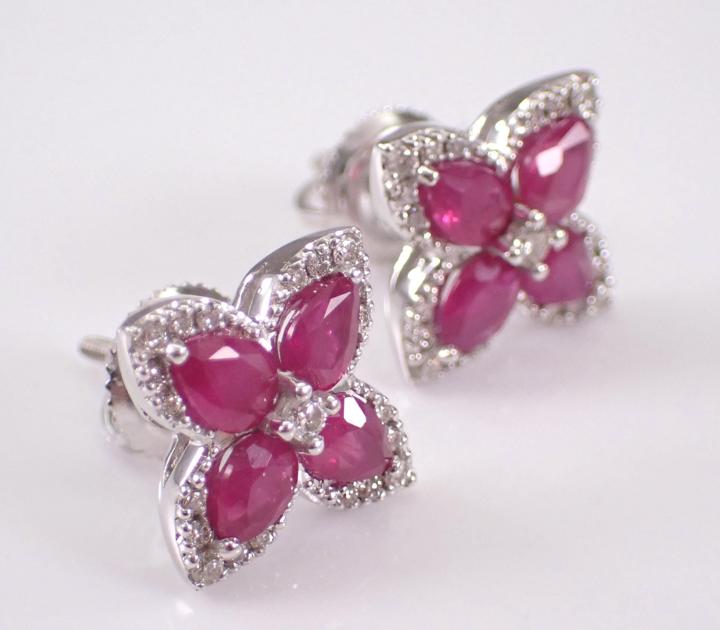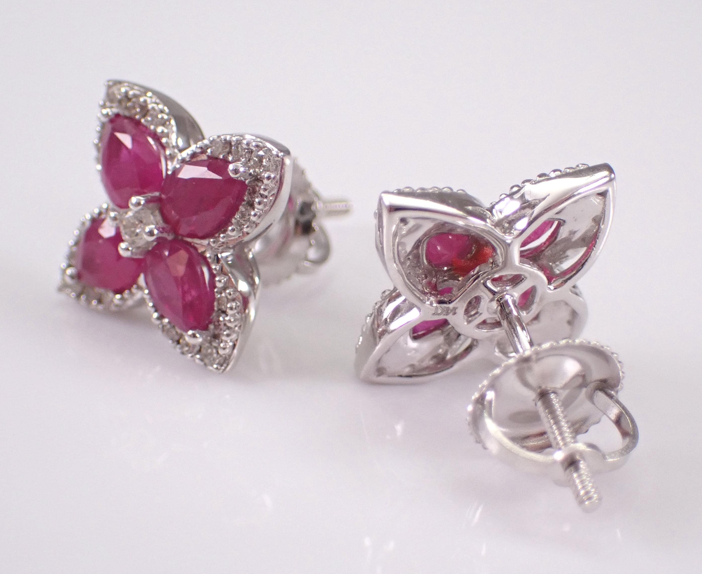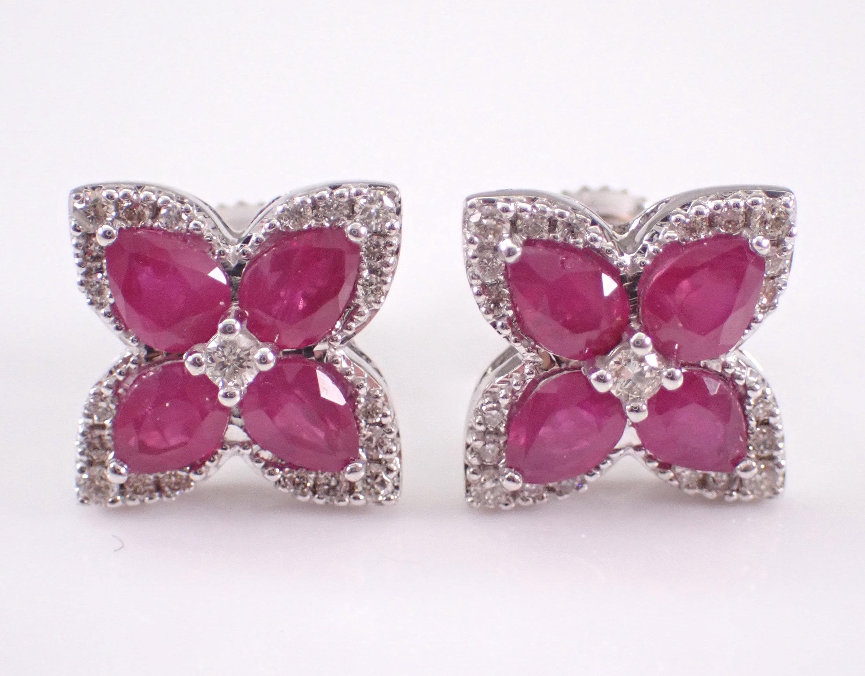 14K White Gold Diamond and Ruby Stud Earrings. These earrings are set with four Pear shaped Rubies and twenty-one Round Brilliant Diamonds in EACH earring. These rubies are 100% natural, measure 4 X 3 mm each and amount to a total weight of 3/4 carats. The diamonds are G/H color, SI/I clarity and weigh a total of .38 carat. These earrings are 14K White Gold, weigh 2.6 grams and measure 9.2 X 9.2 mm each. These earrings are for pierced ears and the earrings have secure screwback posts. These earrings will be accompanied by an appraisal written by a GIA Certified Diamond Grader with the retail replacement value of $2,395.00. I will ship these earrings promptly in a gift box.