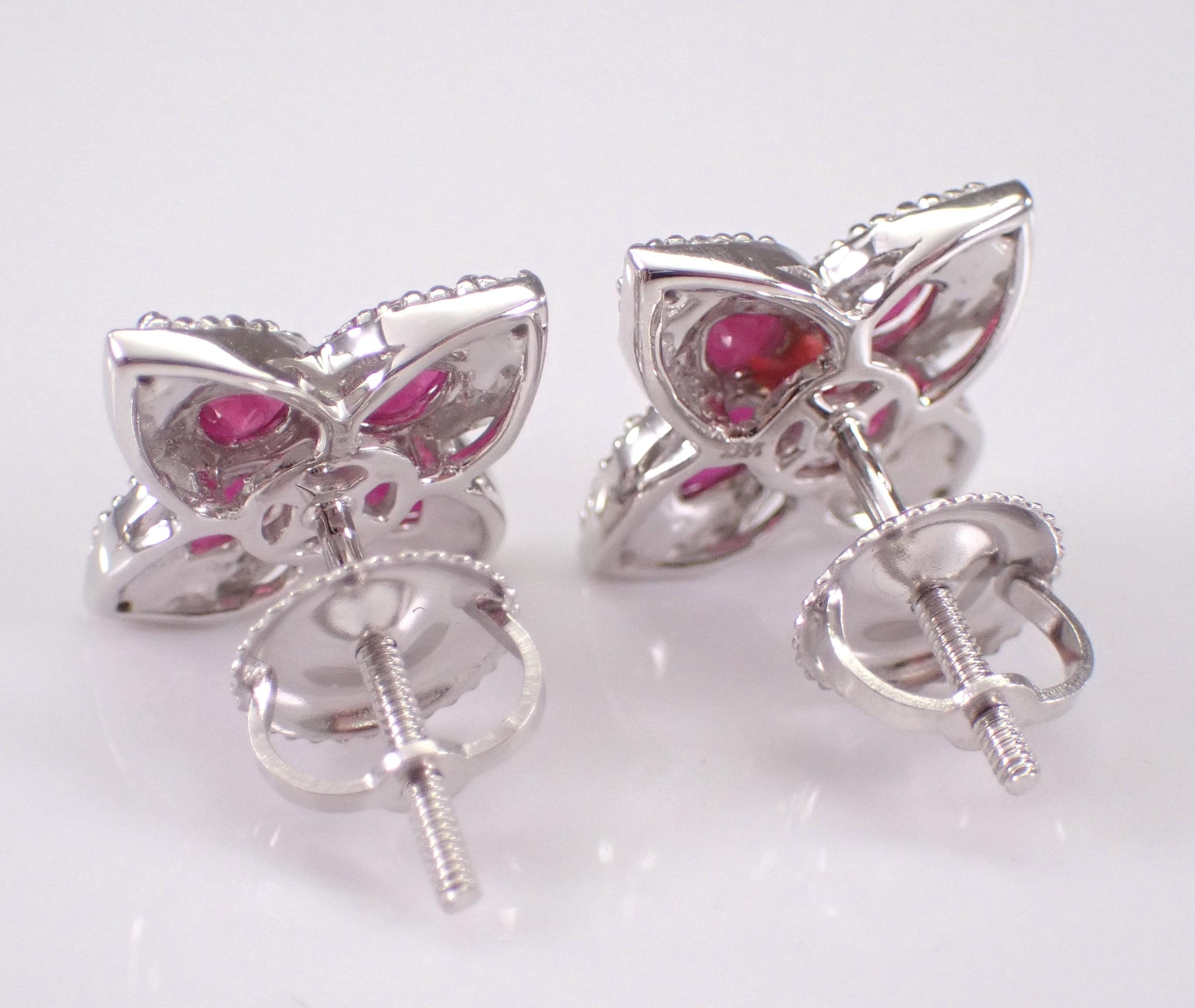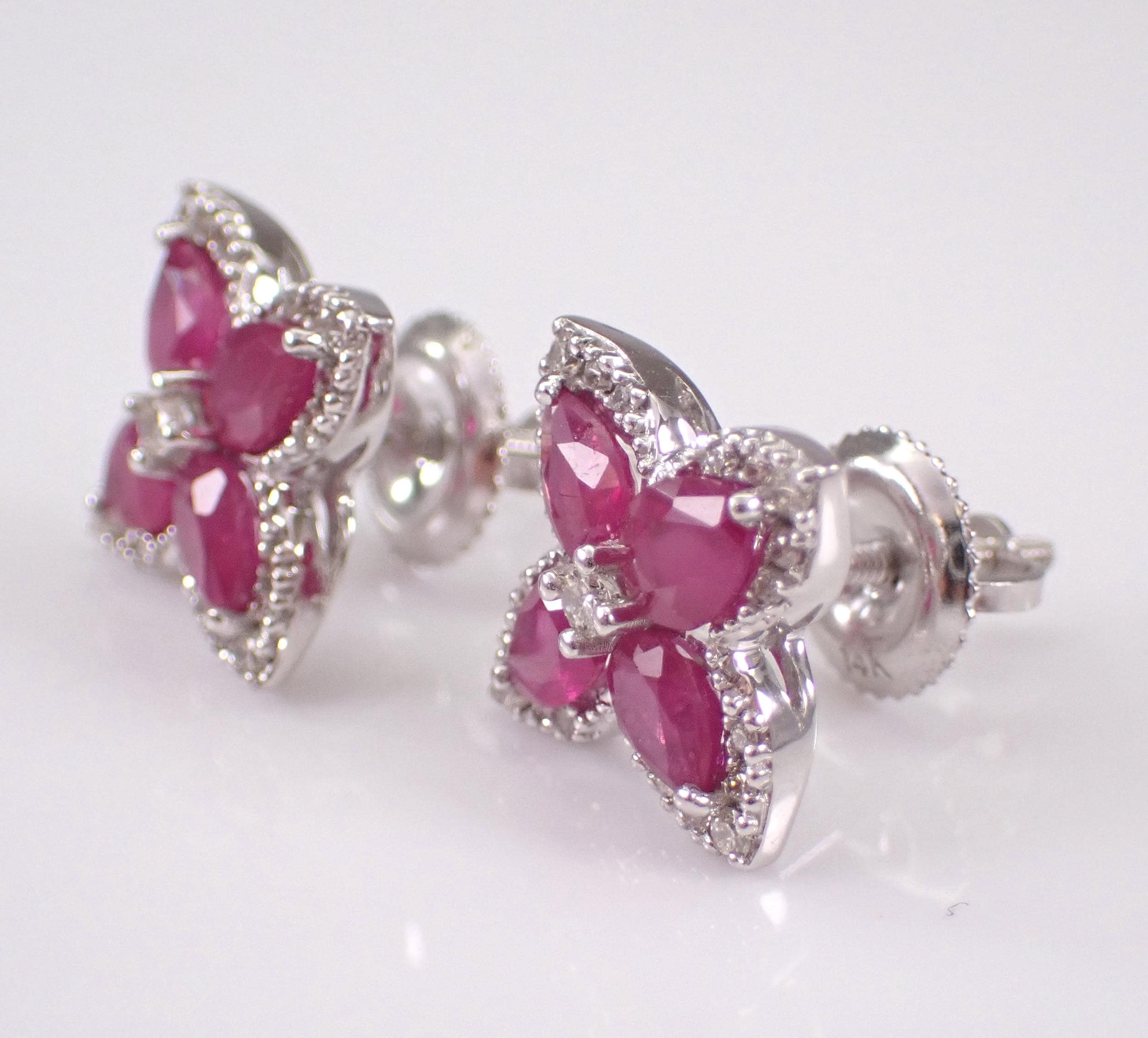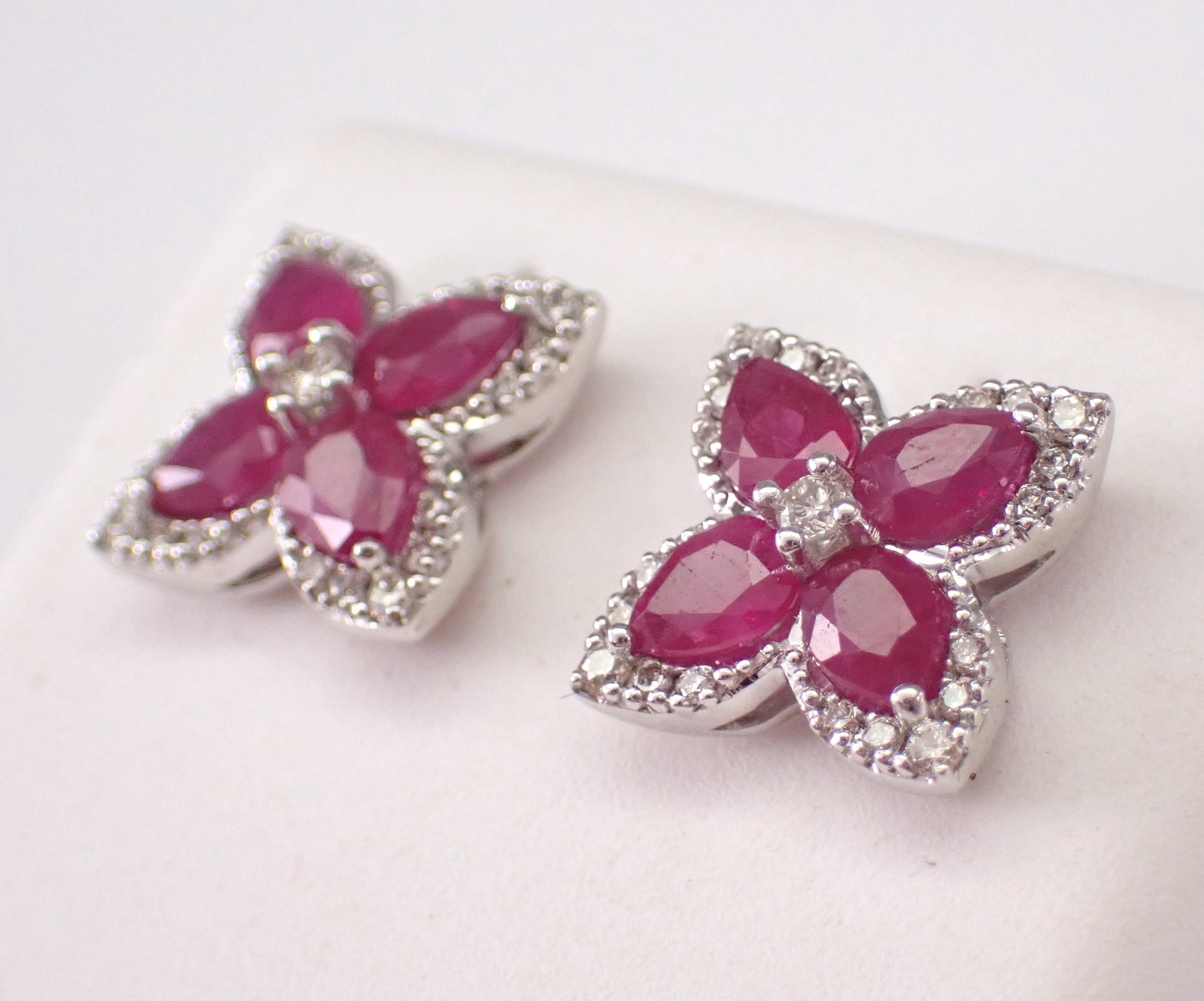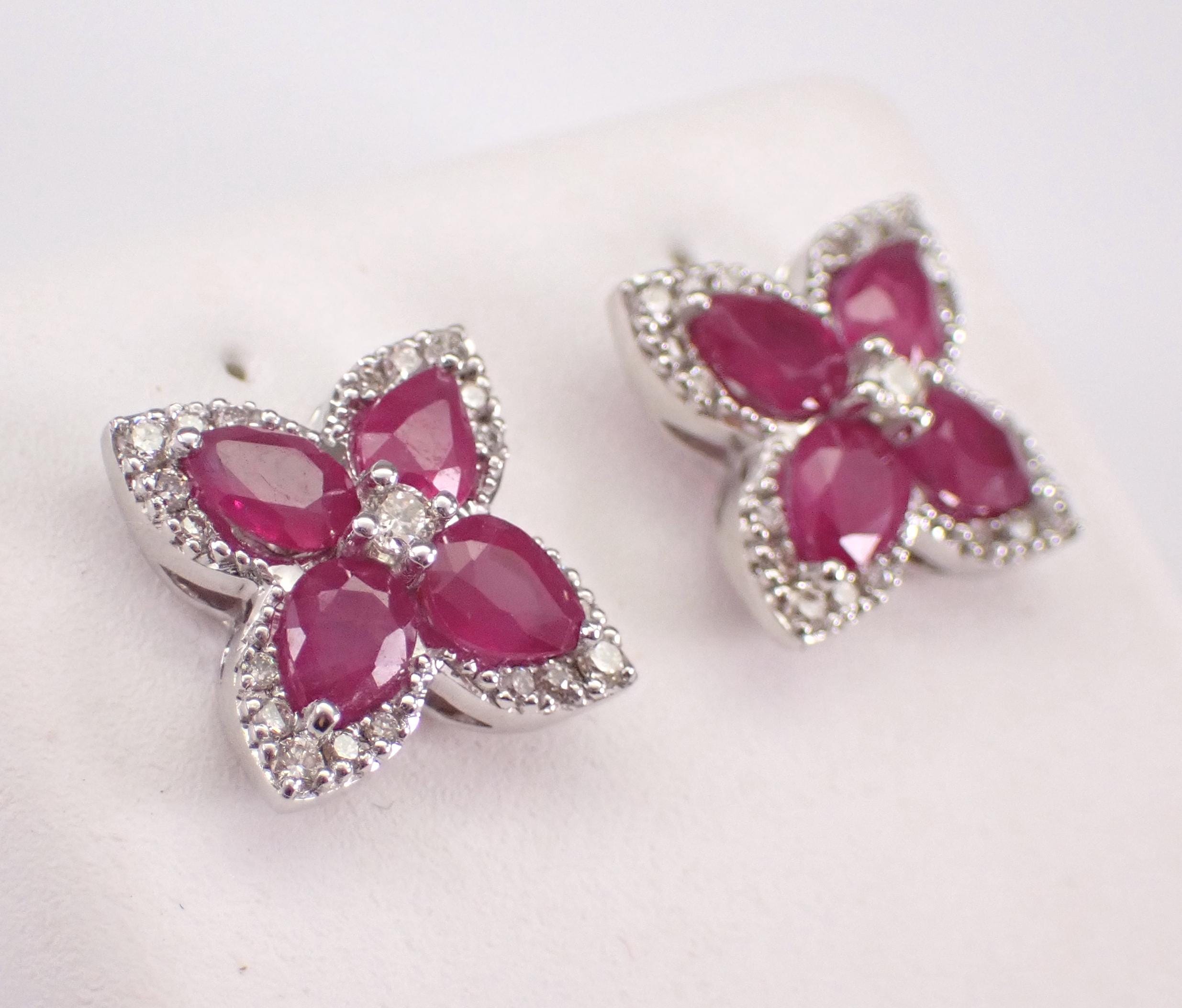 14K White Gold Diamond and Ruby Stud Earrings. These earrings are set with four Pear shaped Rubies and twenty-one Round Brilliant Diamonds in EACH earring. These rubies are 100% natural, measure 4 X 3 mm each and amount to a total weight of 3/4 carats. The diamonds are G/H color, SI/I clarity and weigh a total of .38 carat. These earrings are 14K White Gold, weigh 2.6 grams and measure 9.2 X 9.2 mm each. These earrings are for pierced ears and the earrings have secure screwback posts. These earrings will be accompanied by an appraisal written by a GIA Certified Diamond Grader with the retail replacement value of $2,395.00. I will ship these earrings promptly in a gift box.