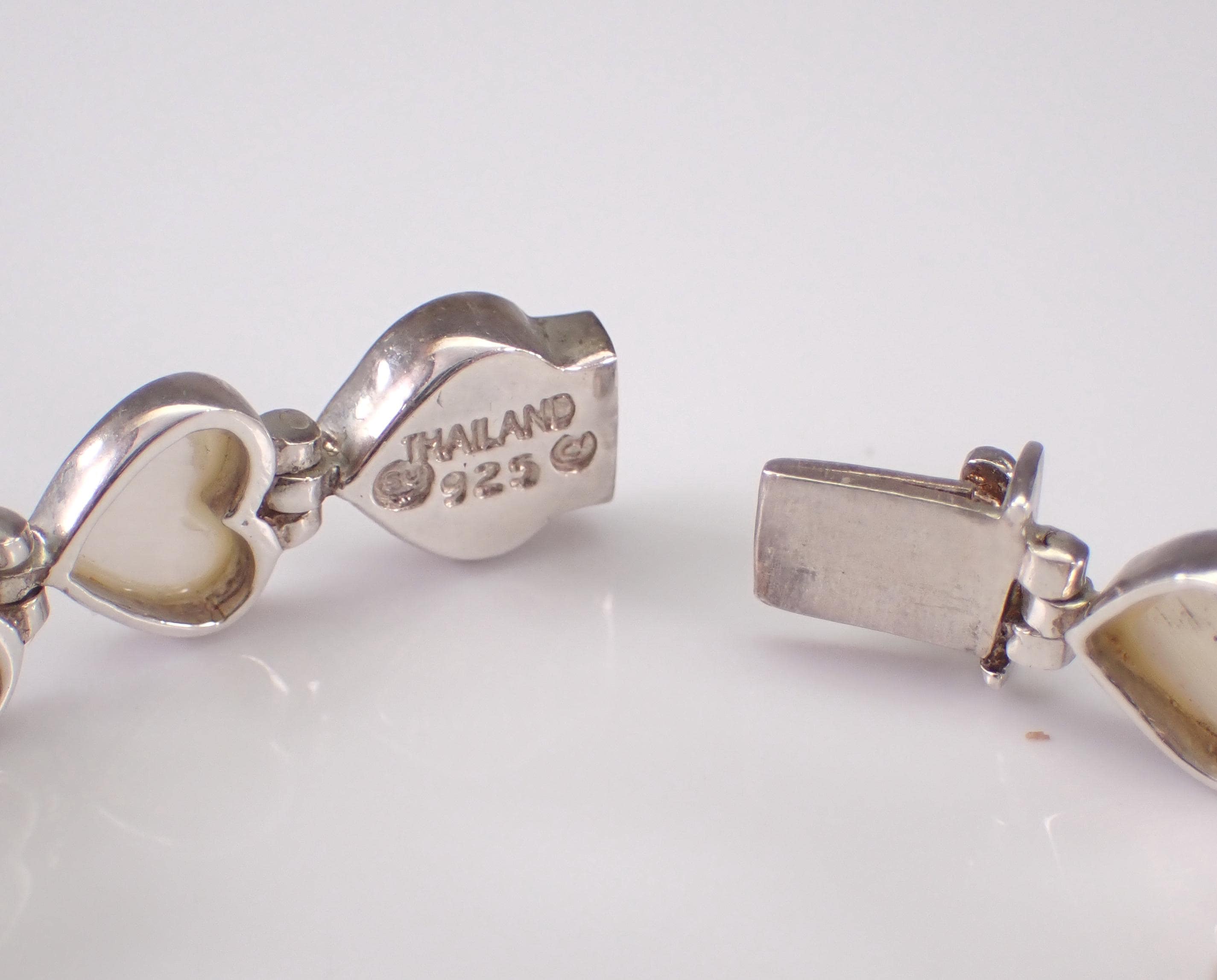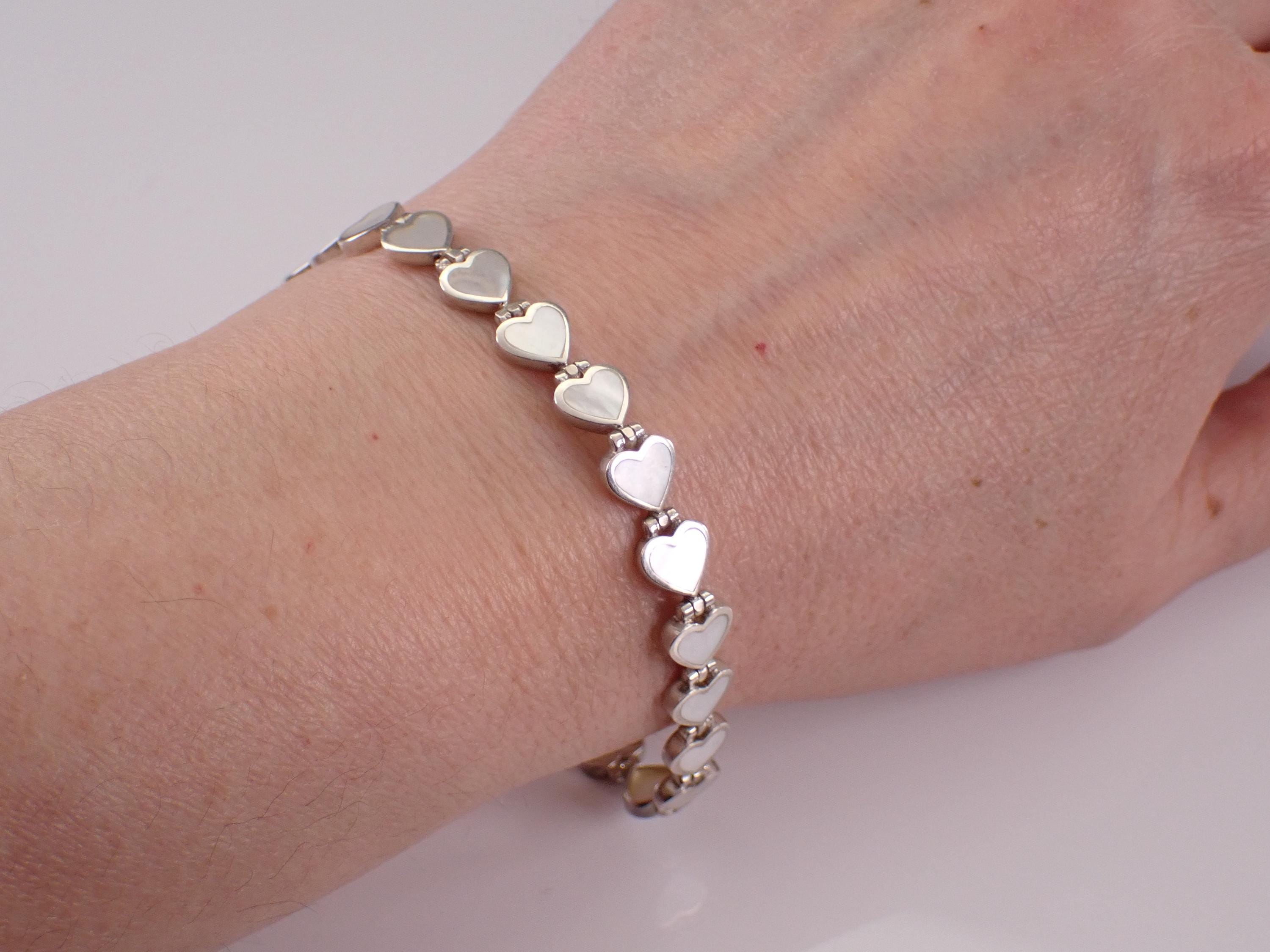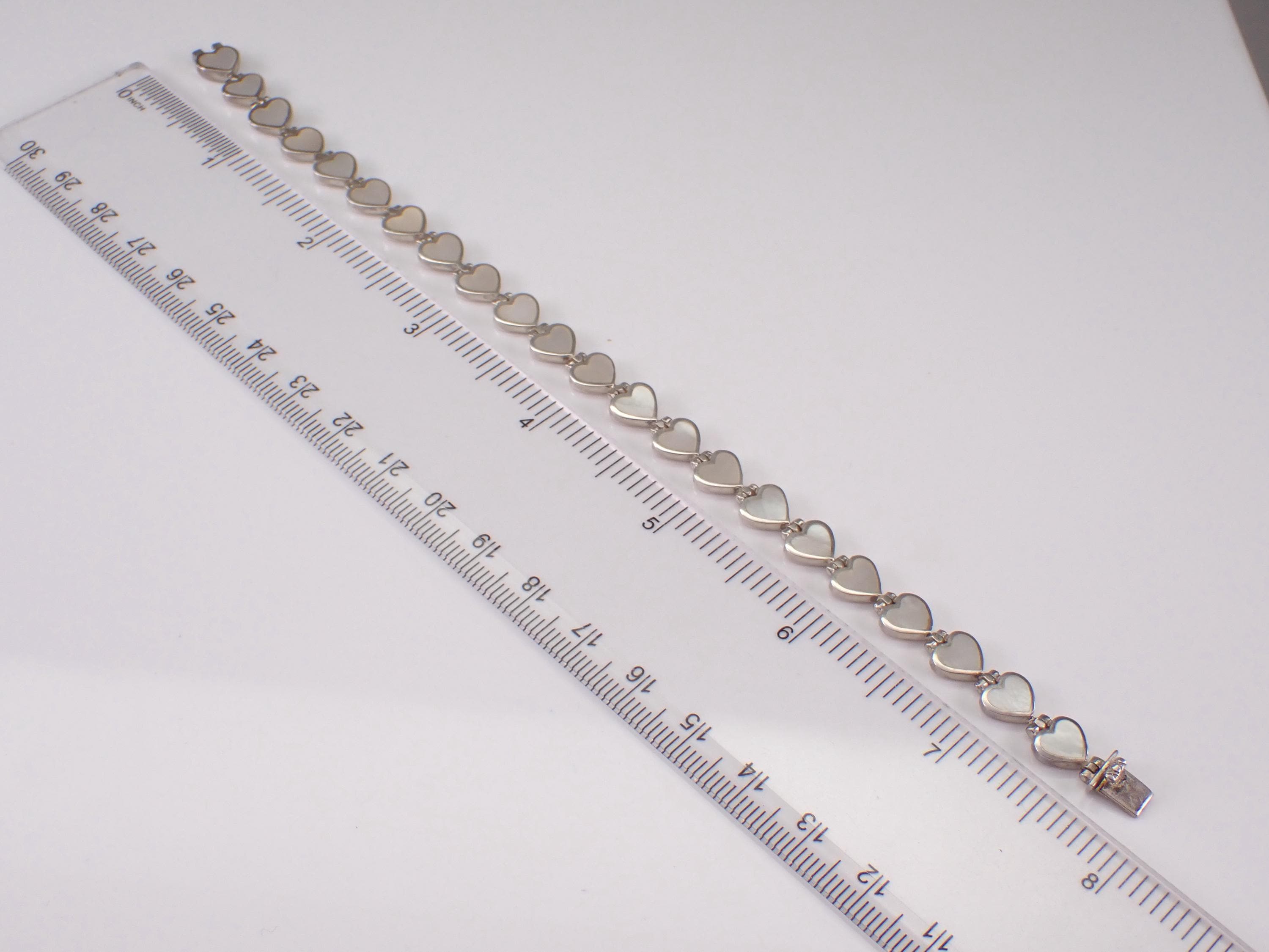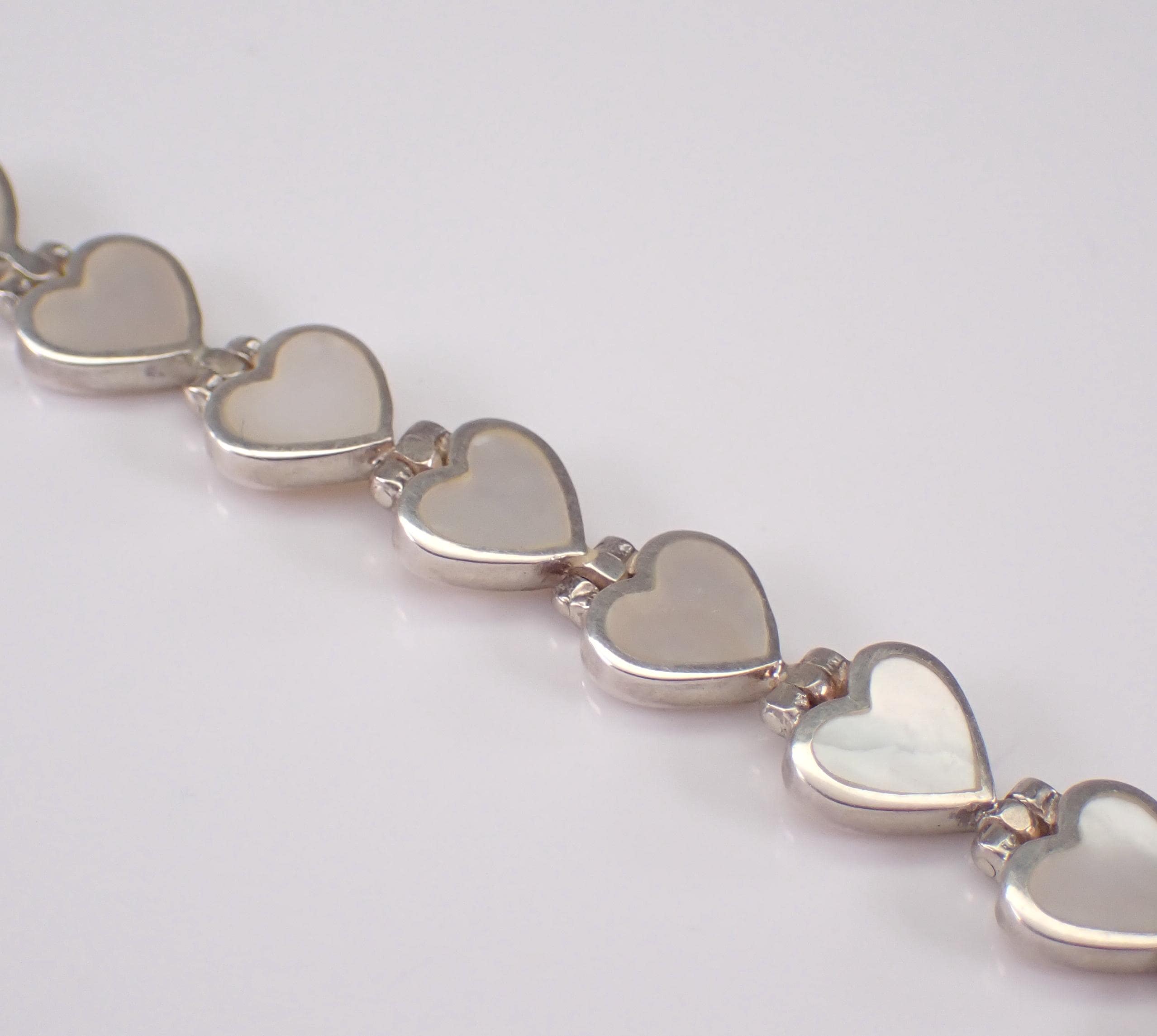 Vintage Unique Sterling Silver Mother of Pearl Heart Bracelet. This bracelet is set with genuine Mother of pearl. This bracelet weighs 10.9 grams and measures 7 1/2" in length and 7.5mm in width. This bracelet will be shipped promptly in a gift pouch. Makes an awesome gift for any age, graduation, birthday or any special event.