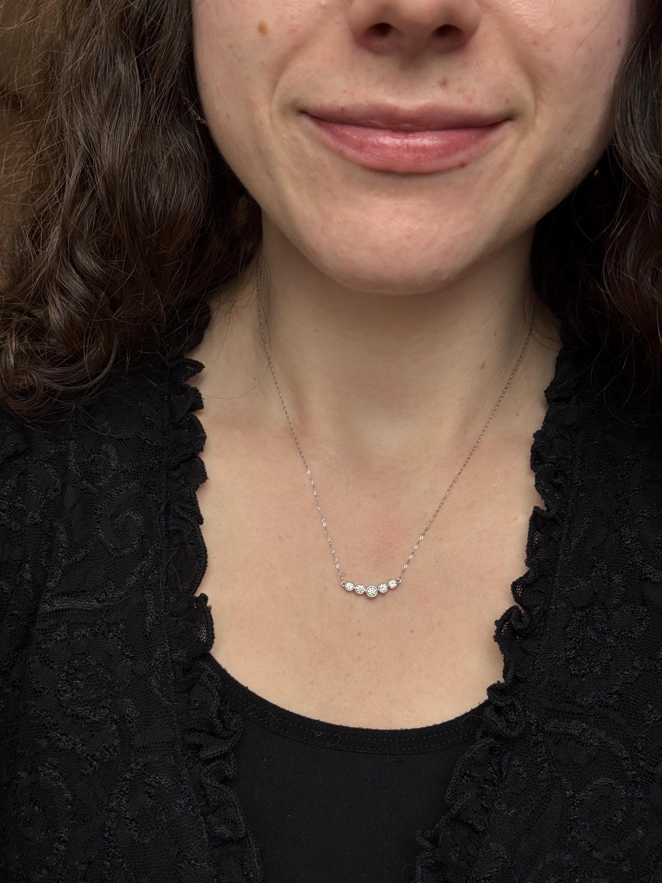 14K White Gold Diamond Bar Station Necklace. This necklace is set with five genuine round brilliant diamonds. These diamonds are H color, SI clarity and weigh a total of .35 carat. This necklace is 14KT White Gold and measures 17" overall. The necklace weighs 1.4 grams and the bar measures 20 mm across. This necklace will be accompanied by an appraisal written by a GIA Certified Diamond Grader with the retail replacement value of $1,489.00. I will ship this necklace promptly in a beautiful gift box.