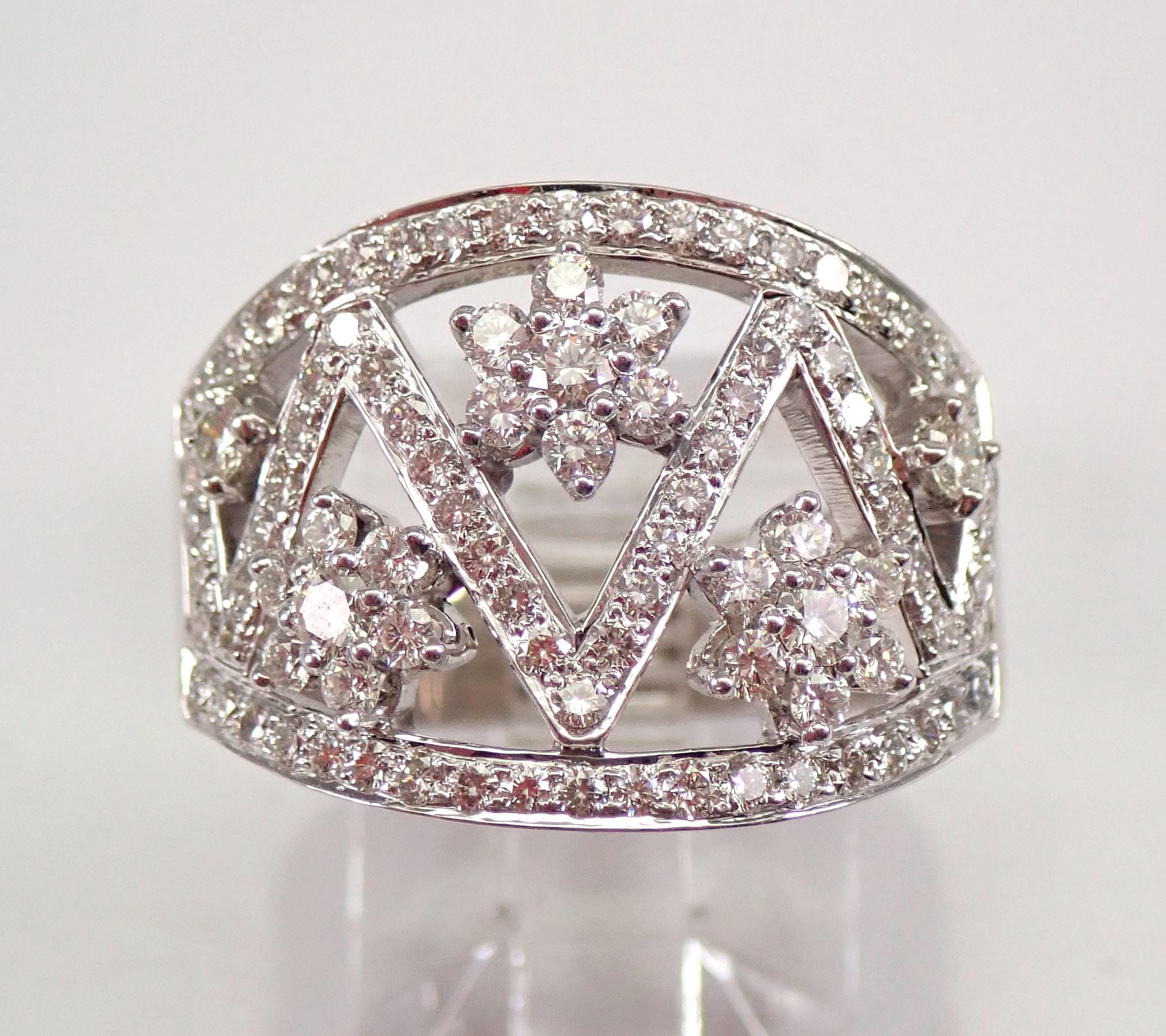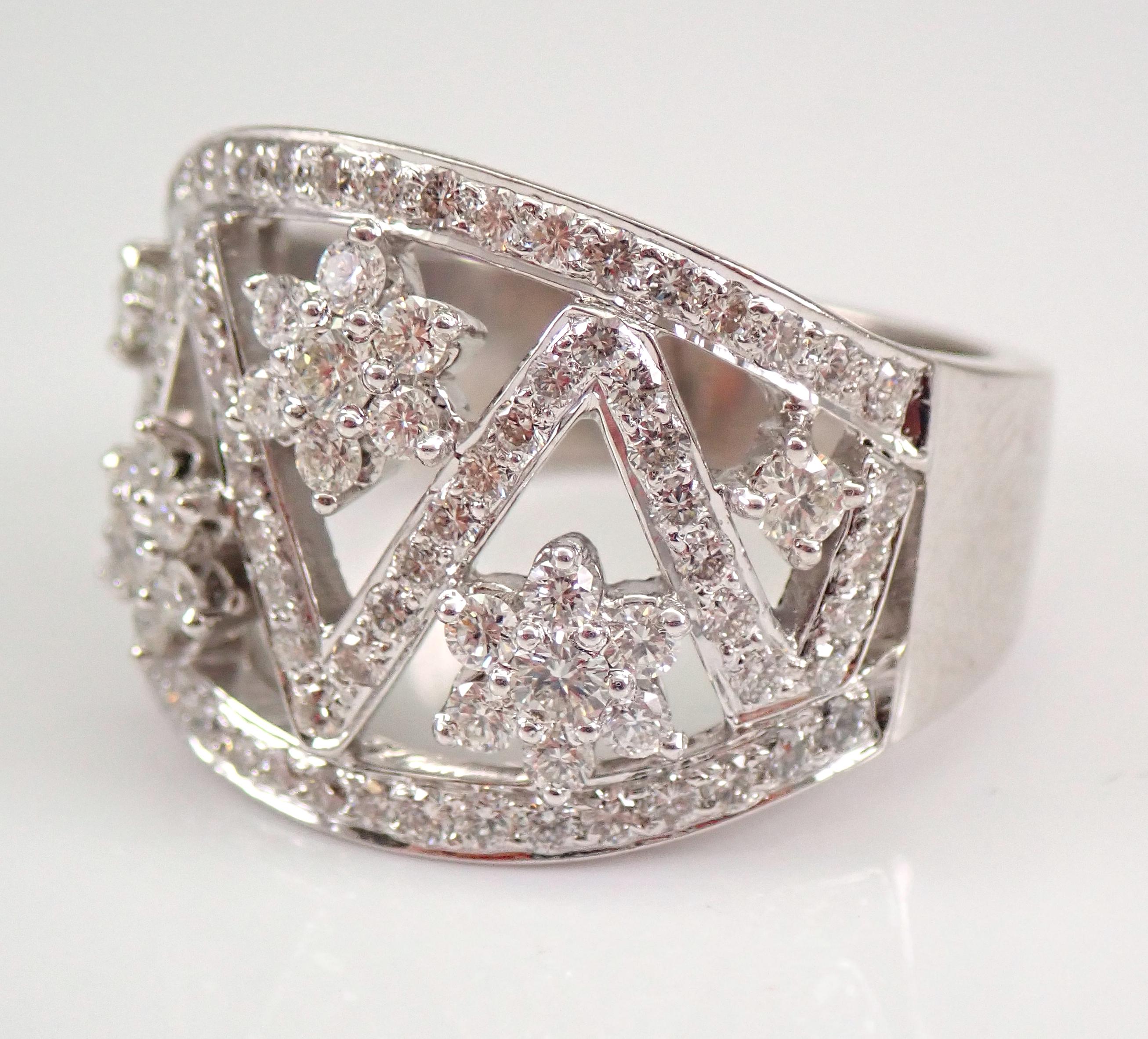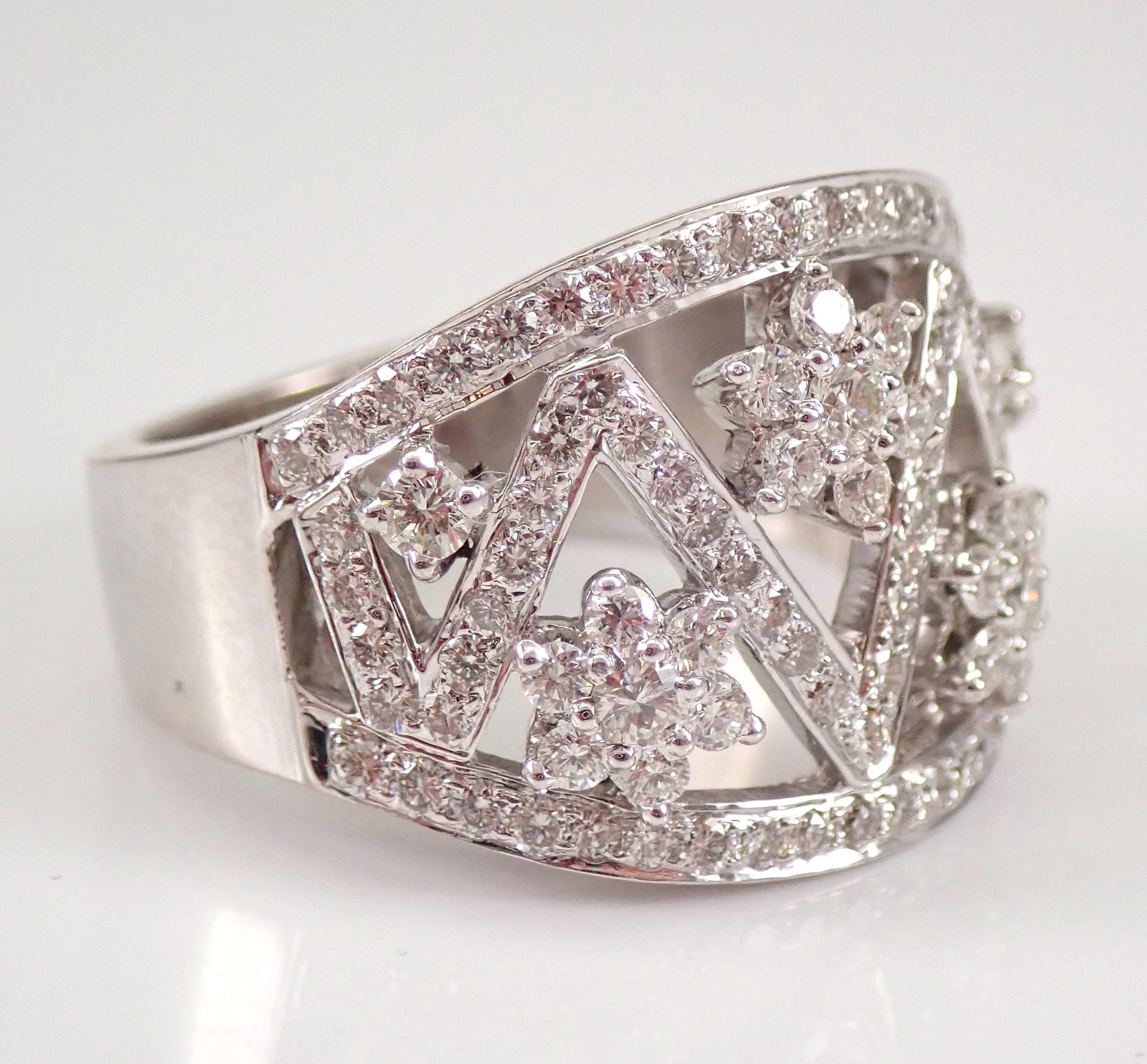 18K White Gold Diamond Wedding Ring Anniversary Band. This is a very beautiful ring set with ninety-eight genuine Round Brilliant Diamonds. These diamonds are G color, SI/VS clarity and weigh a total of 1.22 carats. The ring is 18 KT White Gold, weighs 10.2 grams, measures 15.5 mm in width and is a finger size 6.5, can be resized free of charge (please inquire about sizing with the finger size you need). This ring will be accompanied by an appraisal by a GIA Certified Diamond Grader with the retail replacement value of $6,295.00. I will ship this ring promptly in a gift box.