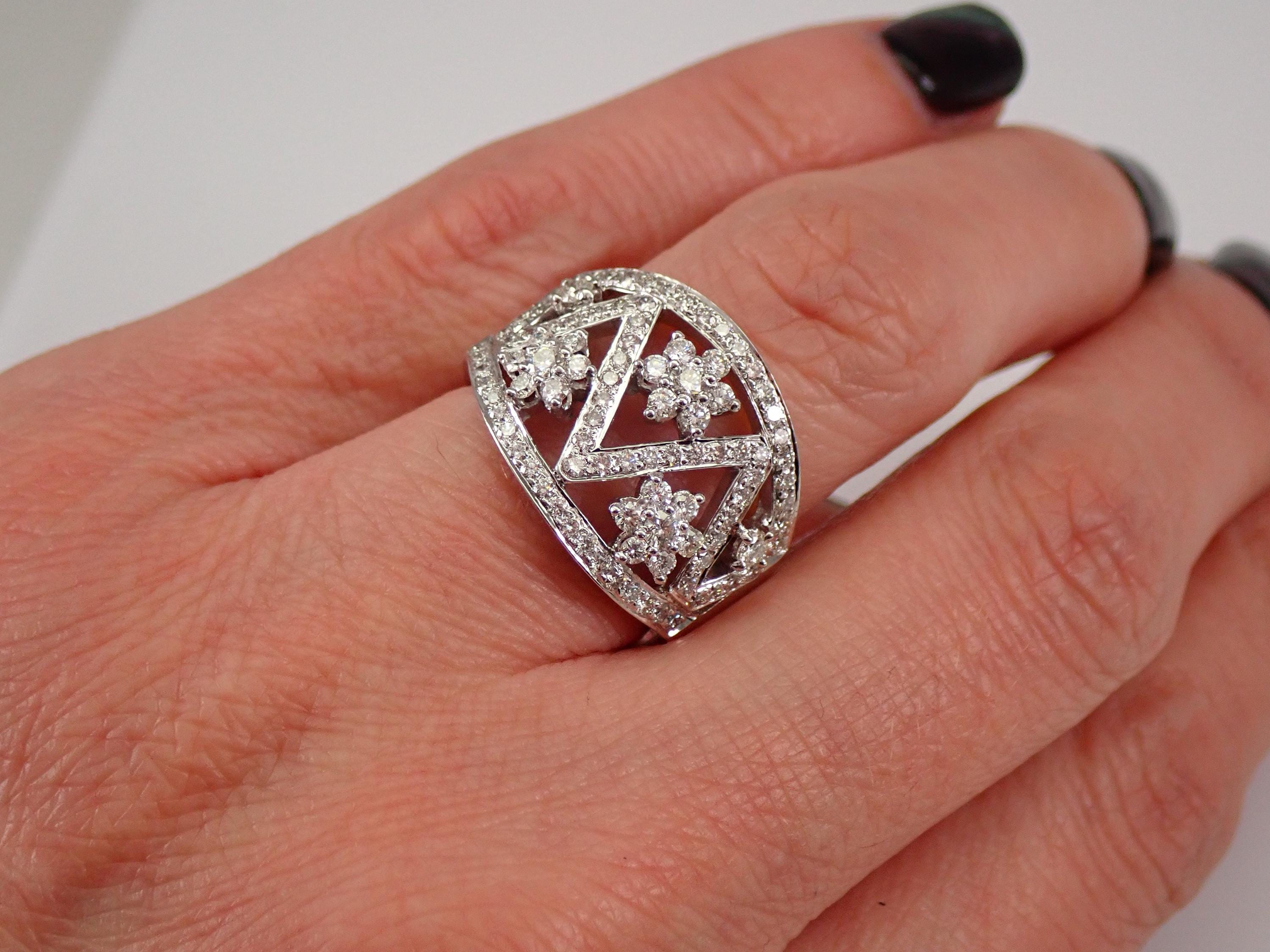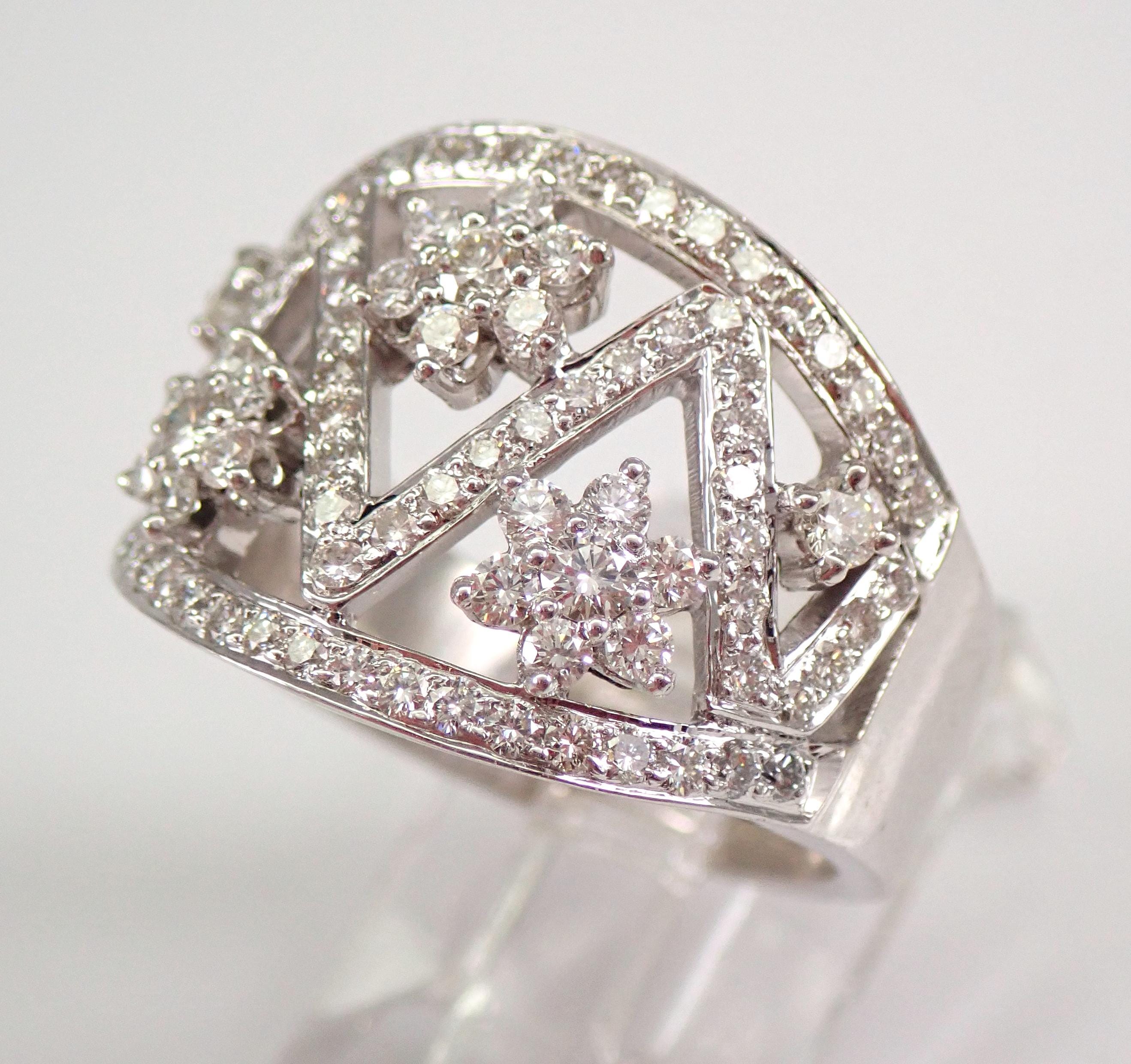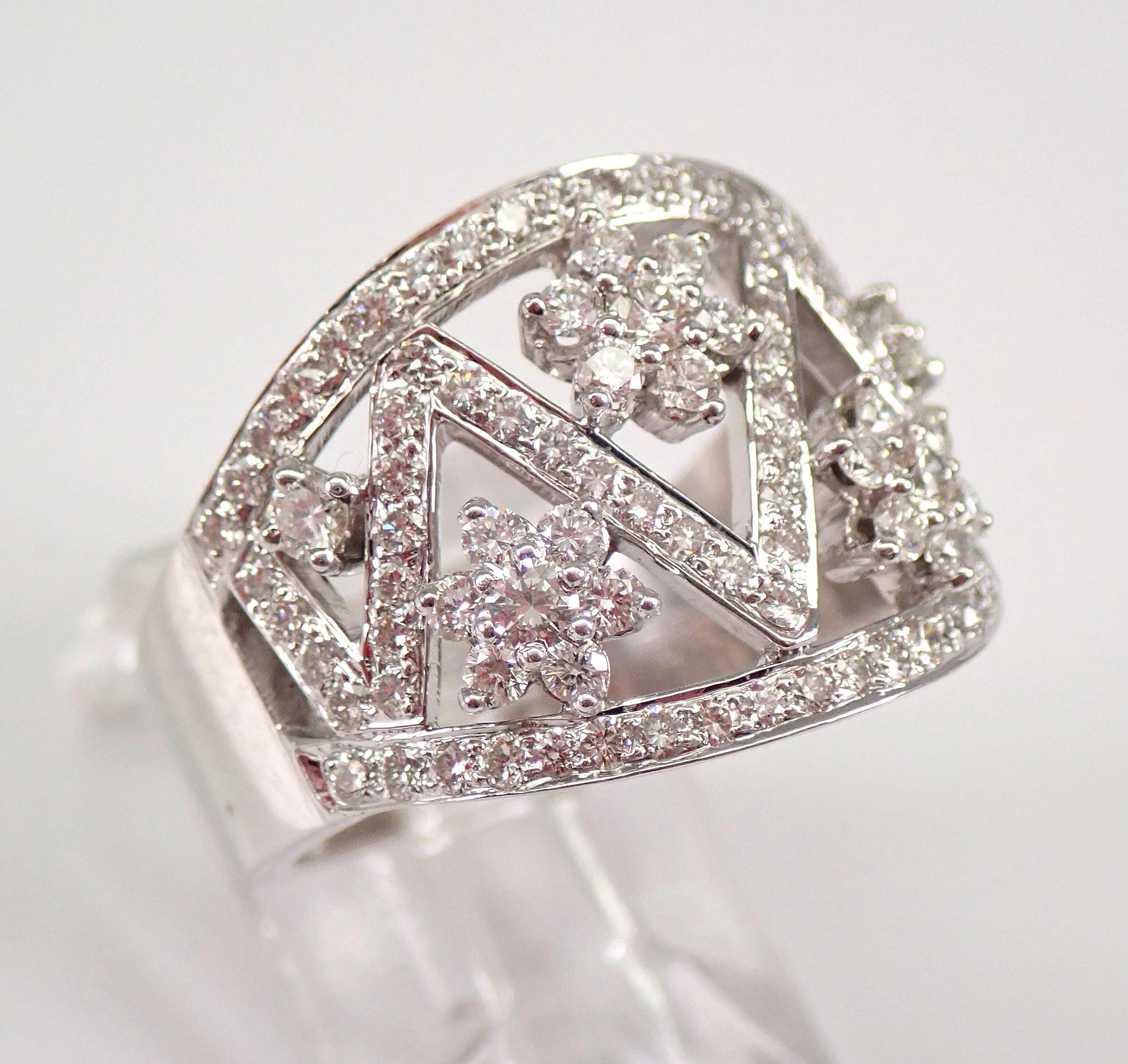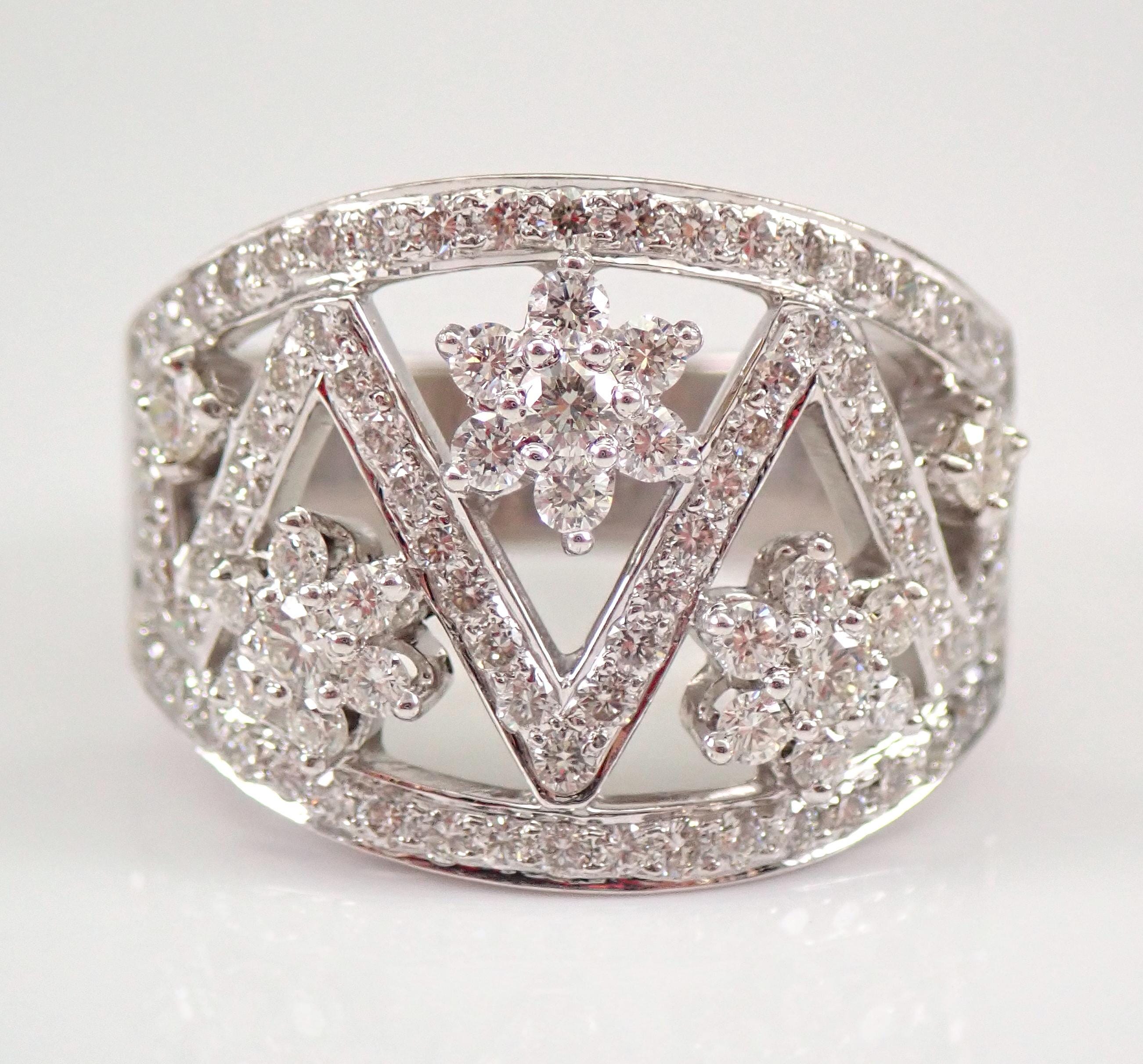 18K White Gold Diamond Wedding Ring Anniversary Band. This is a very beautiful ring set with ninety-eight genuine Round Brilliant Diamonds. These diamonds are G color, SI/VS clarity and weigh a total of 1.22 carats. The ring is 18 KT White Gold, weighs 10.2 grams, measures 15.5 mm in width and is a finger size 6.5, can be resized free of charge (please inquire about sizing with the finger size you need). This ring will be accompanied by an appraisal by a GIA Certified Diamond Grader with the retail replacement value of $6,295.00. I will ship this ring promptly in a gift box.