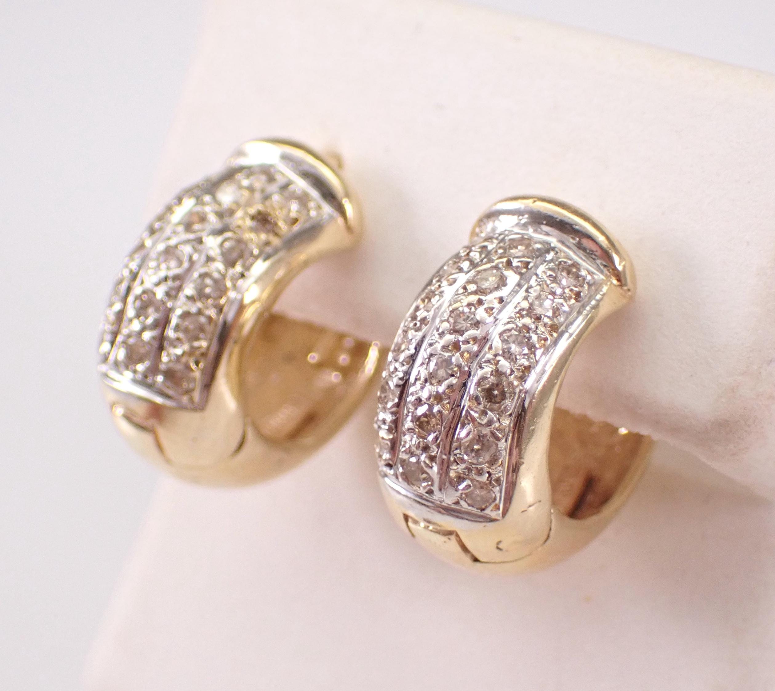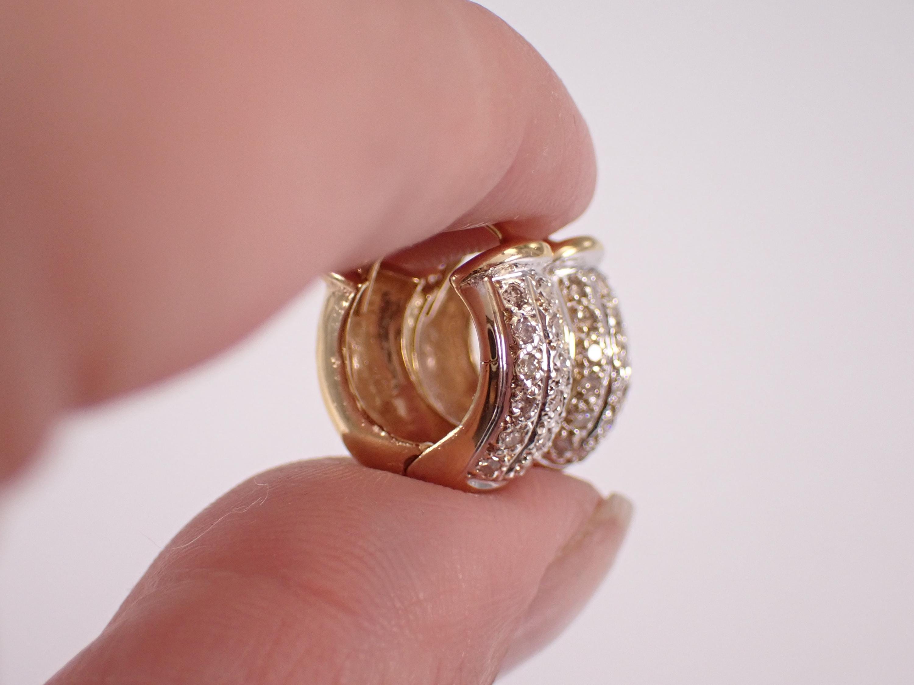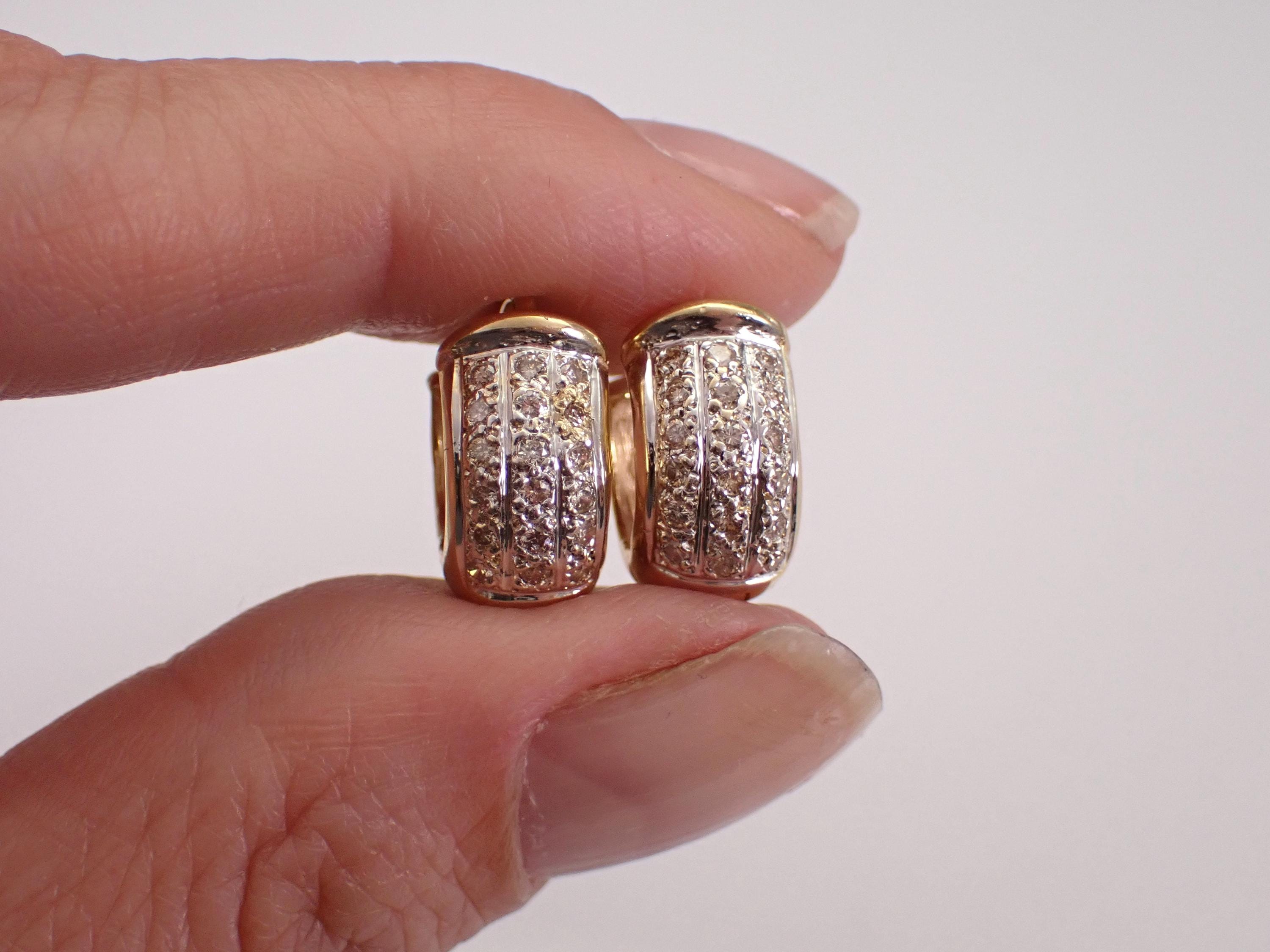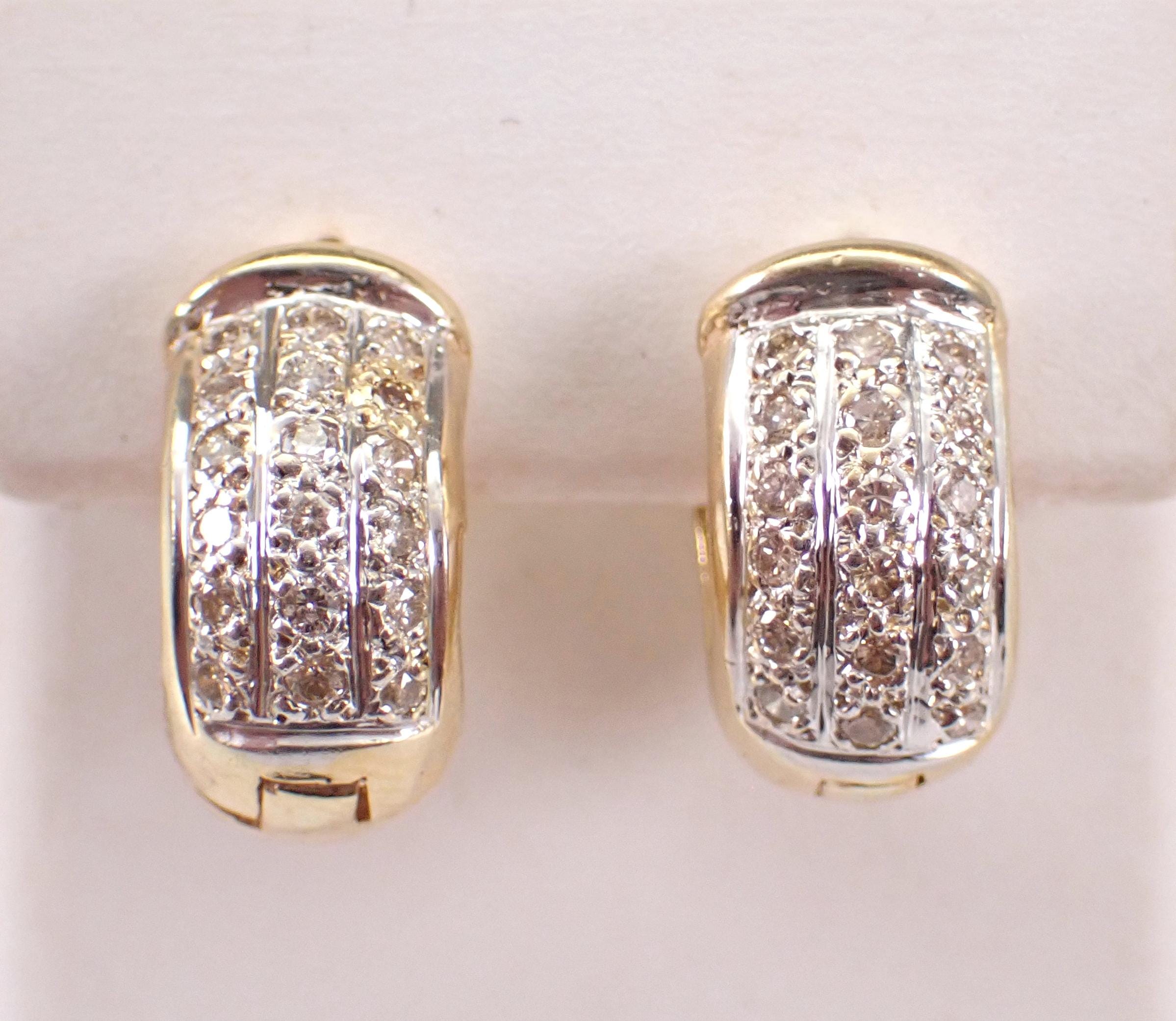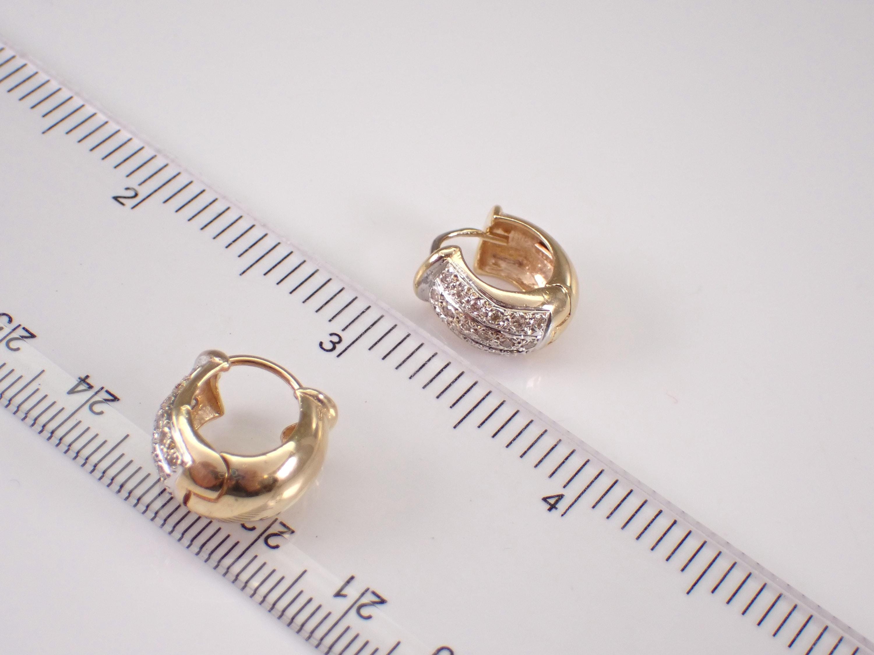 14K Yellow Gold Diamond Huggie Hoop Earrings. These earrings are set with eighteen genuine Round Diamonds in EACH earring. These diamonds are J color, I1 clarity and weigh a total of 1/3 carat. These earrings are 14K Yellow Gold and weigh a total of 6.0 grams. These earrings are for pierced ears and measure 14 X 8 mm. These earrings will be accompanied by an appraisal written by a GIA Certified Diamond Grader with the retail replacement value of $1,895.00. I will ship these earrings promptly in a gift box.