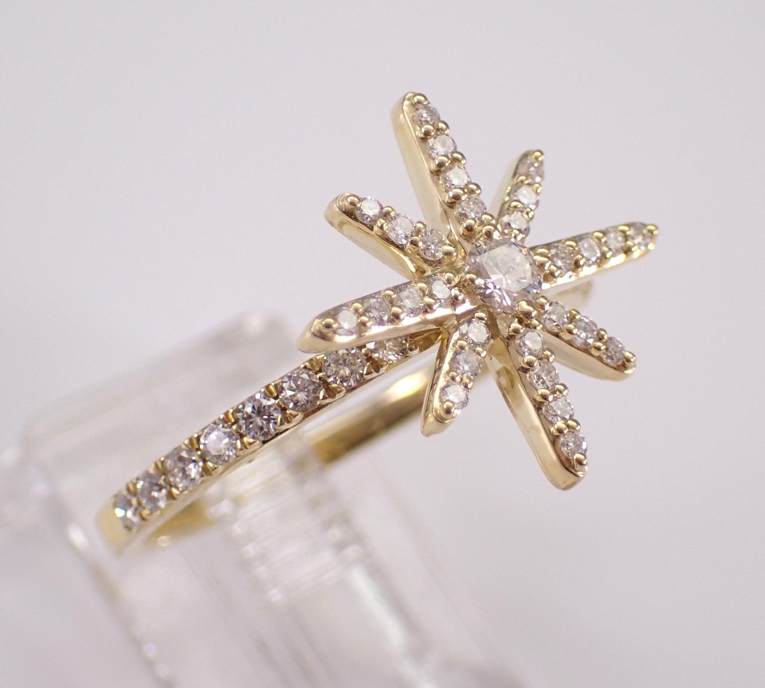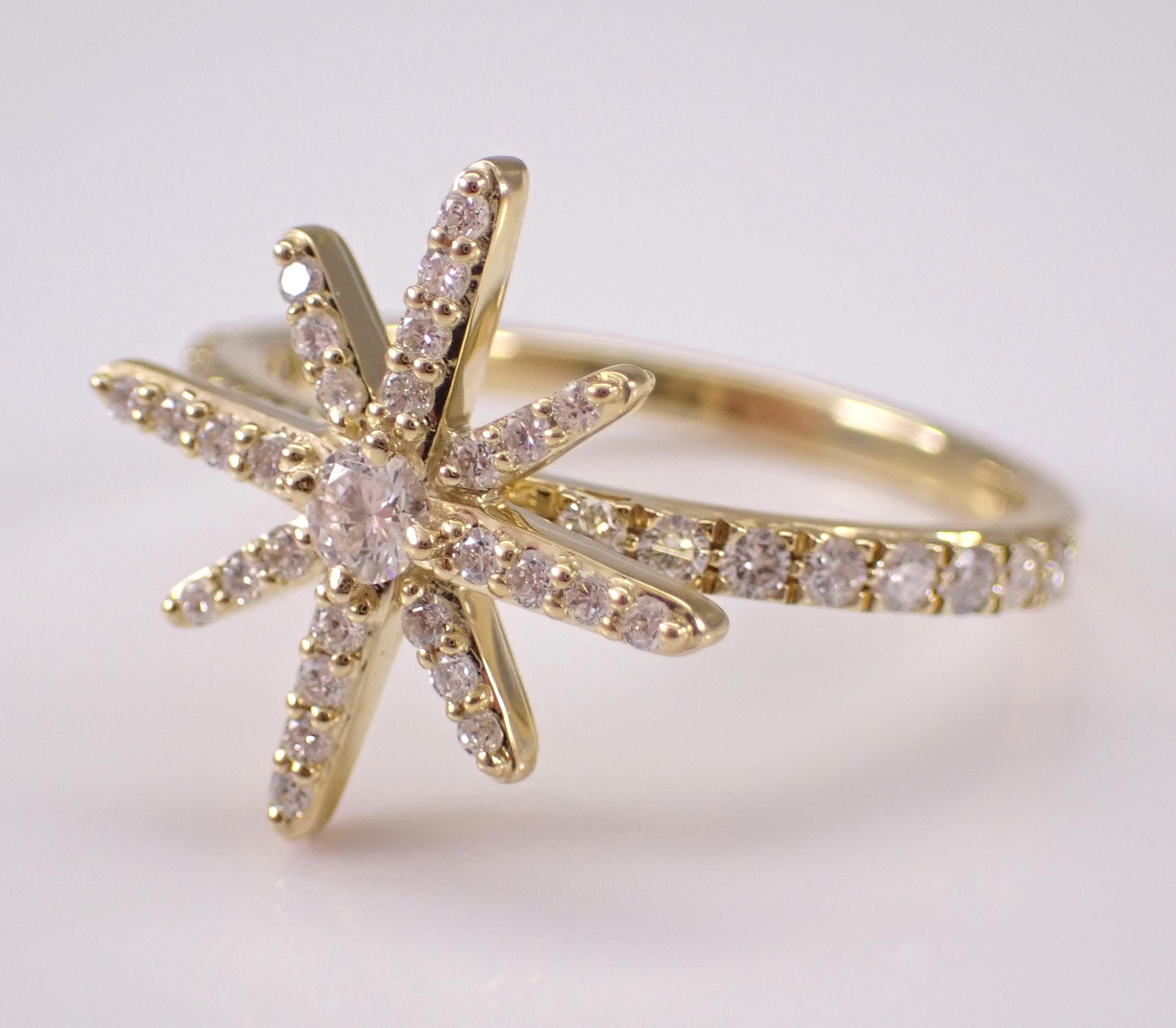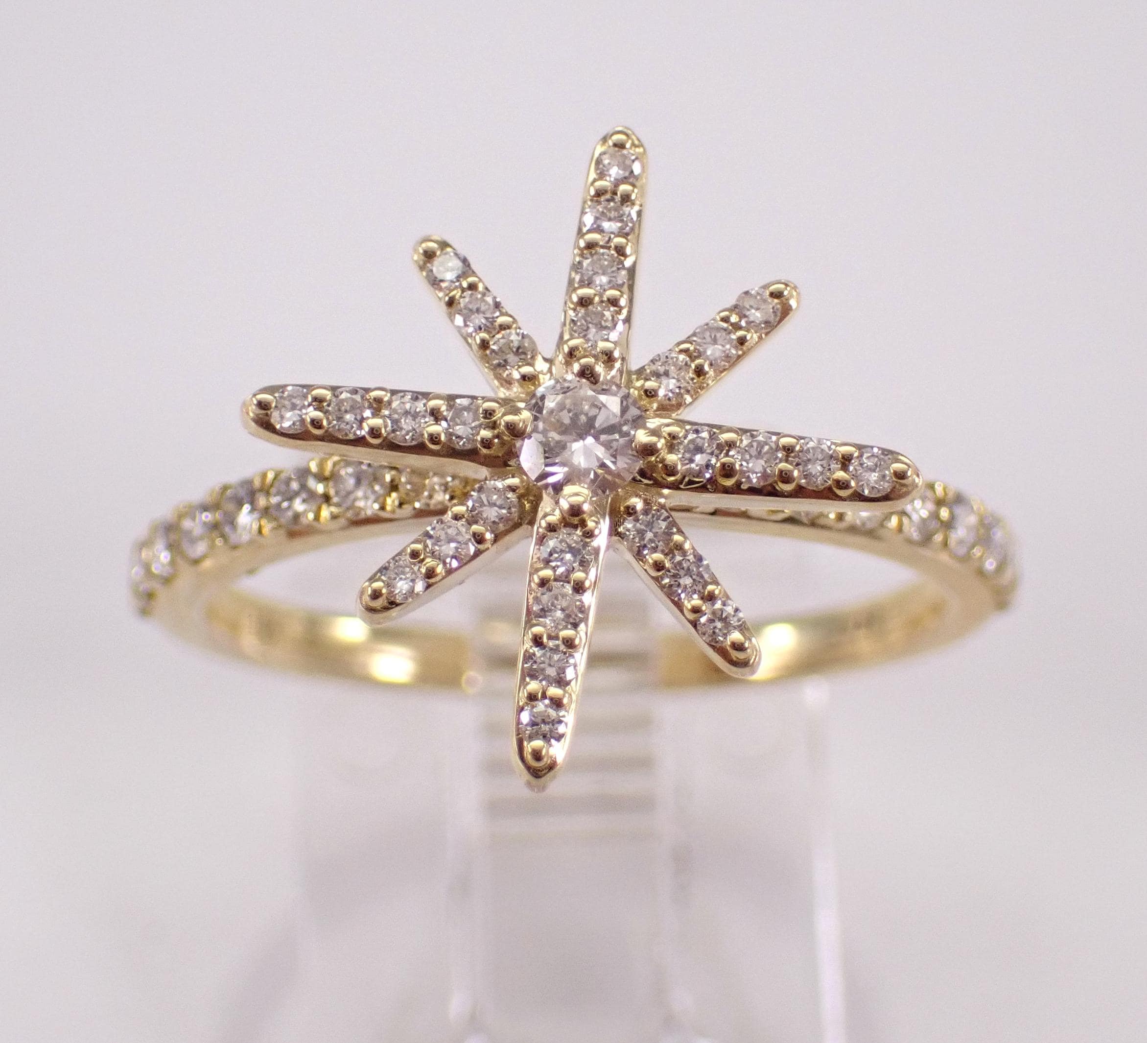 Yellow Gold Diamond Star Ring. This ring is set with forty-five natural Round Brilliant Diamonds. These diamonds are H color, SI/I1 clarity and weigh a total of 1/2 carat. This ring is 10KT Yellow Gold, weighs 2.6 grams and is a finger size 6 3/4, which can be resized (please inquire about sizing with the finger size that you need). The top of this ring measures 15 X 15 mm. This ring will be accompanied by an appraisal with the retail replacement value of $1,689.00. I will ship this ring promptly in a gift box.