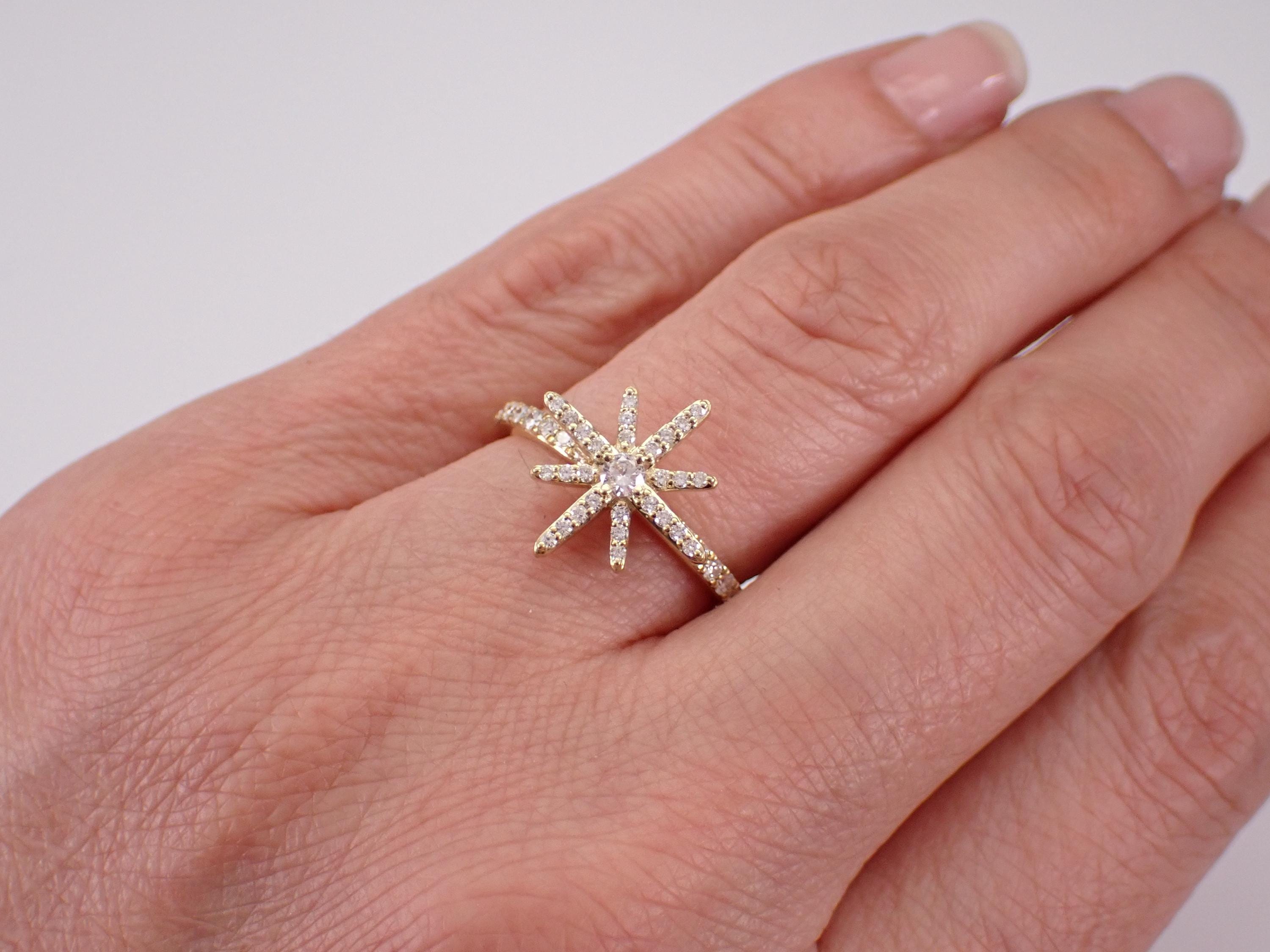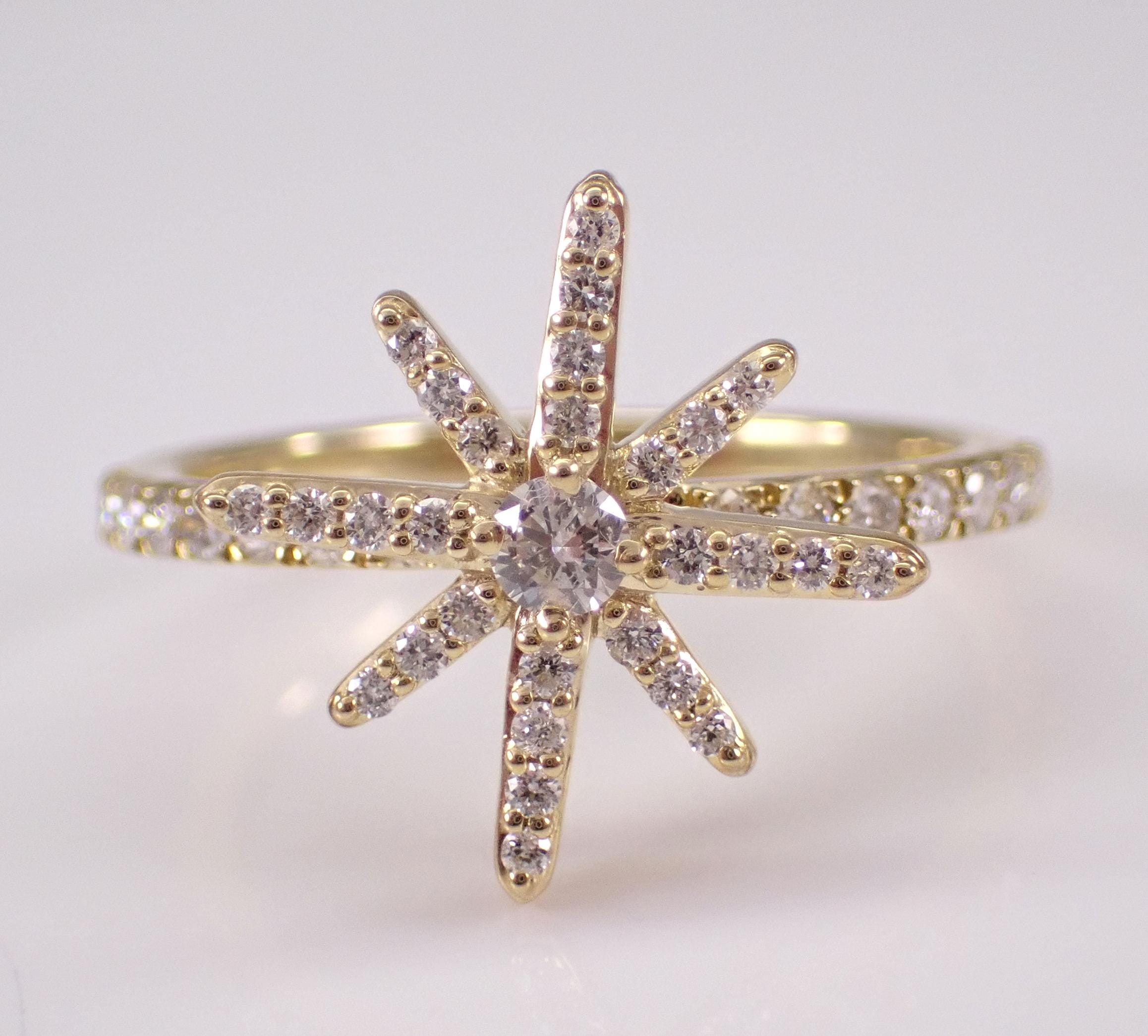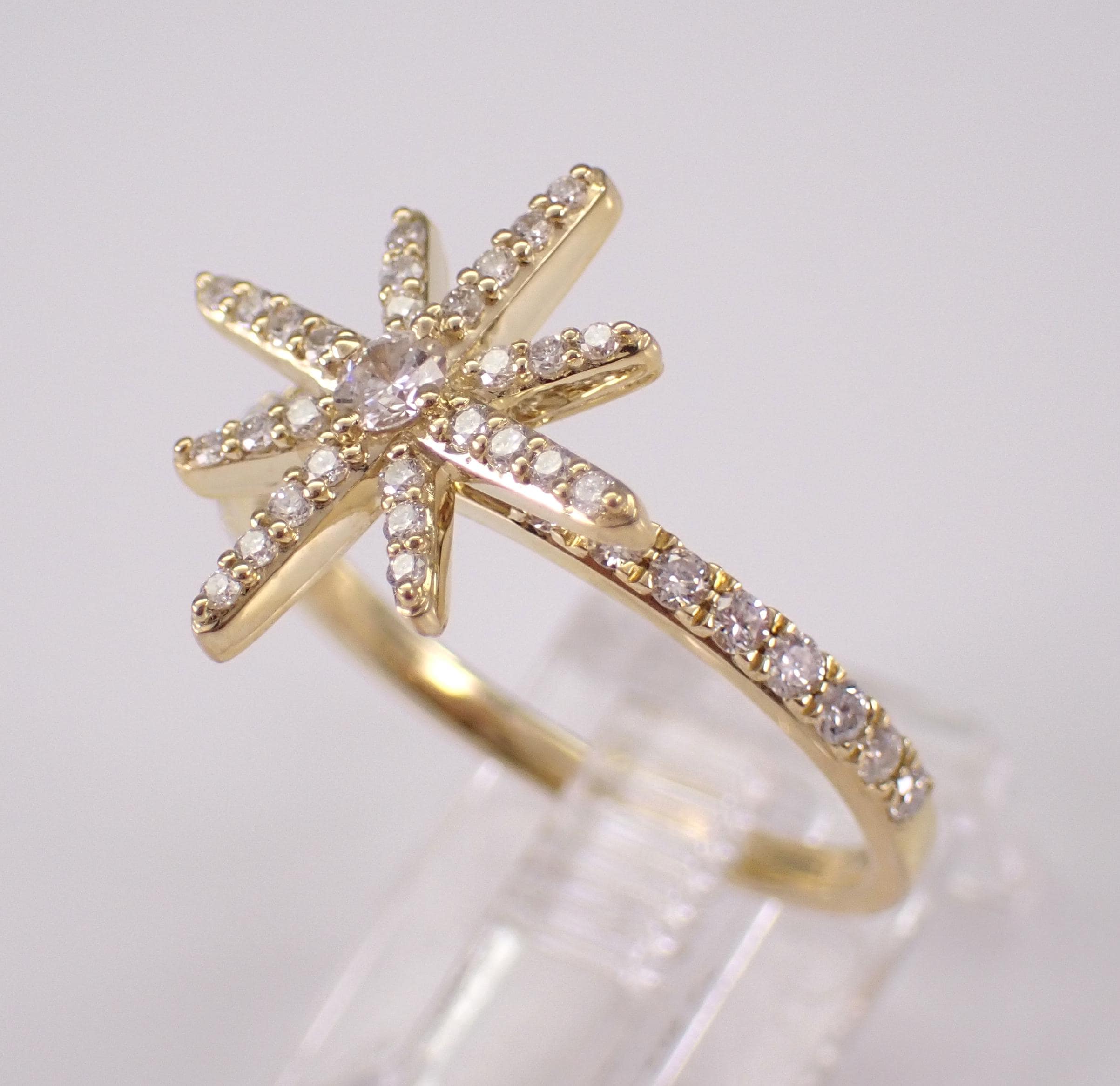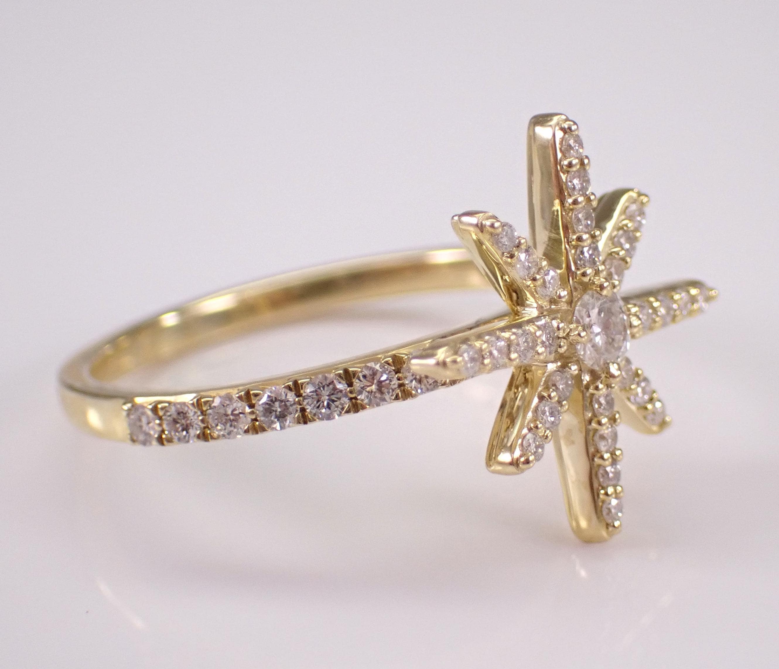 Yellow Gold Diamond Star Ring. This ring is set with forty-five natural Round Brilliant Diamonds. These diamonds are H color, SI/I1 clarity and weigh a total of 1/2 carat. This ring is 10KT Yellow Gold, weighs 2.6 grams and is a finger size 6 3/4, which can be resized (please inquire about sizing with the finger size that you need). The top of this ring measures 15 X 15 mm. This ring will be accompanied by an appraisal with the retail replacement value of $1,689.00. I will ship this ring promptly in a gift box.