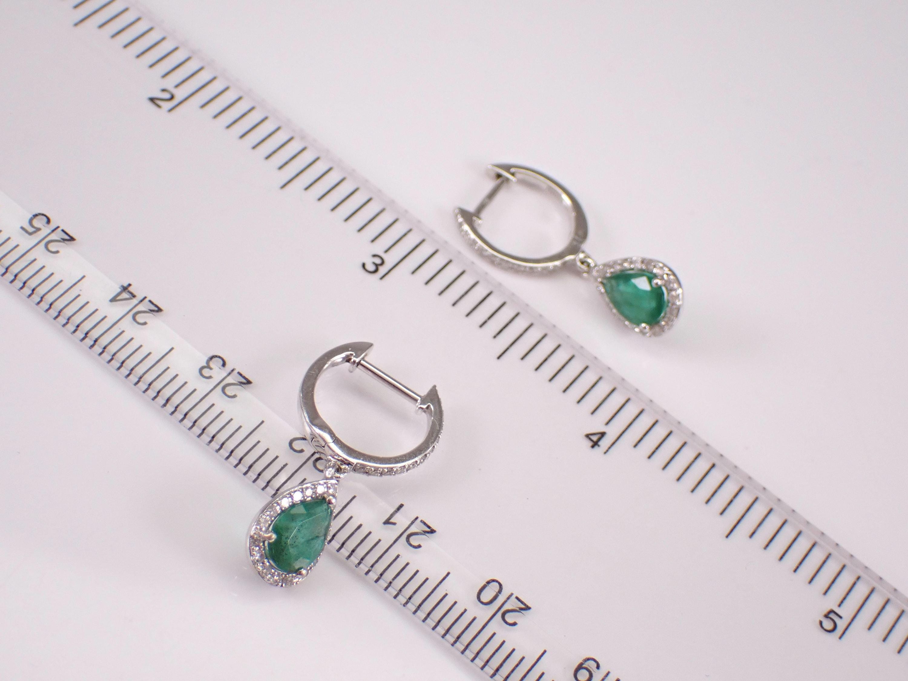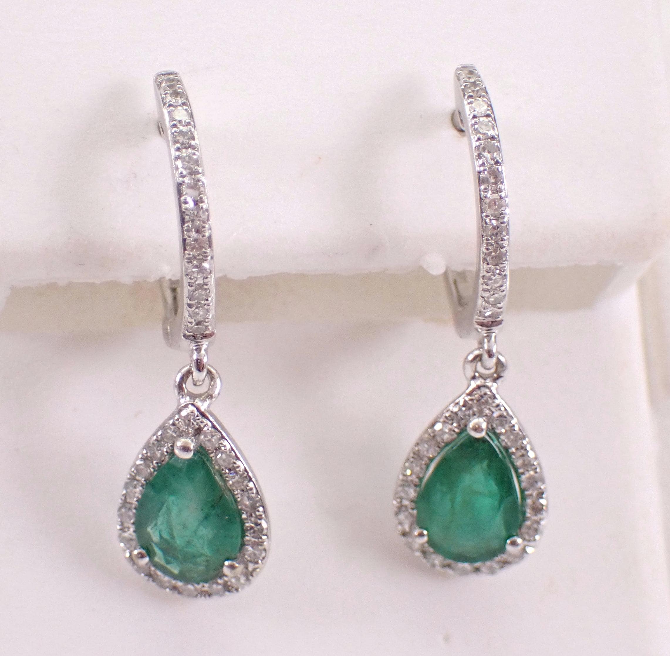 14K White Gold Diamond and Emerald Dangle Earrings. These earrings are set with two genuine Pear shaped Emeralds and sixty natural Round Brilliant Diamonds. These diamonds are H color, SI/I1 clarity and weigh a total of .35 carat. The Emeralds measure 6 X 4.5 mm each and combine to a total weight of 3/4 carats. These earrings are 14KT White Gold and weigh a total of 2.8 grams. These earrings are for pierced ears, measure 24 mm in length and have latch back closures. These earrings will be accompanied by an appraisal with the retail replacement value of $2,289.00. I will ship these earrings promptly in a gift box.