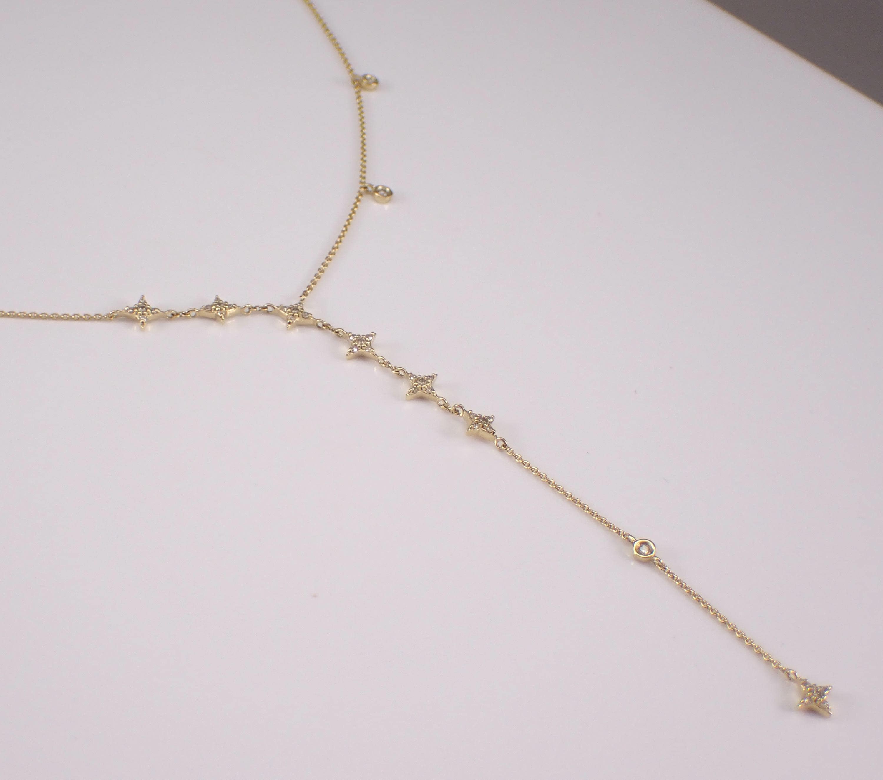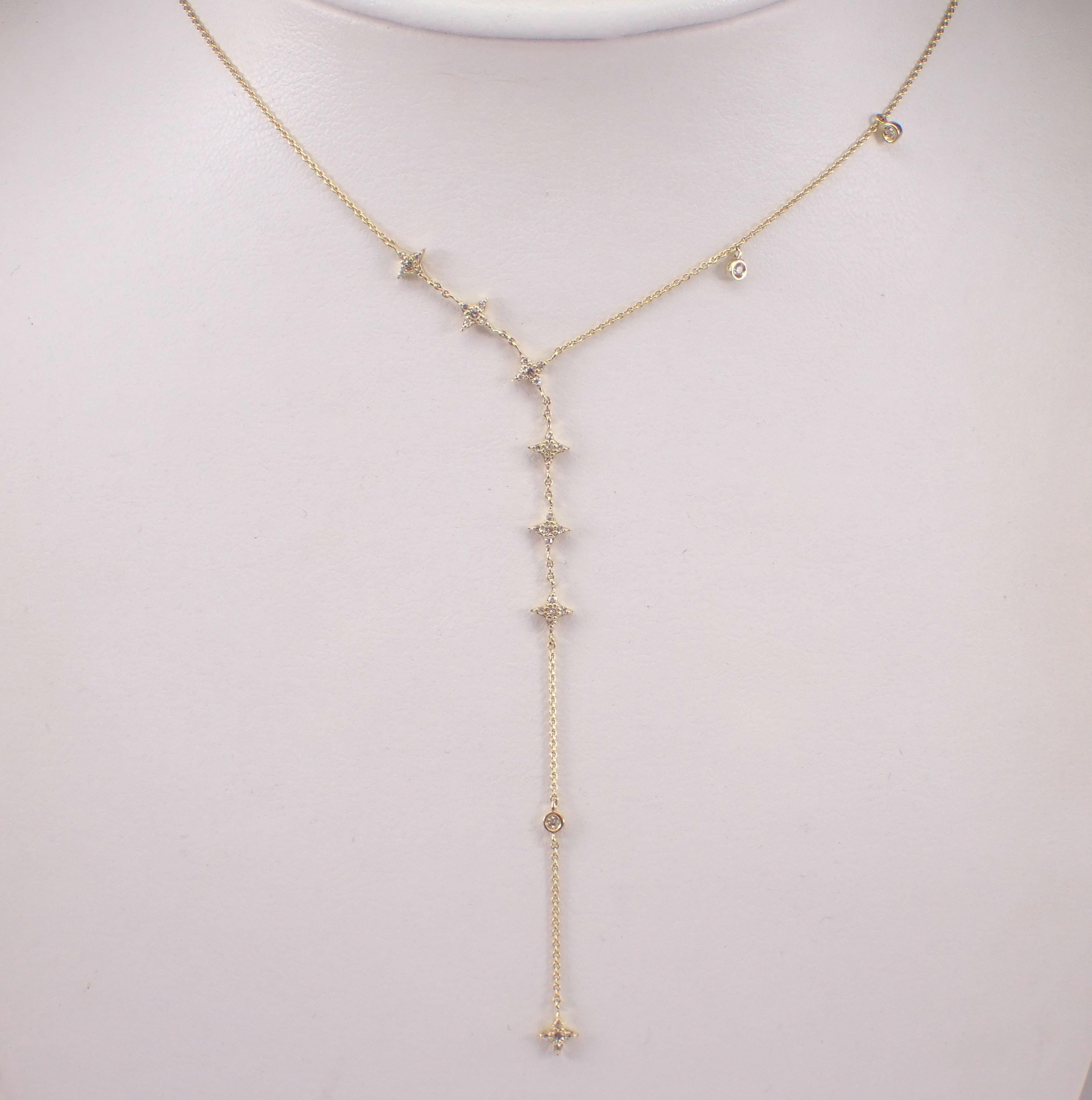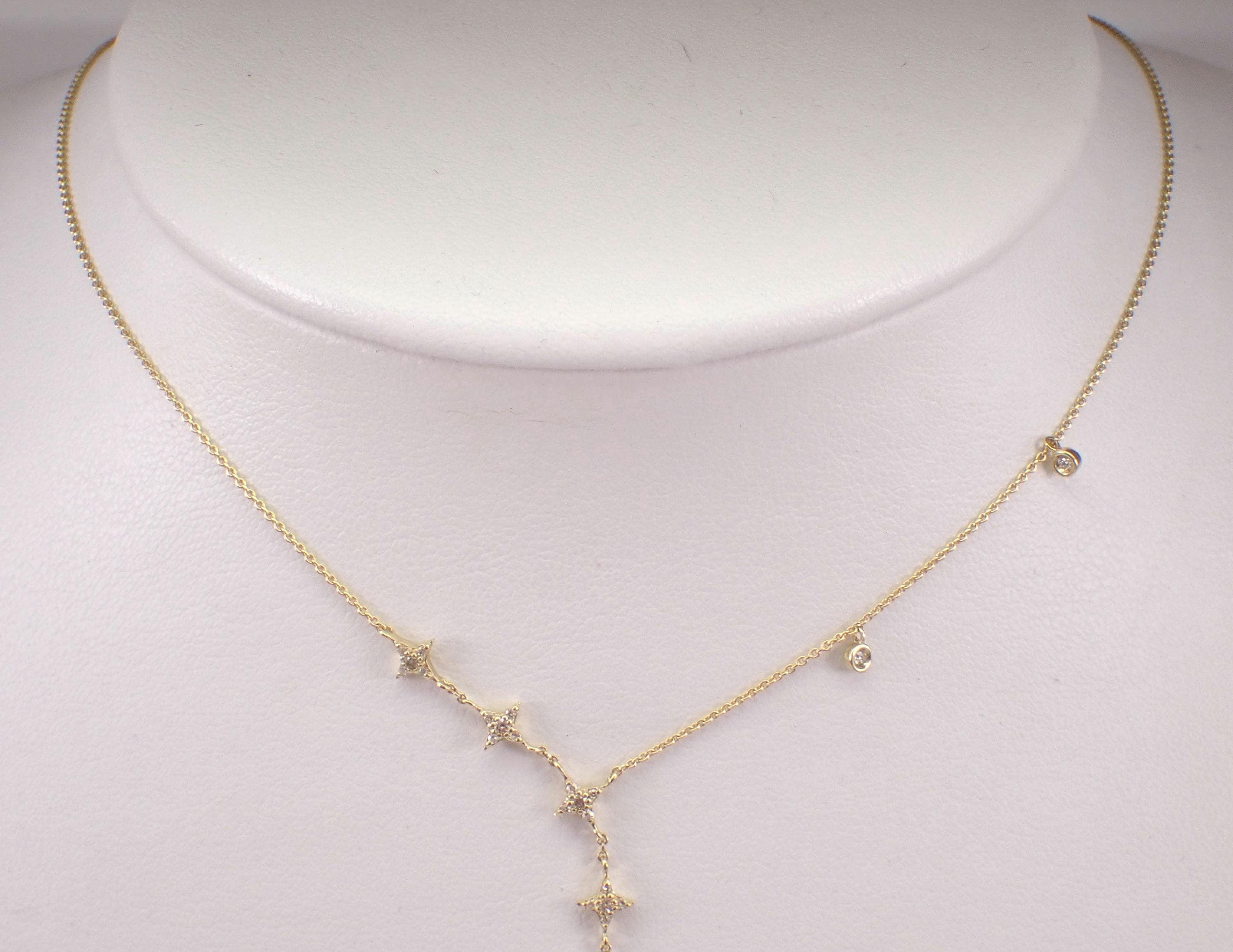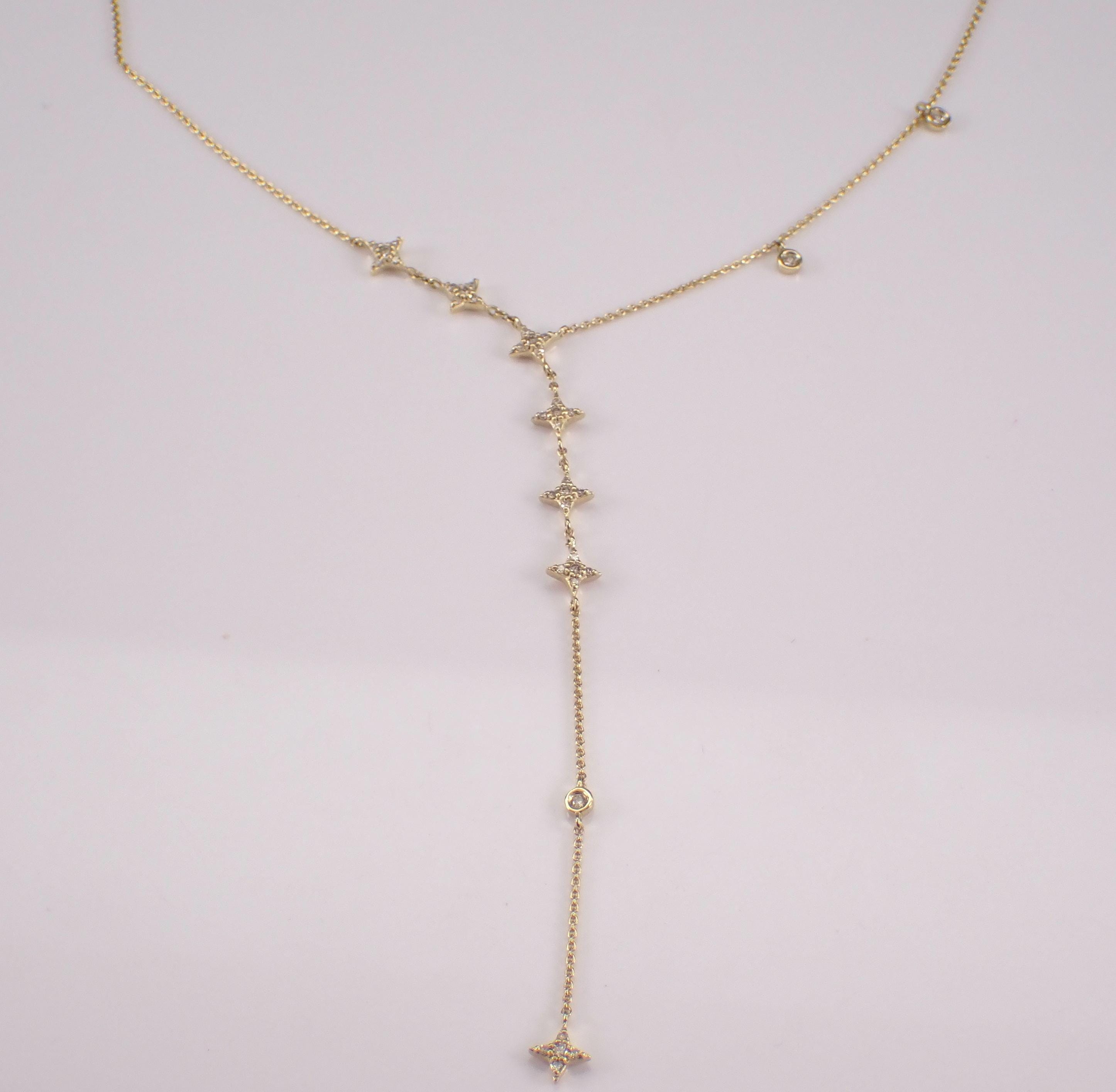 Yellow Gold Diamond LARIAT Star Necklace. This necklace is set with thirty-eight genuine natural round brilliant diamonds. These diamonds are H color, SI/I1 clarity and weigh a total of 1/4 carat. This necklace is 10KT Yellow Gold, measures 16" in length overall (has a 3" adjustment loop) and the lariat measures 3" in length. This necklace weighs 2.4 grams and will be accompanied by an appraisal written by a GIA Certified Diamond Grader with the retail replacement value of $1,495.00. I will ship this necklace promptly in a beautiful gift box.