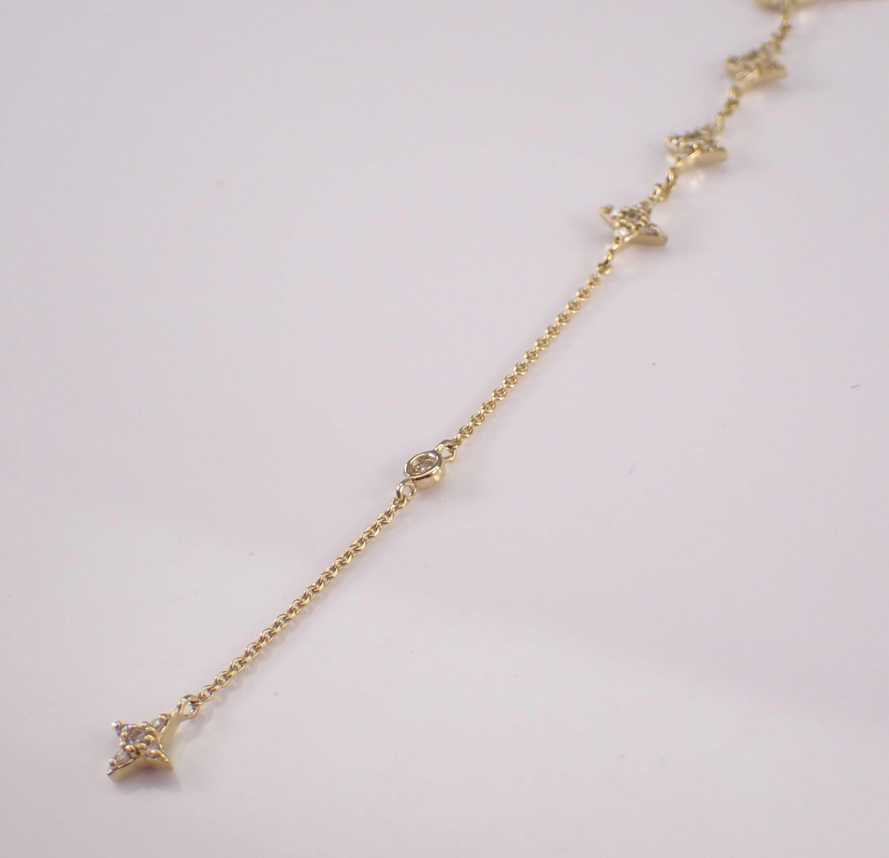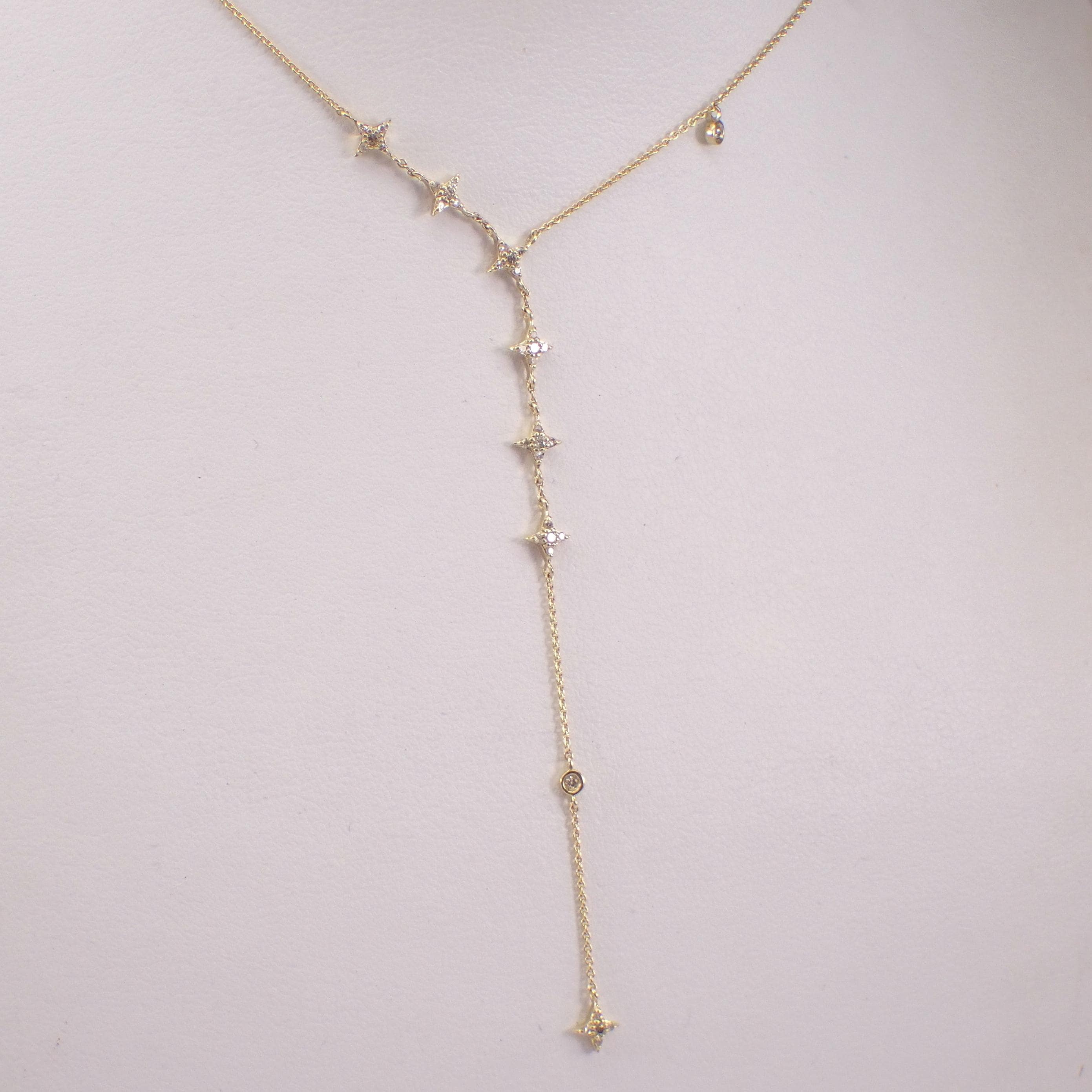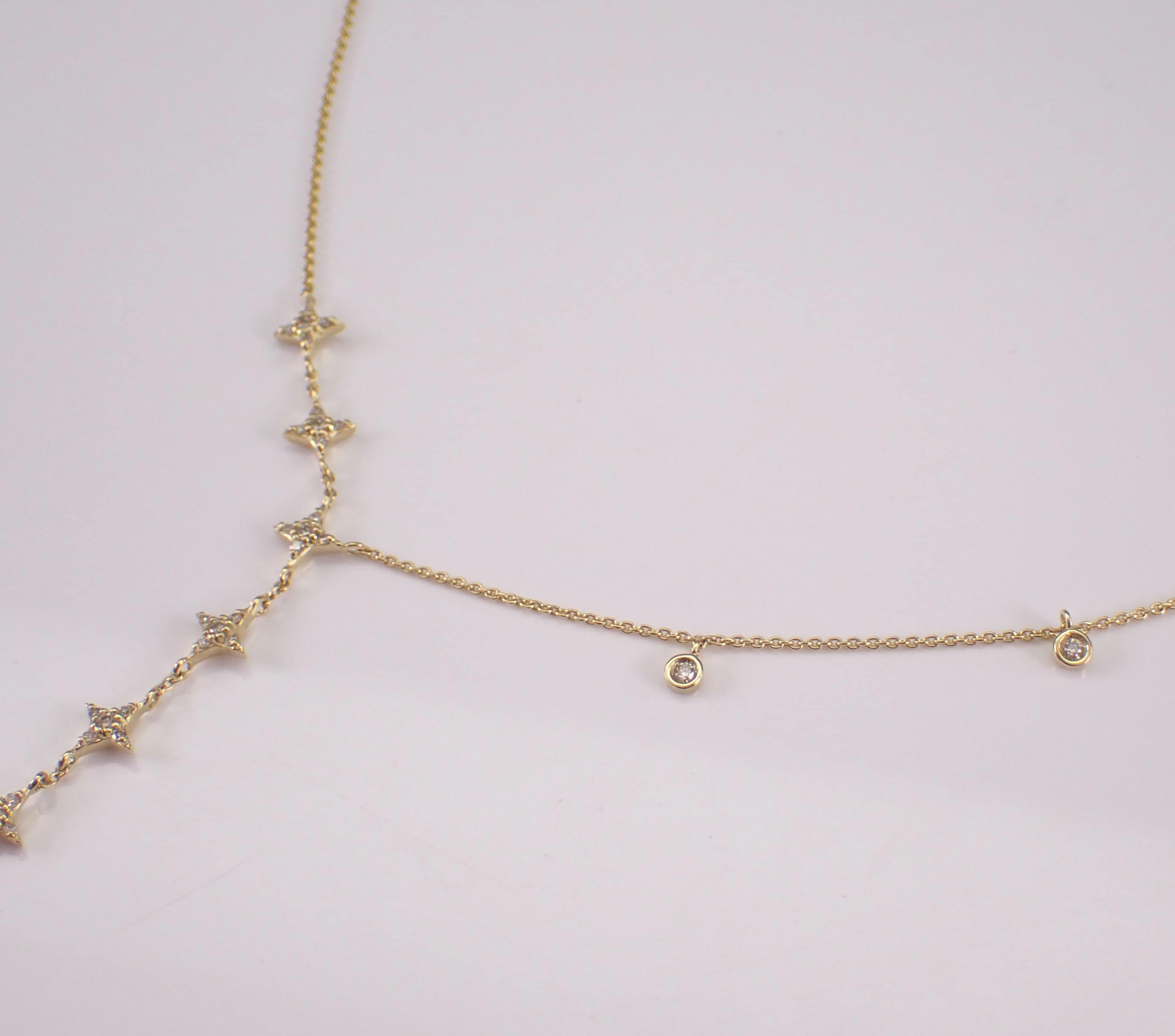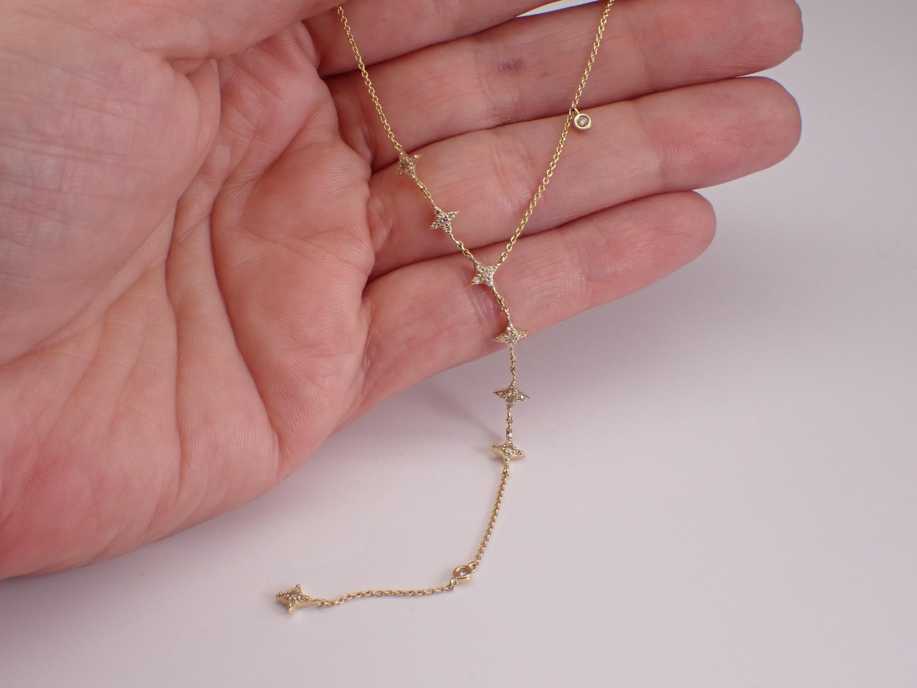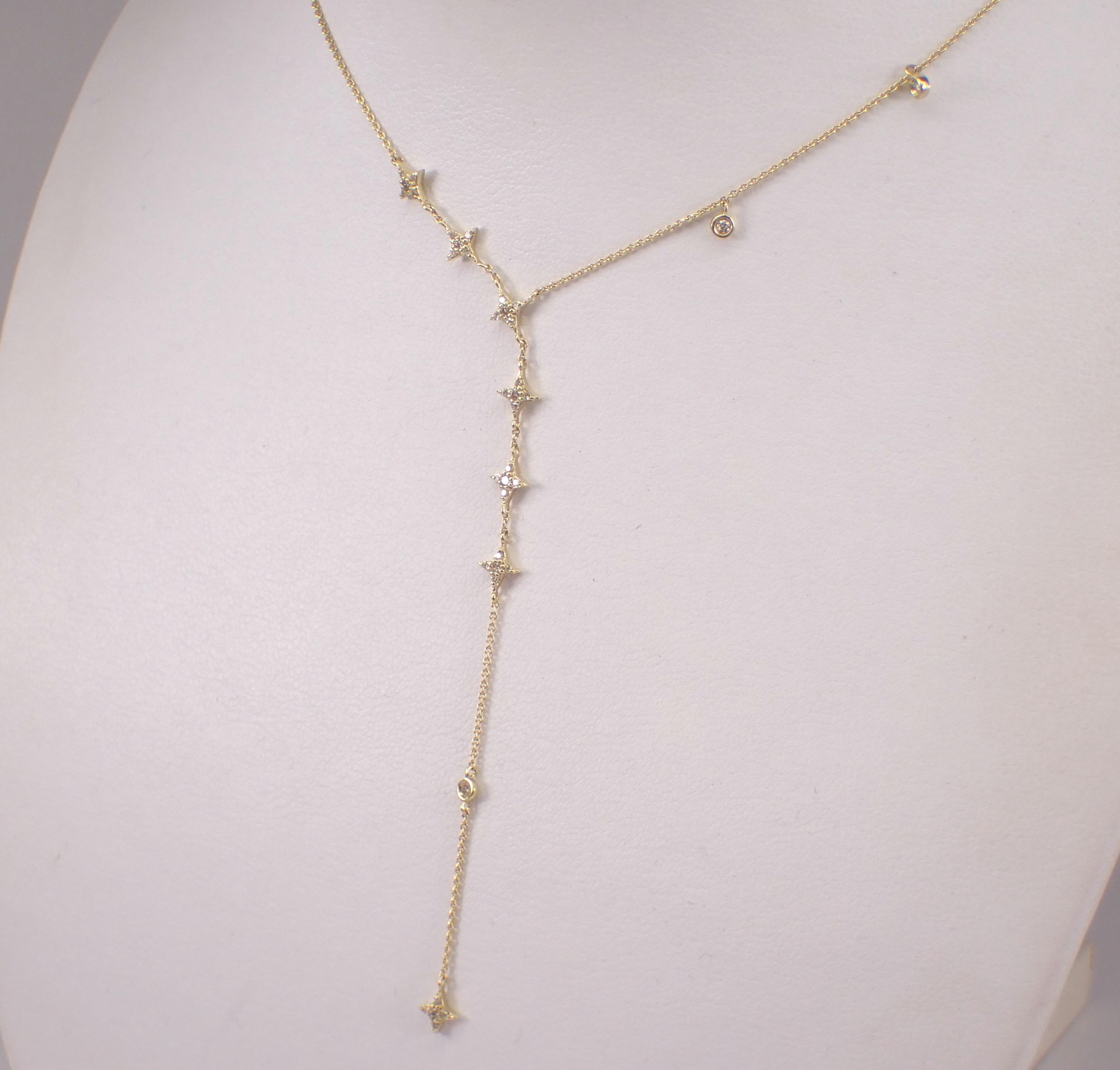Yellow Gold Diamond LARIAT Star Necklace. This necklace is set with thirty-eight genuine natural round brilliant diamonds. These diamonds are H color, SI/I1 clarity and weigh a total of 1/4 carat. This necklace is 10KT Yellow Gold, measures 16" in length overall (has a 3" adjustment loop) and the lariat measures 3" in length. This necklace weighs 2.4 grams and will be accompanied by an appraisal written by a GIA Certified Diamond Grader with the retail replacement value of $1,495.00. I will ship this necklace promptly in a beautiful gift box.