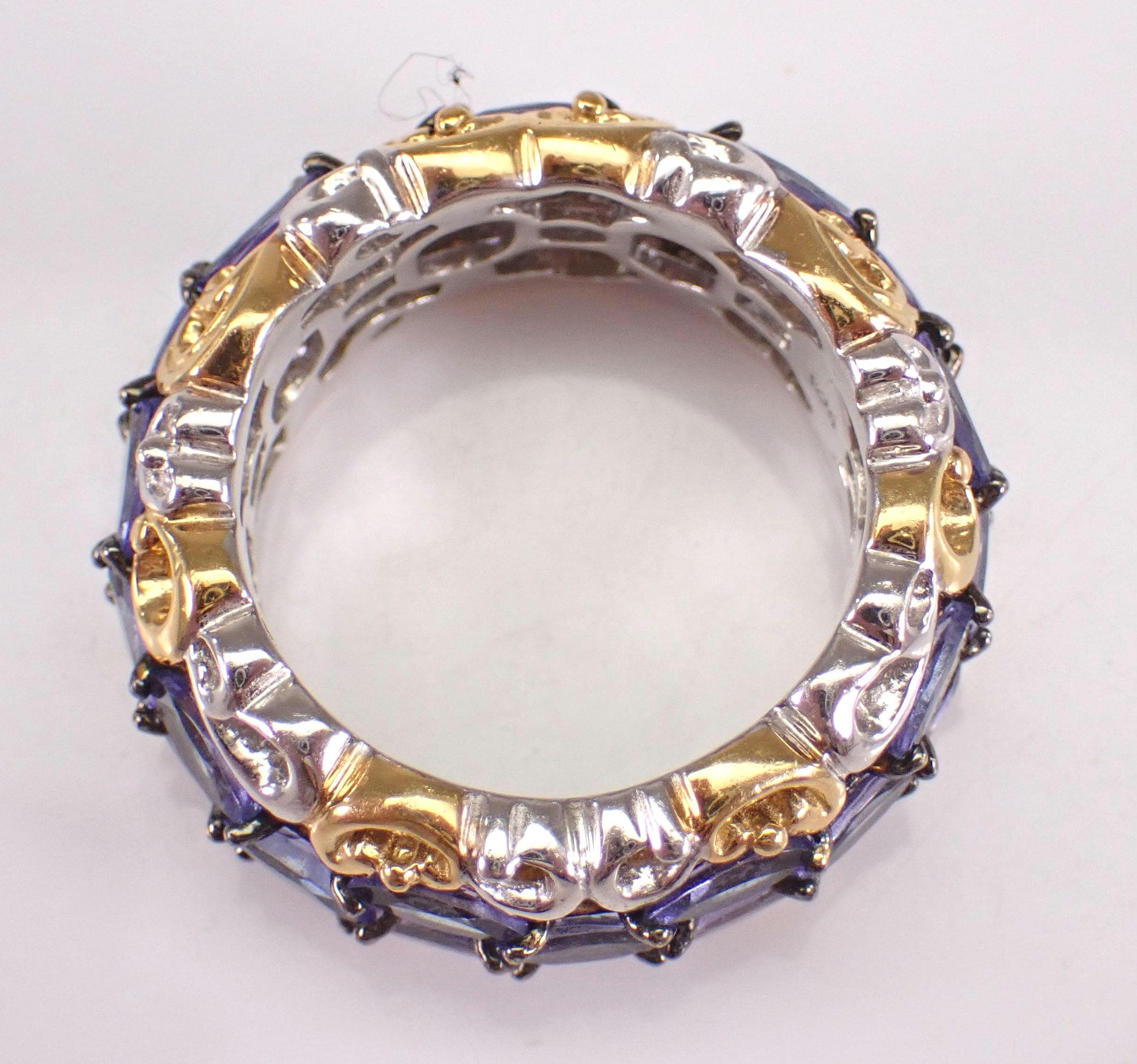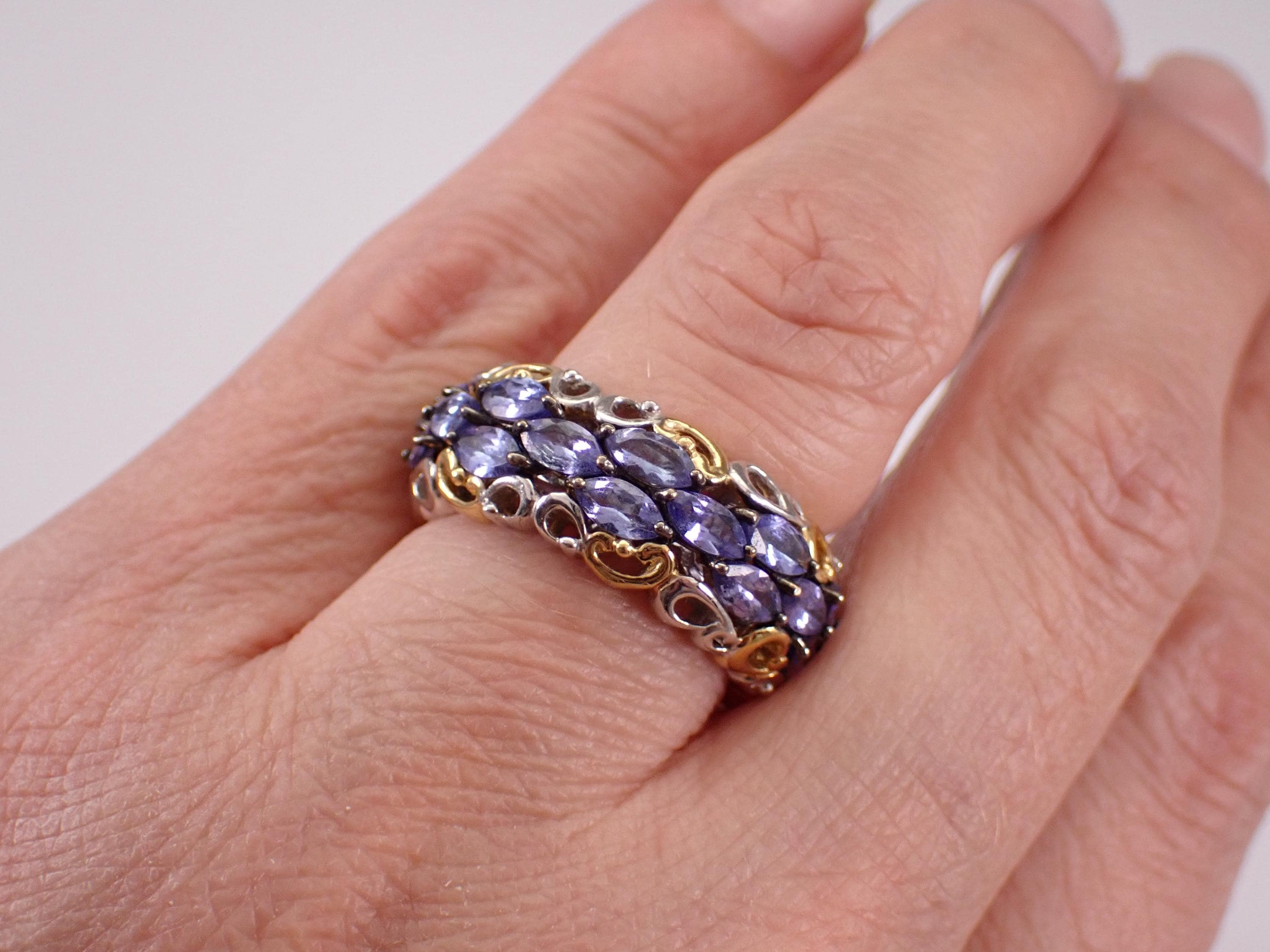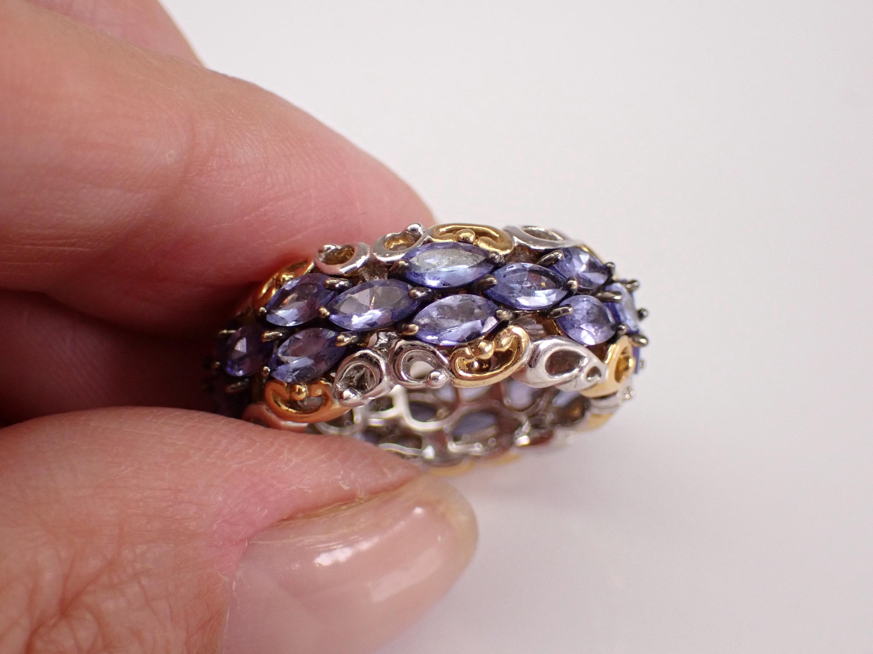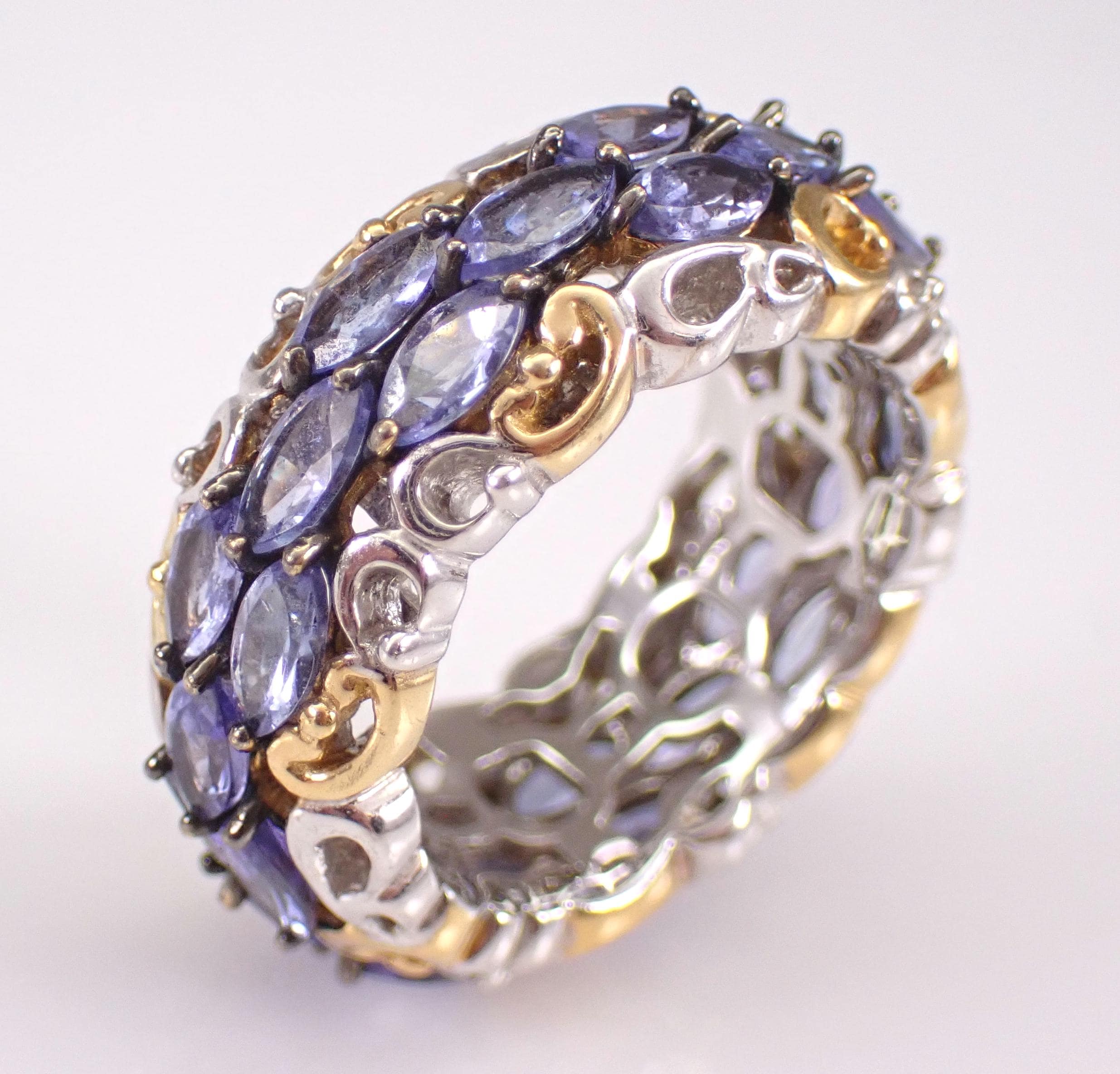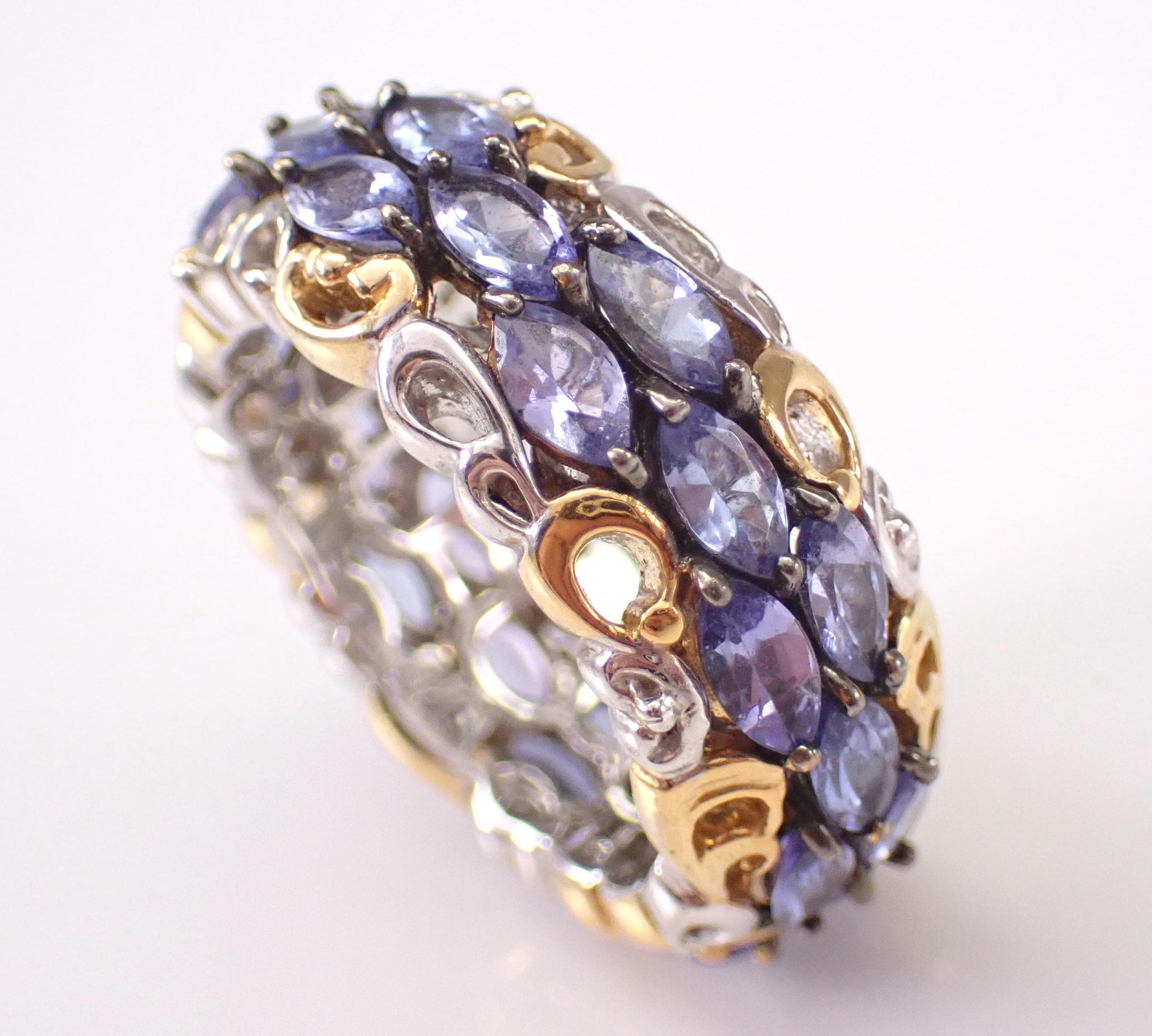 Beautiful Vintage Sterling Silver Tanzanite Eternity Band. There are twenty-seven genuine Marquise Tanzanite set throughout this ring. These Tanzanite weigh a total of 2 1/2 carats. This ring weighs 8.5 grams, measures 9 mm in width and is a finger size 7. I will ship this ring promptly in a gift pouch.