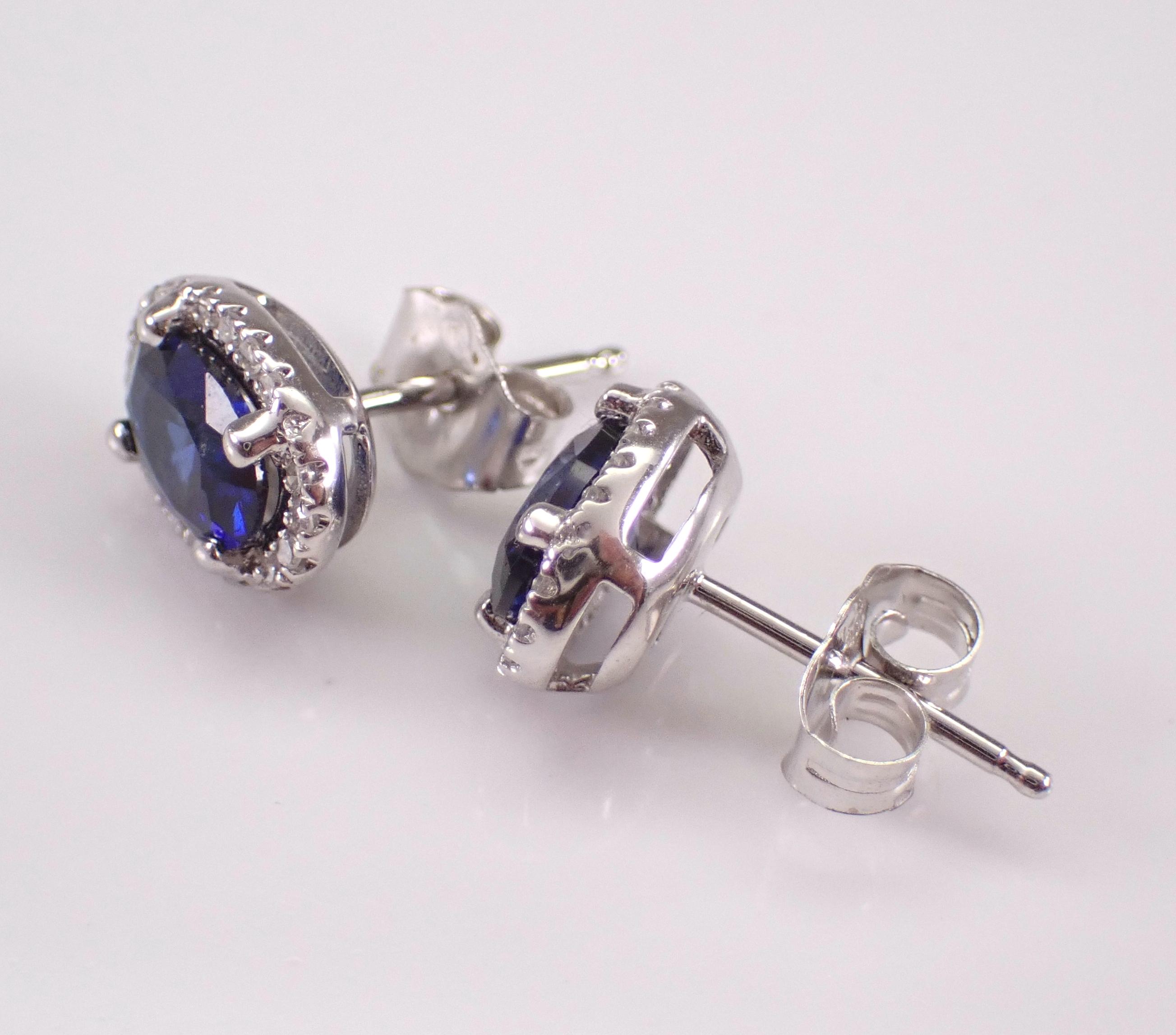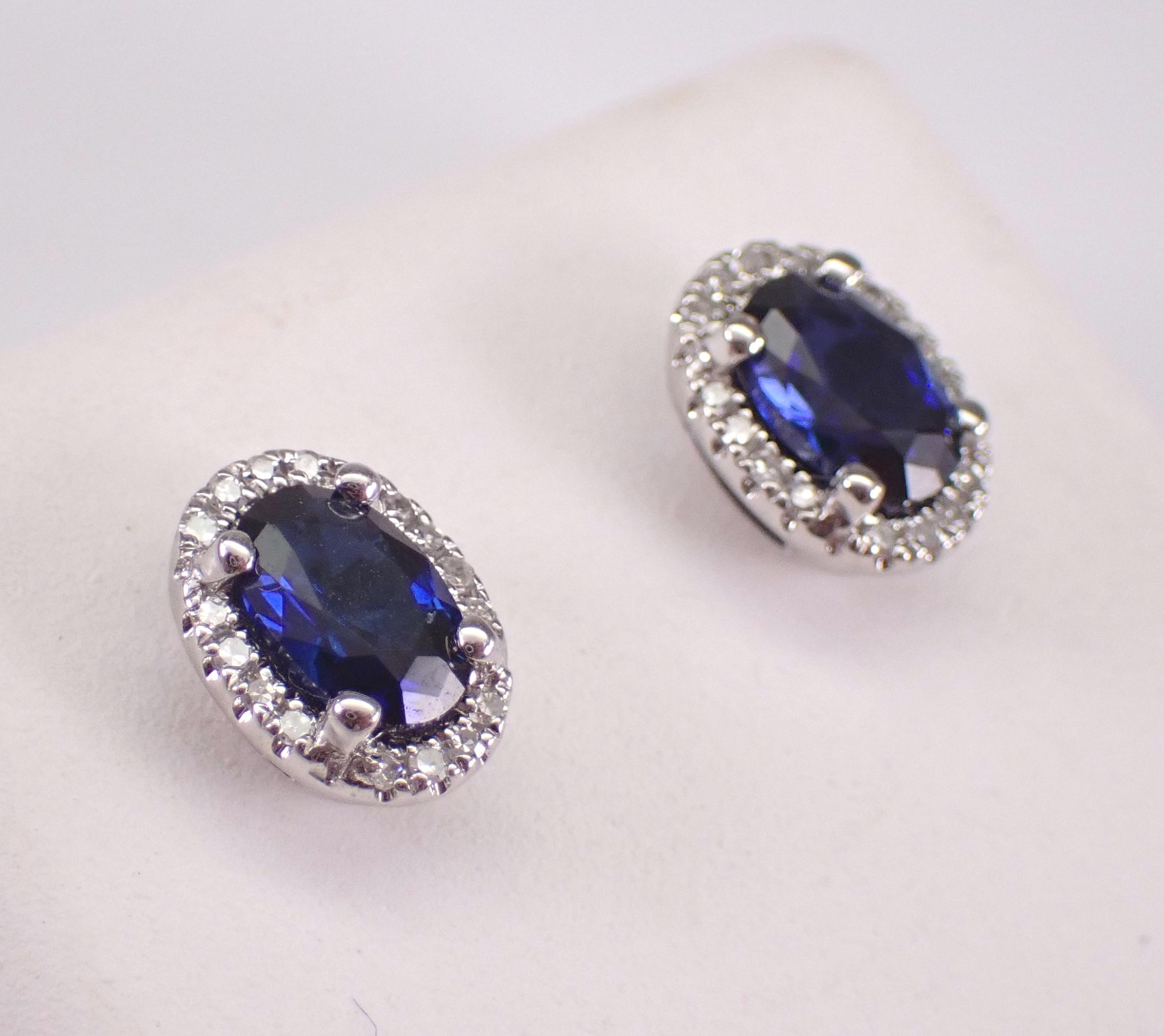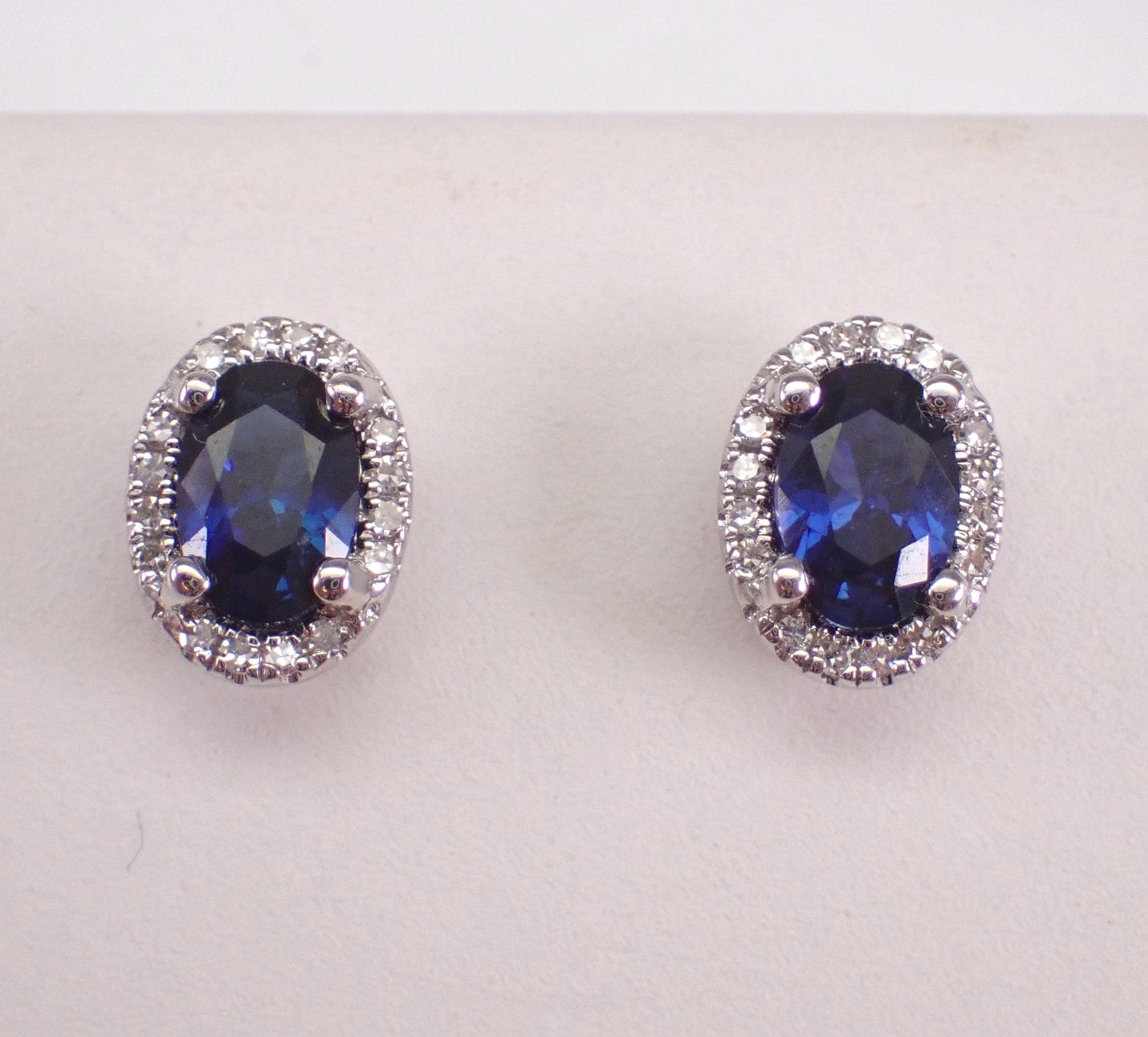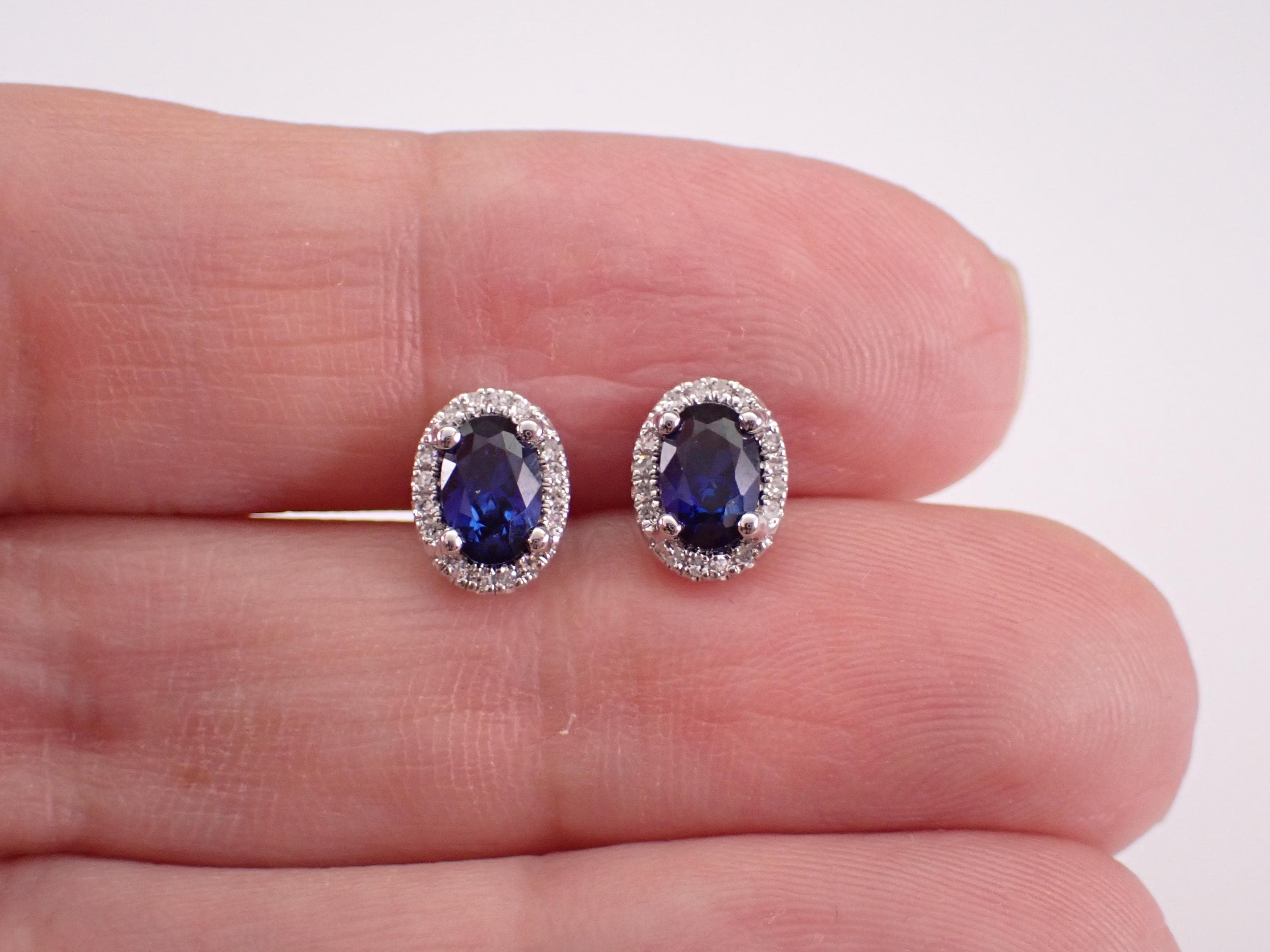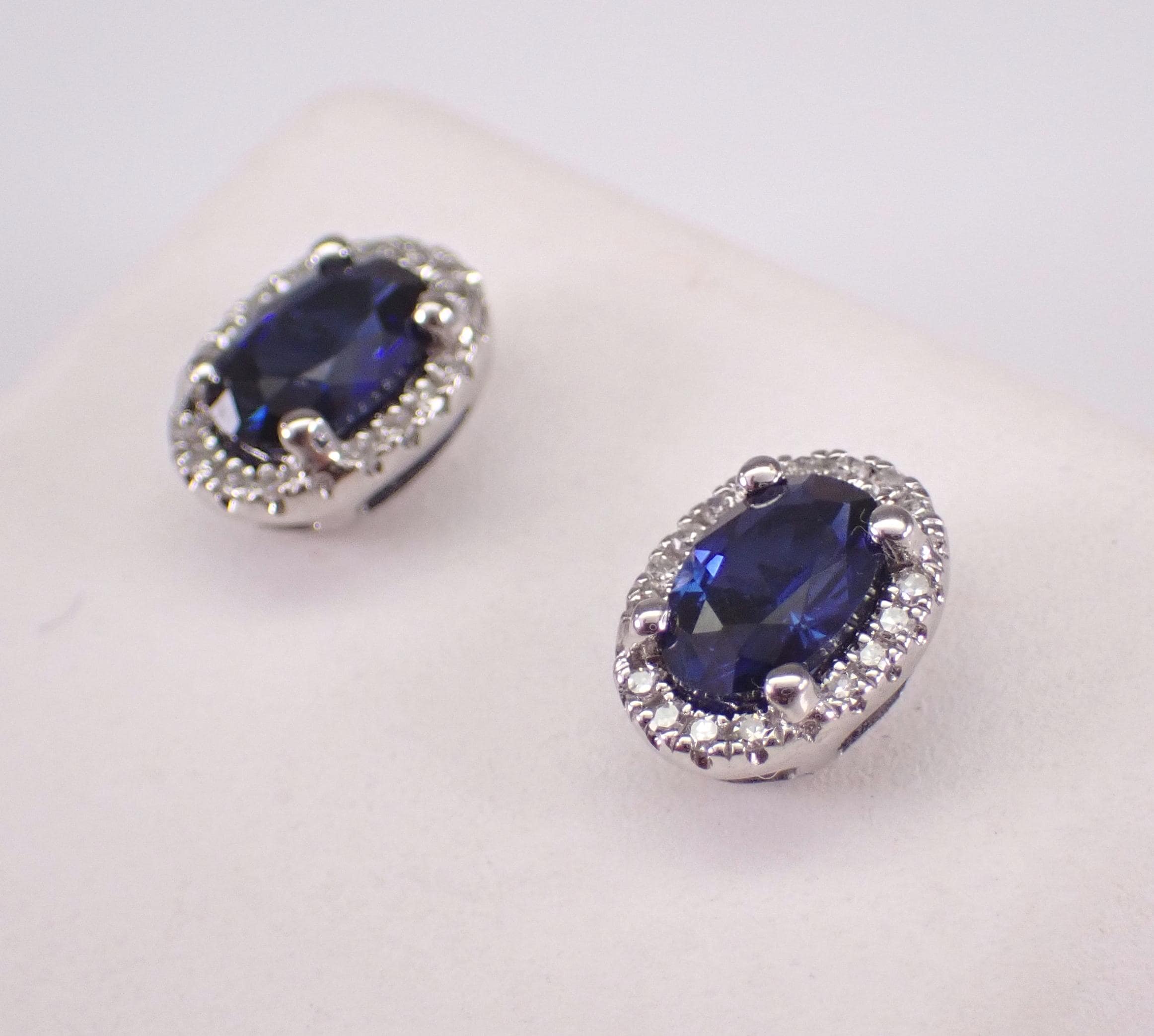 14K White Gold Diamond and Sapphire Stud Earrings. These earrings are set with a genuine Oval Sapphire in each earring. These Sapphires measure 5.5 X 3.5 mm each and weigh a total of 3/4 carat. There are thirty-two natural Round Brilliant Diamonds set in these earrings. These Diamonds are H color, I1 clarity and amount to a total weight of .20 carat. These earrings weigh 1.4 grams and measure 8 X 6 mm each. These earrings are for pierced ears and the earrings have friction post backs. These earrings will be accompanied by an appraisal written by a GIA Certified Diamond Grader with the retail replacement value of $1,495.00. I will ship these earrings promptly in a gift box.