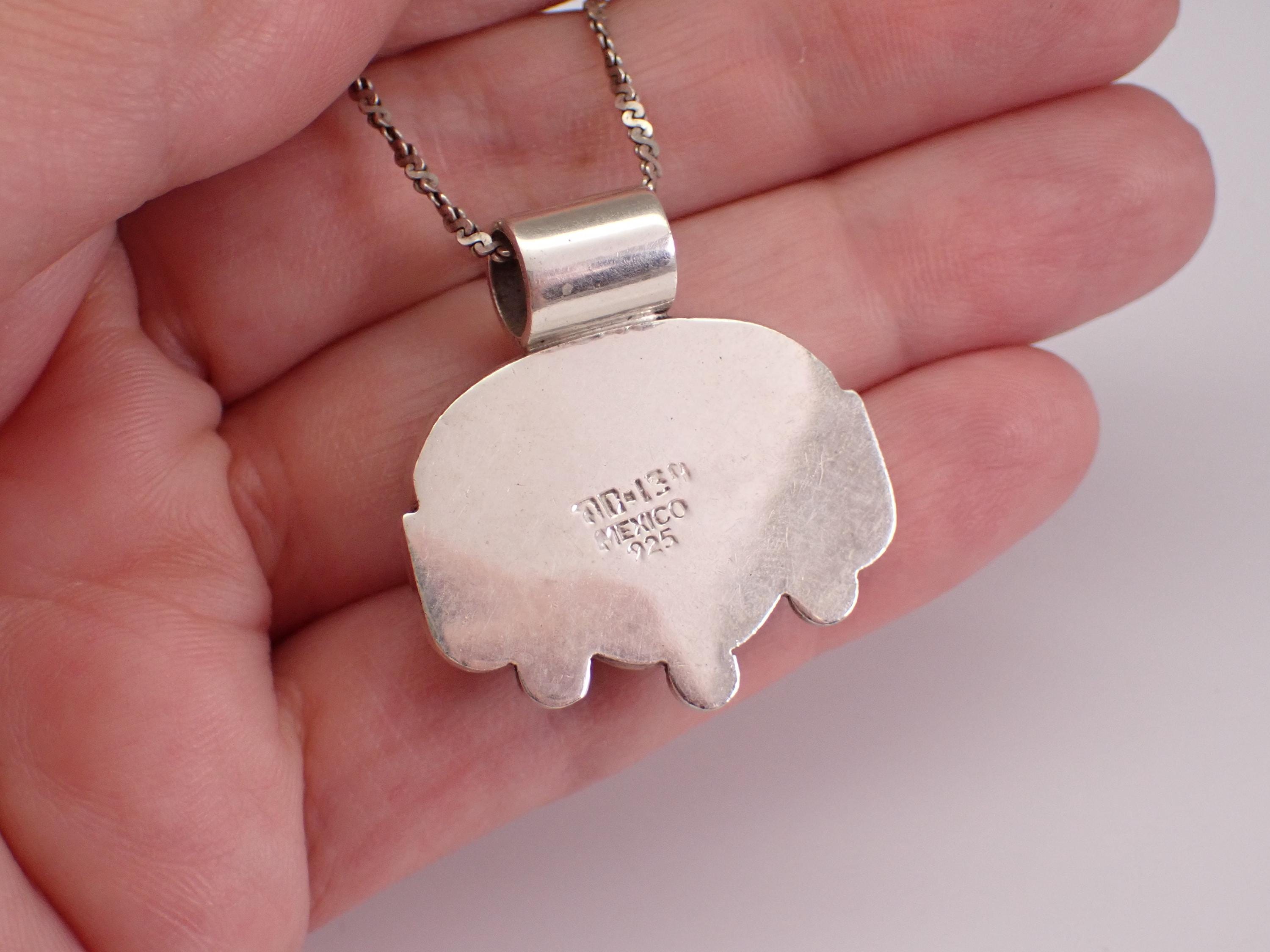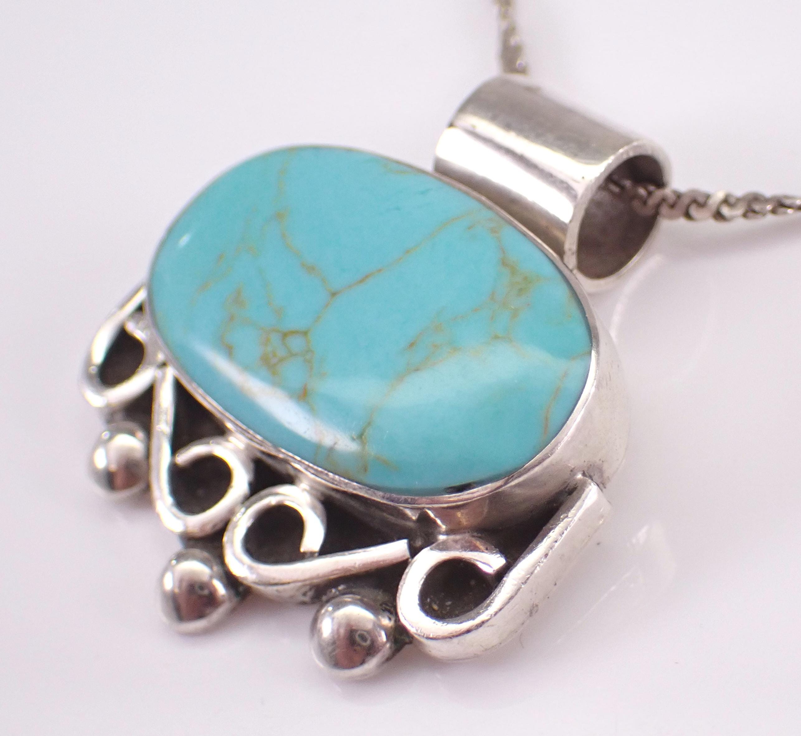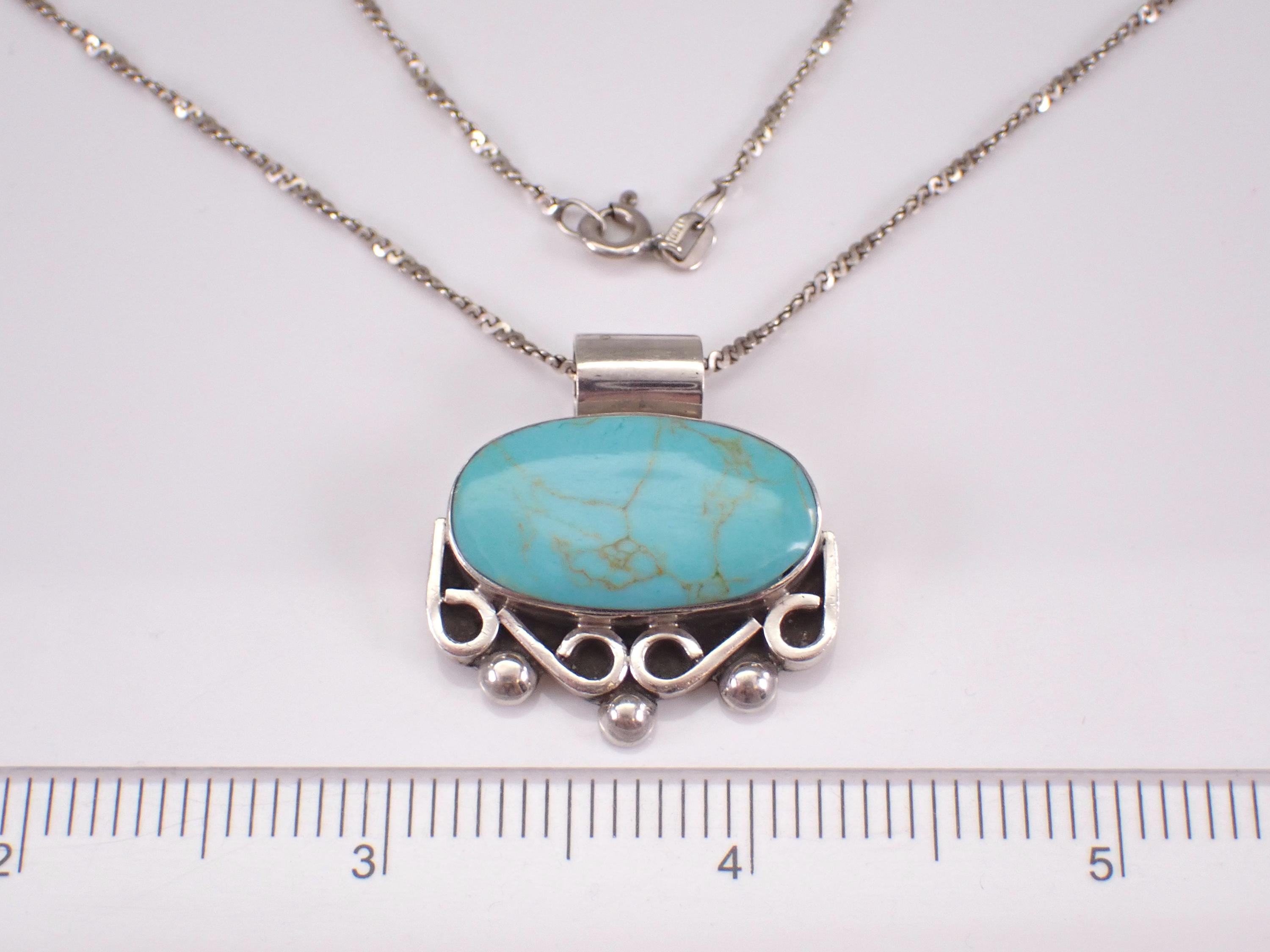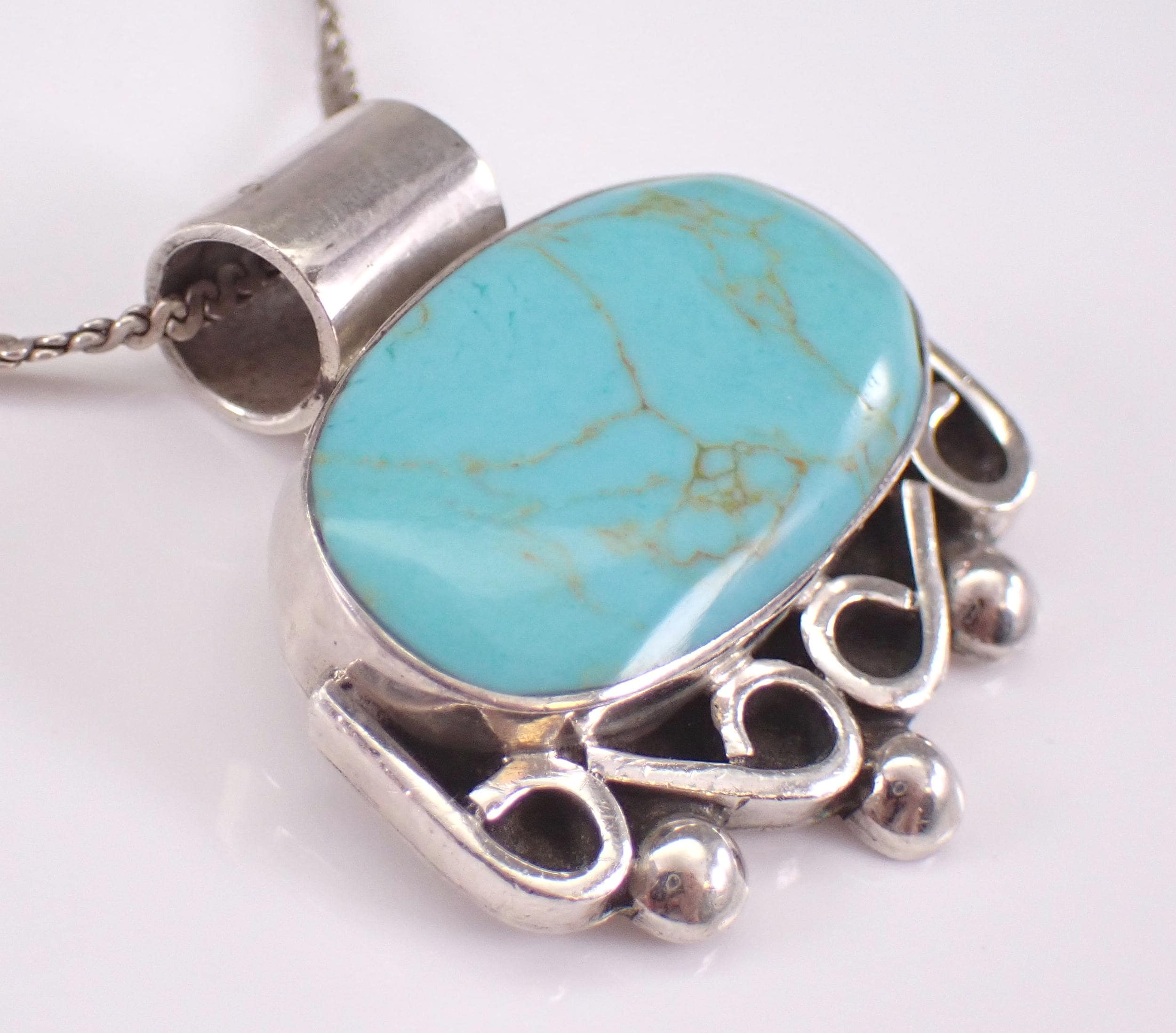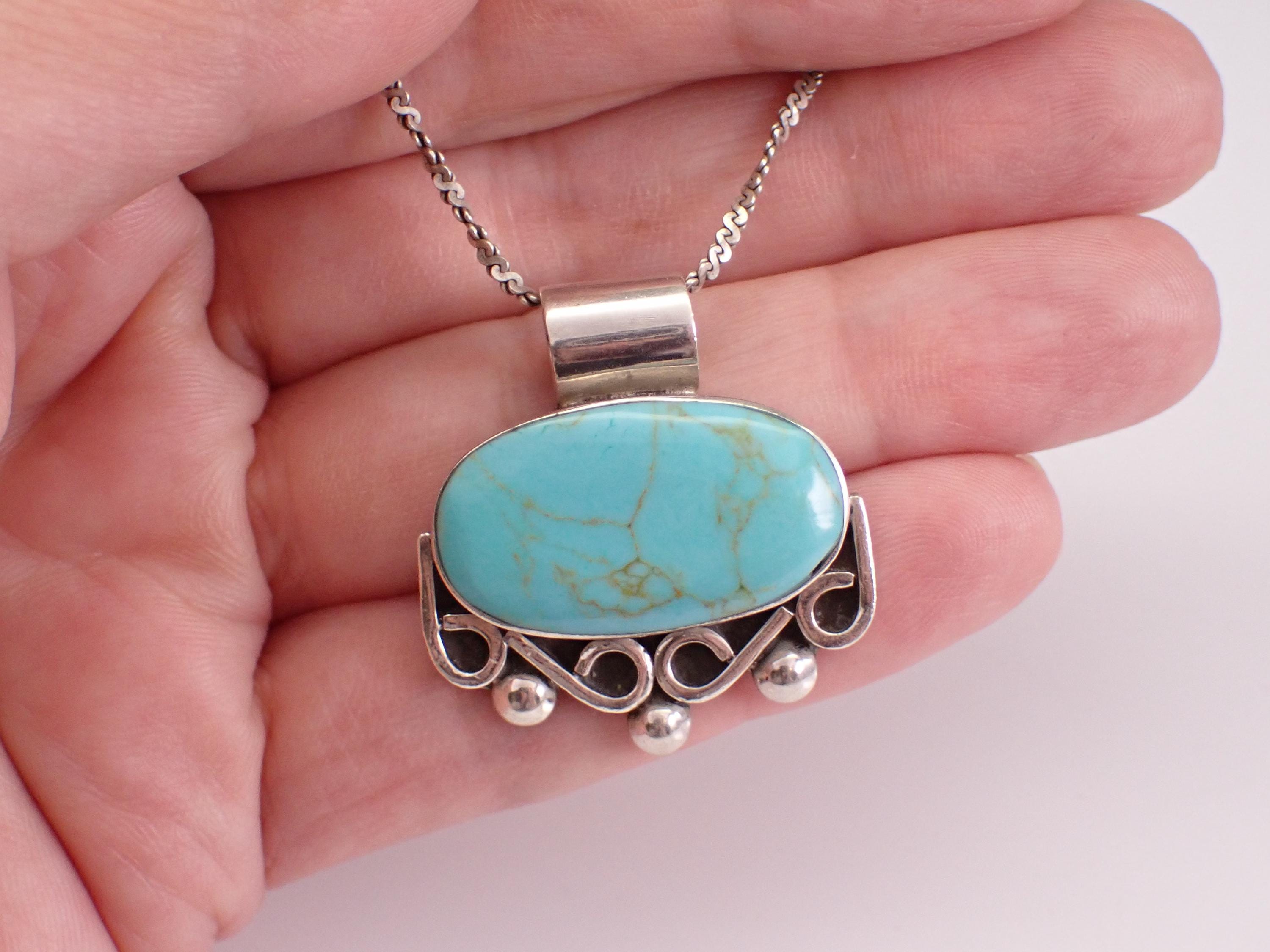 This necklace is set with a large genuine Turquoise in the center. This Turquoise measures 26 X 15 mm. This necklace measures 18" in length and weighs 19.0 grams. The slide pendant measures 31 X 29 mm with the bail. This necklace is a very unique vintage item, perfect gift for any occasion!