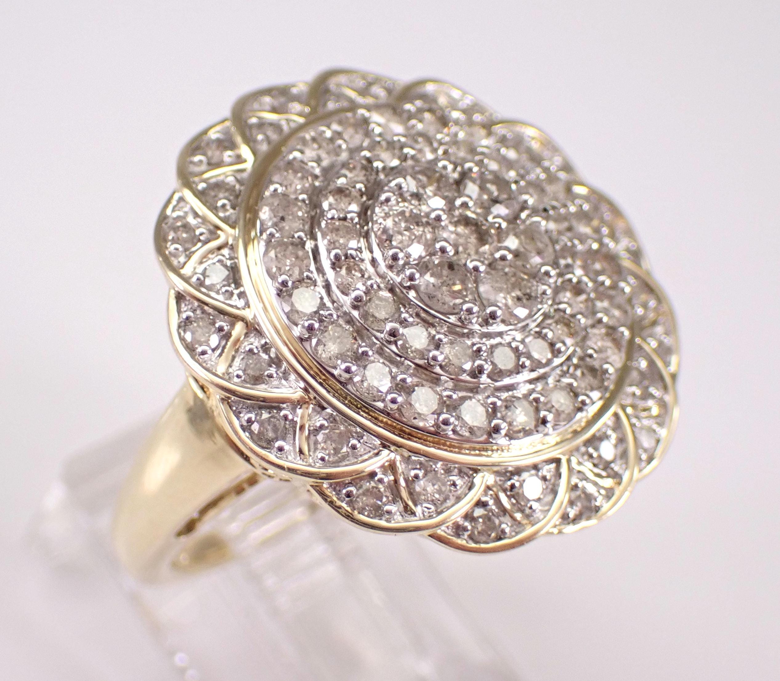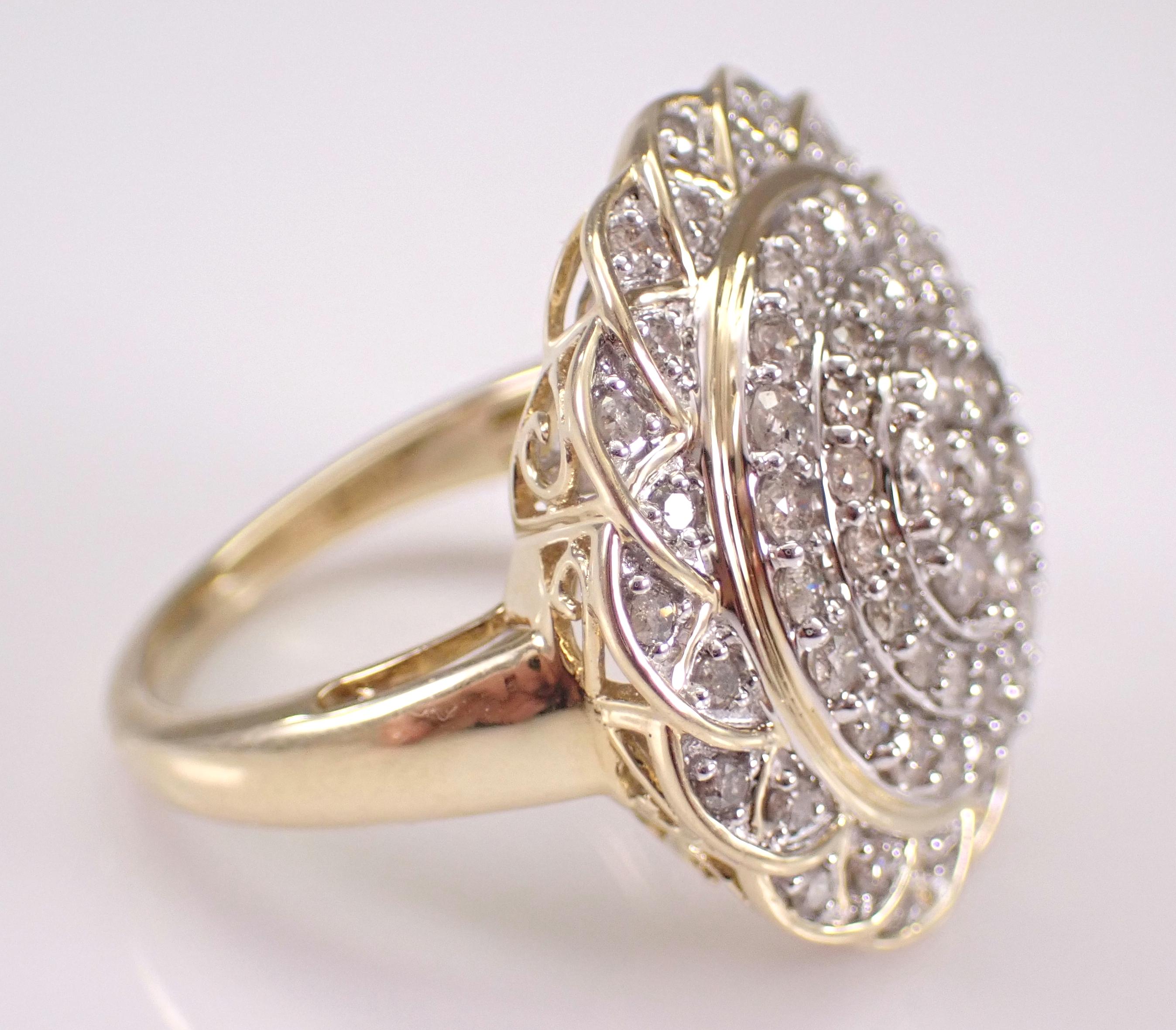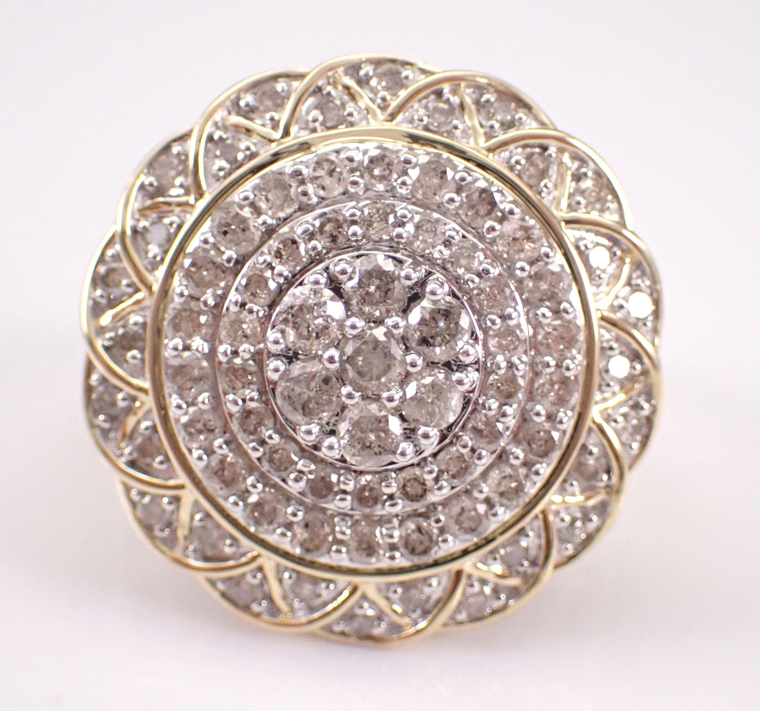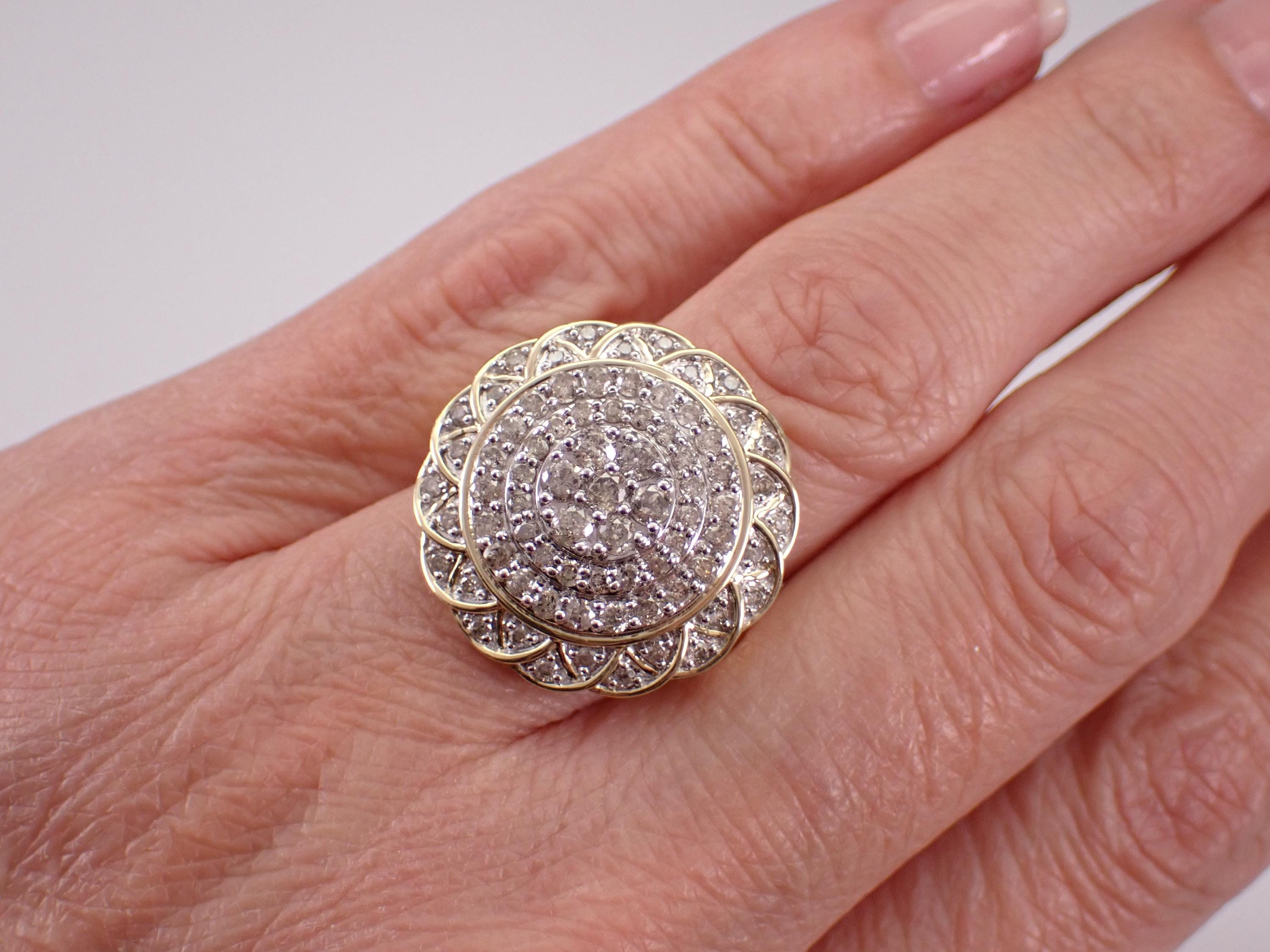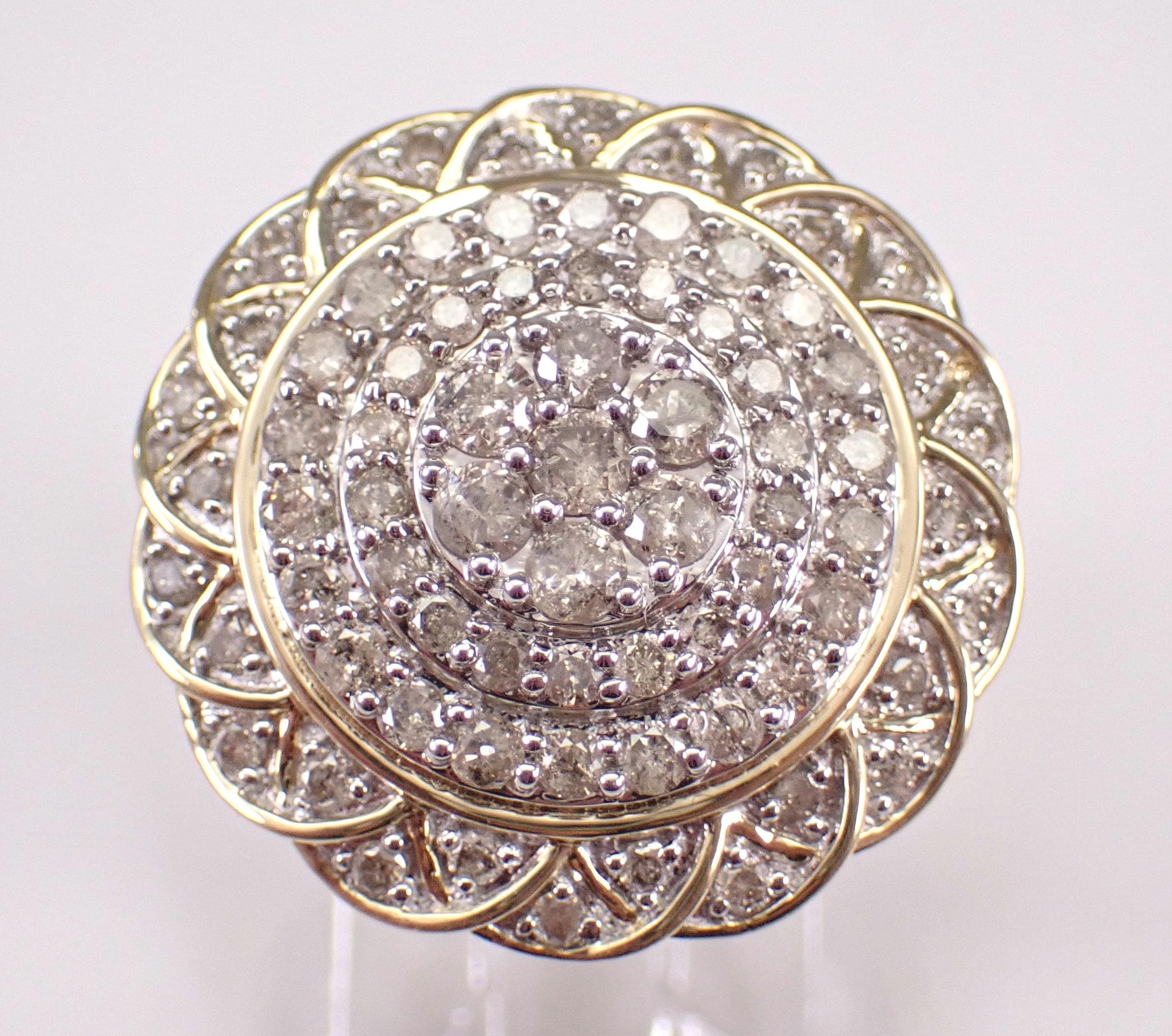 Solid Yellow Gold Diamond Cluster Ring. This ring is set with seventy-five genuine Round Brilliant Diamonds. These diamonds are H color, I1 clarity and weigh a total of 1.75 carats. This ring is 10KT Yellow and White Gold, weighs 6.0 grams, the top of this ring measures 22 mm in diameter and is a finger size 7 1/4, which can be resized free of charge (please inquire about sizing with the finger size that you need). This ring will be accompanied by an appraisal with the retail replacement value of $3,095.00. I will ship this ring promptly in a gift box.