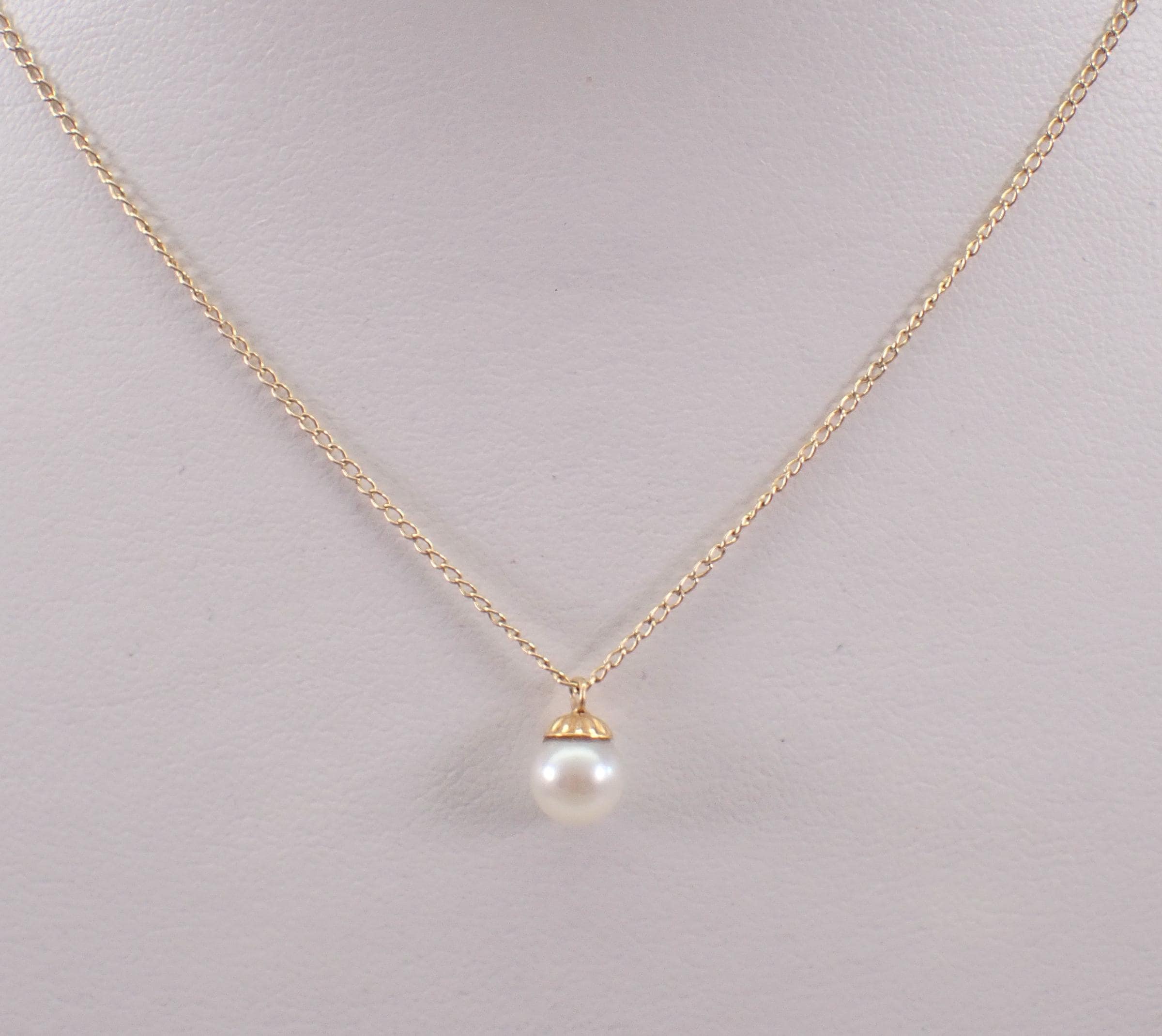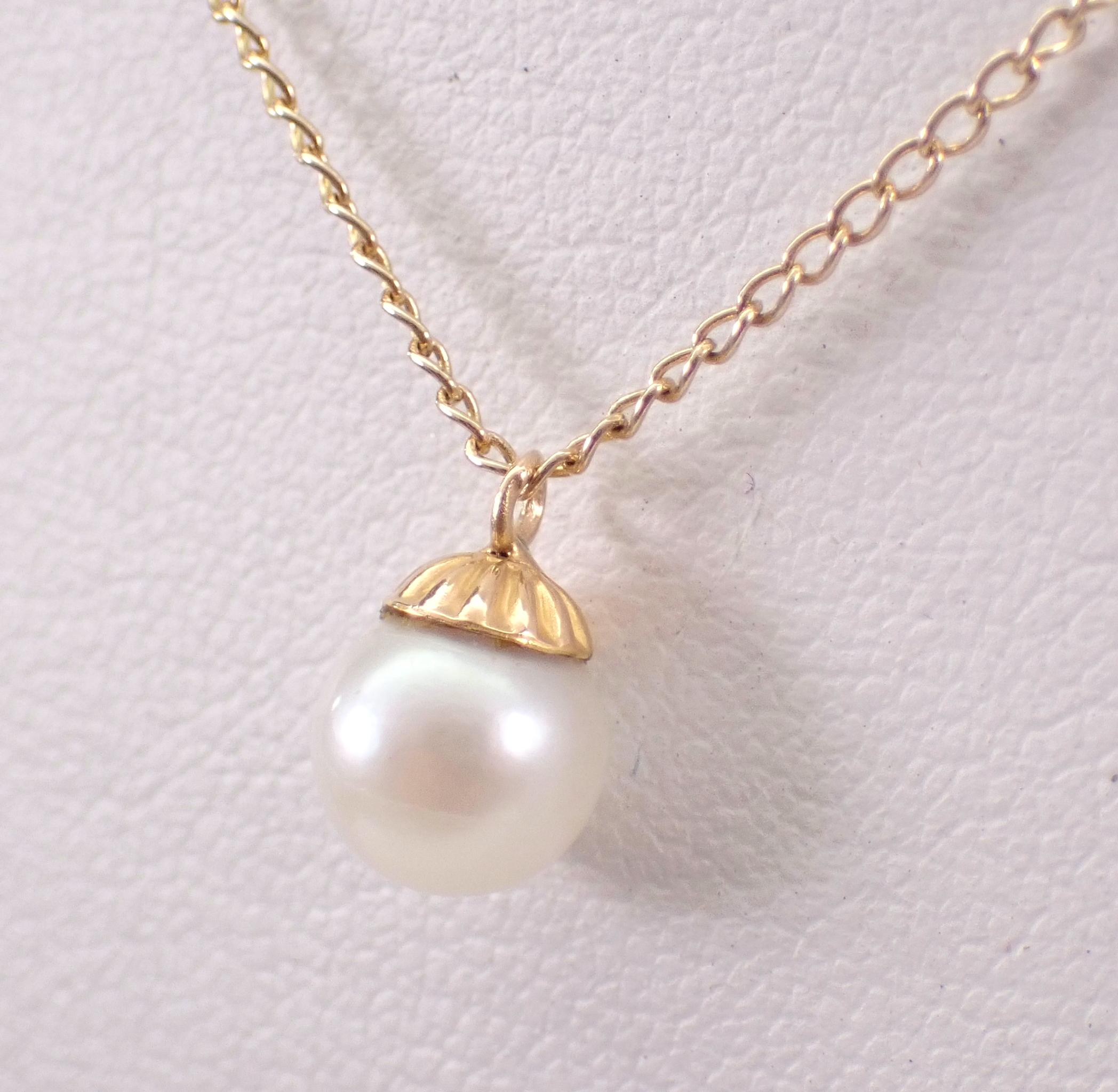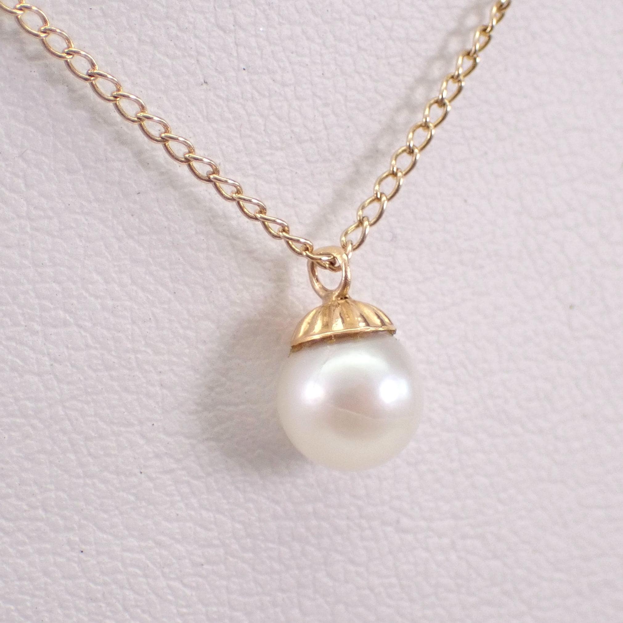 Vintage 14k Yellow Gold Pearl Solitaire Pendant Necklace with Chain. This pendant is set with one Cultured White Pearl dangling in the center. This pearl measures 7 mm in diameter. This pendant comes with a 15.5" 14KT Yellow Gold chain. The pendant and chain weigh a total of 1.9 grams. I will ship this necklace promptly in a beautiful gift box.