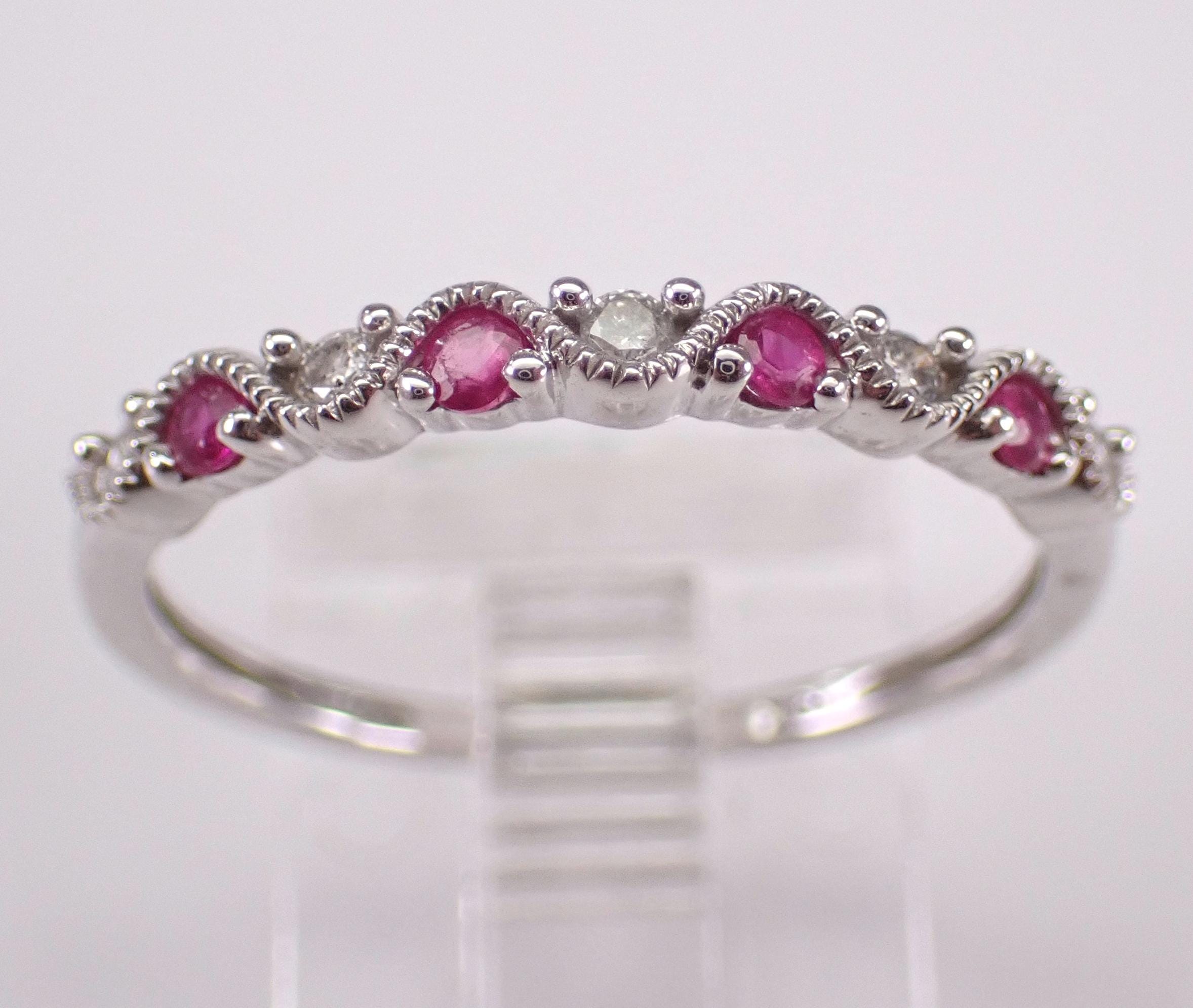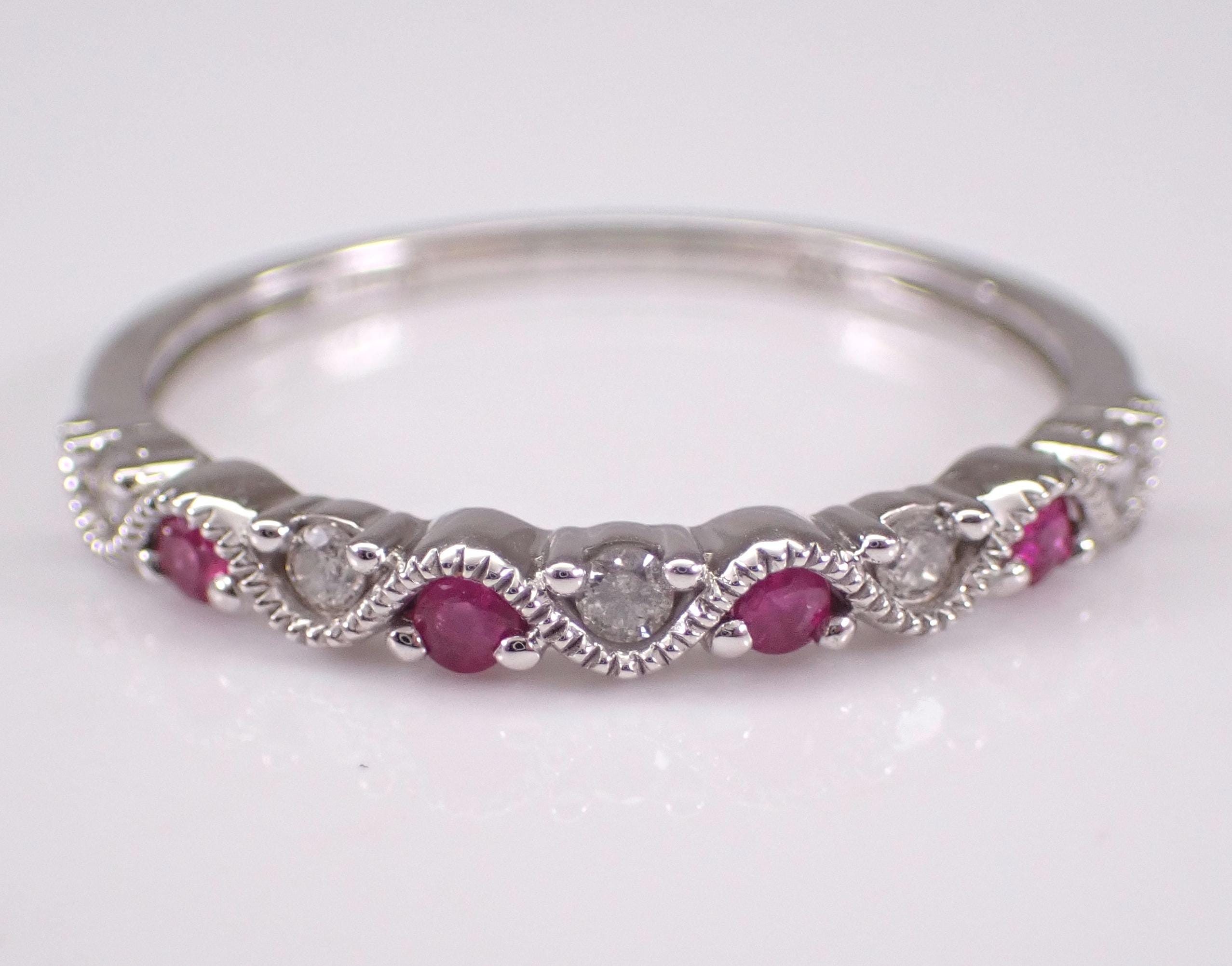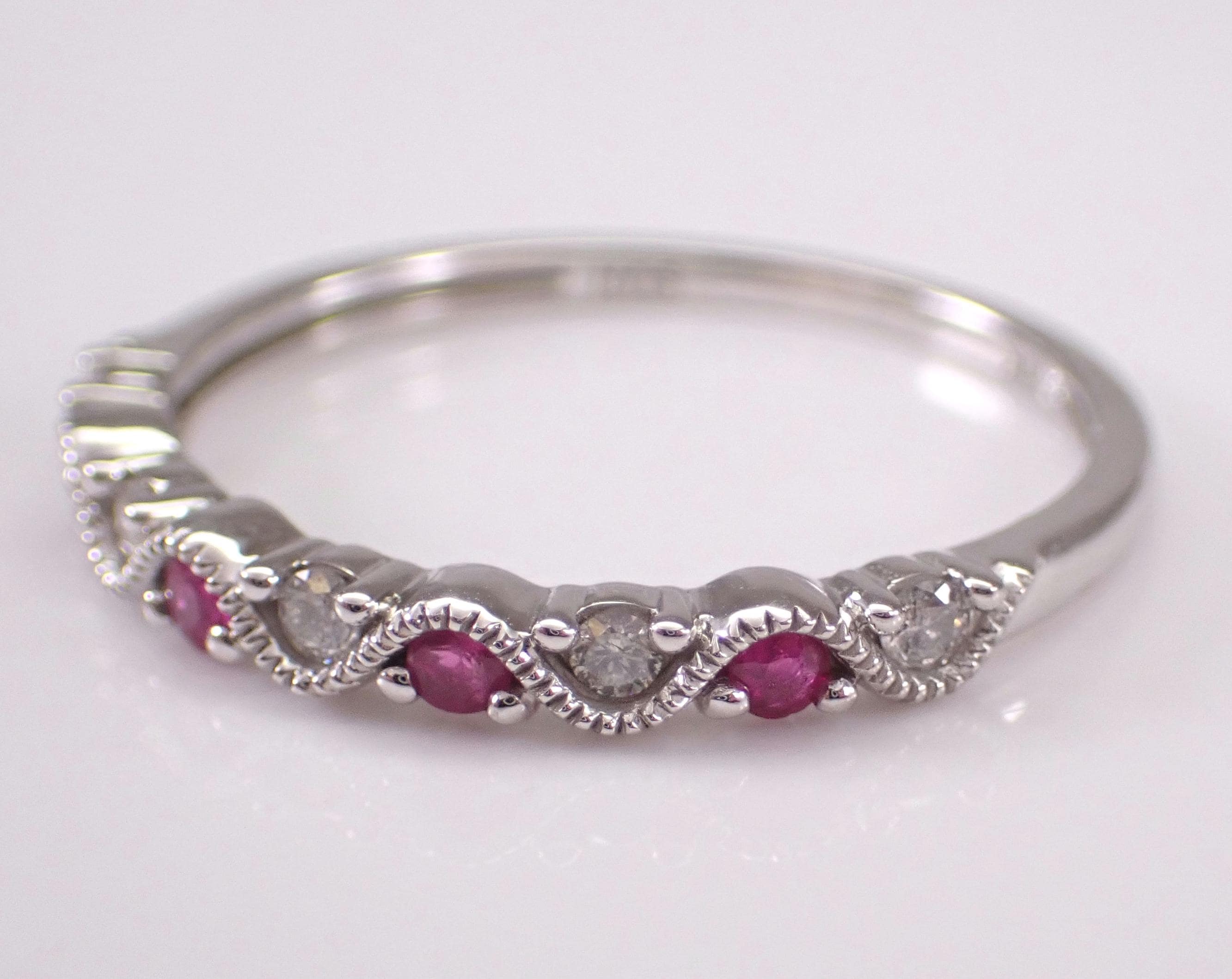 White Gold Diamond and Ruby Anniversary Band Wedding Ring. This ring is set with four genuine Round Rubies and five natural Round diamonds. These diamonds are G color, I clarity and weigh a total of .10 carat. The Rubies weigh a total of .10 carat. This ring is 10KT White Gold, weighs 1.4 grams, measures 2.5 mm in width and is a finger size 7, which can be resized (please inquire about sizing with the finger size you need). The ring will be accompanied by an appraisal by a GIA Certified Diamond Grader with the retail replacement value of $1,089.00. I will ship this ring promptly in a gift box.