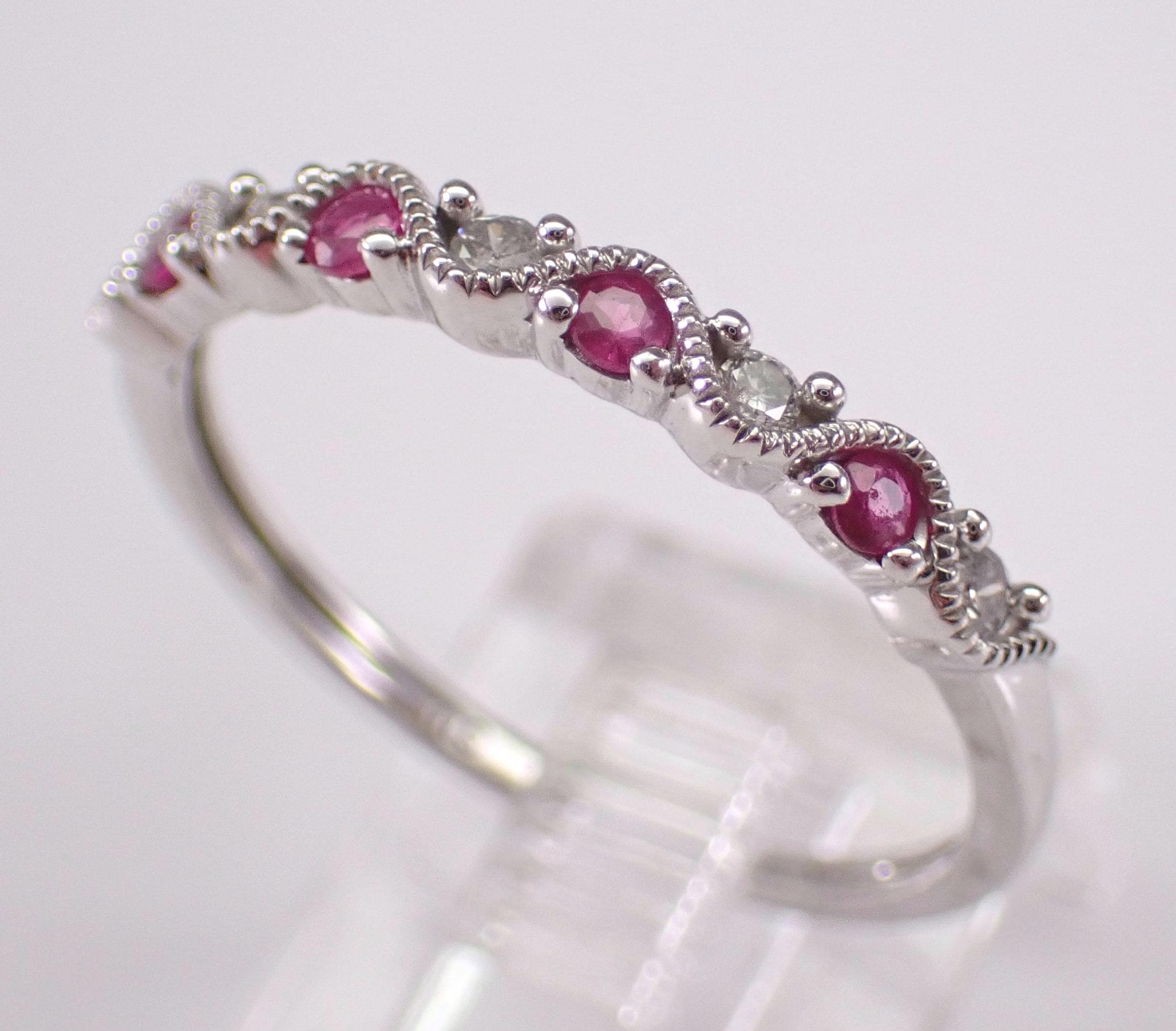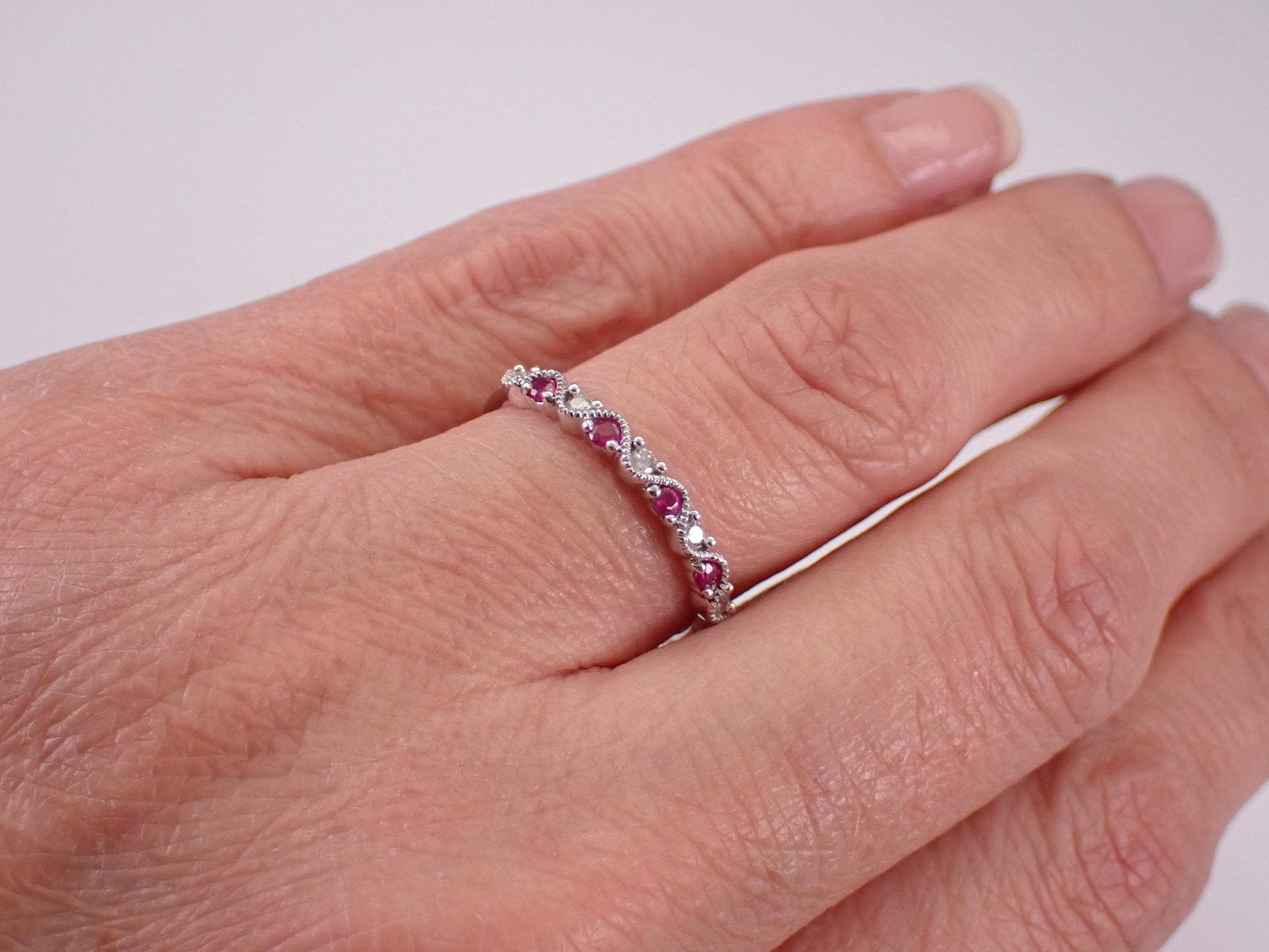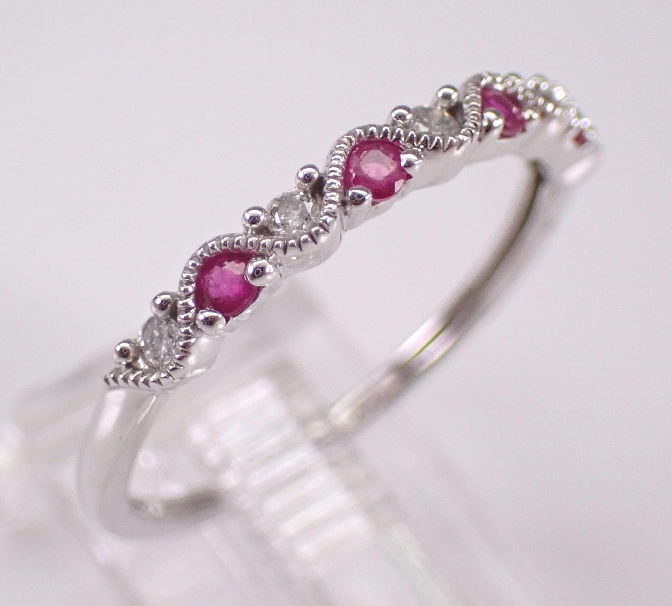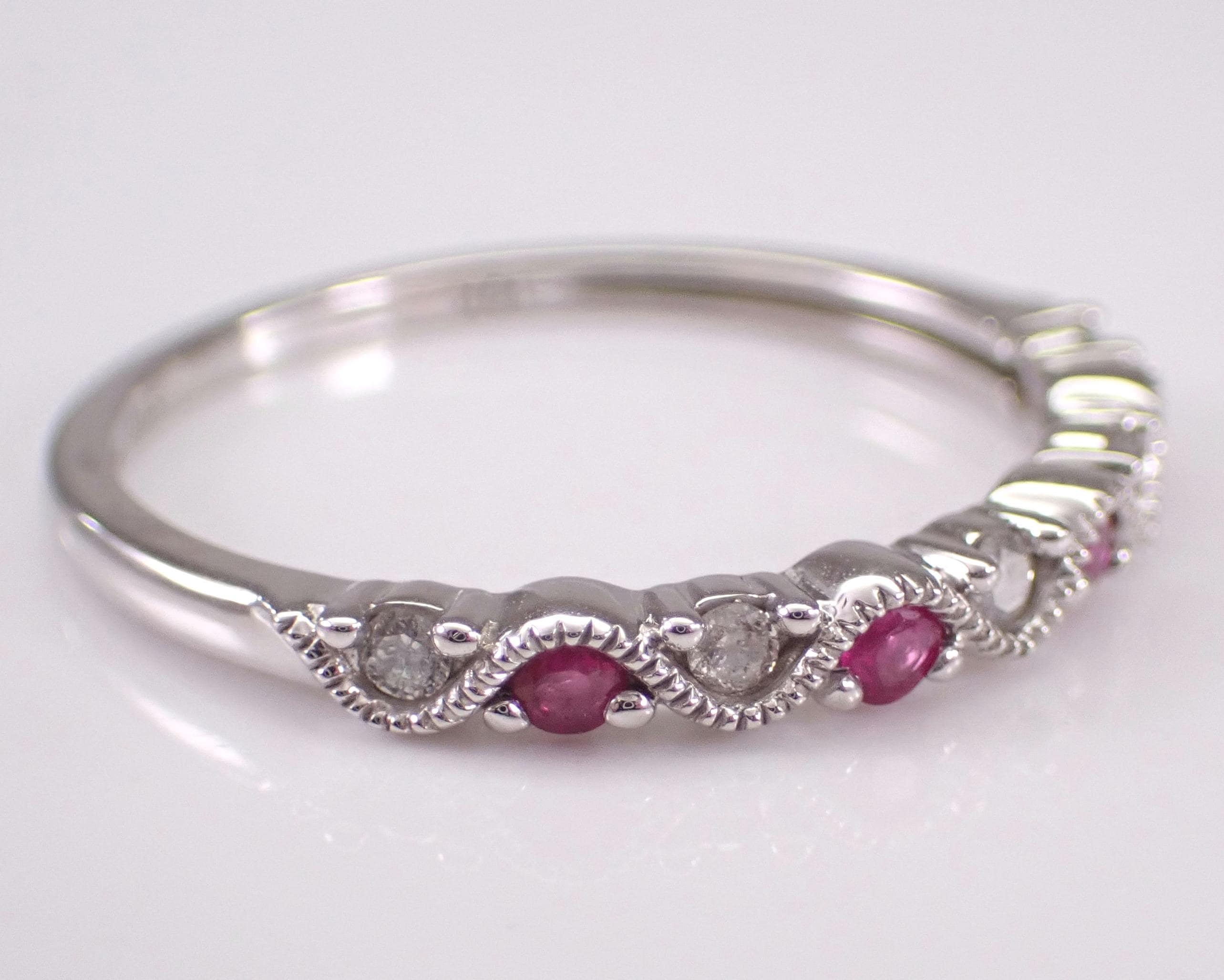 White Gold Diamond and Ruby Anniversary Band Wedding Ring. This ring is set with four genuine Round Rubies and five natural Round diamonds. These diamonds are G color, I clarity and weigh a total of .10 carat. The Rubies weigh a total of .10 carat. This ring is 10KT White Gold, weighs 1.4 grams, measures 2.5 mm in width and is a finger size 7, which can be resized (please inquire about sizing with the finger size you need). The ring will be accompanied by an appraisal by a GIA Certified Diamond Grader with the retail replacement value of $1,089.00. I will ship this ring promptly in a gift box.