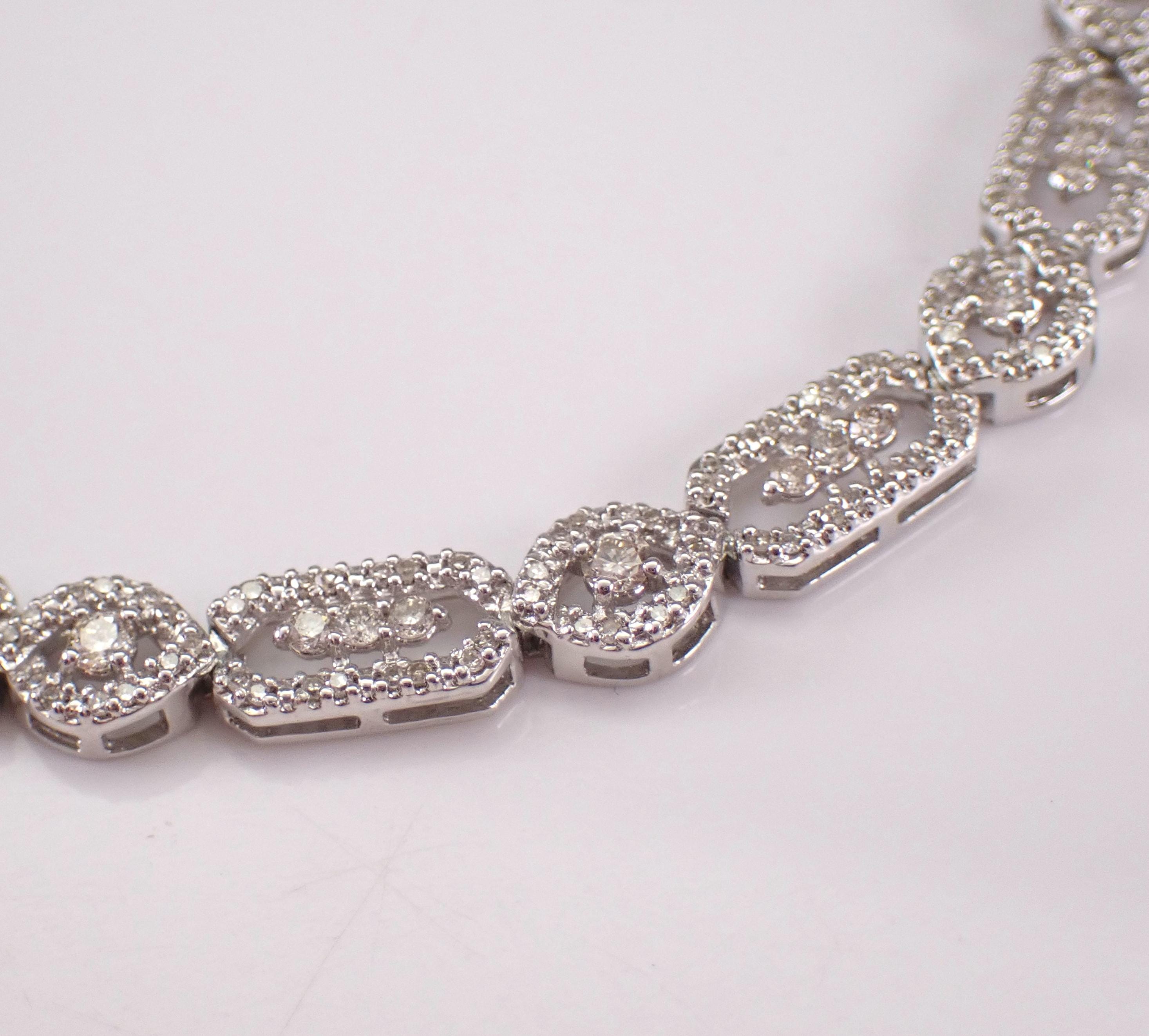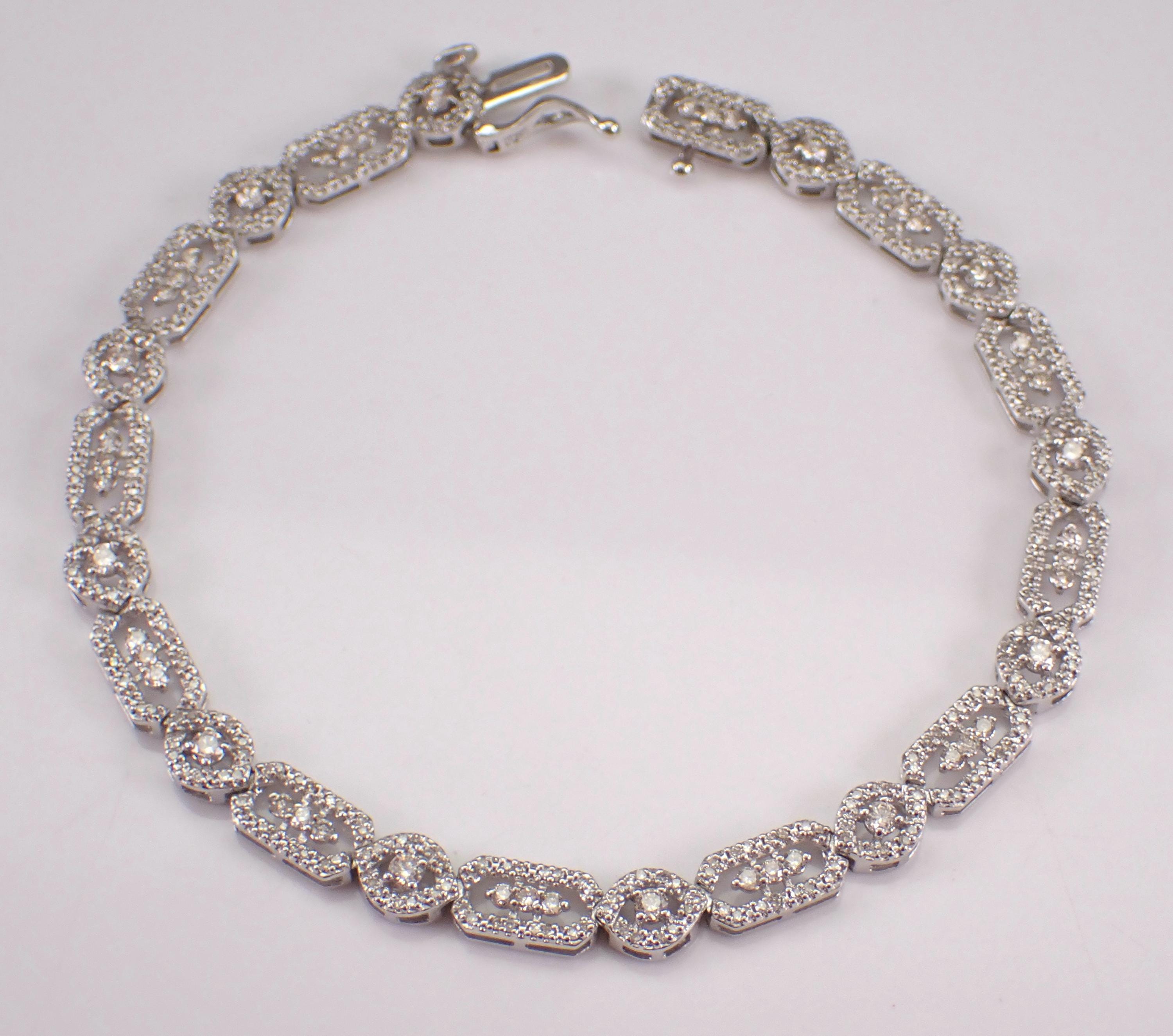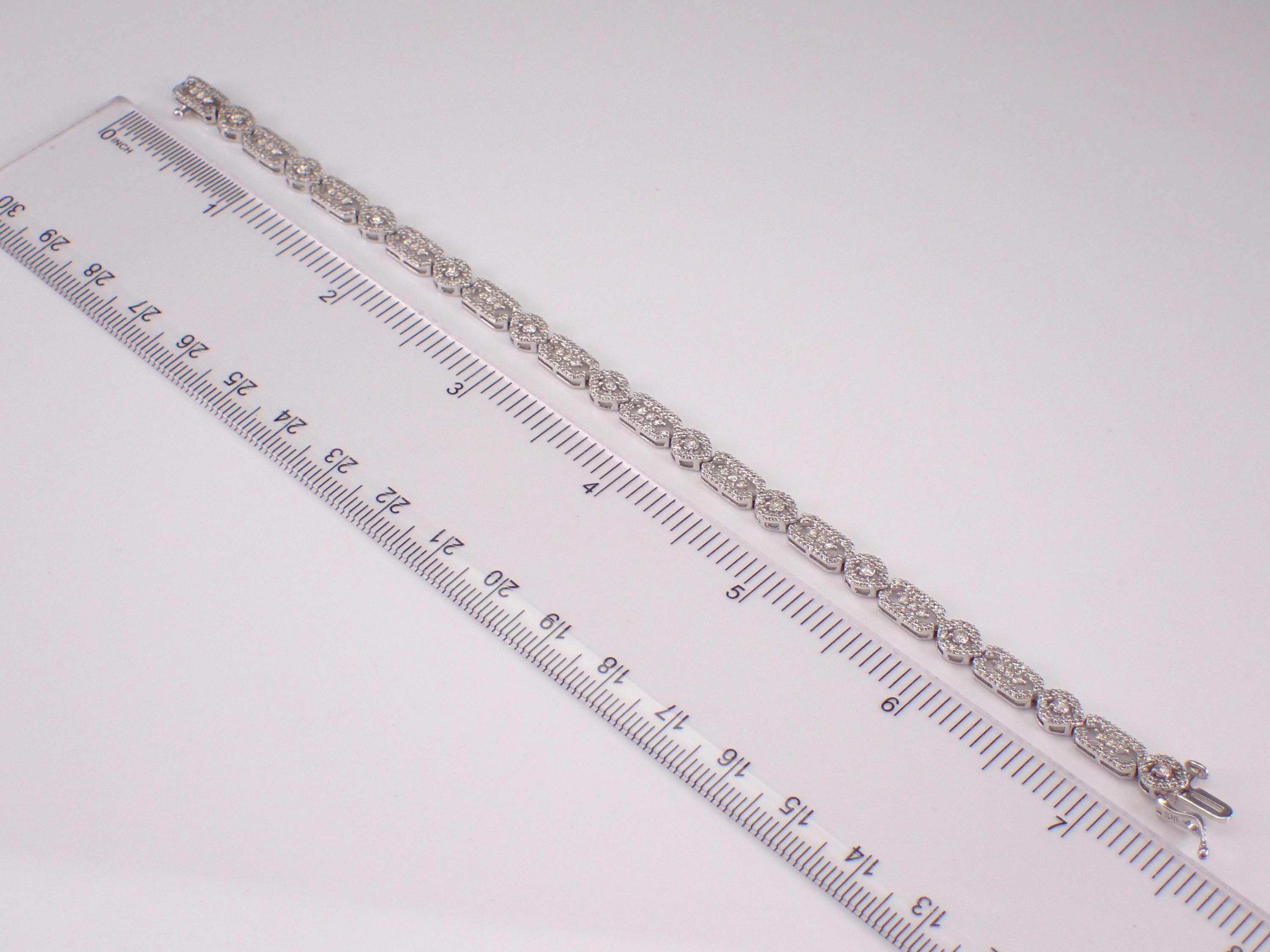 Solid White Gold Diamond Bracelet. This bracelet is set with three hundred and eighty-four (384) genuine natural round brilliant diamonds. These diamonds are H color, SI/I1 clarity and weigh a total of 1 1/2 carats. This bracelet is 10KT White Gold, weighs 8.0 grams, measures 5 mm in width and 7" in length. This bracelet will be accompanied by an appraisal written by a GIA Certified Diamond Grader with the retail replacement value of $4,395.00. I will ship this bracelet promptly in a beautiful gift box.