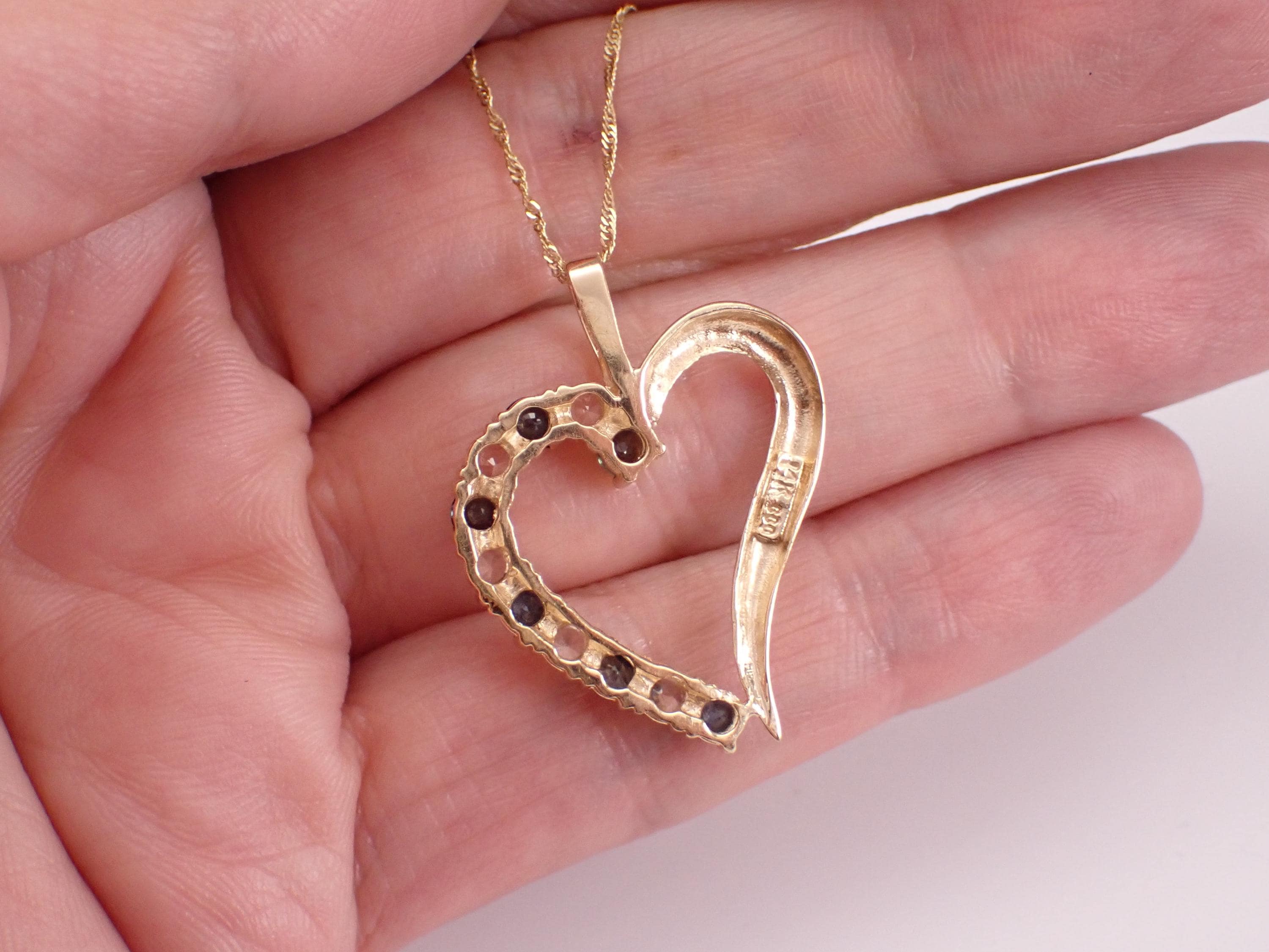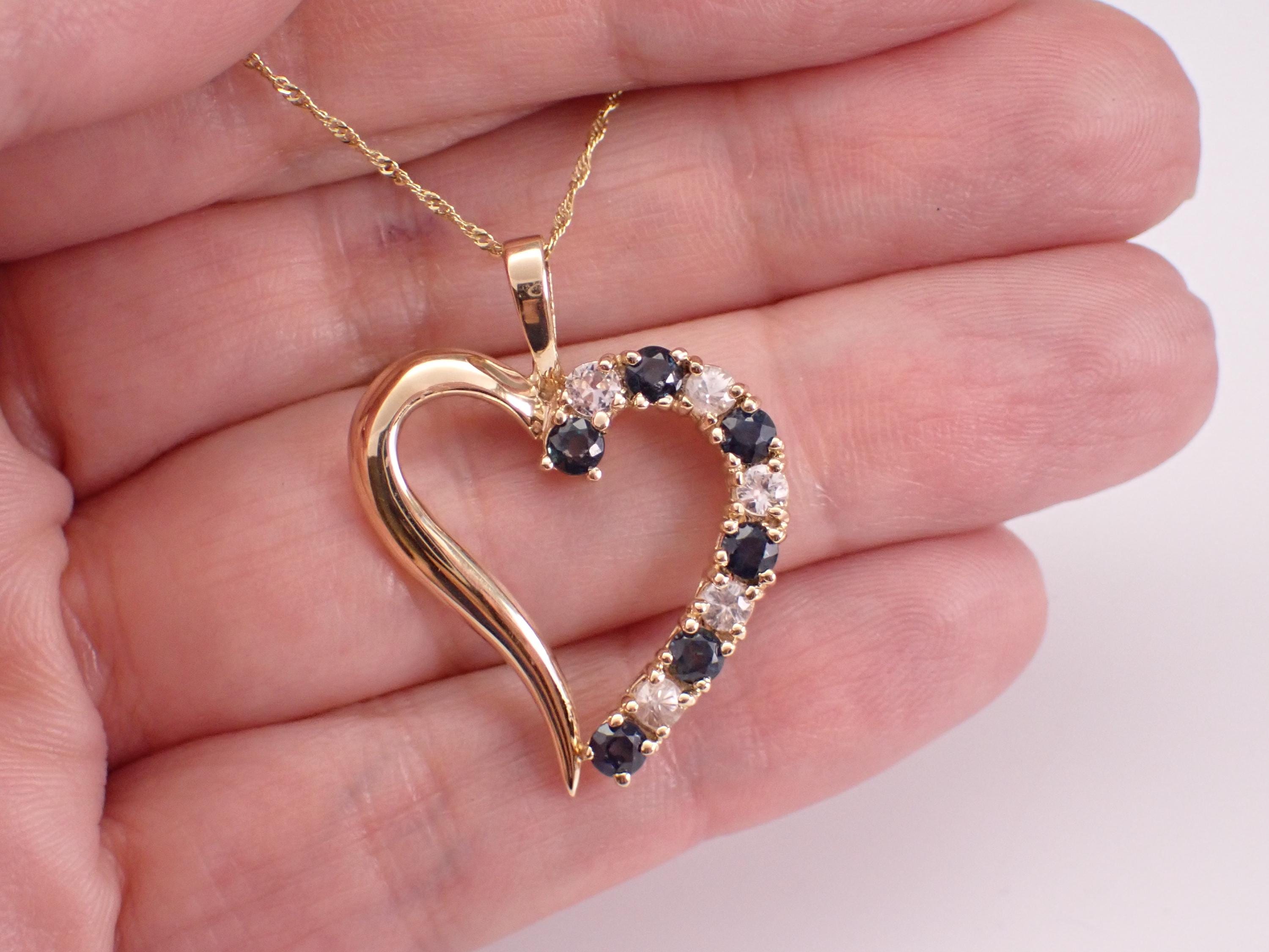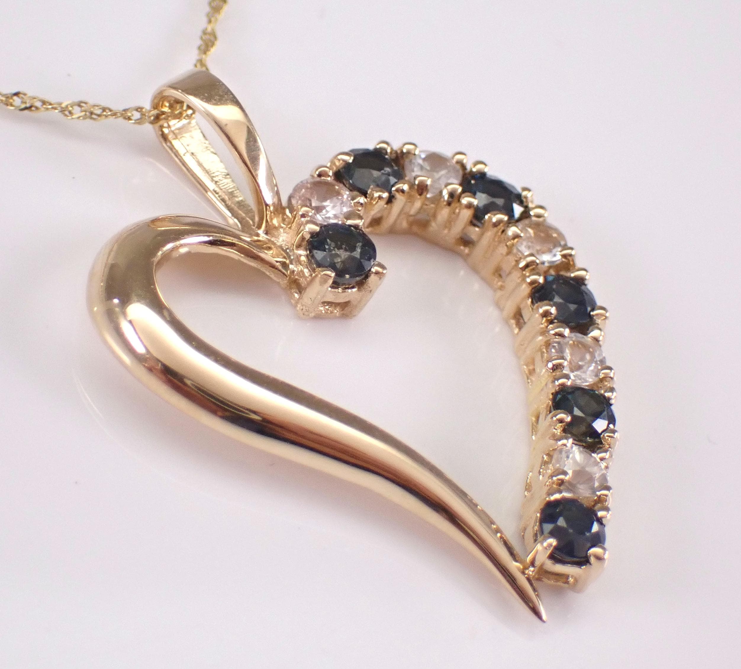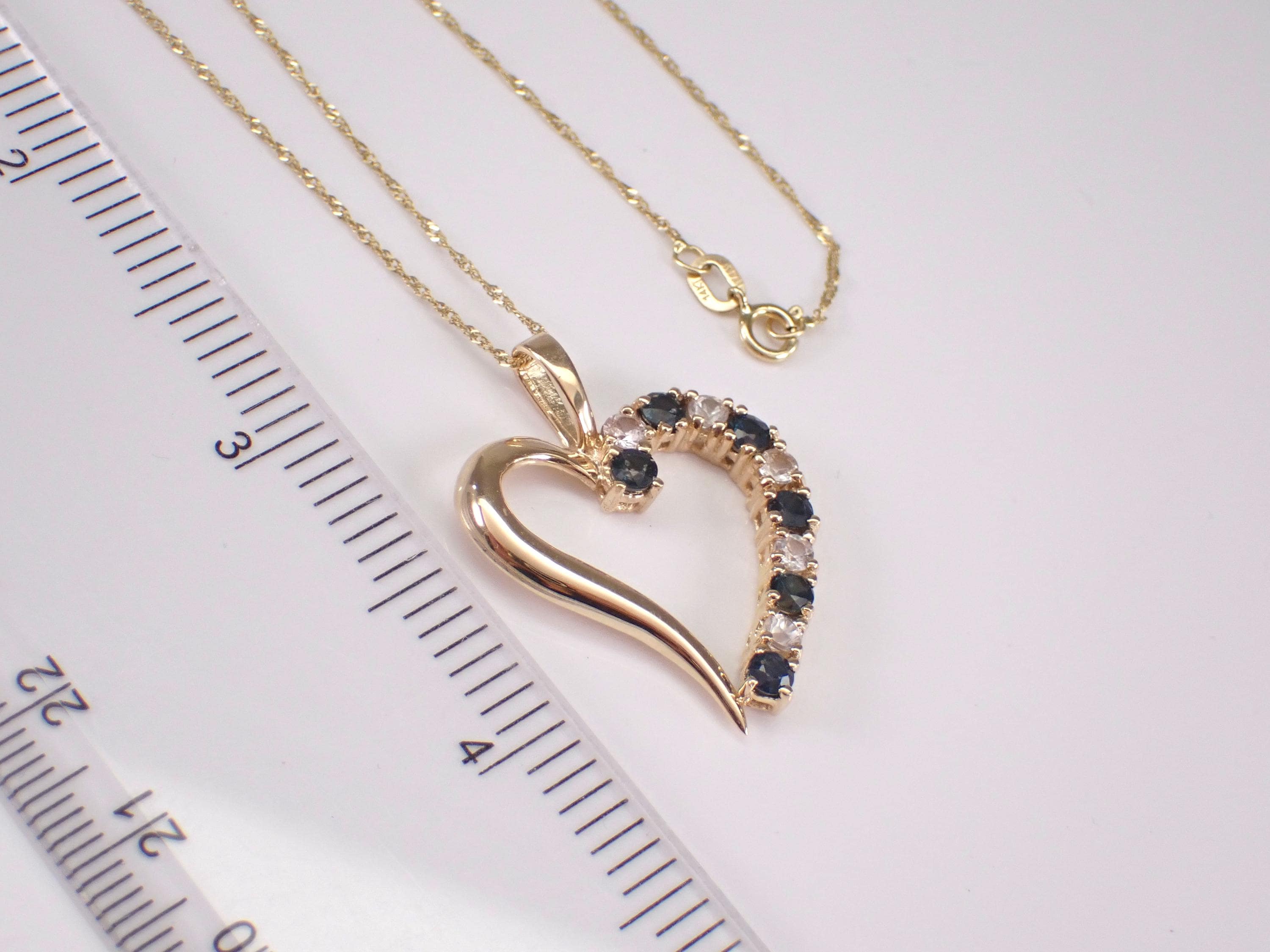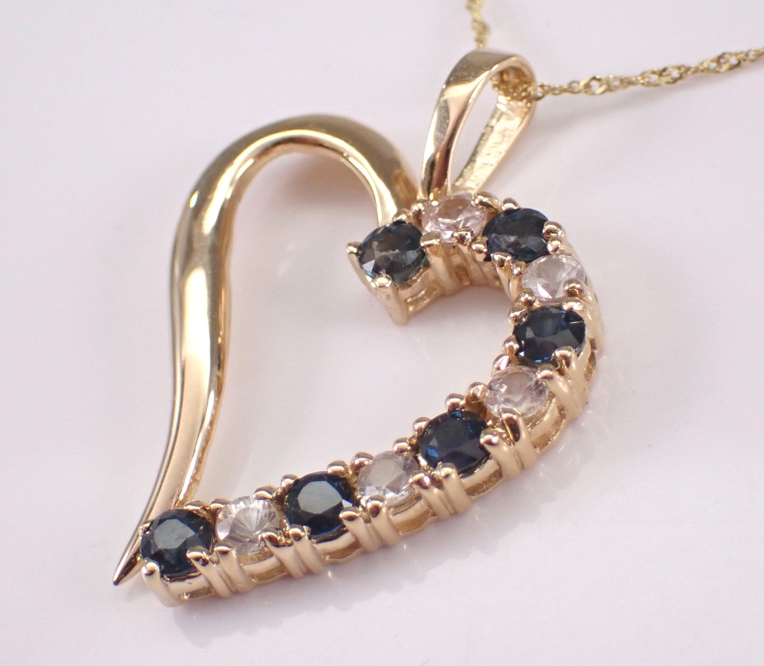 Gorgeous Estate Heart Pendant crafted in 14 Karat yellow gold. Heart is set with six genuine round Blue Sapphires and five round White Sapphires. These Sapphires weigh a total of 1 carat. The heart measures 25 X 23 mm without the bail and weighs 4.3 grams with the 18" included chain. Both the chain and the heart are 14K Yellow Gold and will be shipped promptly in a gift box.