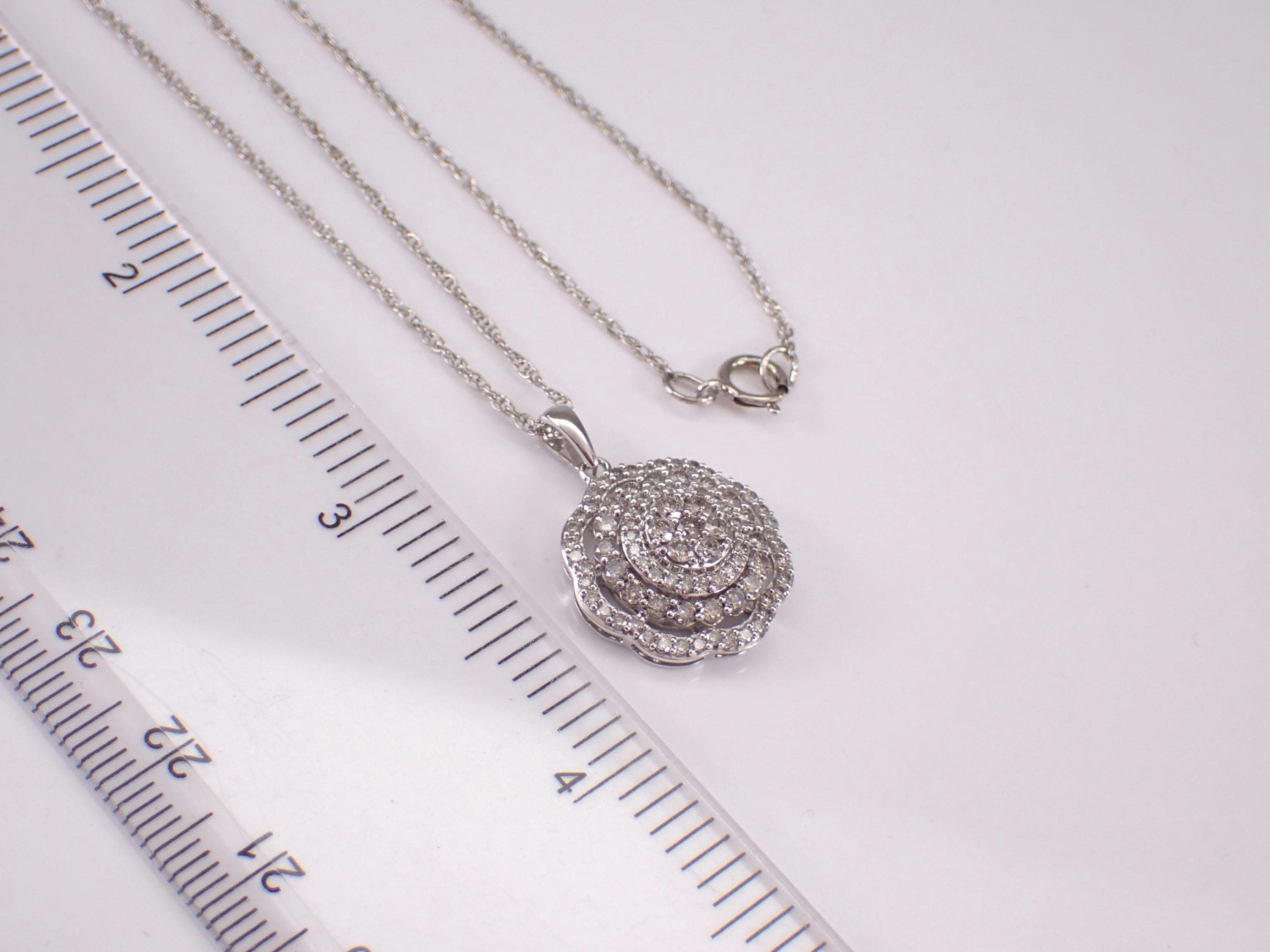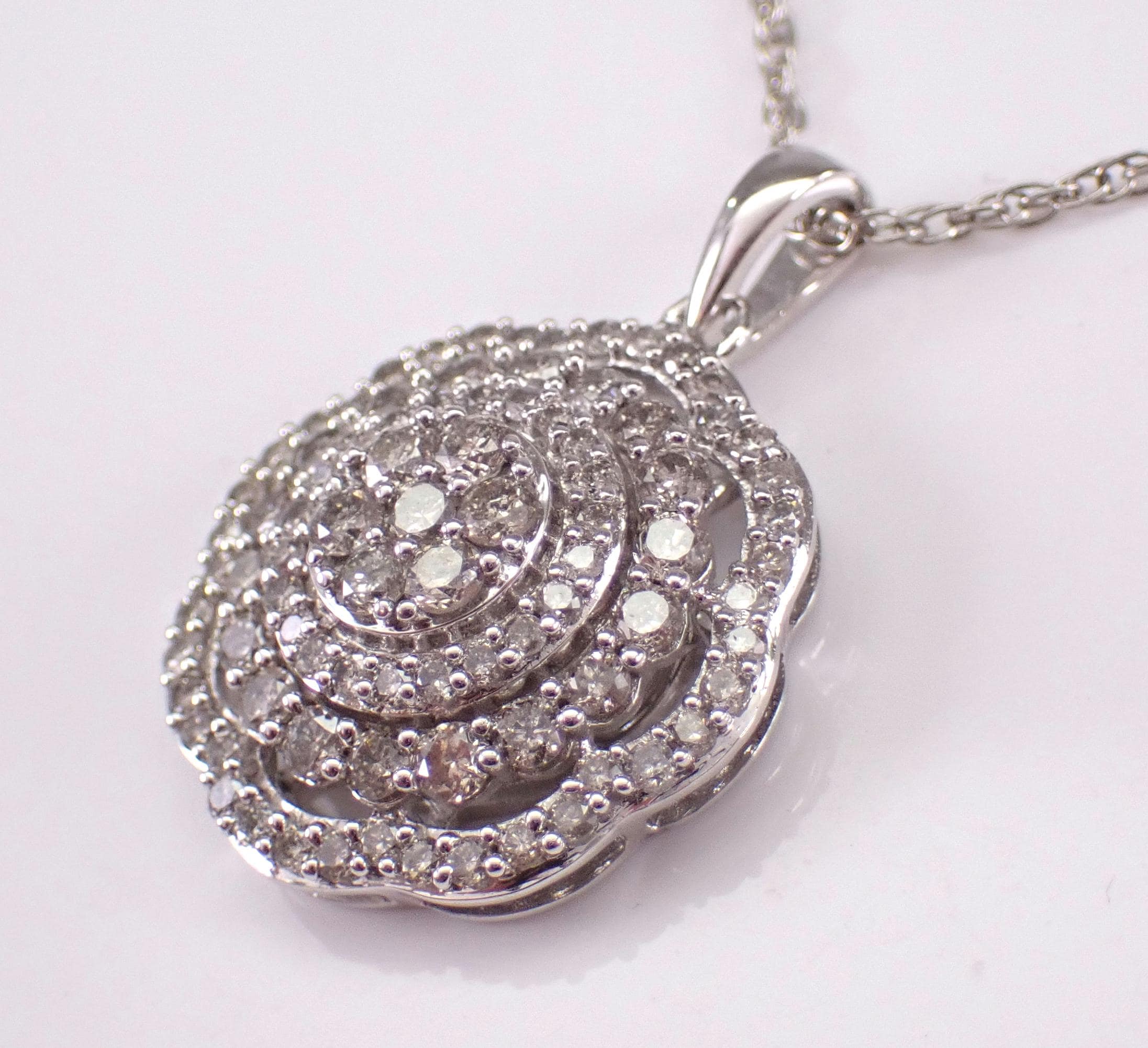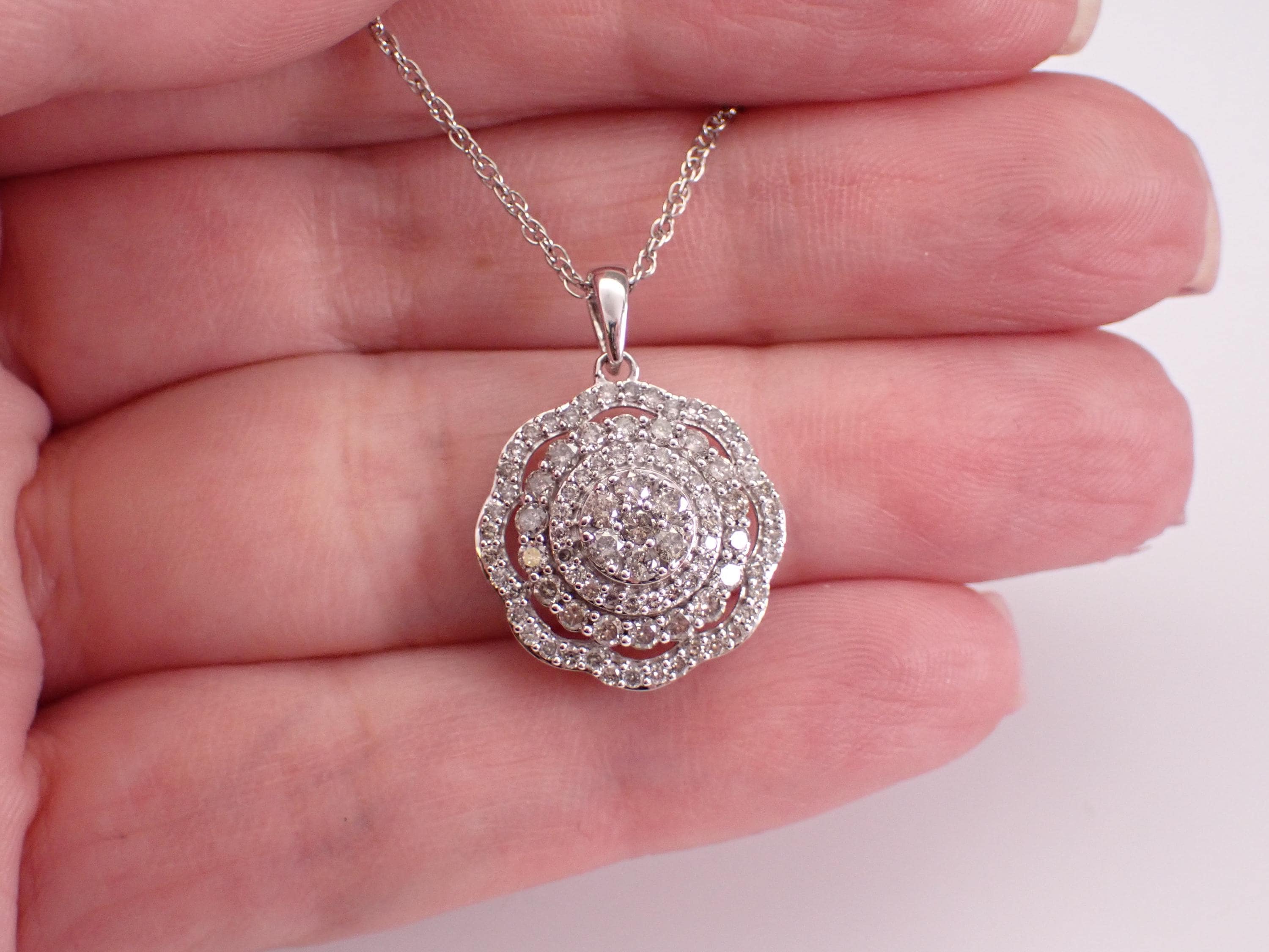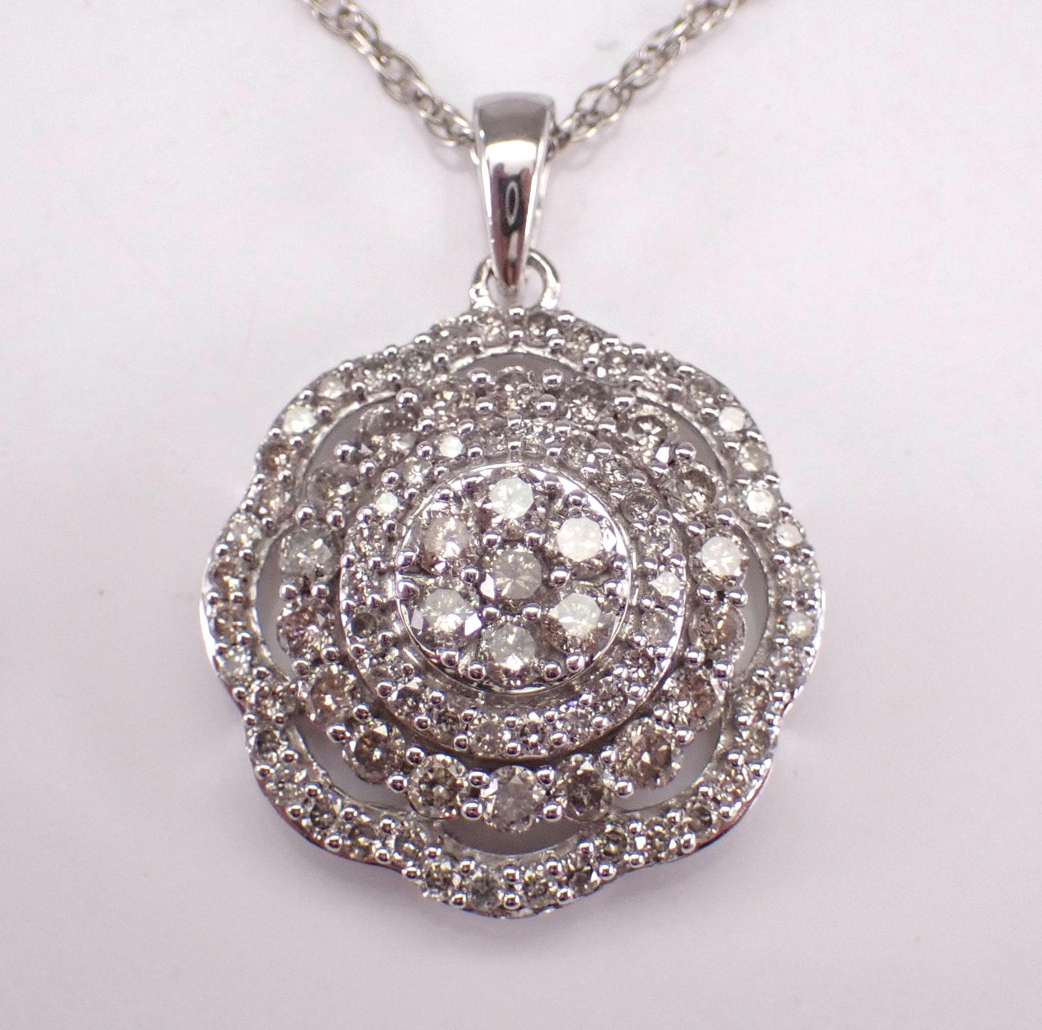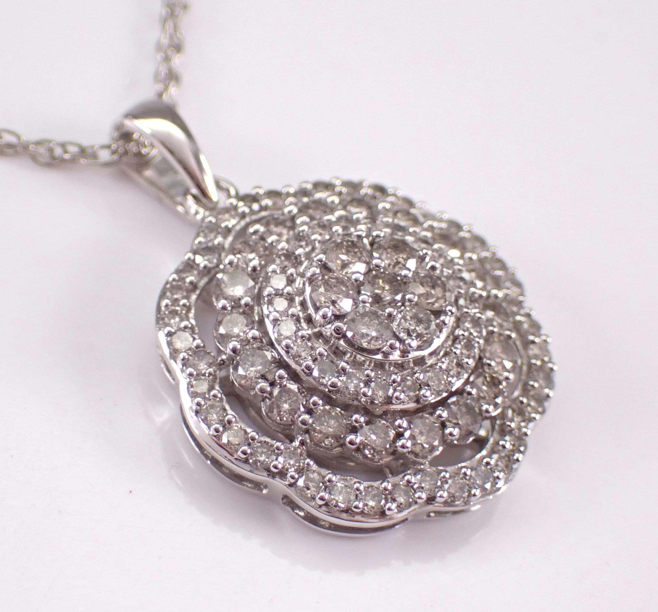 White Gold Diamond Cluster Pendant Necklace. This pendant is set with eighty-six genuine natural round brilliant diamonds. These diamonds are H color, I1 clarity and weigh a total of 1.02 carats. This pendant is 10KT White Gold and comes with a 10KT White Gold chain which measures 18" in length. Both the pendant and chain weigh a total of 3.6 grams and the pendant measures 16.5 mm in diameter. This necklace will be accompanied by an appraisal written by a GIA Certified Diamond Grader with the retail replacement value of $2,095.00. I will ship this necklace promptly in a beautiful gift box.