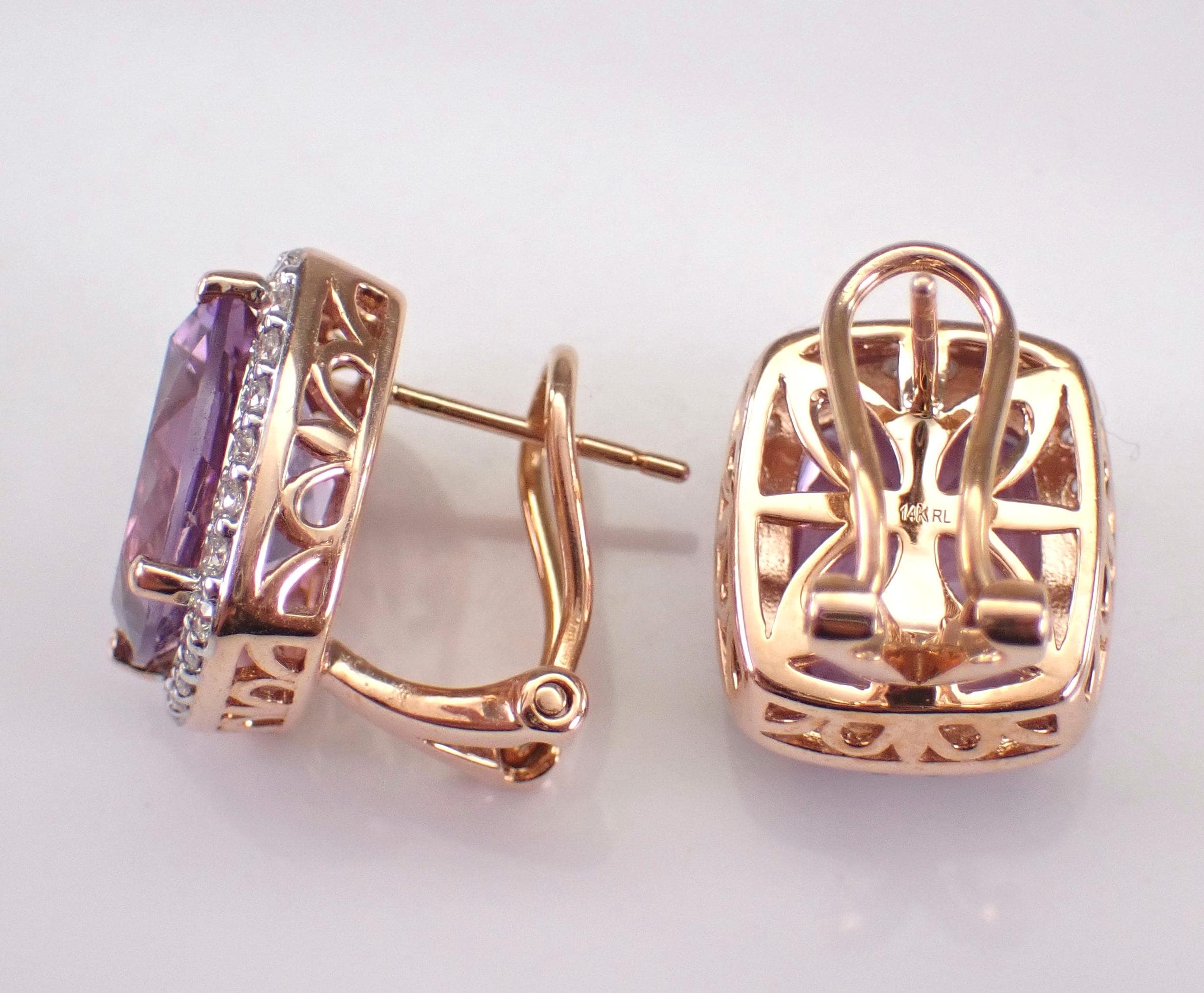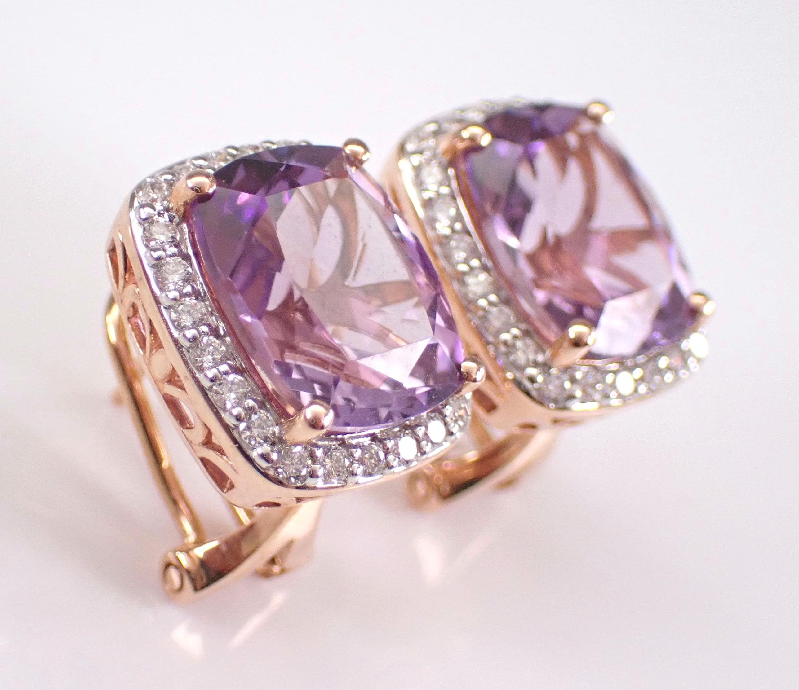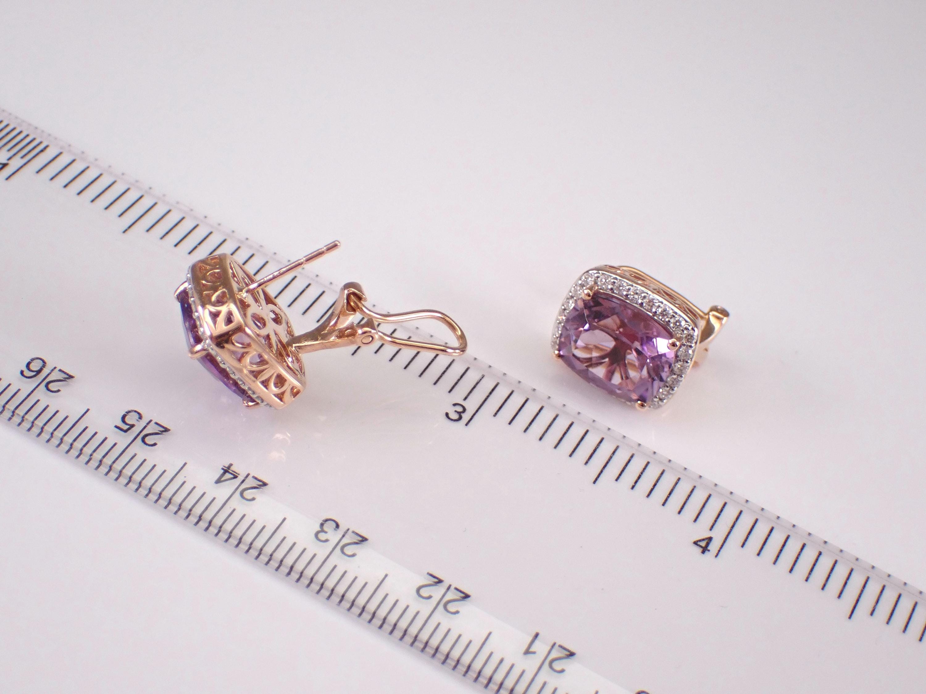 14K Rose Gold Diamond and Amethyst Earrings. These earrings are set with two genuine Cushion Cut Amethysts and forty-eight natural Round Brilliant Diamonds. These diamonds are G color, SI clarity and weigh a total of 1/2 carat. The Amethysts in these earrings are a beautiful Lavender color, measure 11 X 9 mm in each and weigh a total of 7 carats. These earrings are 14KT Rose Gold and weigh a total of 6.6 grams. The earrings measure 13.5 X 11.5 mm each, are for pierced ears and have very secure Omega clasps. These earrings will be accompanied by an appraisal written by a GIA Certified Diamond Grader with the retail replacement value of $3,495.00. I will ship these earrings promptly in a gift box.